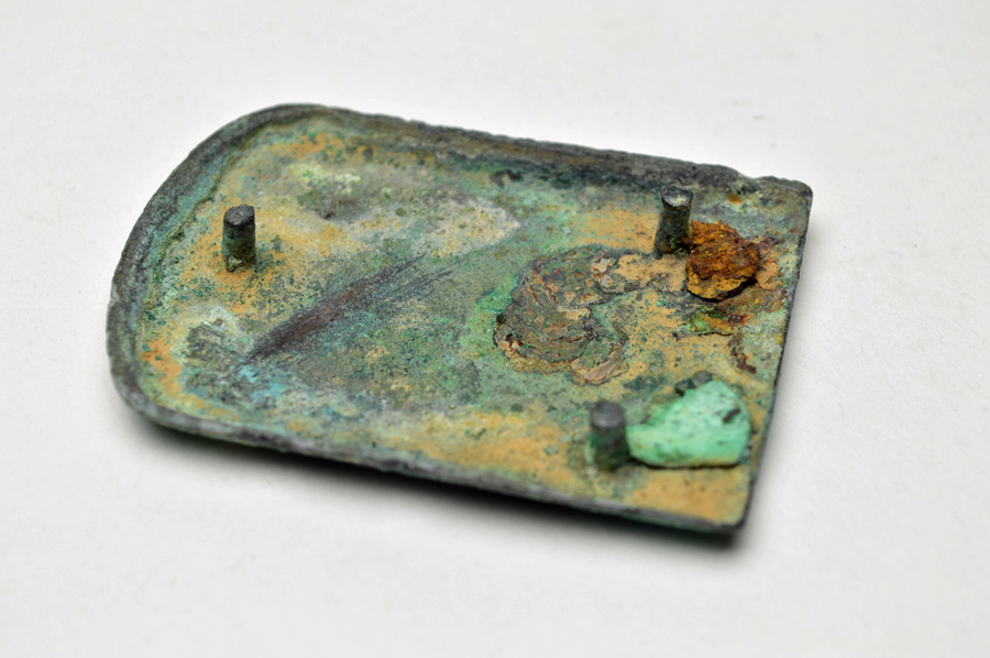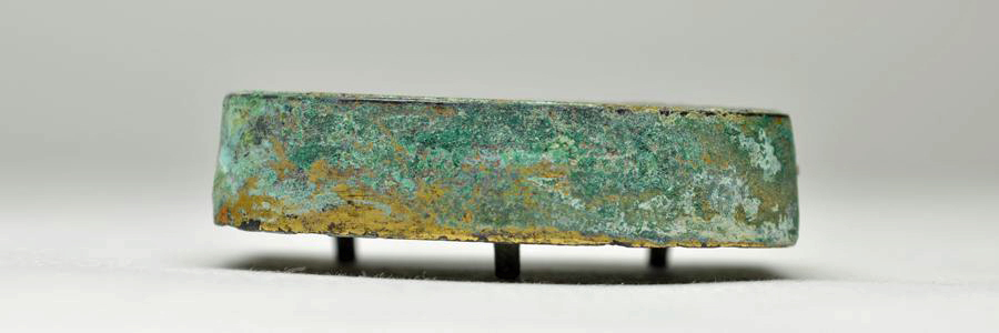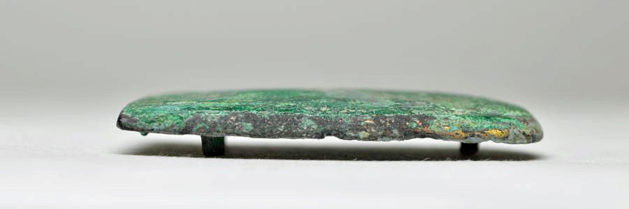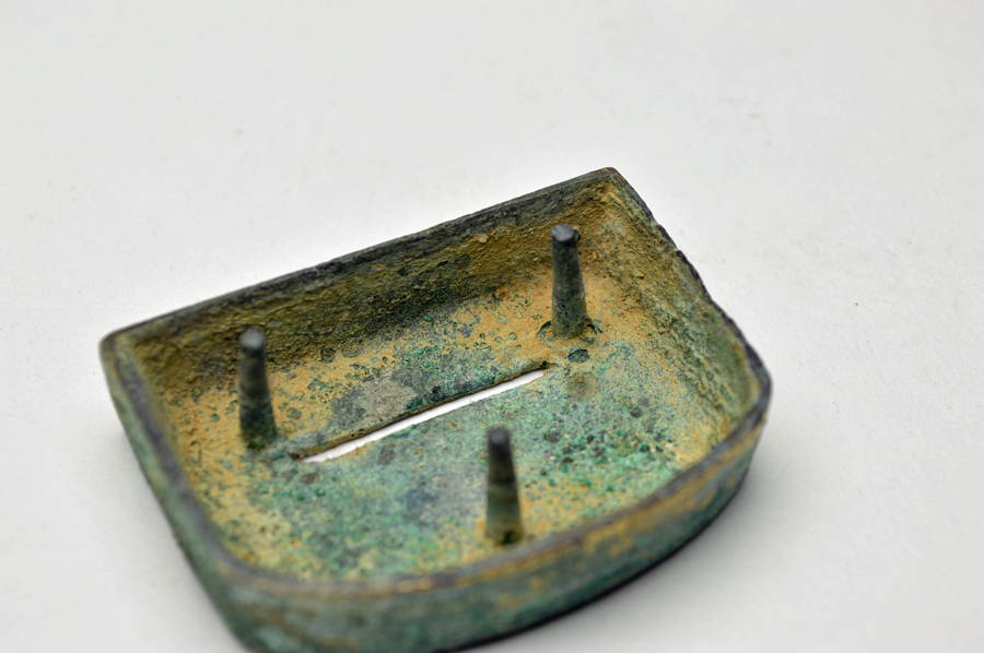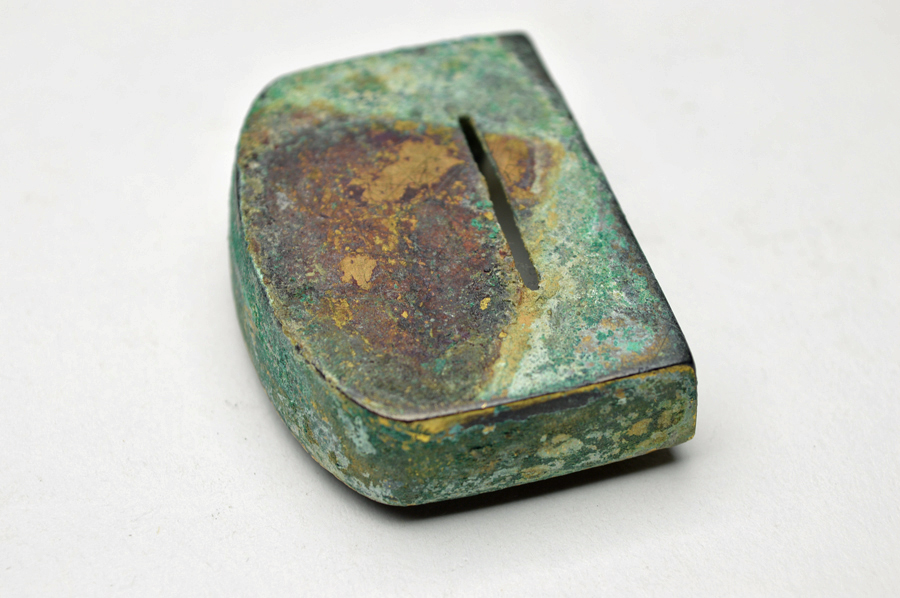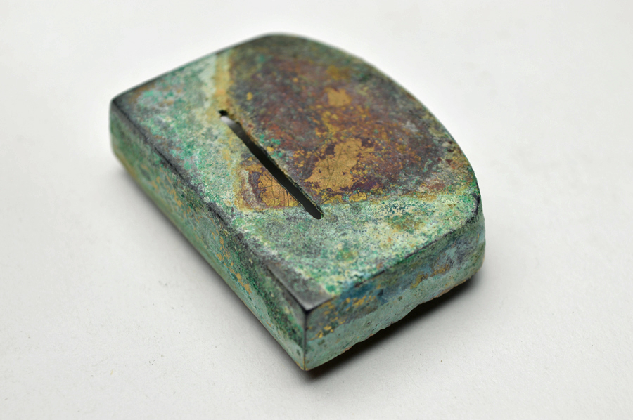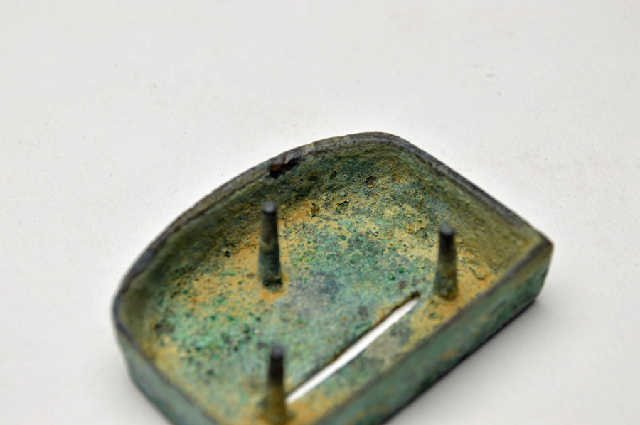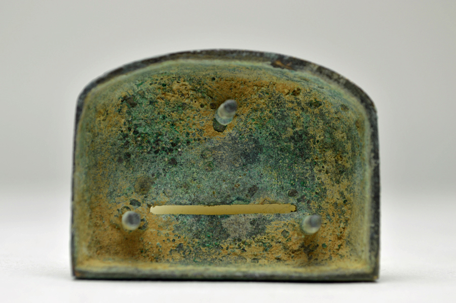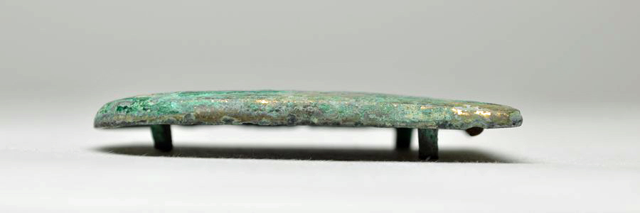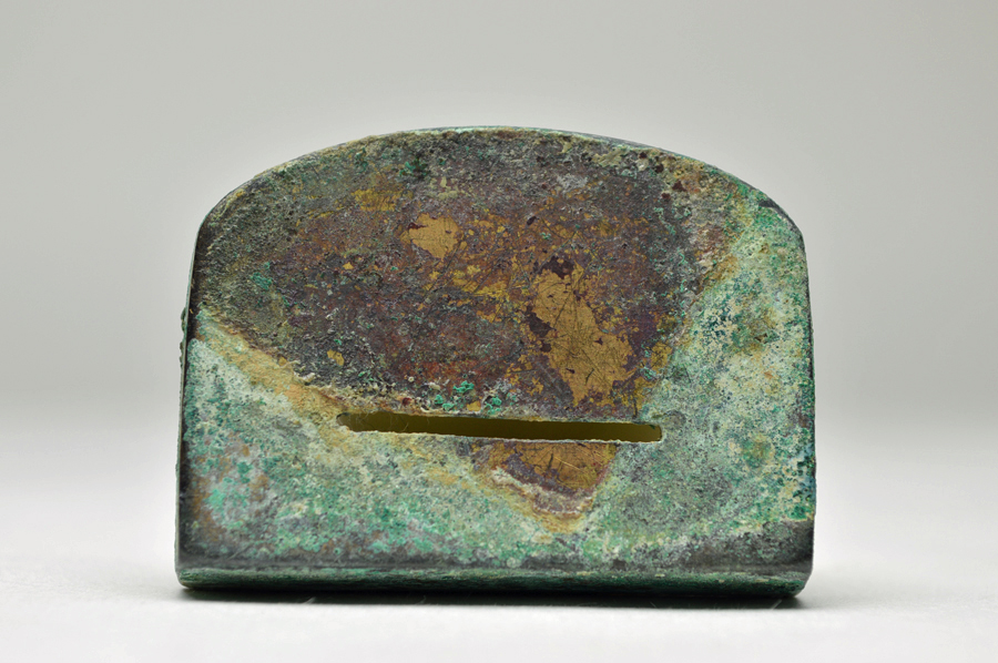 詳細な出自は不明ではありますが日本のもので所謂バックルのように使われ方していたものだろうと思います。緑青で全体に覆われていますがその下には鍍金が多く残っております。有力者の古墳から出てきたであろう品。古墳時代。