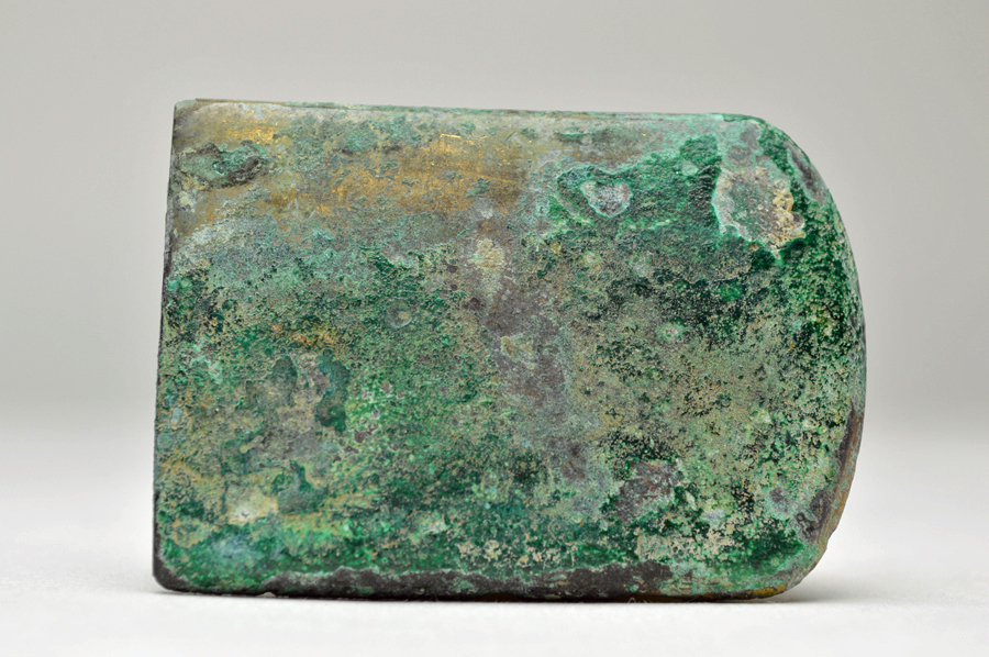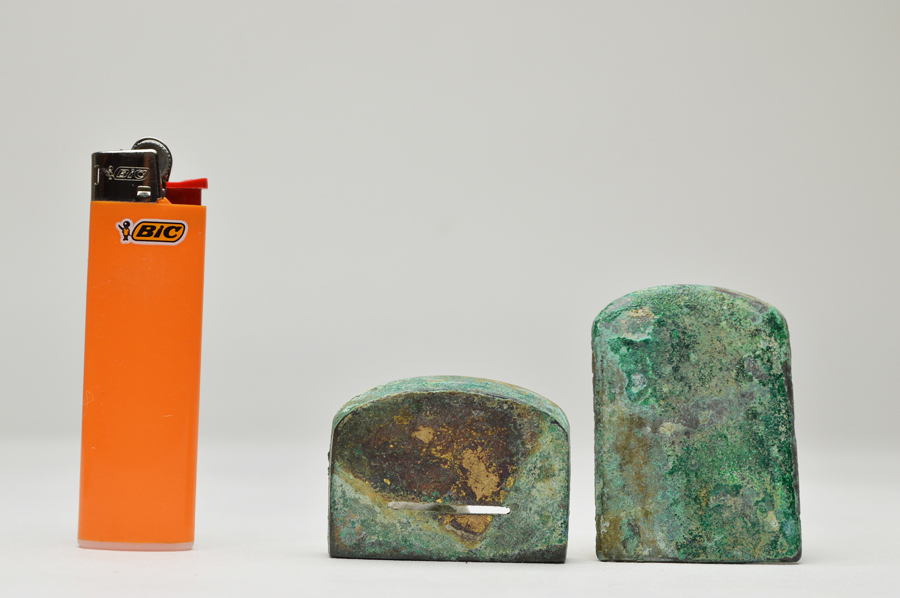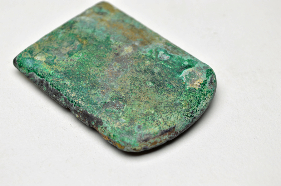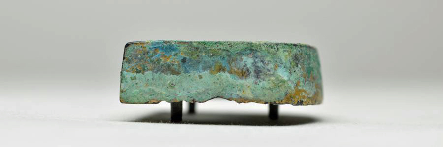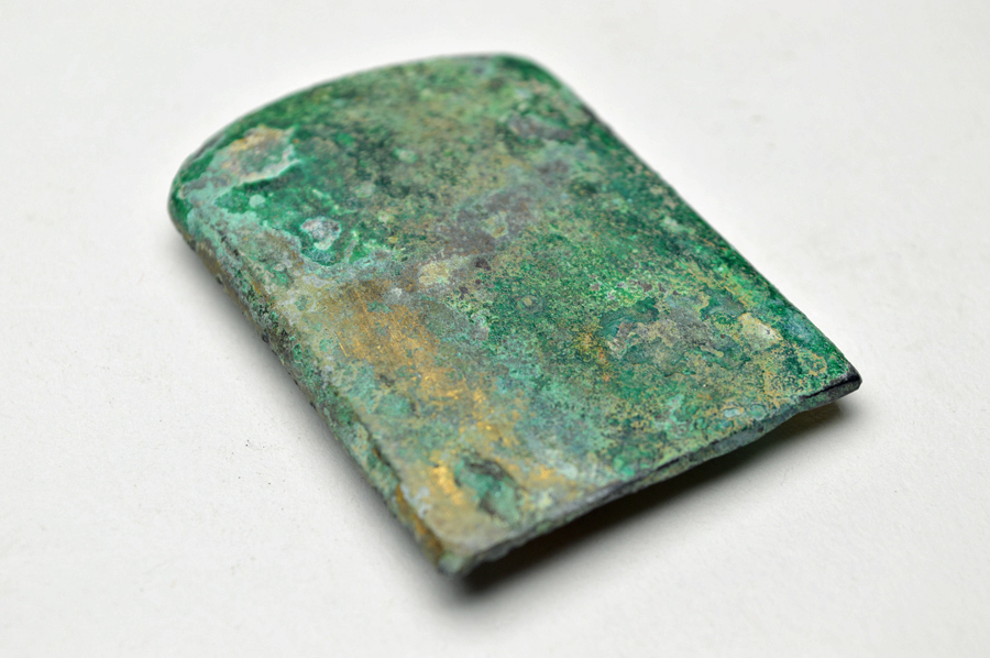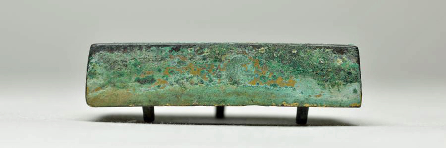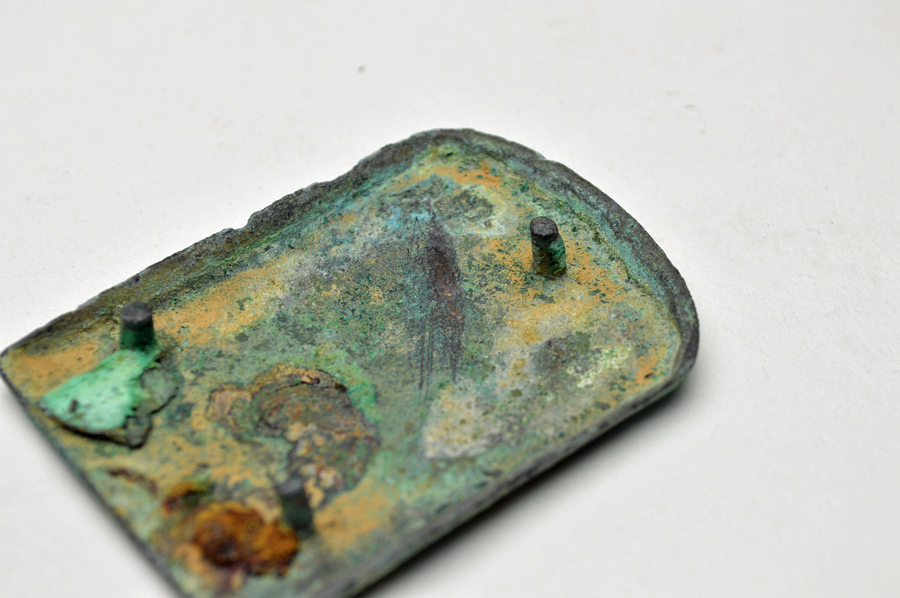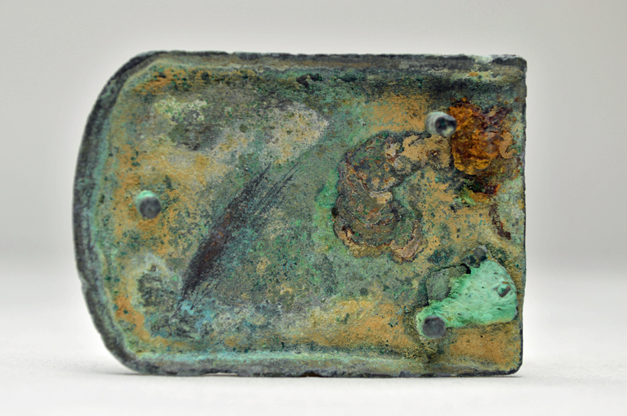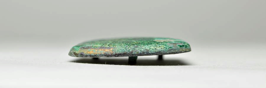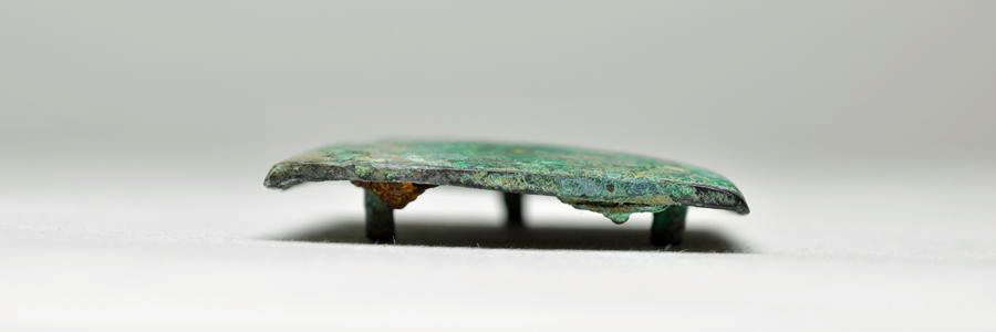 詳細な出自は不明ではありますが日本のもので所謂バックルのように使われ方していたものだろうと思います。緑青で全体に覆われていますがその下には鍍金が多く残っております。有力者の古墳から出てきたであろう品。古墳時代。