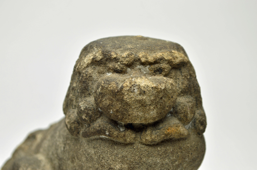 珍しい小さな石造の狛犬一対。風化による影響も少なく、墨書も残っている部分もございますので状態は良好。内陣とは言わないまでも内部で安置されていたものと考えて間違いないでしょう。御影ではないですが、割と堅めの石で良い彫です。造形的には中世を感じさせるものですが桃山〜江戸前期頃のものと考えております。少々の欠け、擦れはございますが時代相応のもので気になるものではないと思います。このサイズ、愛くるしい造形は魅力充分。