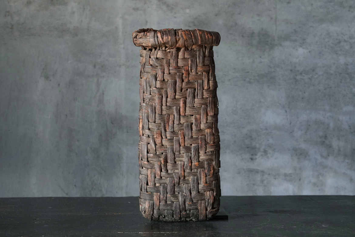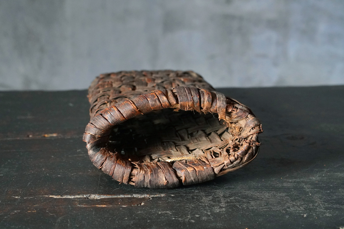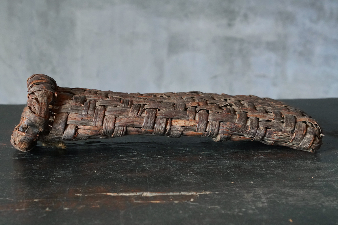 山葡萄で作られた鉈入。実際に山仕事で使われていたものです。山葡萄の樹皮は一年で限られた時期にしか収穫できない為、数が多くありません。丈夫な材であることから山の民の様々な日常の道具が作られました。使い込まれた味わいは、花を生けるのに最適で鉈鞘は古くから掛花として使われています。素朴ですが飽きることなくお使いいただける品。実際に使用されていたものですので少し擦り切れて細くなっている部分などございますが、花生けとしては充分使える強度は保っております。オトシなどは付属しておりませんのでご自身でご用意ください。