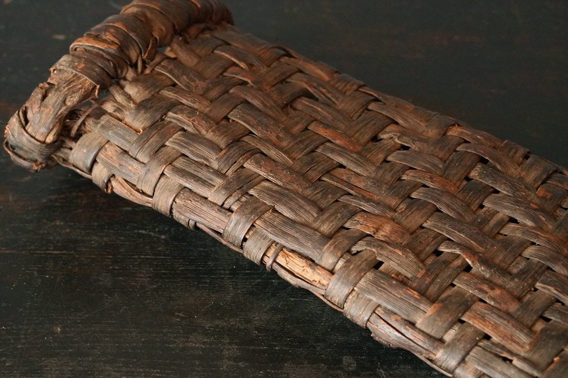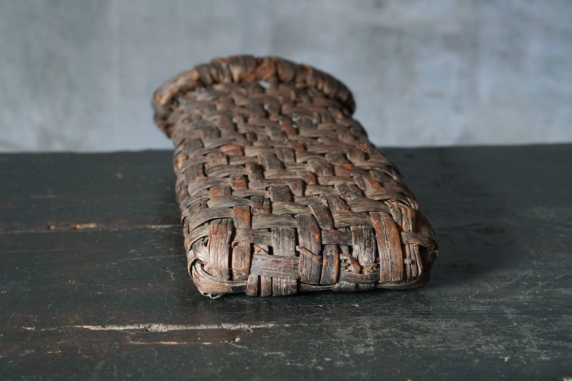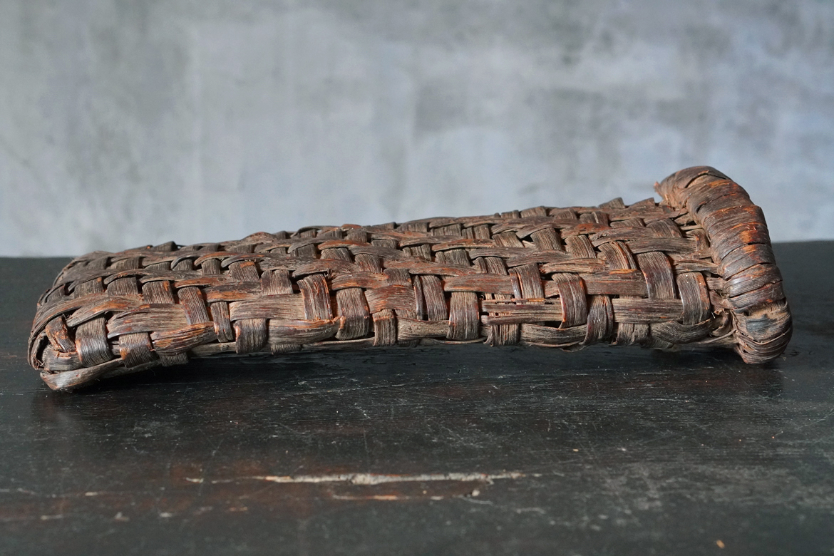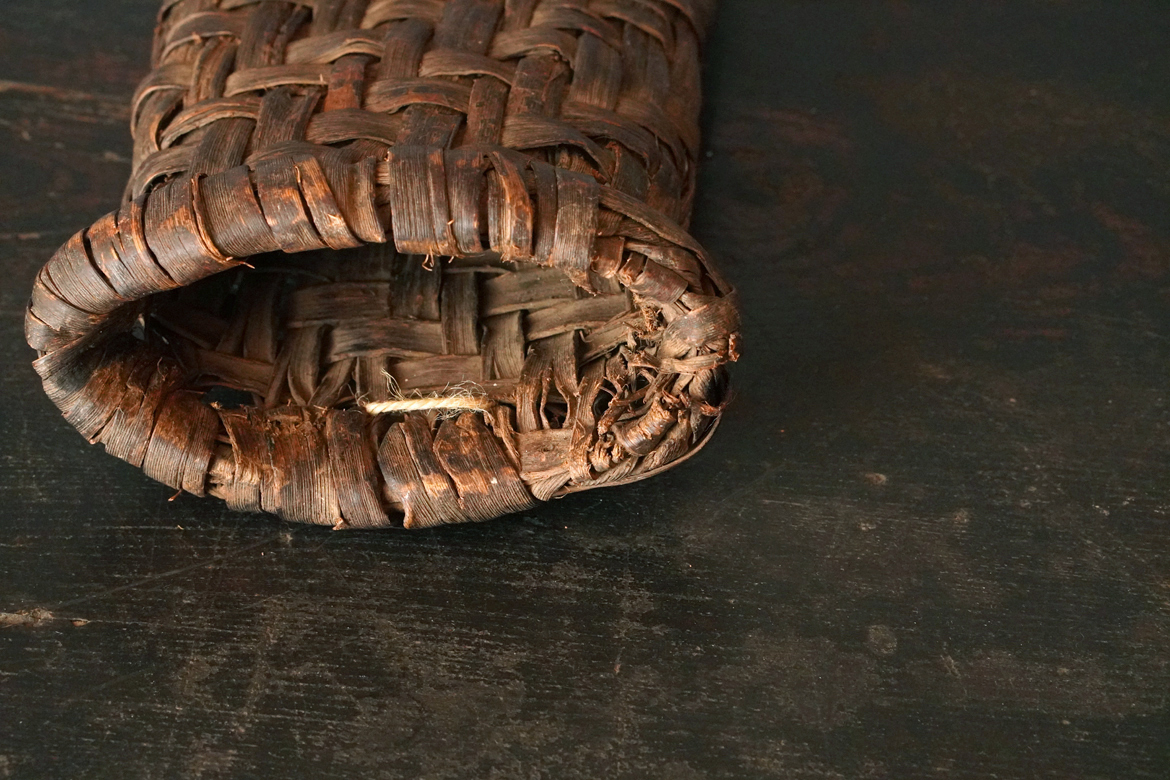 山葡萄で作られた鉈入。実際に山仕事で使われていたものです。山葡萄の樹皮は一年で限られた時期にしか収穫できない為、数が多くありません。丈夫な材であることから山の民の様々な日常の道具が作られました。使い込まれた味わいは、花を生けるのに最適で鉈鞘は古くから掛花として使われています。素朴ですが飽きることなくお使いいただける品。実際に使用されていたものですので少し擦り切れて細くなっている部分などございますが、花生けとしては充分使える強度は保っております。オトシなどは付属しておりませんのでご自身でご用意ください。