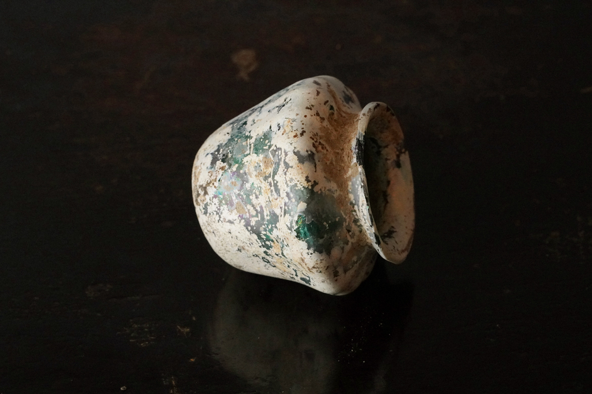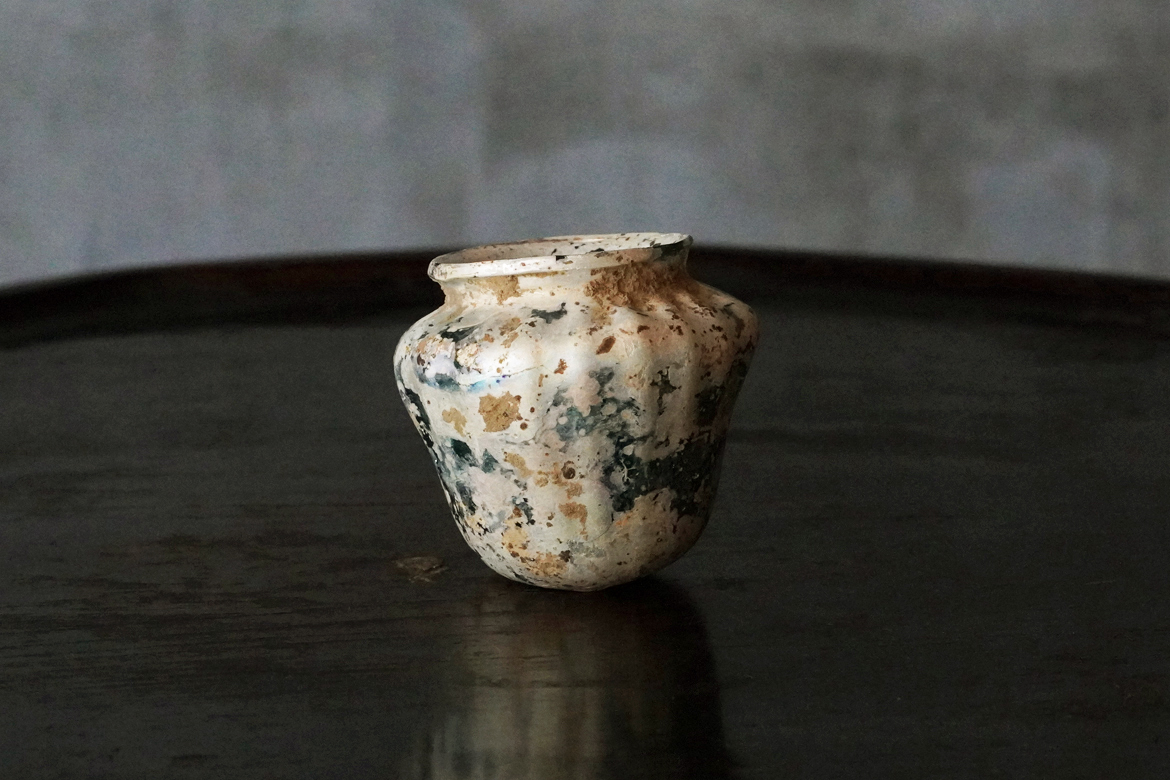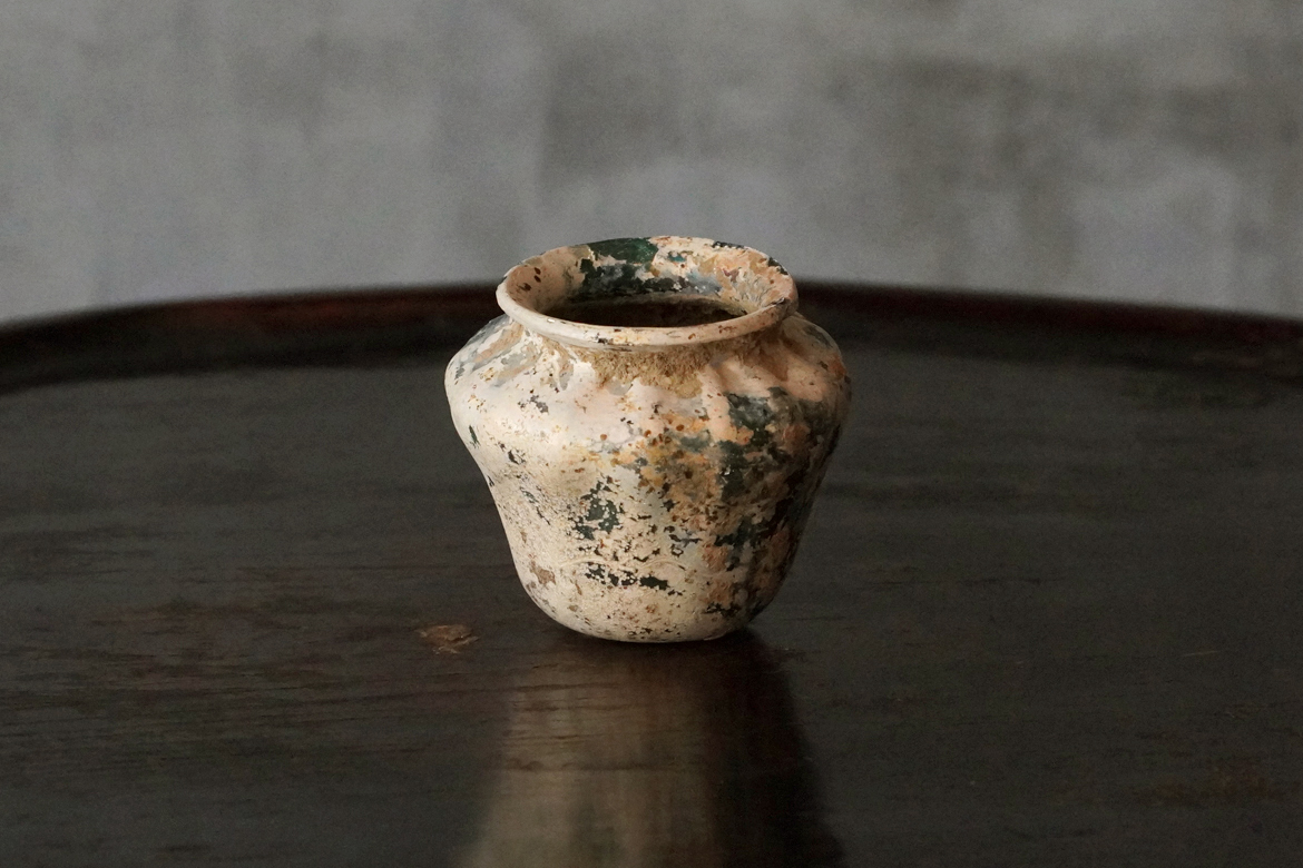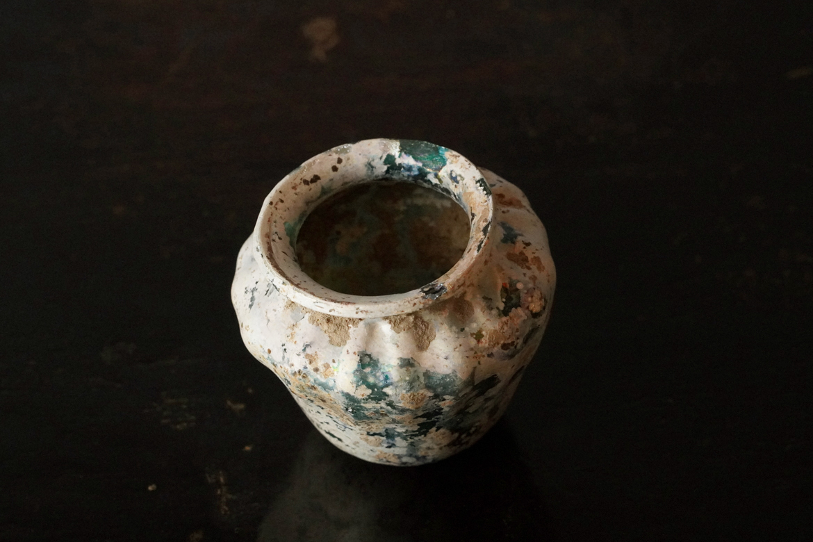 胴部分にリブ装飾が施されたローマンガラス広口瓶。パティナに覆われており、剥がれた部分からは美しい銀化が見られます。パティナ(銀化した白い部分)がポロポロと剥がれ画像より剥がれた部分が少し多くなってますので予めご了承ください。この類のものですと良くあることですので欠点とは考えておりませんのご理解下さい。割れや補修の無い概ね状態良好な品です。シリア出土でしょうか。2~3世紀。