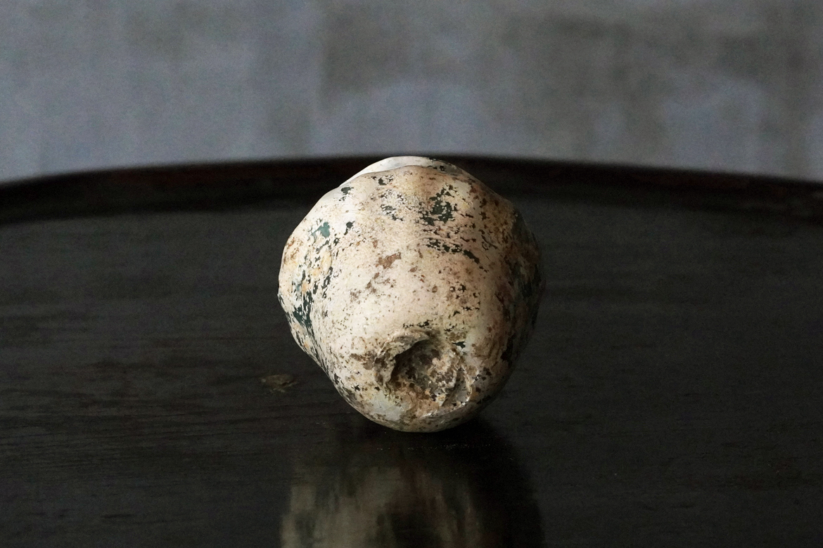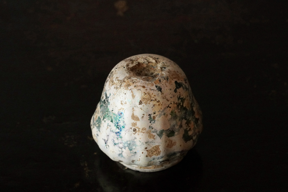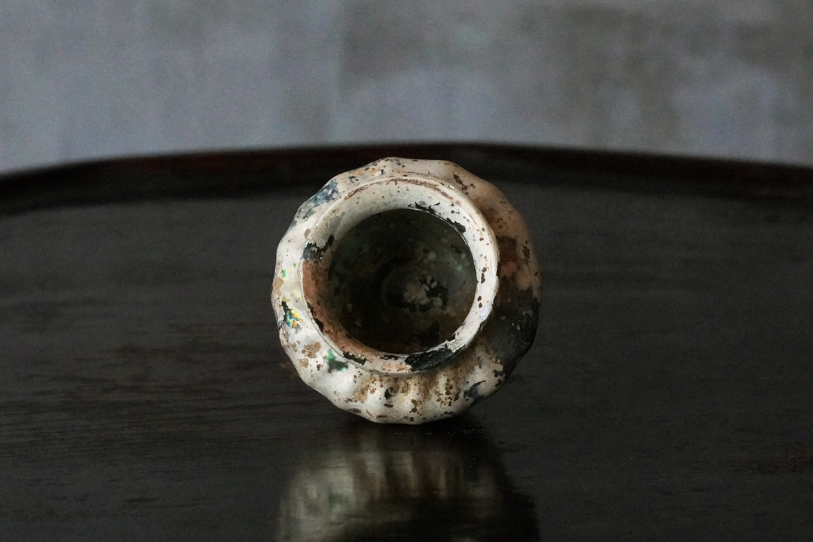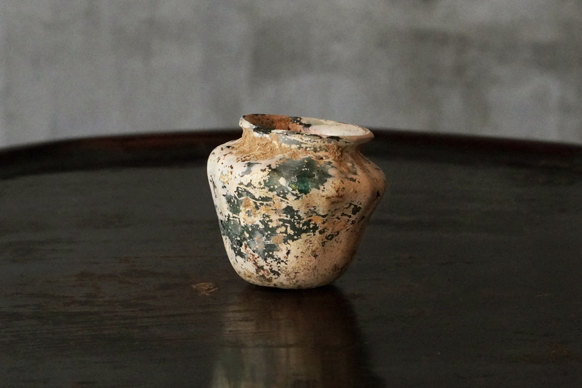 胴部分にリブ装飾が施されたローマンガラス広口瓶。パティナに覆われており、剥がれた部分からは美しい銀化が見られます。パティナ(銀化した白い部分)がポロポロと剥がれ画像より剥がれた部分が少し多くなってますので予めご了承ください。この類のものですと良くあることですので欠点とは考えておりませんのご理解下さい。割れや補修の無い概ね状態良好な品です。シリア出土でしょうか。2~3世紀。