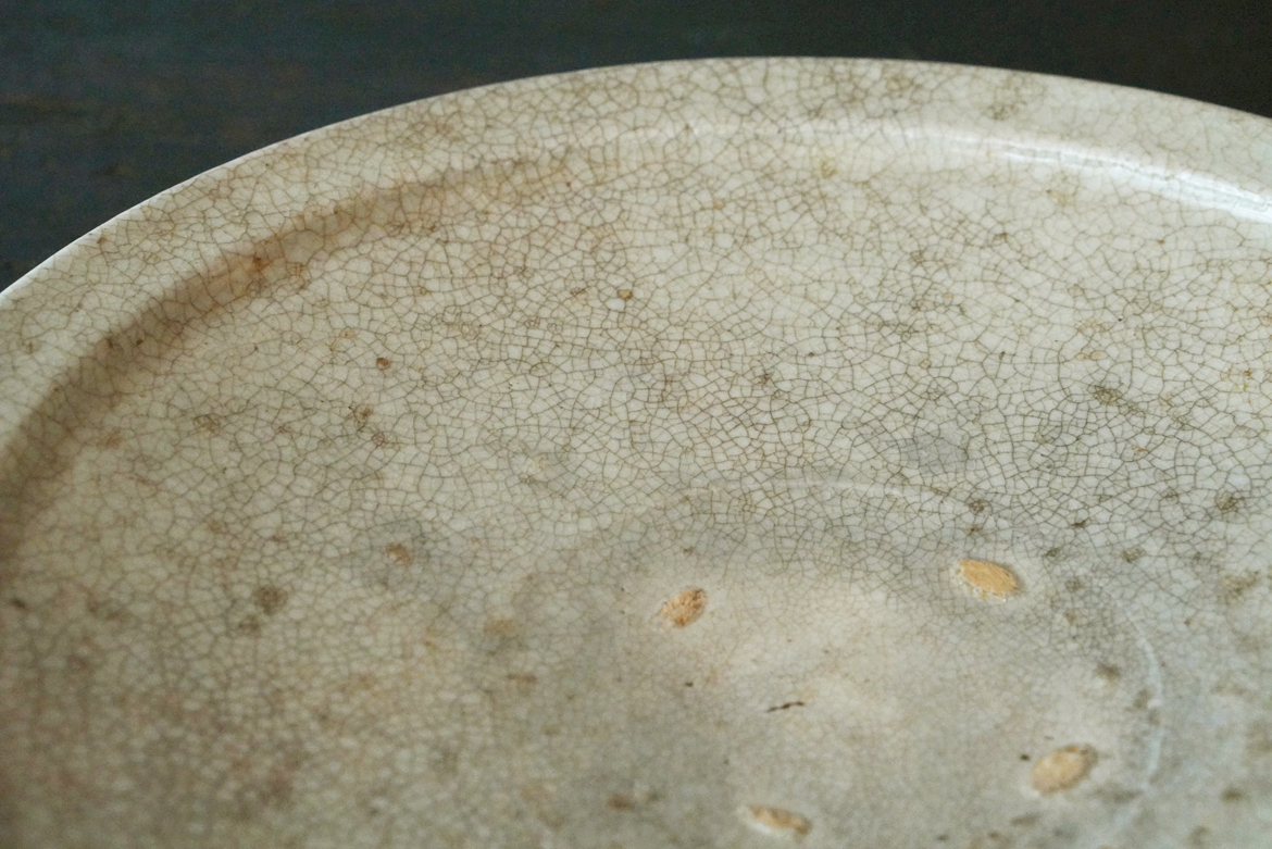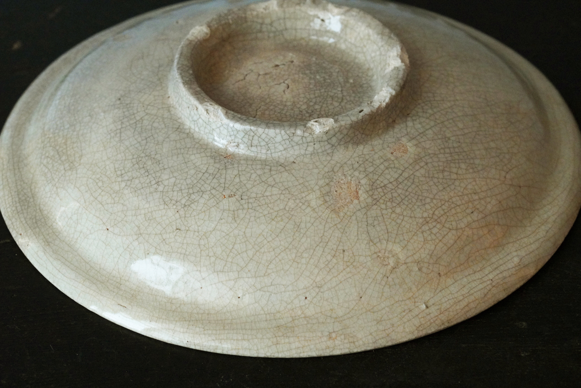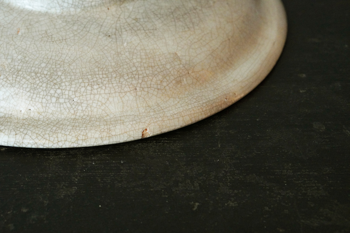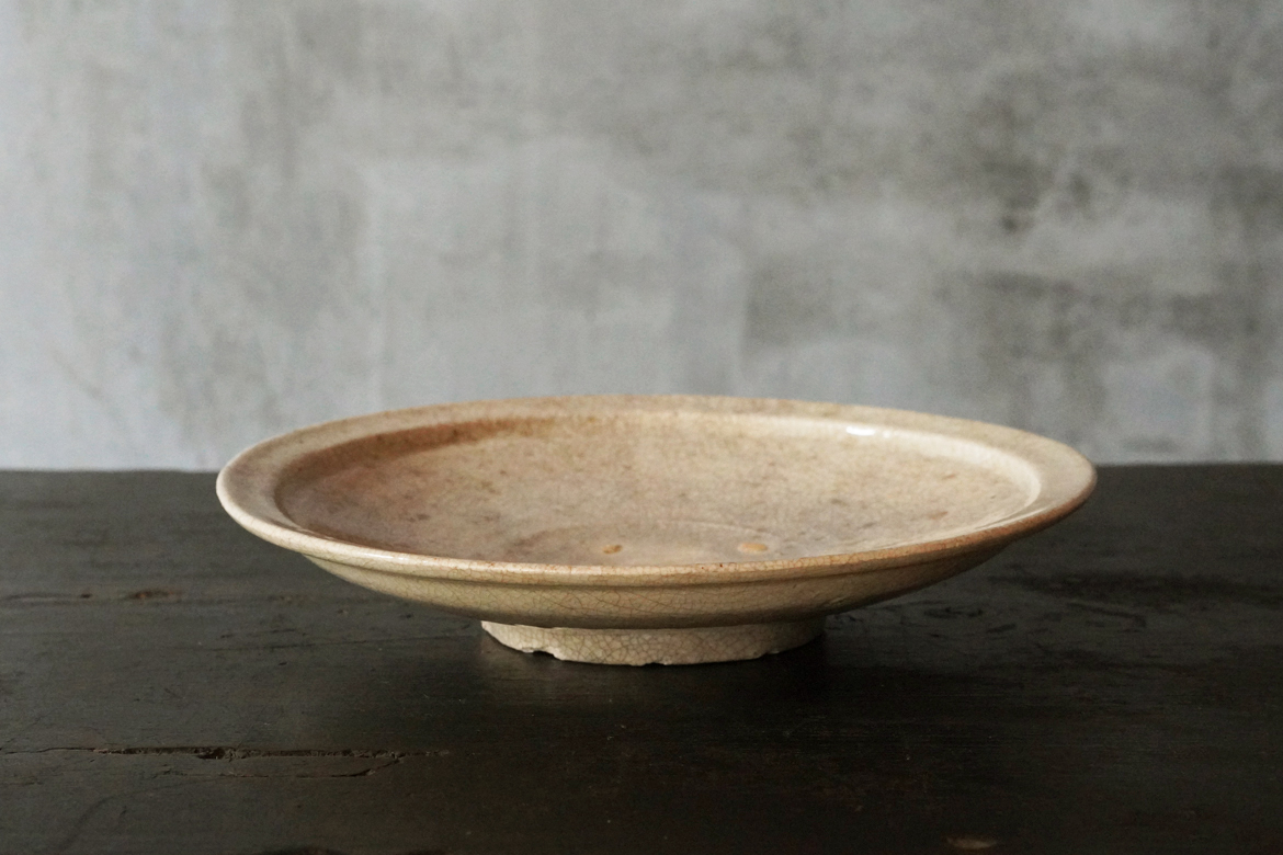格式のある姿形でありながら、目跡が残る味わいある表情の白磁皿。真っ白ではないですが、使い易い形状、サイズで、御菓子、料理も映える器です。伝世ではなく、堀りの手で、高台に窯疵はあり、縁の裏にチップがありますので画像にてご確認下さい。共直しなどの修理などはありません。しかしながら、このタイプですのでお好きな方には気にならない範疇かと思います。このシンプルでありながらも、小さな縁がピリッとした感じはきっと飽きずに永く付き合っていけると思います。李朝時代。箱はございません。