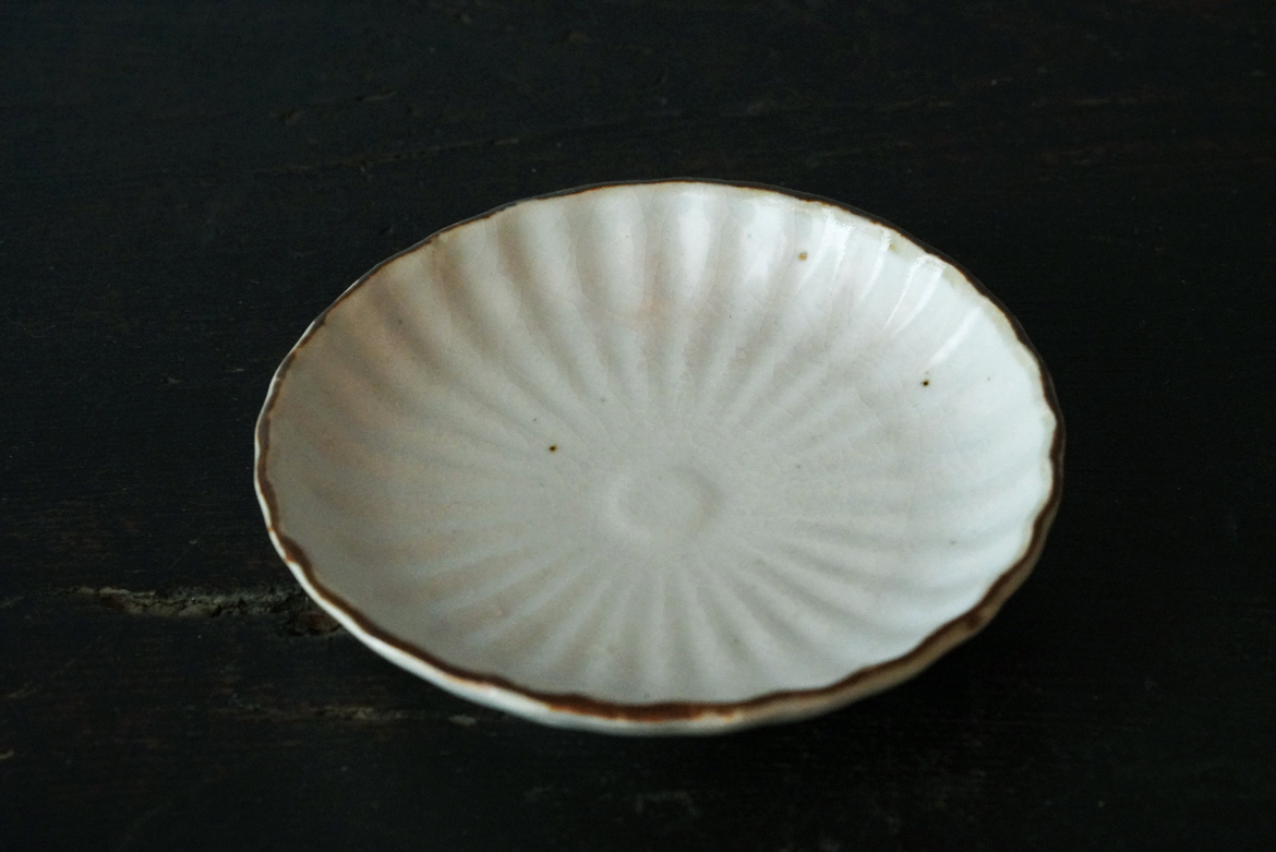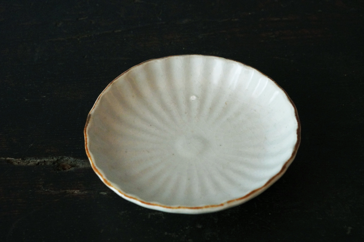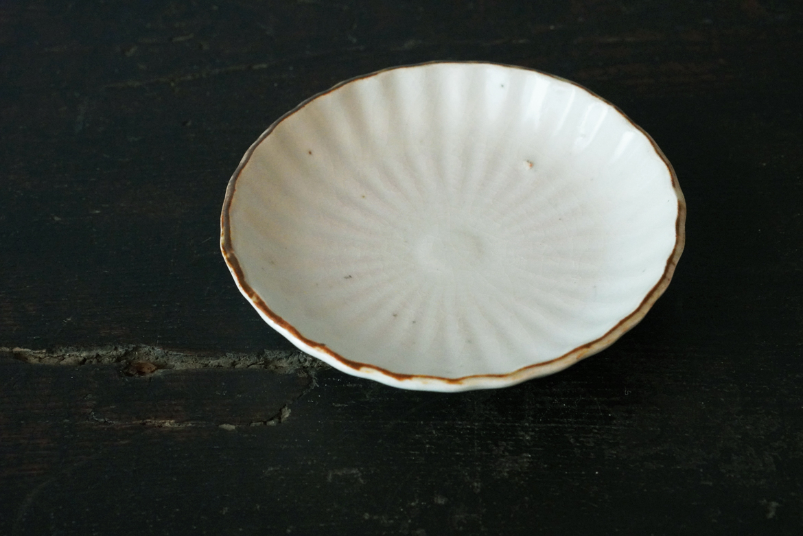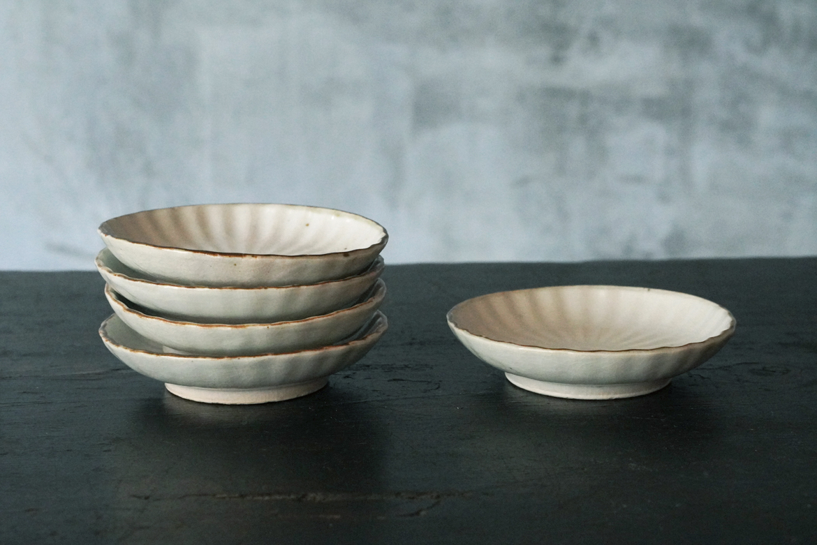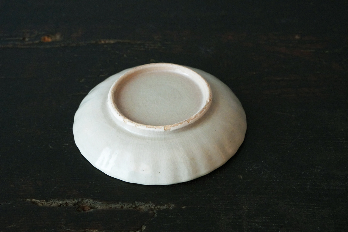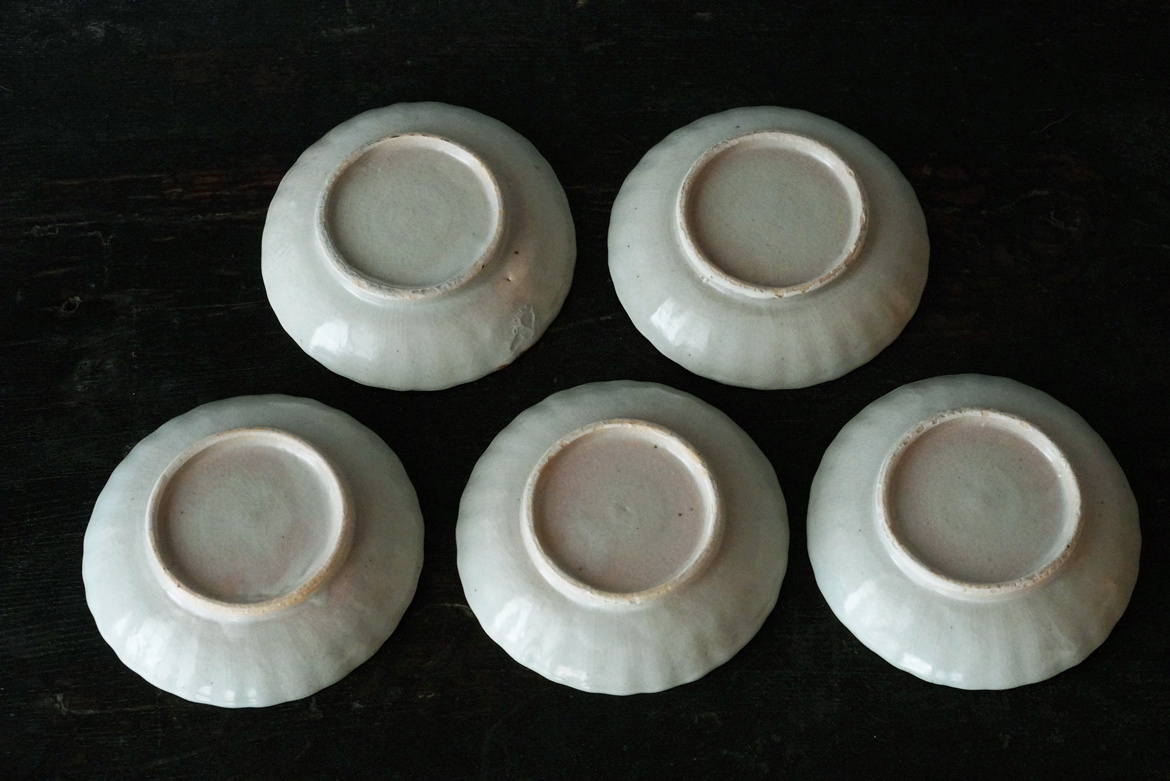 紅縁の菊花形白磁小皿五枚です。大きな痛みもなく状態は概ね良好。清潔感のある肌で、焼成も良く、わりと肉厚ですのでガンガン使えます。窯疵、磁貫はございますが、使用による痛みはございません。日々の食卓で活躍しそうな小皿です。江戸時代。