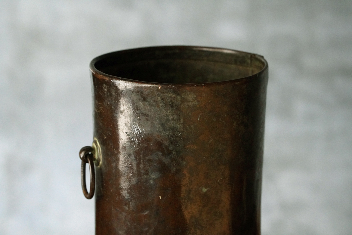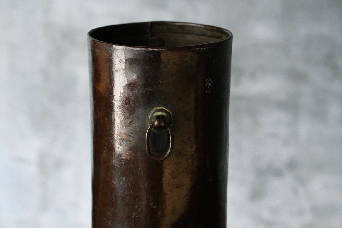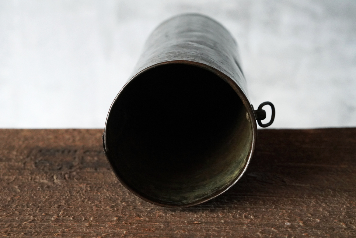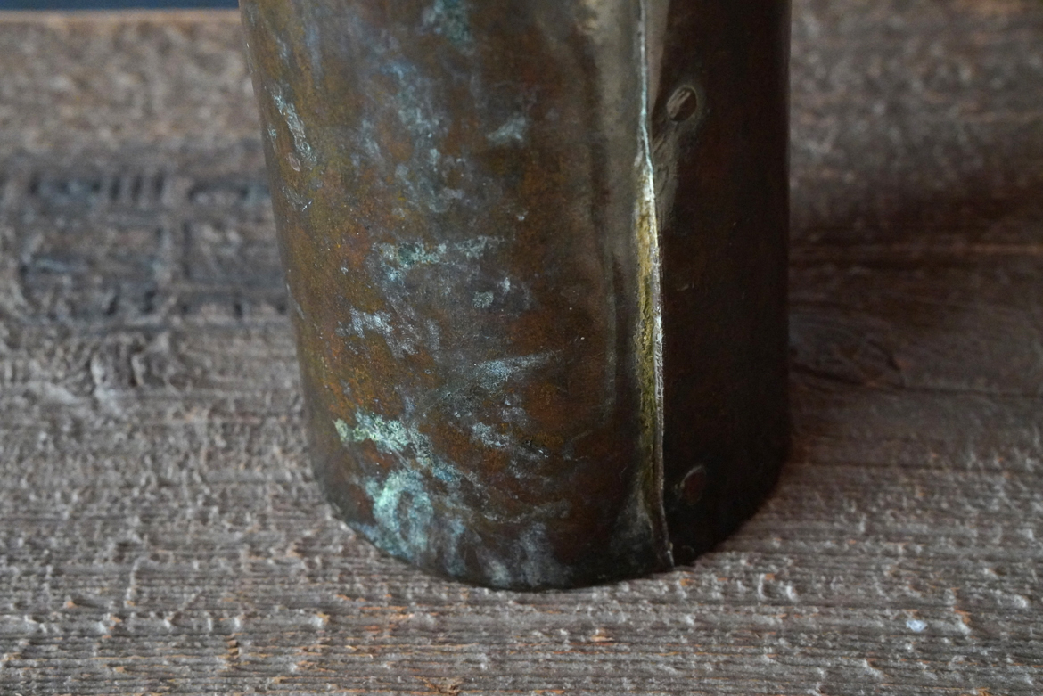 艶やかな肌のシンプルな古銅掛花。掛花になっていますが、わりと大き目ですので用途として置いて使う方が多いかもしれません。水を入れると重くなりますので掛花で使う際はしっかりした場所にてご使用ください。余計な意匠が一切ないのが潔く、活ける花がより映える花器ではないでしょうか。経筒を感じさせますので仏教美術との相性も抜群です。中世の経筒を気兼ねなく使うことは、なかなか出来る方も多くないと思いますが、これであれば日々、比較的、軽いお気持ちでお使いいただけます。且つ、この素朴な形ですので、どんな花も受け入れてくれますし、和洋を問わずどんな空間にもしっくりと配置できます。江戸時代。*水を張りましたが現状漏れはございません。箱はありません。
