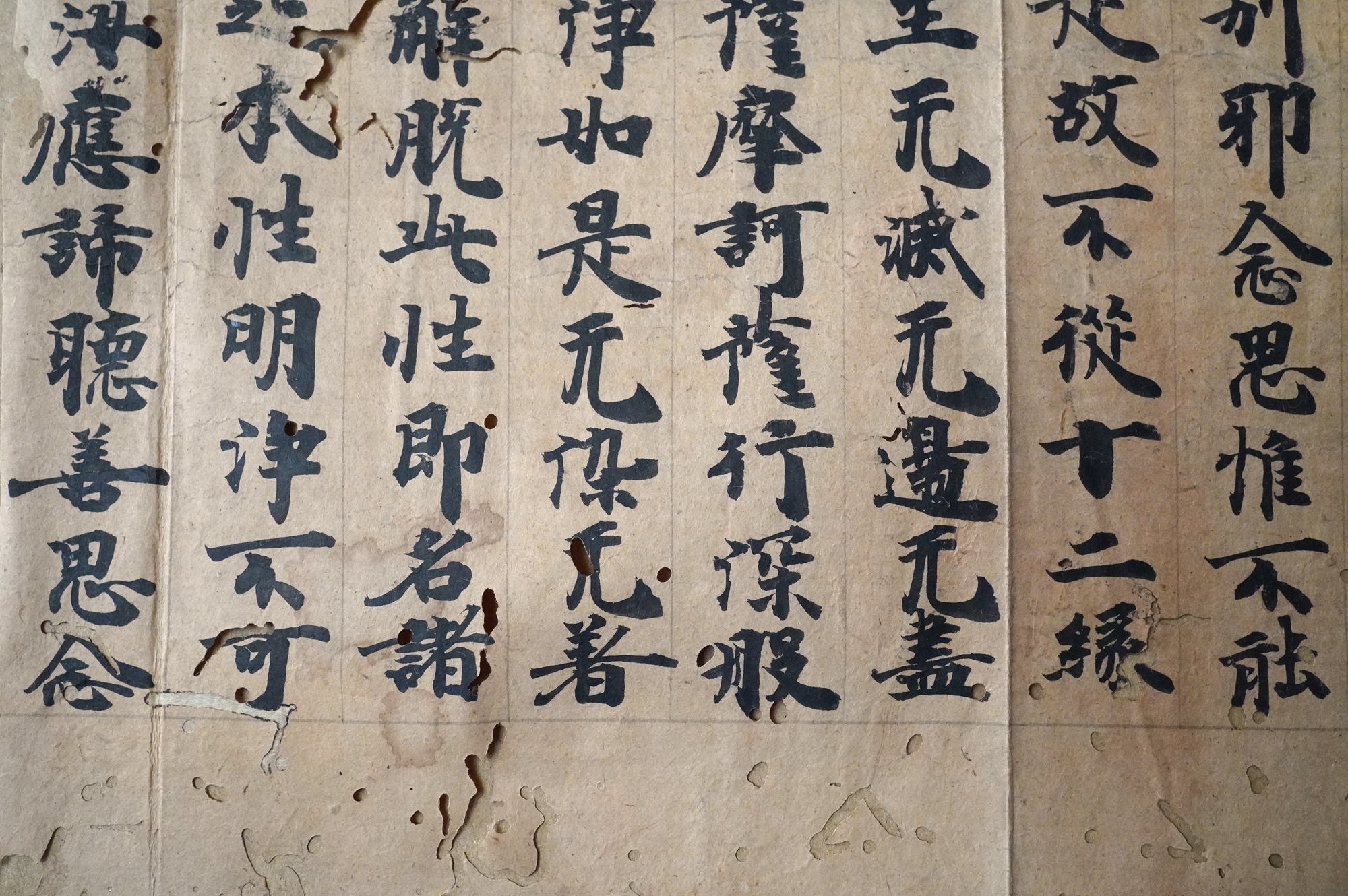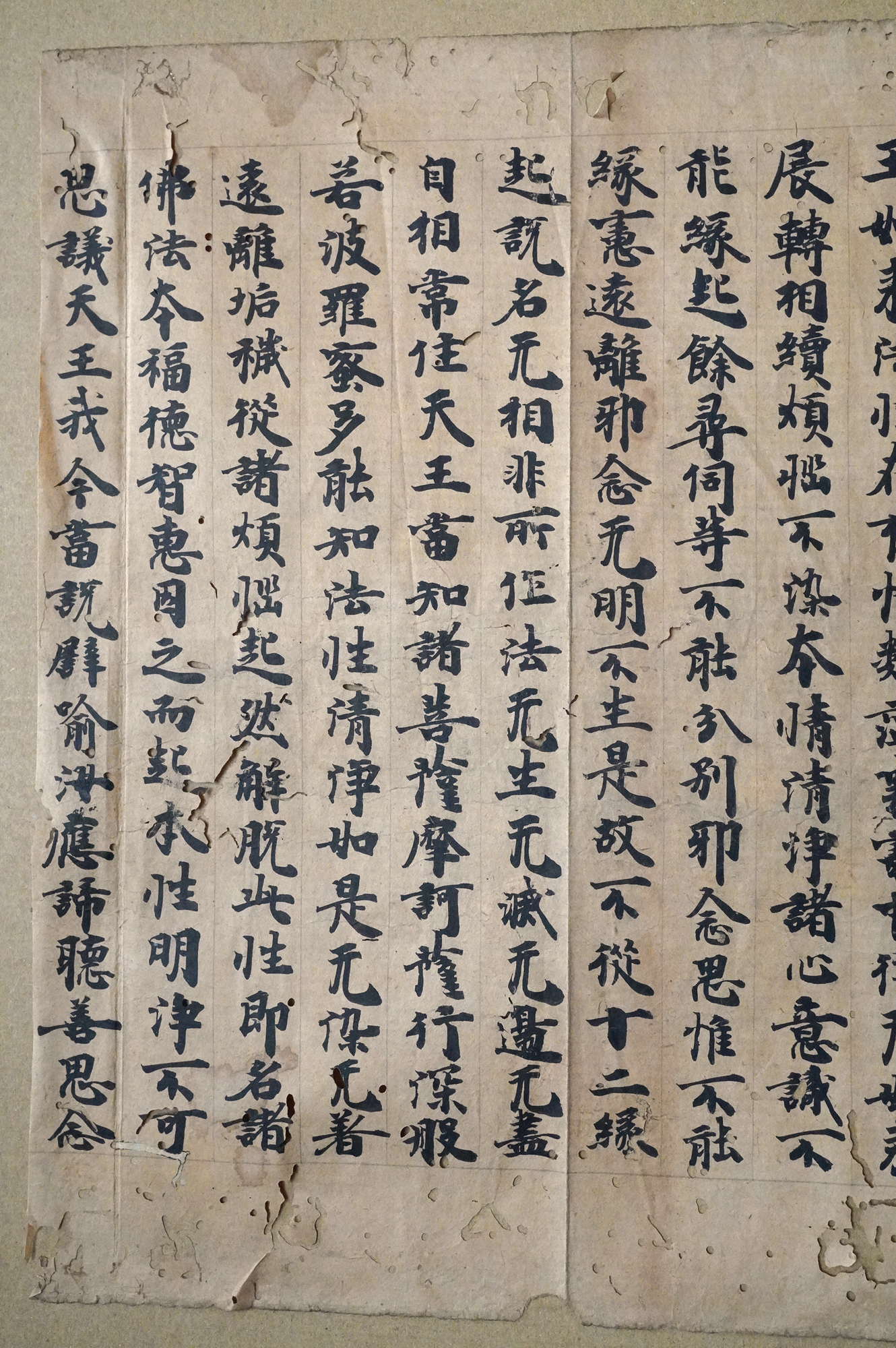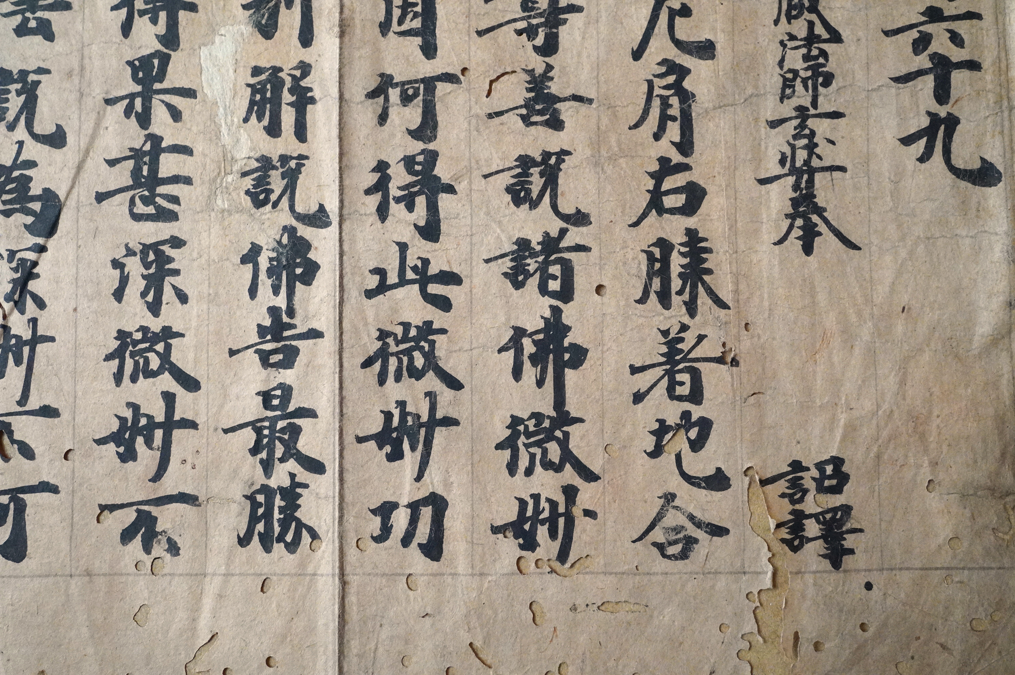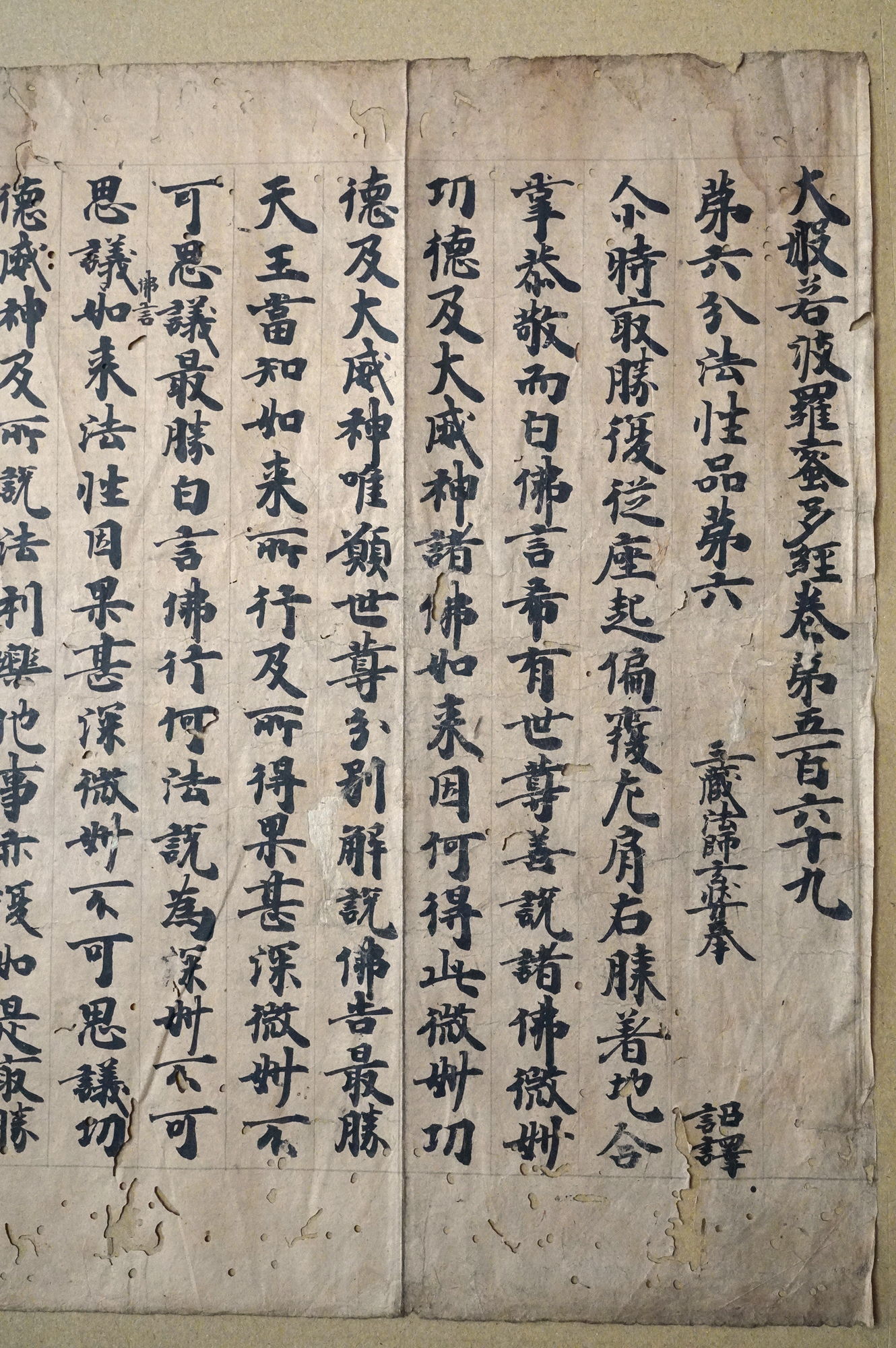 しっかりと力強さがある字で21行(一紙)。最初に大般若蜜多羅経巻第五百六十九とあり巻頭であることがわかるののも嬉しいポイント。古写経では、はじめの巻頭、最後の巻末であるかどうかも評価に大きく関係します。出自はわかりませんが鎌倉時代までは充分上がるものでしょう。一紙ありますので飾っても存在感がございます。初心者にもお求め易い価格にしましたので是非この機会に御検討ください。虫食い、日焼けなどございますので充分画像にて御確認下さい。*撮影はアクリル板を外しております。