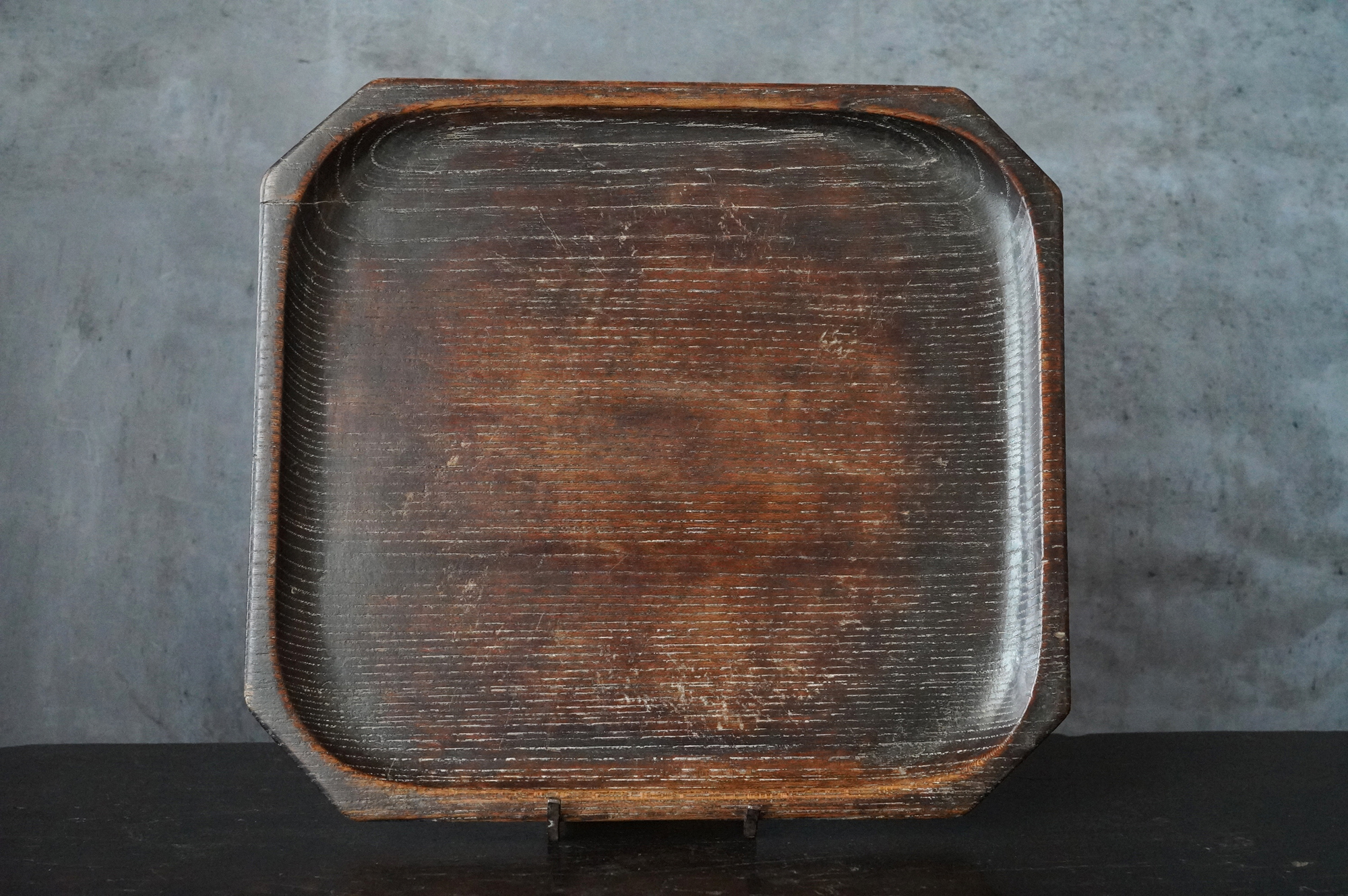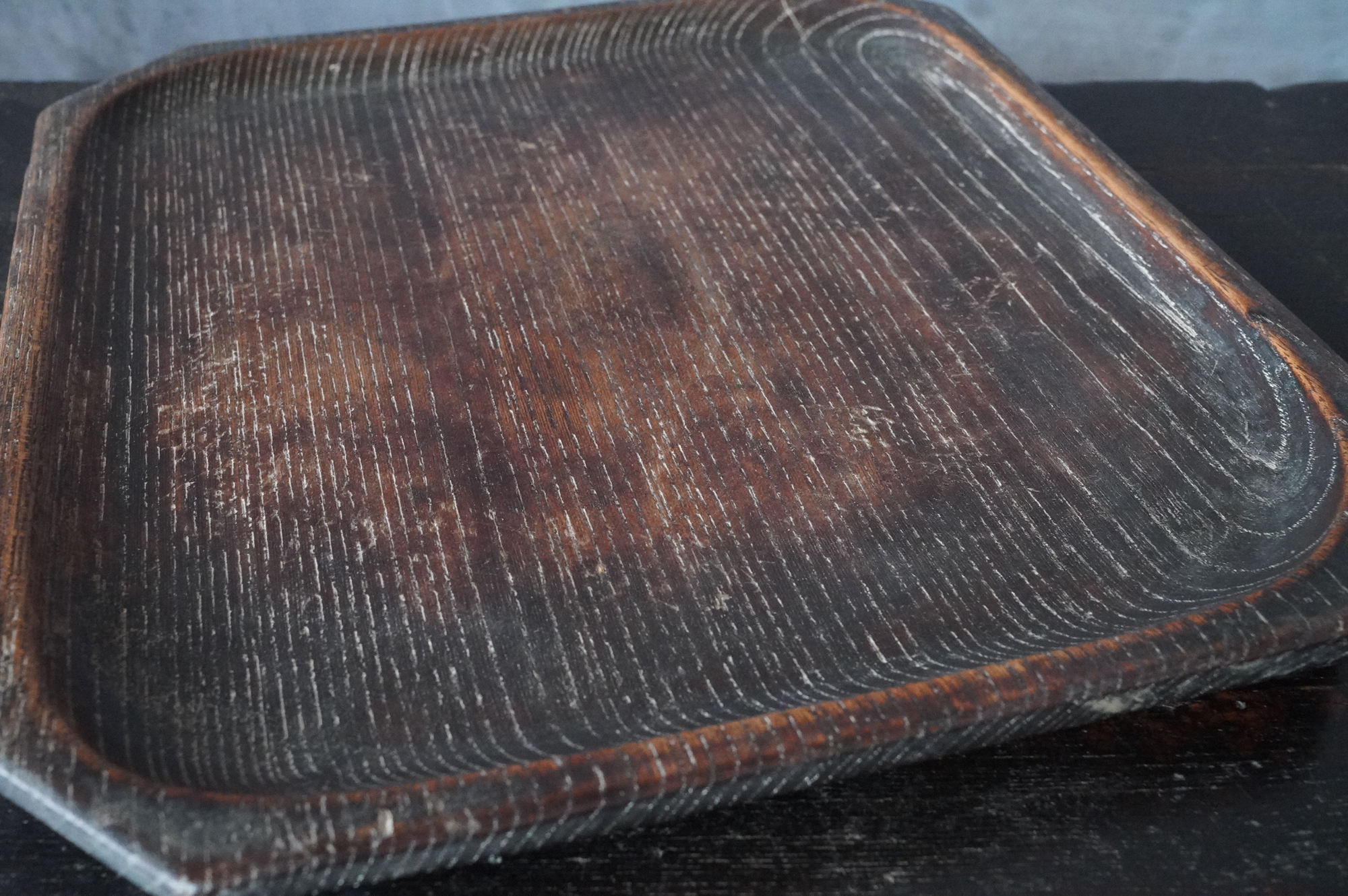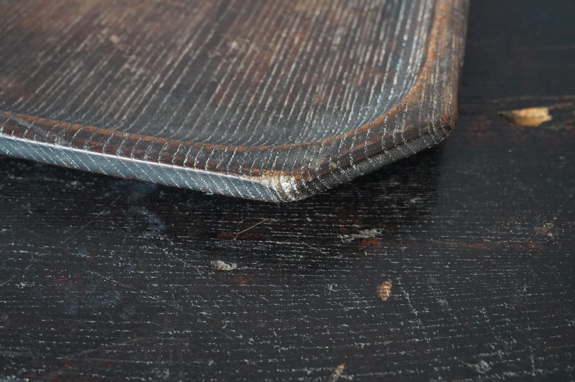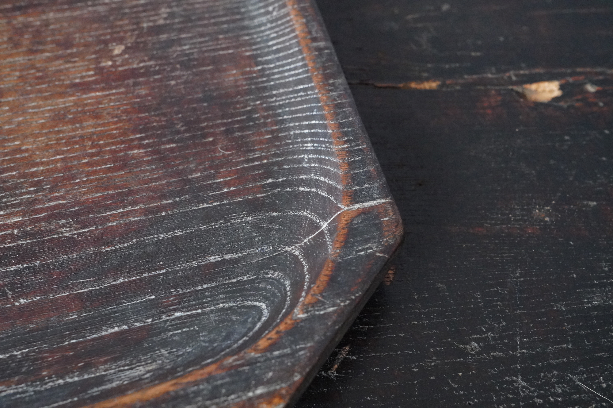 味わいが抜群の栗製の木地盆。塗などの施していない素地ですので、かなりの長い間、使用しないとここまでの味わいにはなりません。小ぶりな盆ですので、一人でのお茶や独酒に最適かと思います。一箇所ほんの少しヒビが生じていますが全く問題ないものです。大正~昭和期。