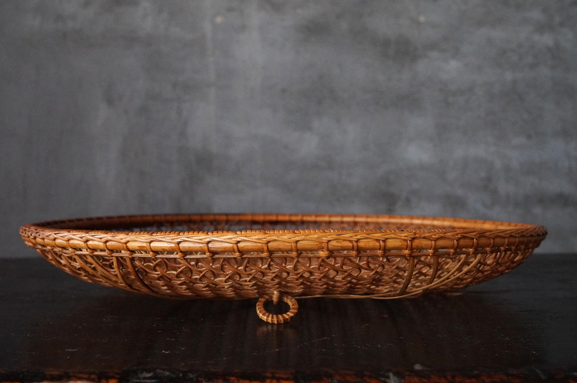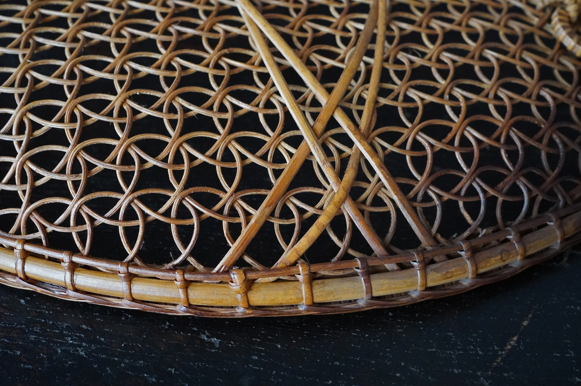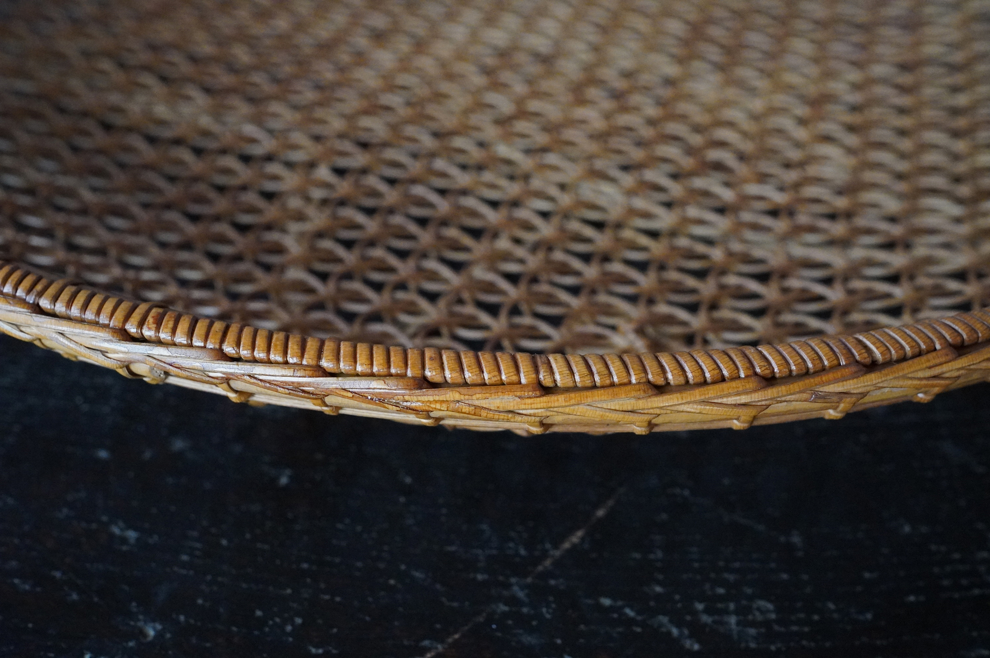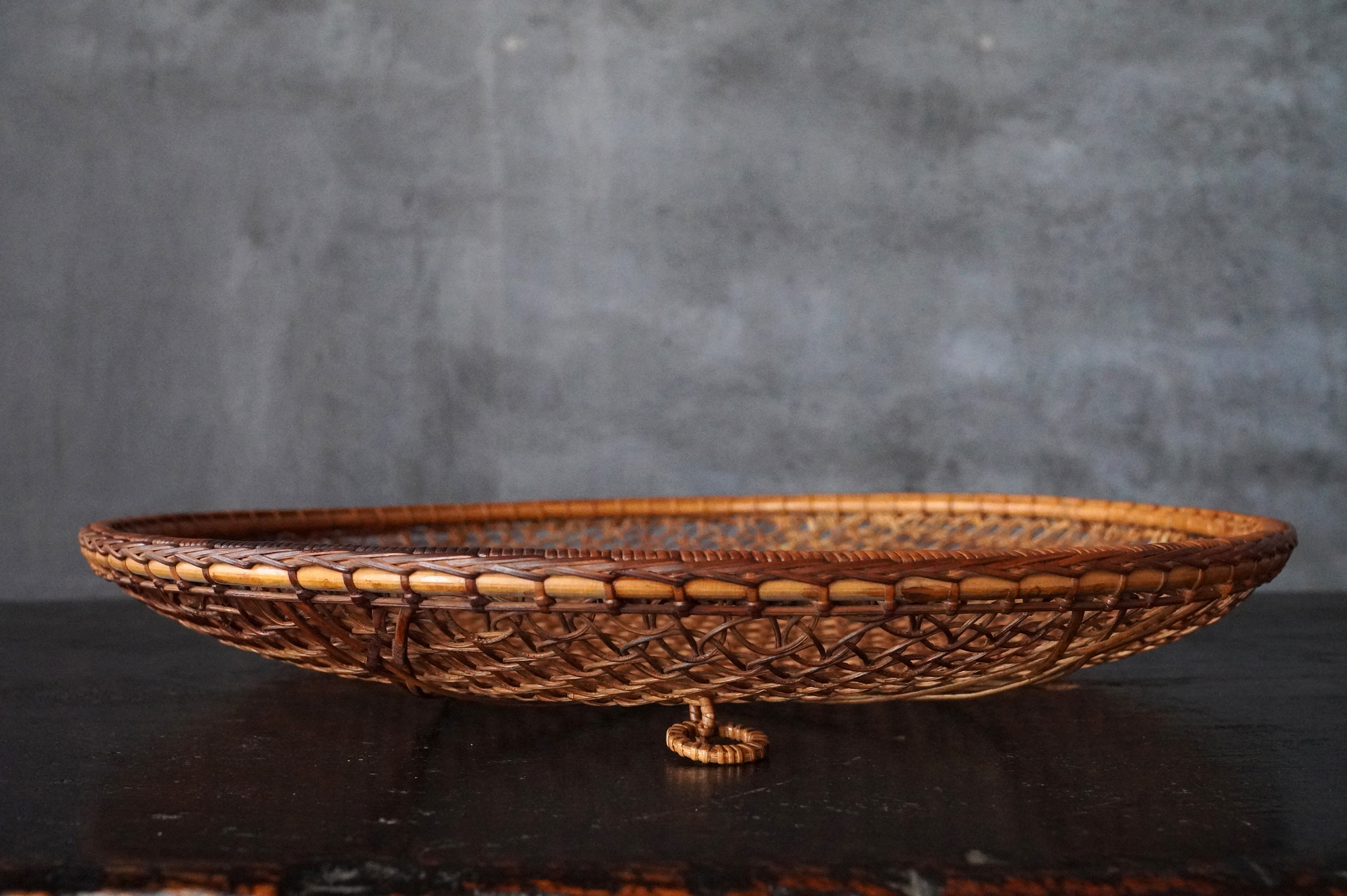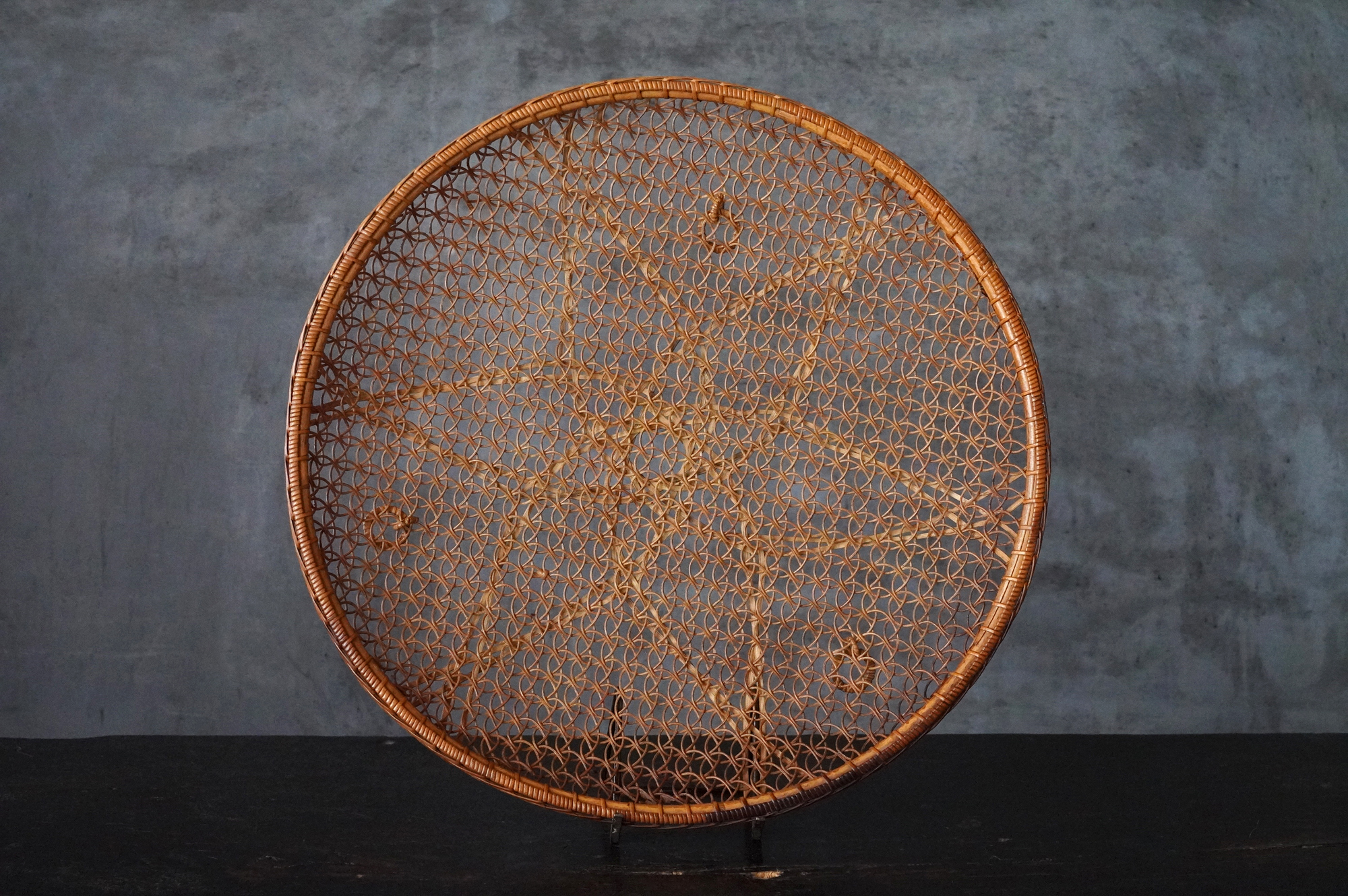 散華を行う際に香花や華葩を盛る皿状の器のことを華籠といいます。今は金属製の皿が主ですが、それ以前は竹などを編んだものが多く使われていたようです。本品は二重になっており外面は花形、内面は籠目に丁寧に細かく編み込まれております。状態は極めて良好。大きな痛みはありません。表面に漆などは施されていない自然な風合いが良いものです。江戸時代。