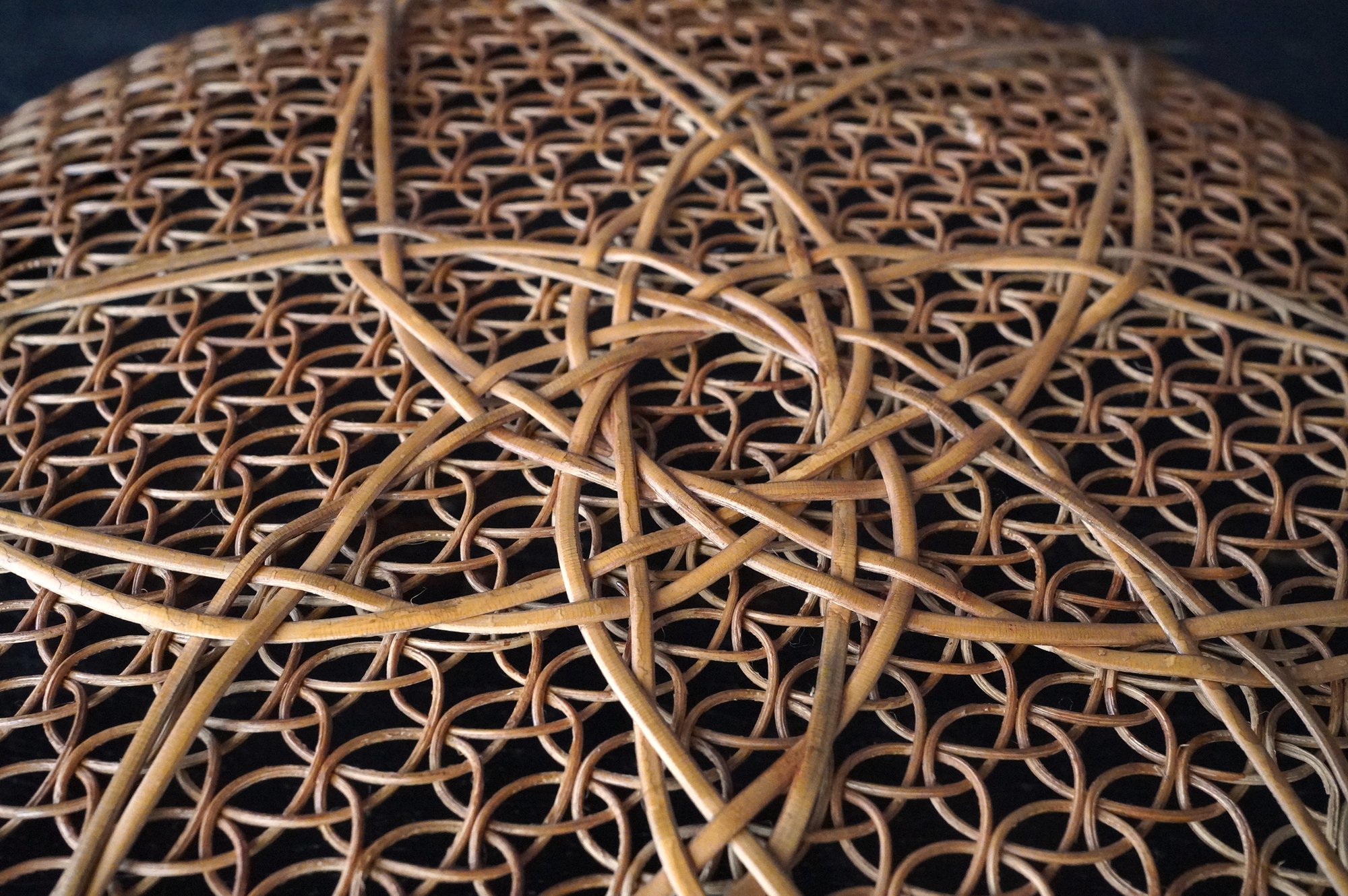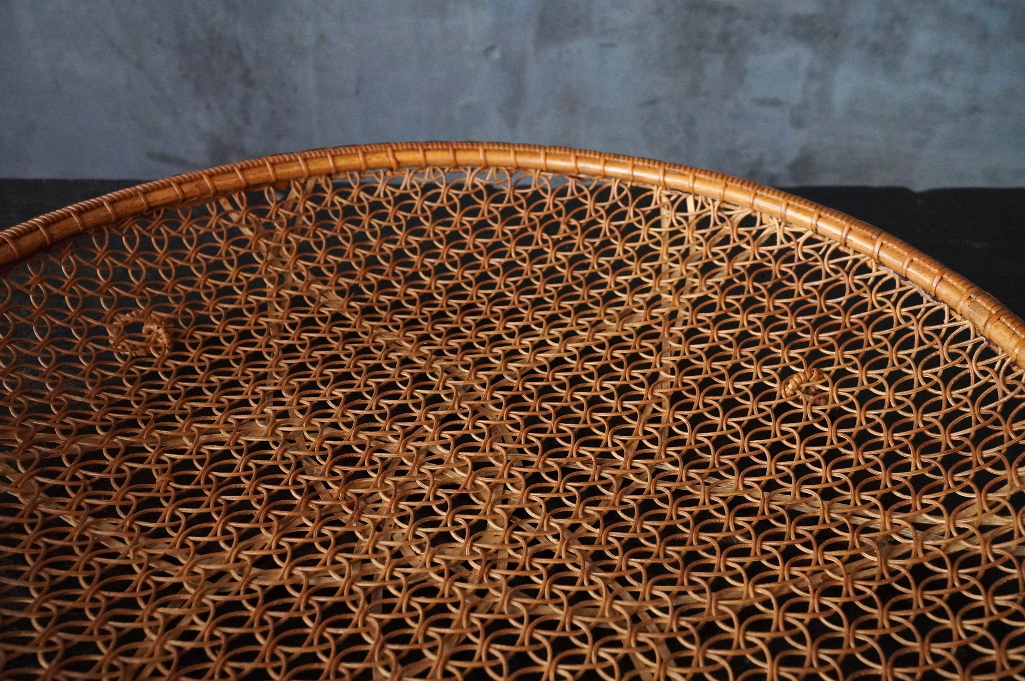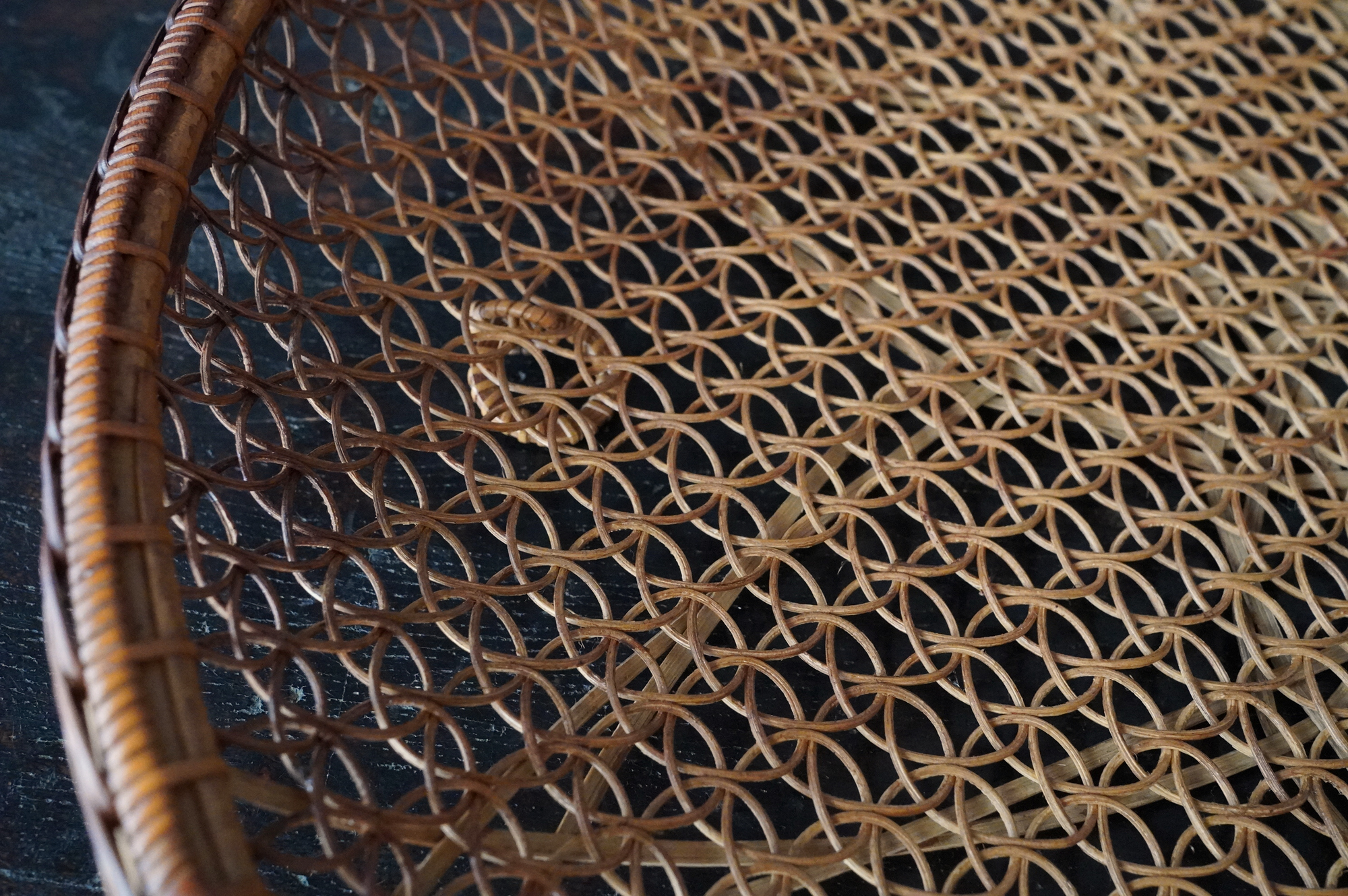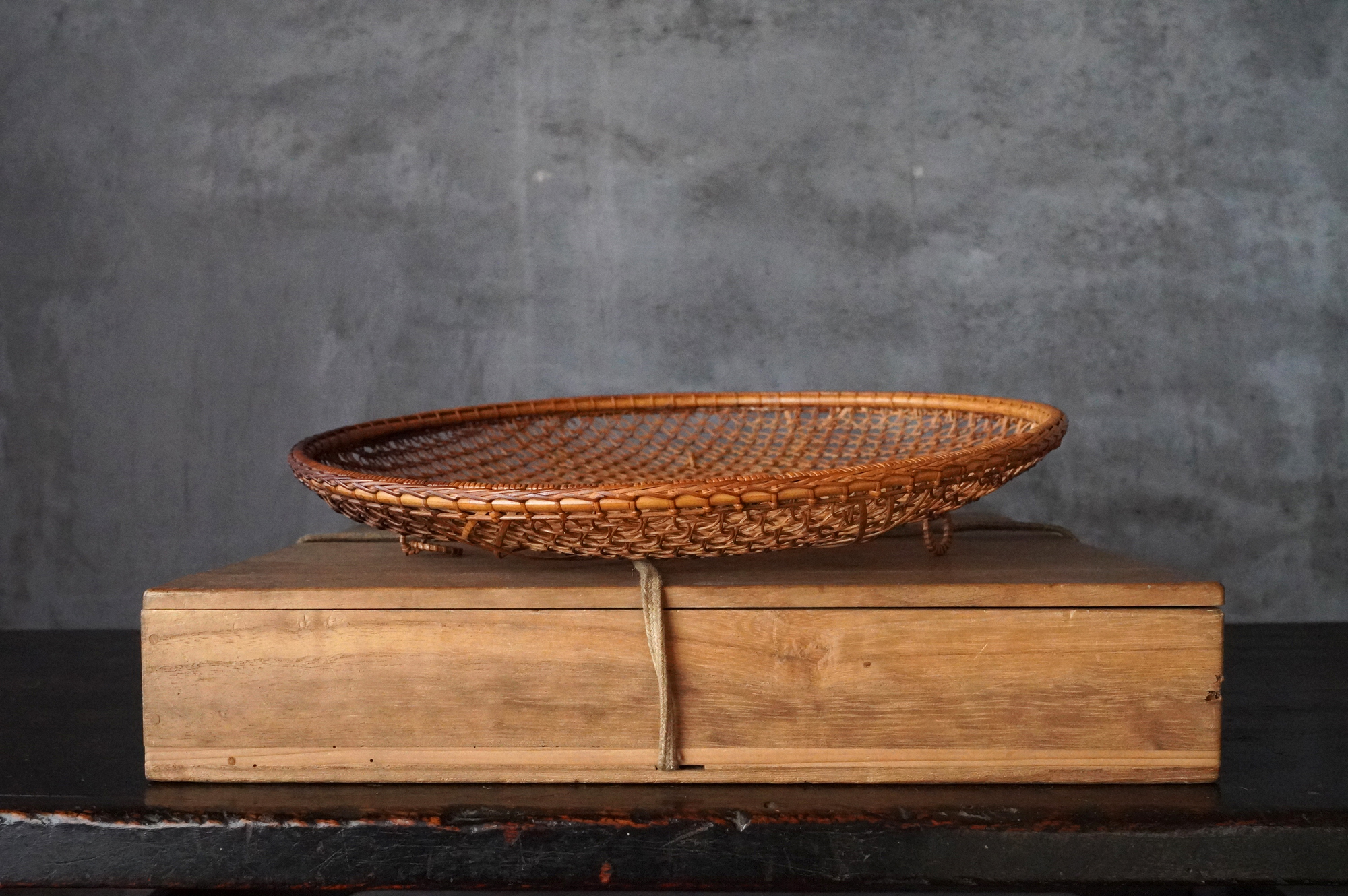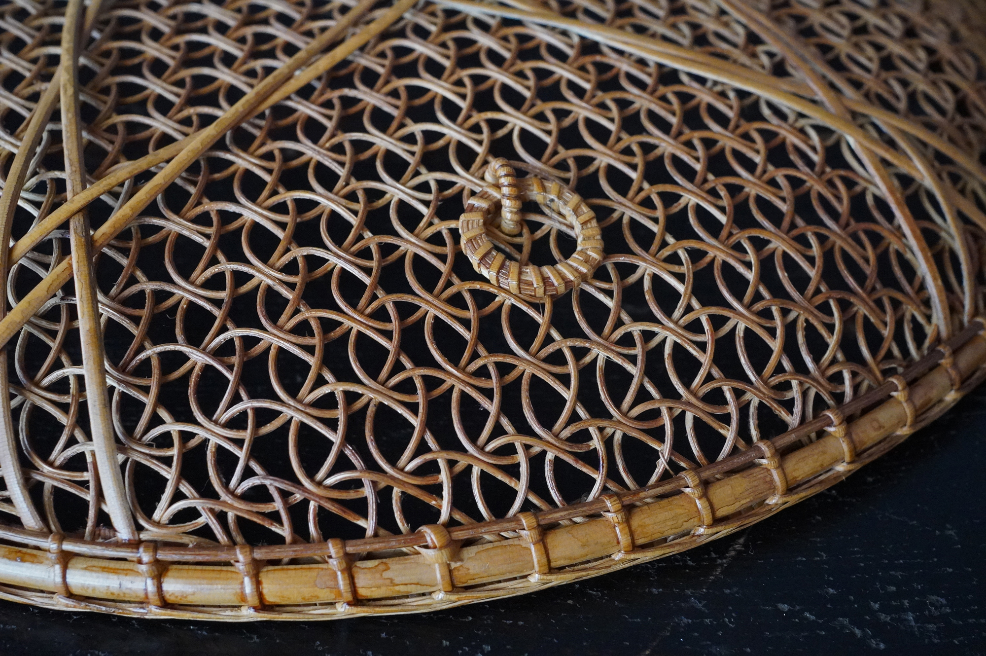 散華を行う際に香花や華葩を盛る皿状の器のことを華籠といいます。今は金属製の皿が主ですが、それ以前は竹などを編んだものが多く使われていたようです。本品は二重になっており外面は花形、内面は籠目に丁寧に細かく編み込まれております。状態は極めて良好。大きな痛みはありません。表面に漆などは施されていない自然な風合いが良いものです。江戸時代。