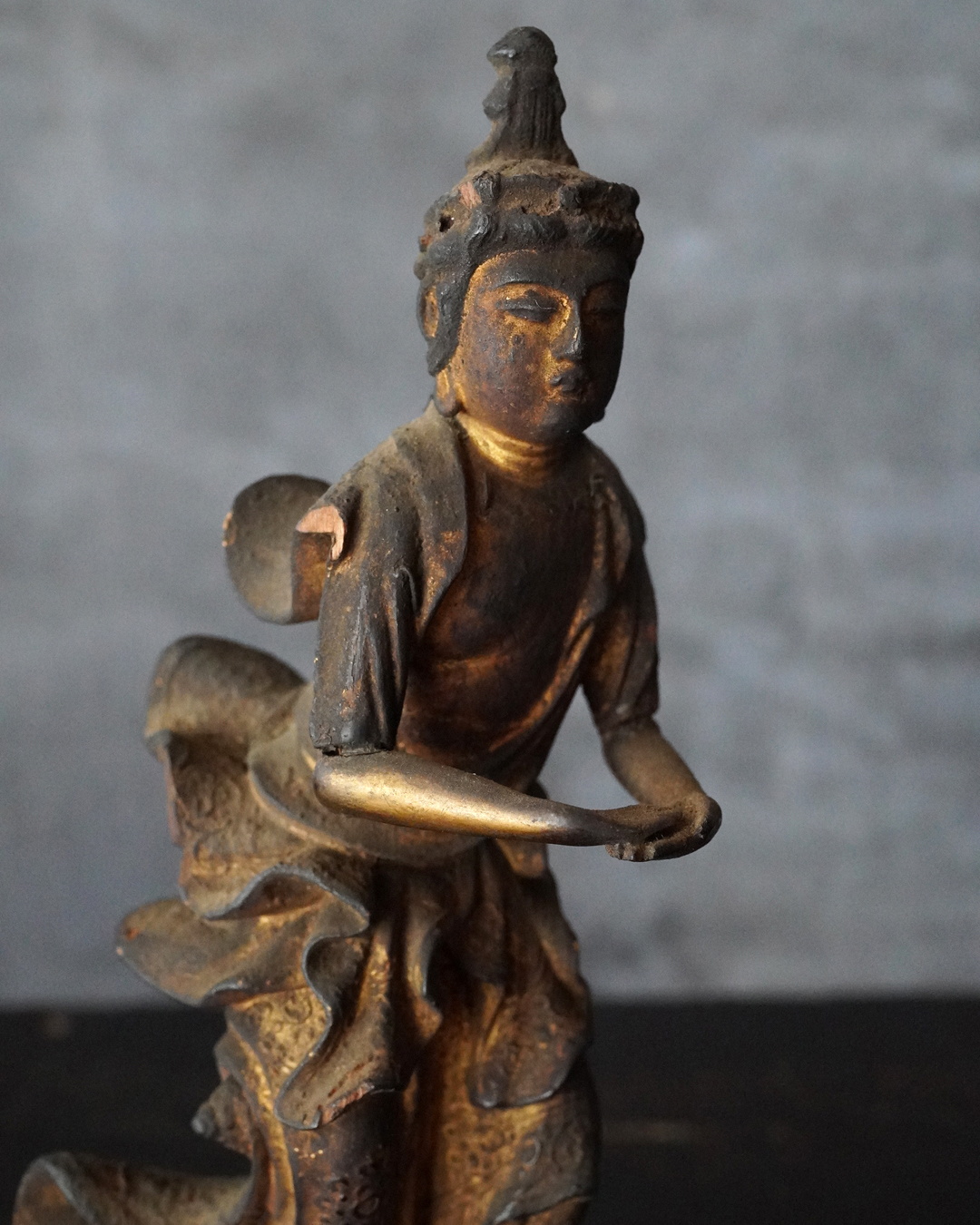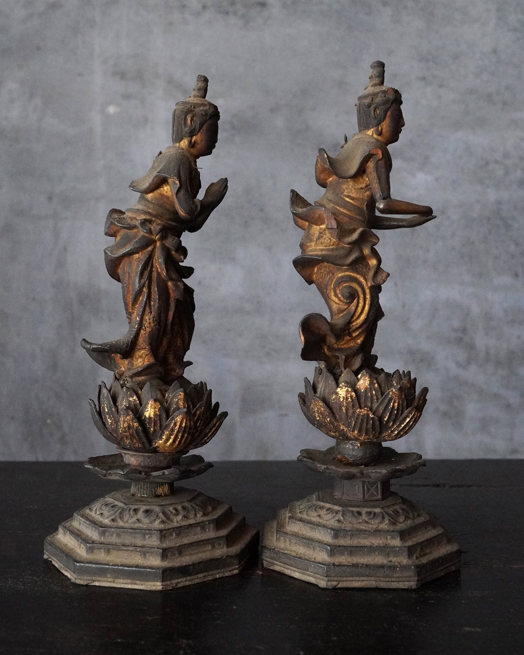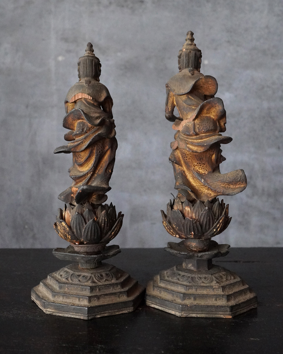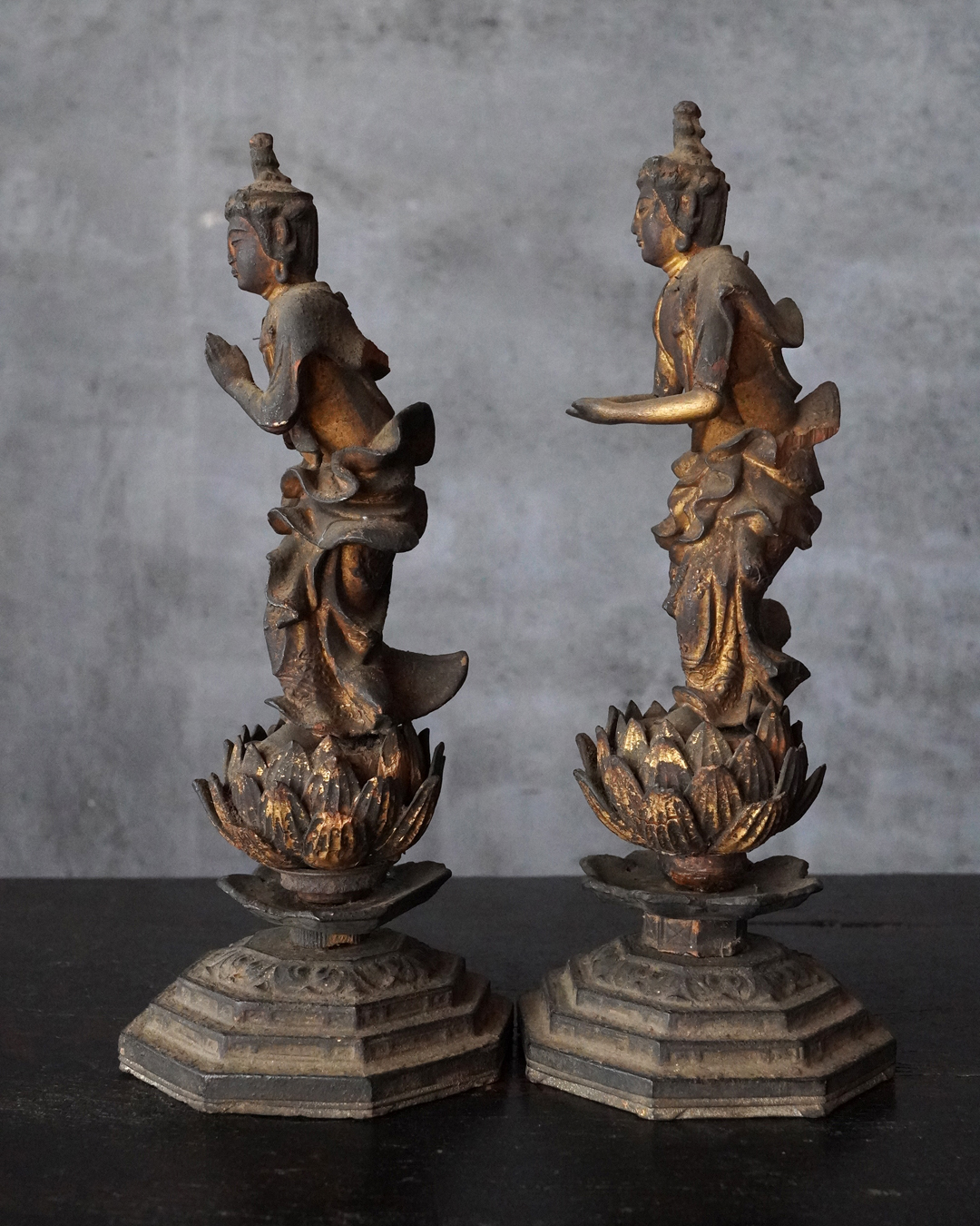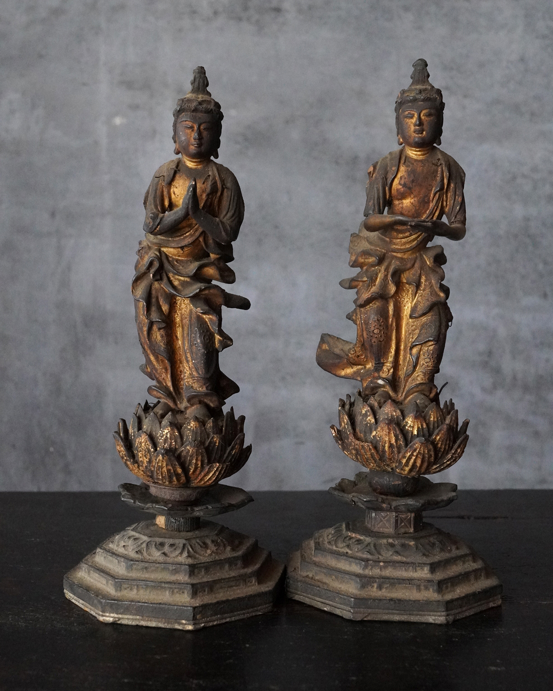 阿弥陀如来像の脇侍であった観音菩薩と勢至菩薩。阿弥陀如来から離れてしまいましたが、二躯揃っても数は多くないでしょう。なんと言っても優しい表情に魅了され、品格もあり、少し屈んで、腰を捻った姿が印象深く、表情、衣文なども丁寧に彫られており彫刻としても魅力あります。煤汚れや少しの破損、また台座は組んでありますが足りない部品もありますがこの類のものでは状態は決して悪くなく良好な部類と言っても差し支えない状態。時代相応の経年による変化がございますので十分画像をご確認の上ご注文下さい。