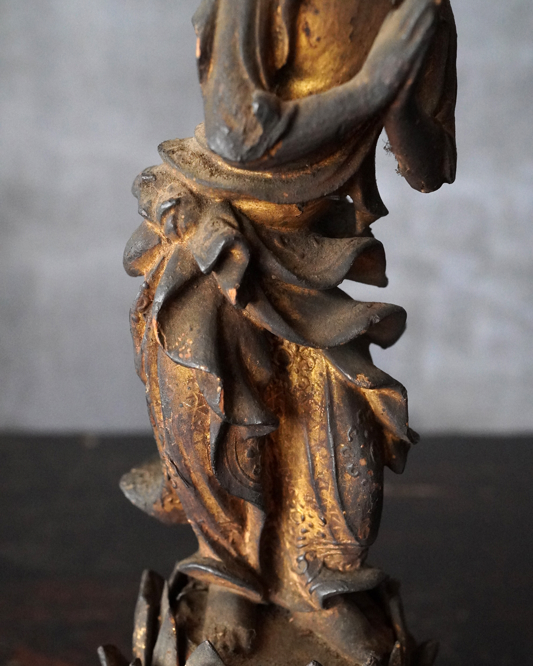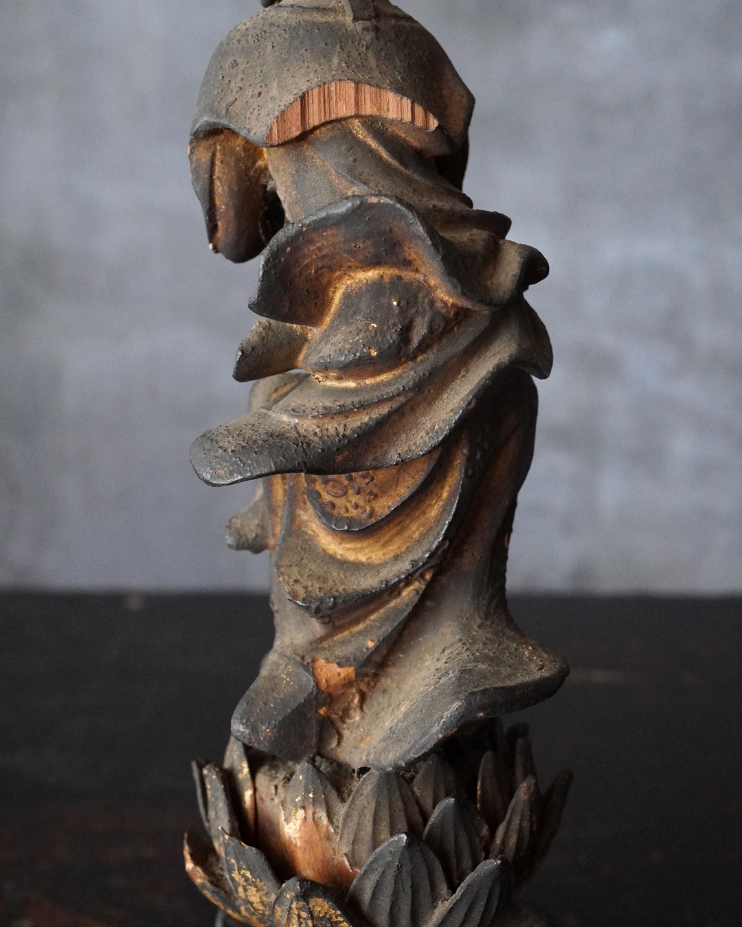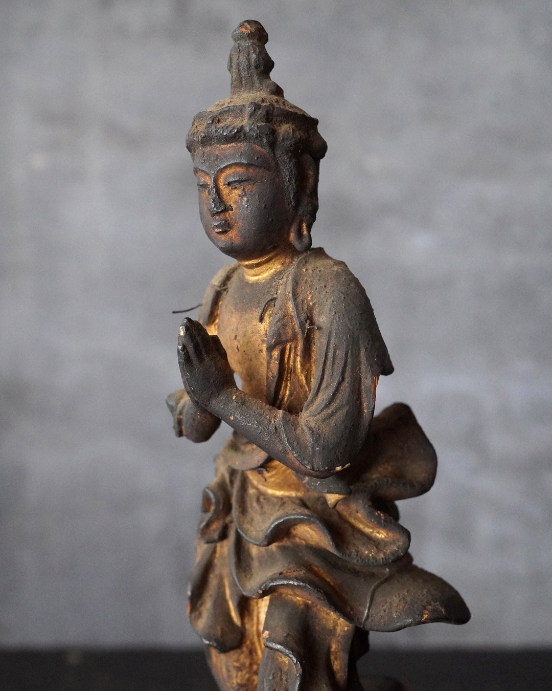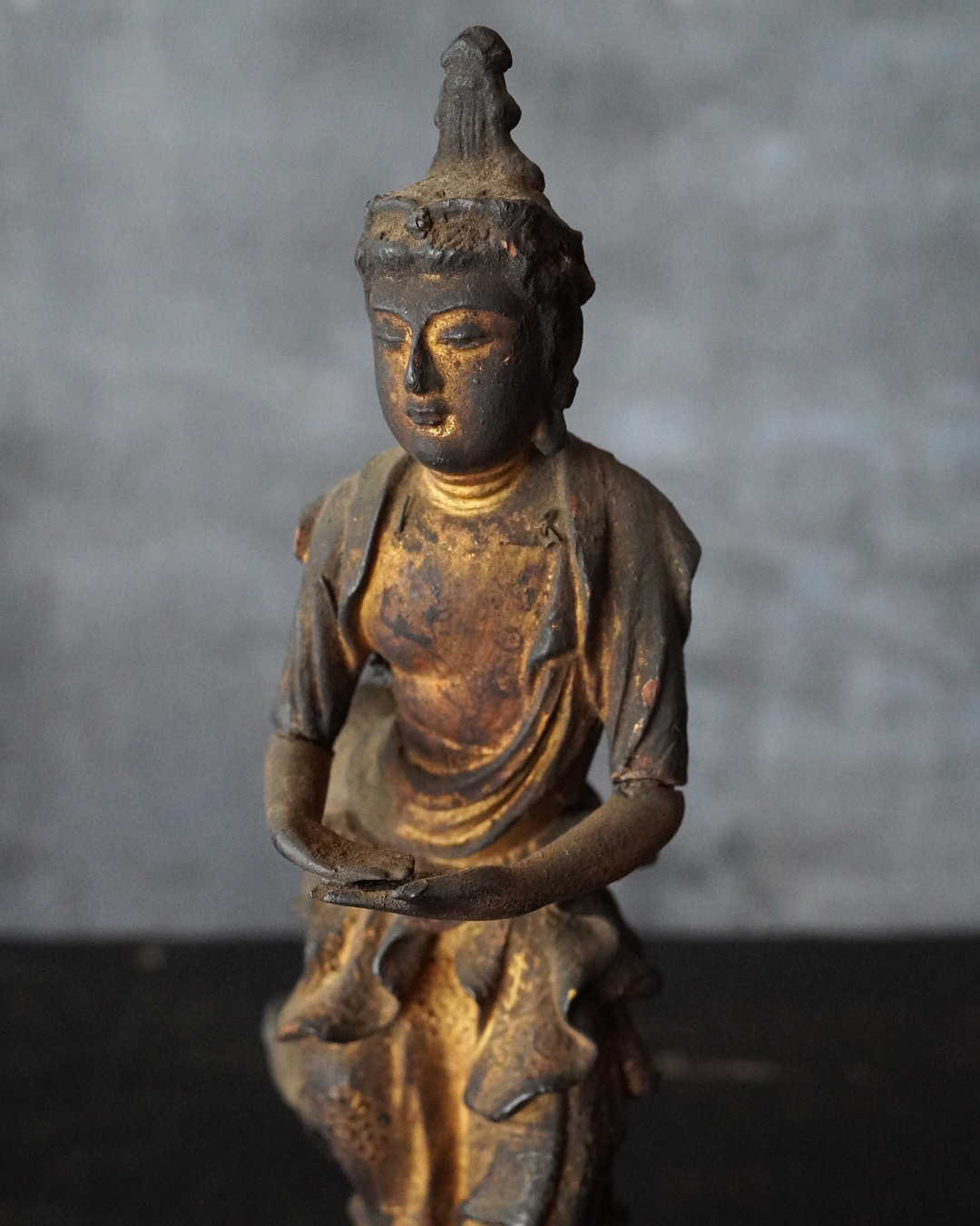 阿弥陀如来像の脇侍であった観音菩薩と勢至菩薩。阿弥陀如来から離れてしまいましたが、二躯揃っても数は多くないでしょう。なんと言っても優しい表情に魅了され、品格もあり、少し屈んで、腰を捻った姿が印象深く、表情、衣文なども丁寧に彫られており彫刻としても魅力あります。煤汚れや少しの破損、また台座は組んでありますが足りない部品もありますがこの類のものでは状態は決して悪くなく良好な部類と言っても差し支えない状態。時代相応の経年による変化がございますので十分画像をご確認の上ご注文下さい。