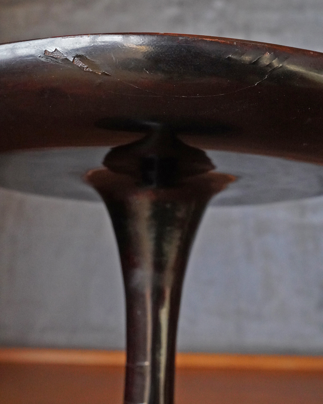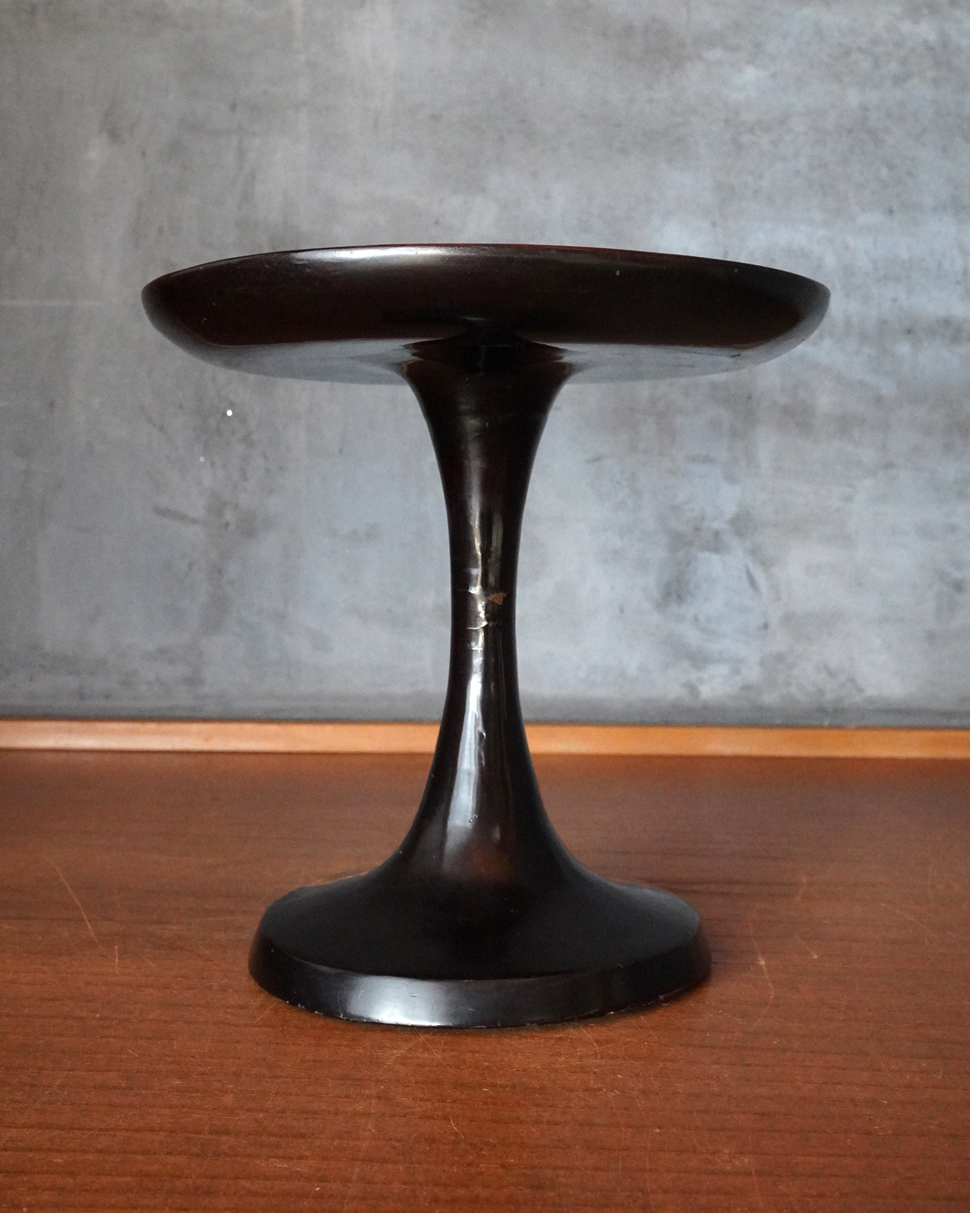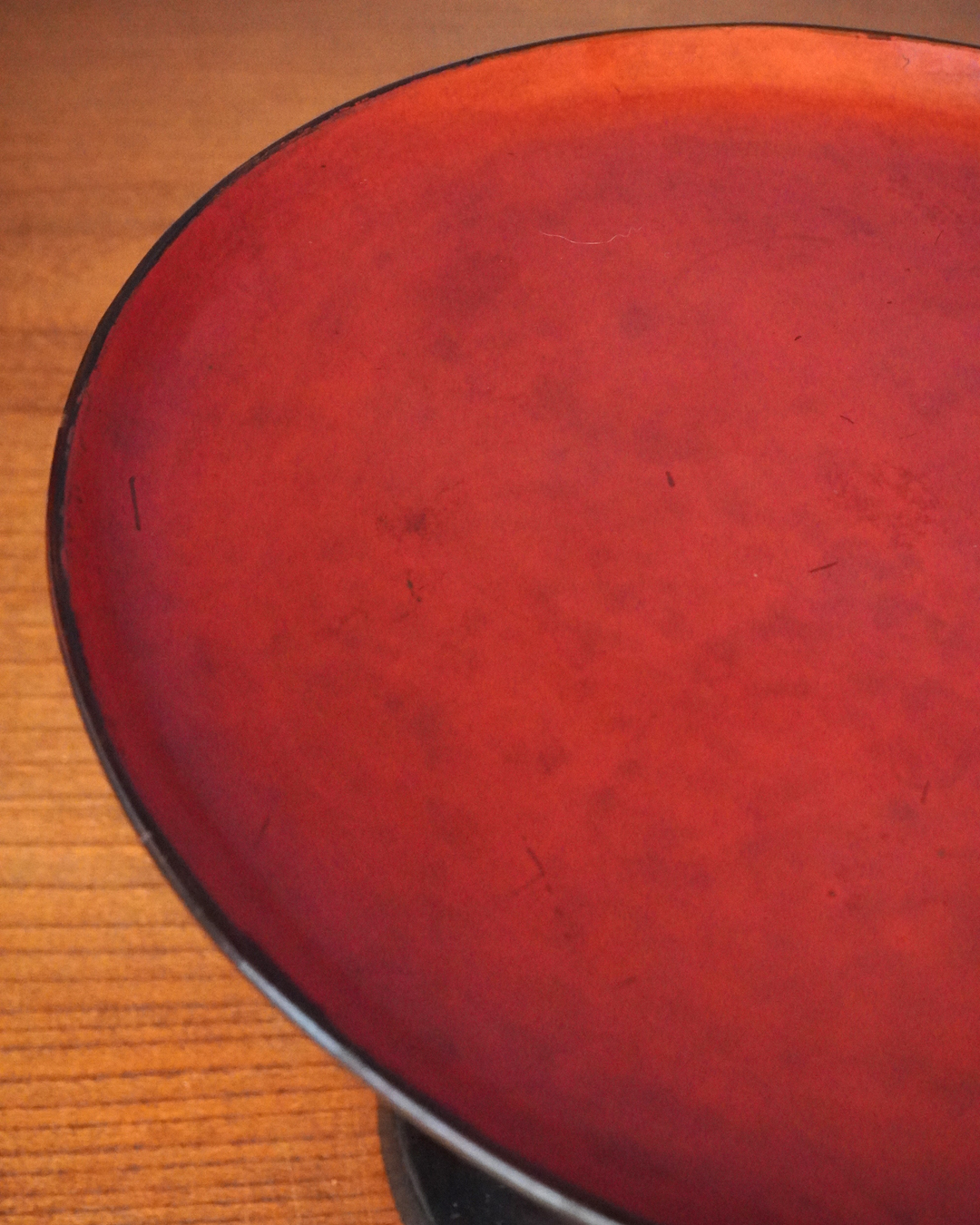 スラリとした品の良い姿の高杯。上部の天板の朱の塗りは堅牢で時代を経た深みのある色。下部は経年で接合部に塗りの剥がれ、塗り直しなどございますが古漆器好きであれば気にならないかと思います。古格あるスタイルで経年で落ち着きある色合いも魅力。時代相応の変化、個人的にはあまり気にならない程度ですが少しガタツキがあります、欠点とは考えておりませんが予めご了承ください。問題なくご使用可能です(気になる際は何かを咬ませれば安定します)。江戸時代。
