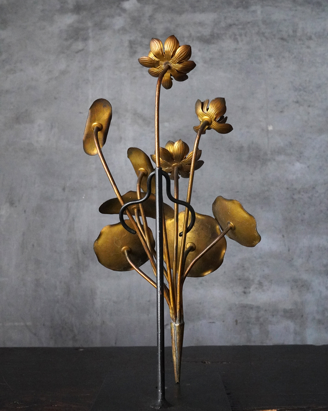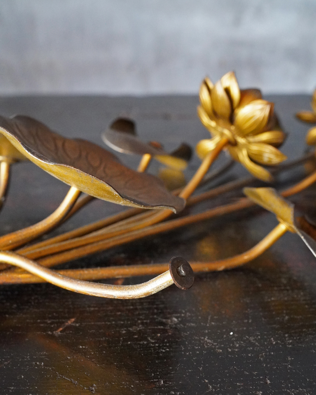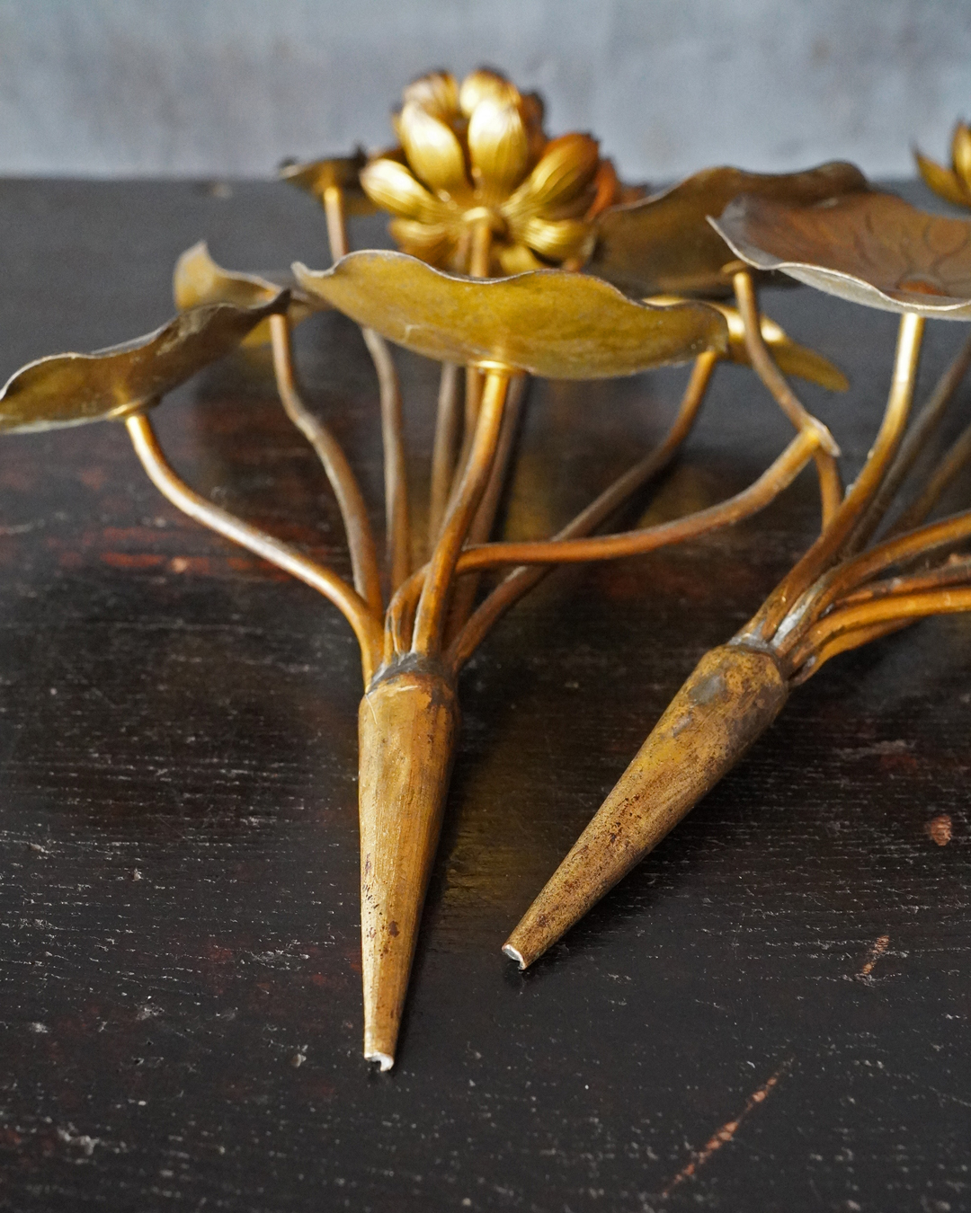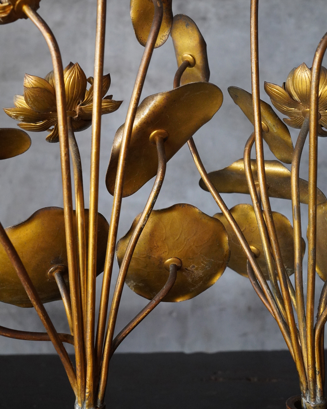 仏前で使う常花(金蓮華)一対。一箇所、葉の部分に欠損があります。しかしながら魅力を損なうものではございません。金色のものですが、時代を経た味わいは非常に渋い表情で良い感じです。本来は花瓶もあるものですが、本品は常花のみです。しかしながらそのまま飾っても充分楽しめます。明治時代。