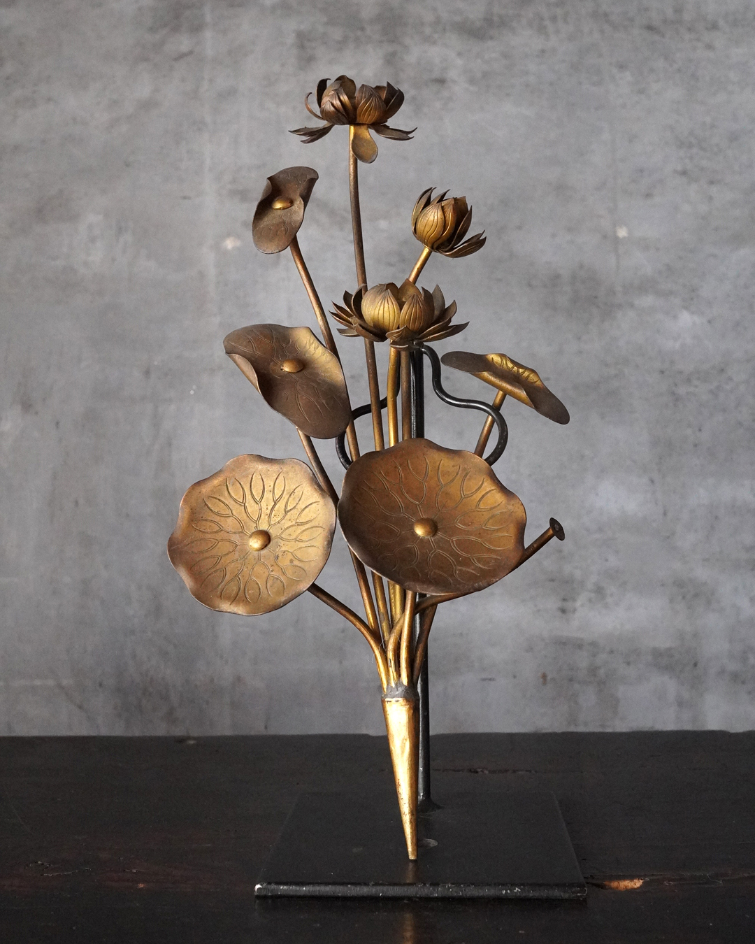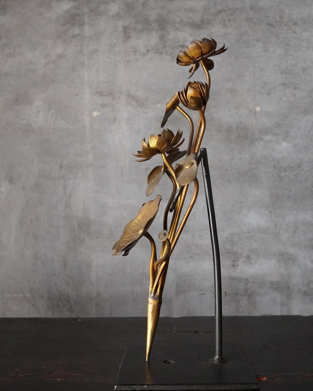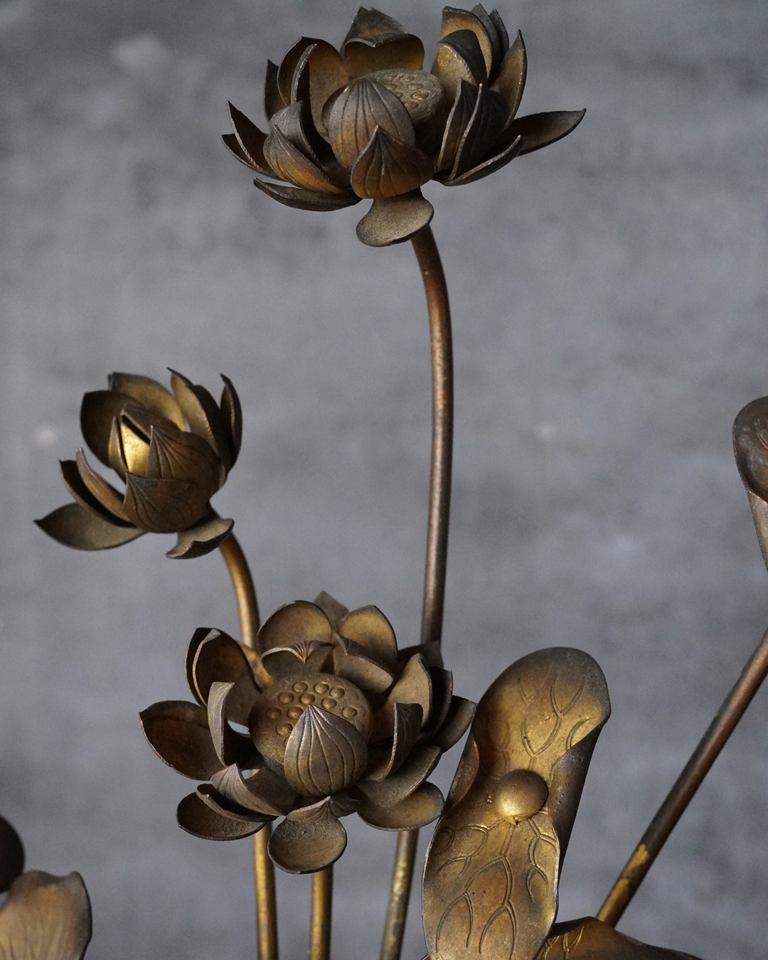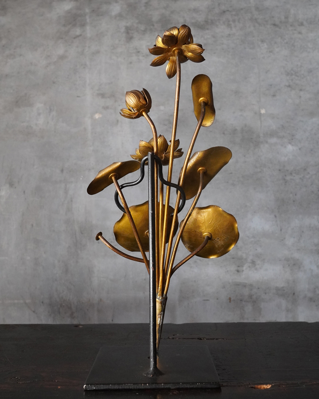 仏前で使う常花(金蓮華)一対。一箇所、葉の部分に欠損があります。しかしながら魅力を損なうものではございません。金色のものですが、時代を経た味わいは非常に渋い表情で良い感じです。本来は花瓶もあるものですが、本品は常花のみです。しかしながらそのまま飾っても充分楽しめます。明治時代。