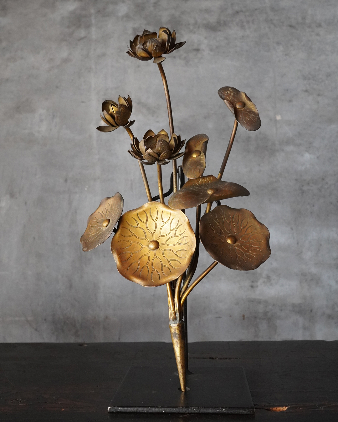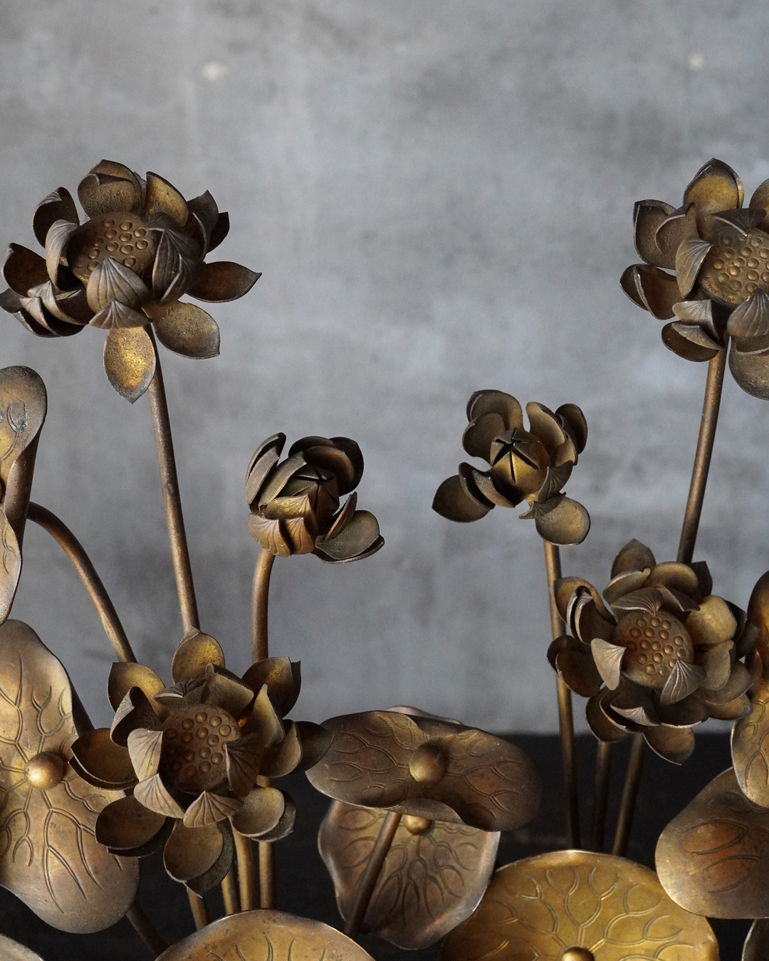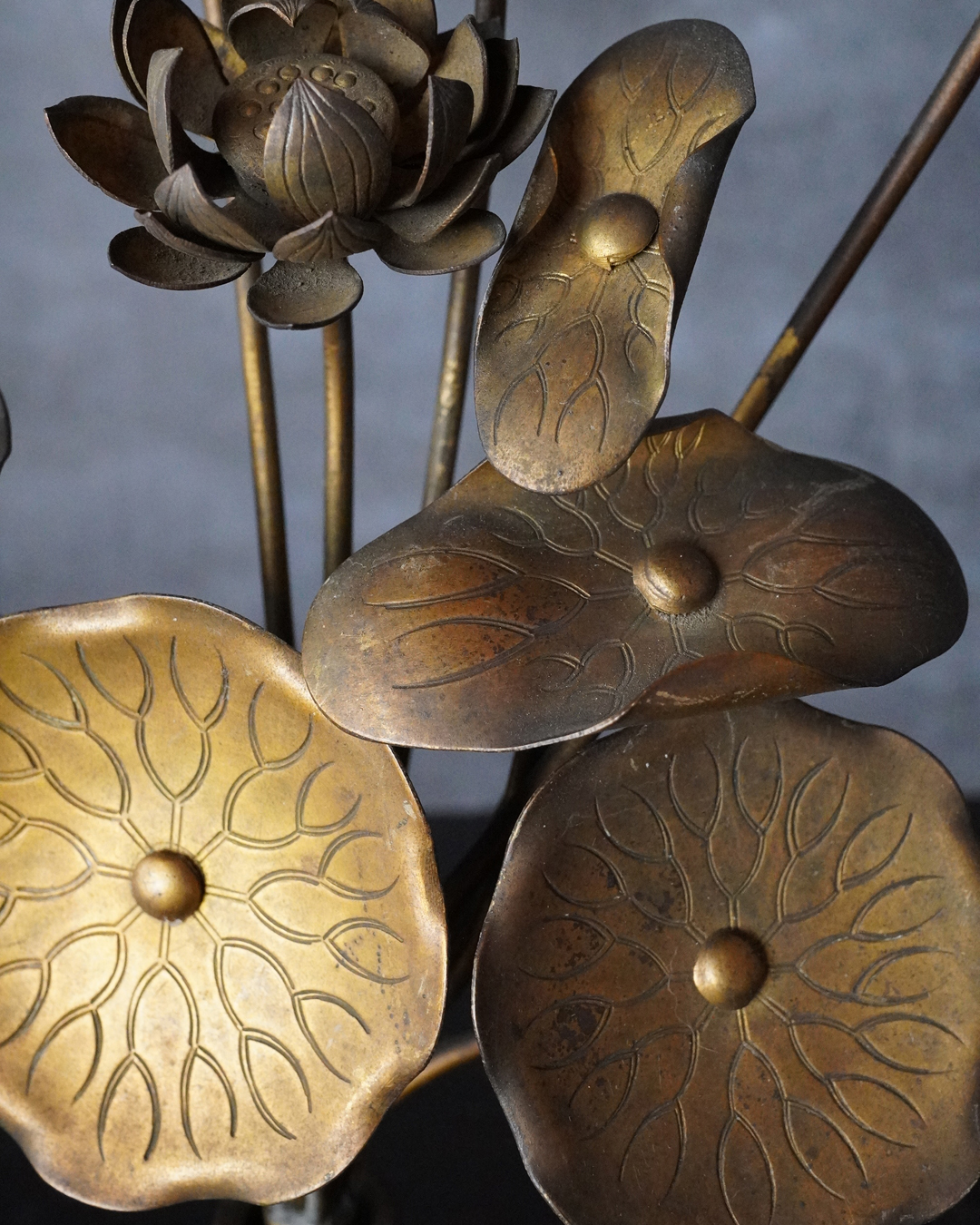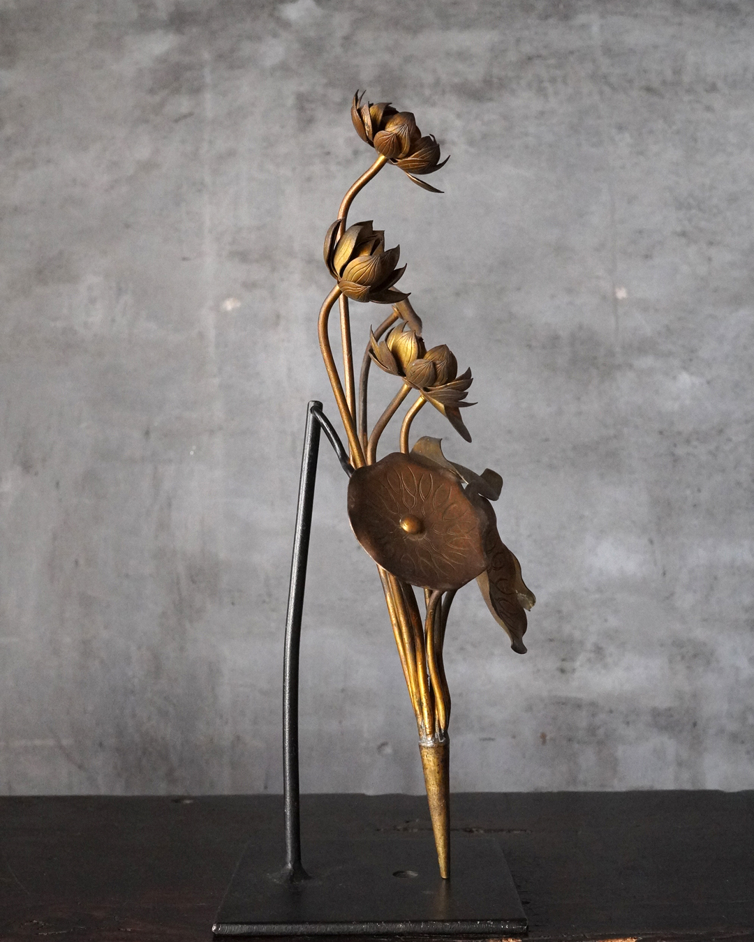 仏前で使う常花(金蓮華)一対。一箇所、葉の部分に欠損があります。しかしながら魅力を損なうものではございません。金色のものですが、時代を経た味わいは非常に渋い表情で良い感じです。本来は花瓶もあるものですが、本品は常花のみです。しかしながらそのまま飾っても充分楽しめます。明治時代。