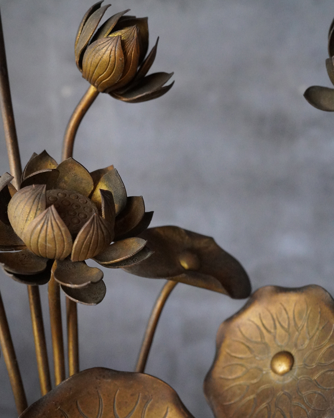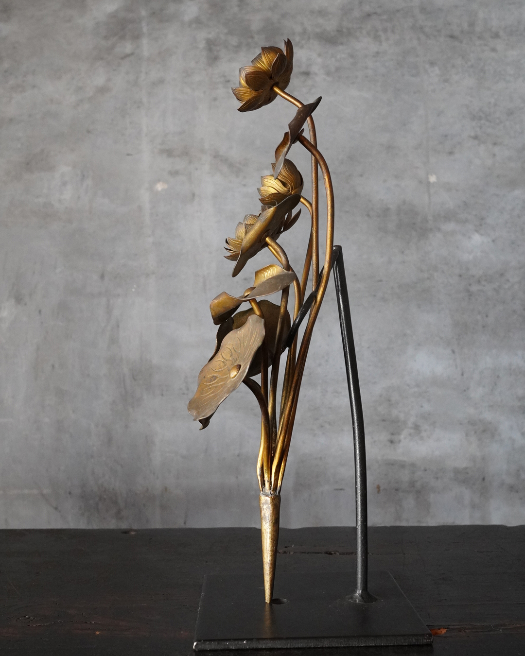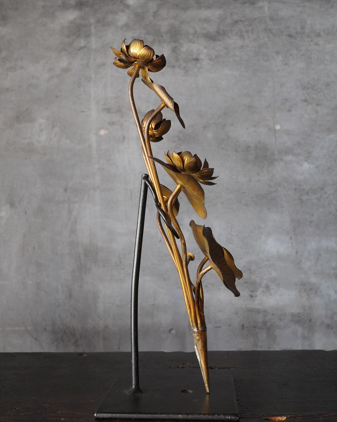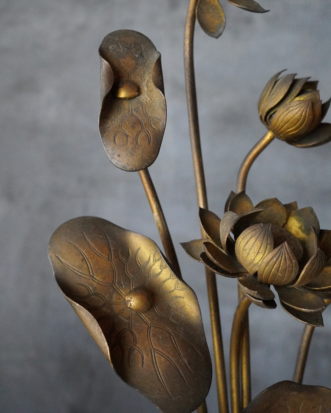 仏前で使う常花(金蓮華)一対。一箇所、葉の部分に欠損があります。しかしながら魅力を損なうものではございません。金色のものですが、時代を経た味わいは非常に渋い表情で良い感じです。本来は花瓶もあるものですが、本品は常花のみです。しかしながらそのまま飾っても充分楽しめます。明治時代。