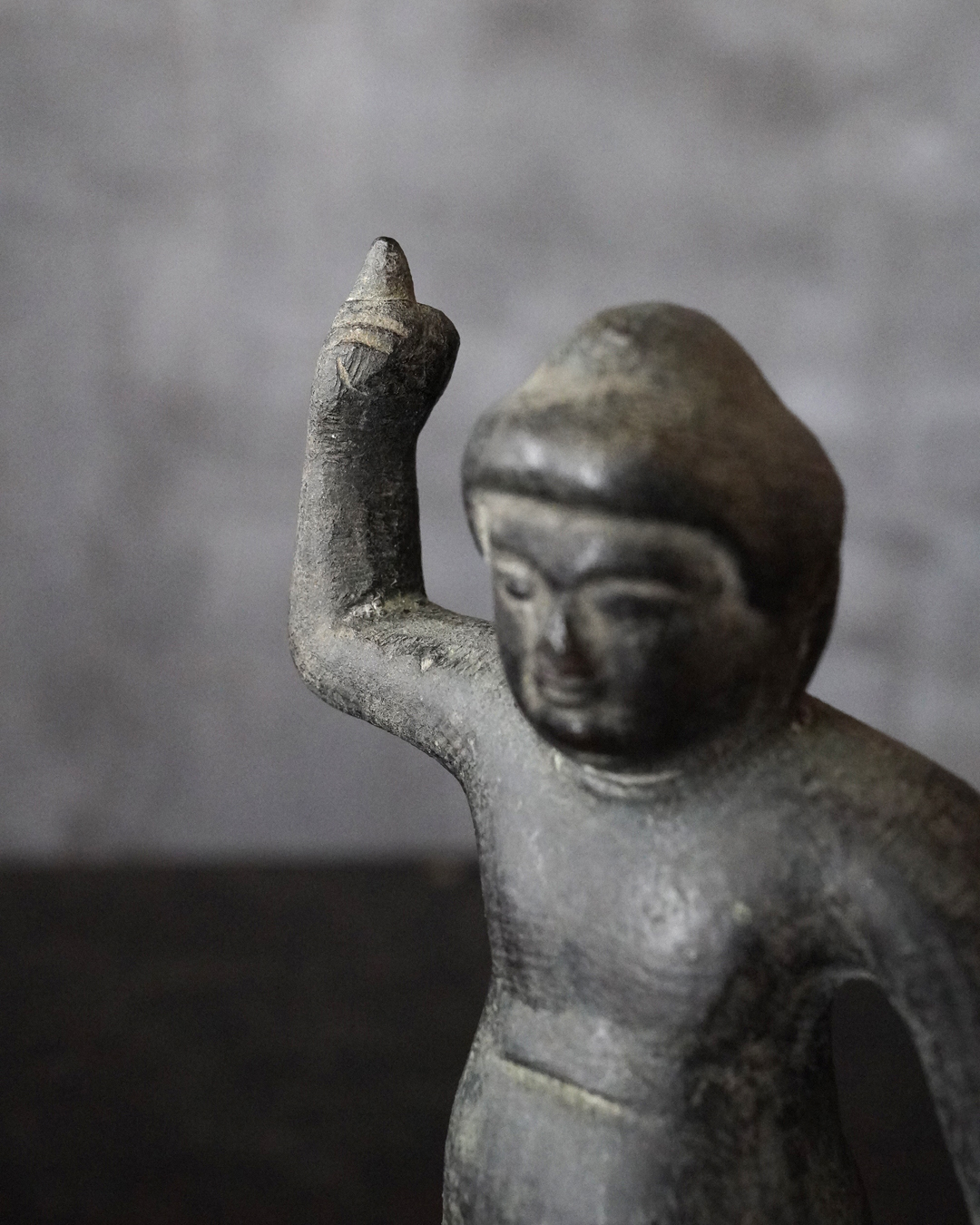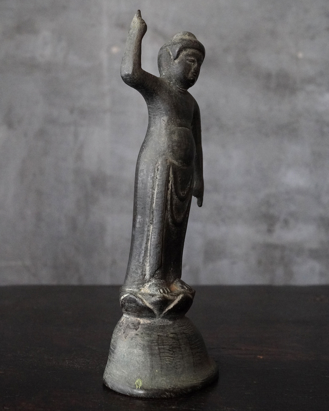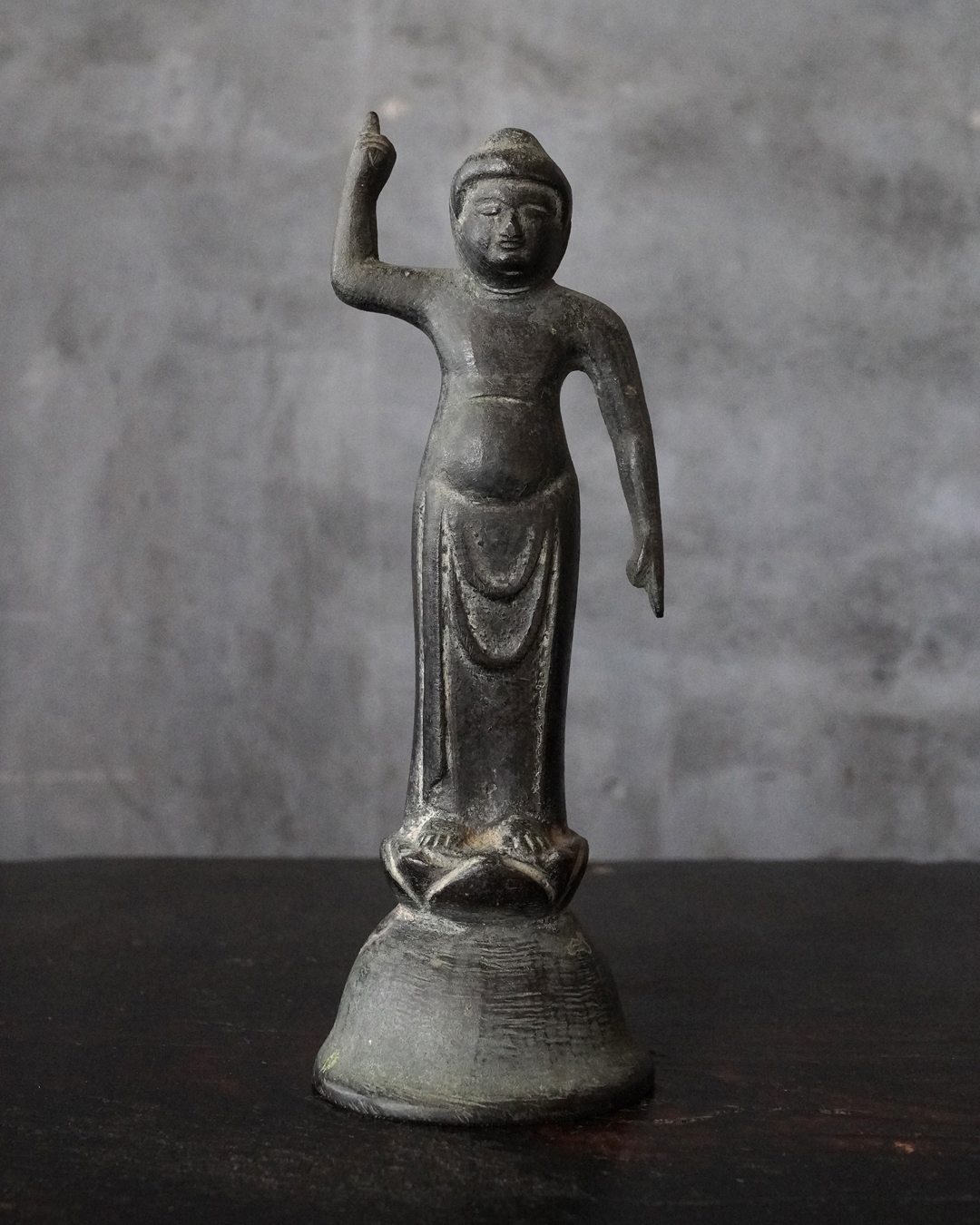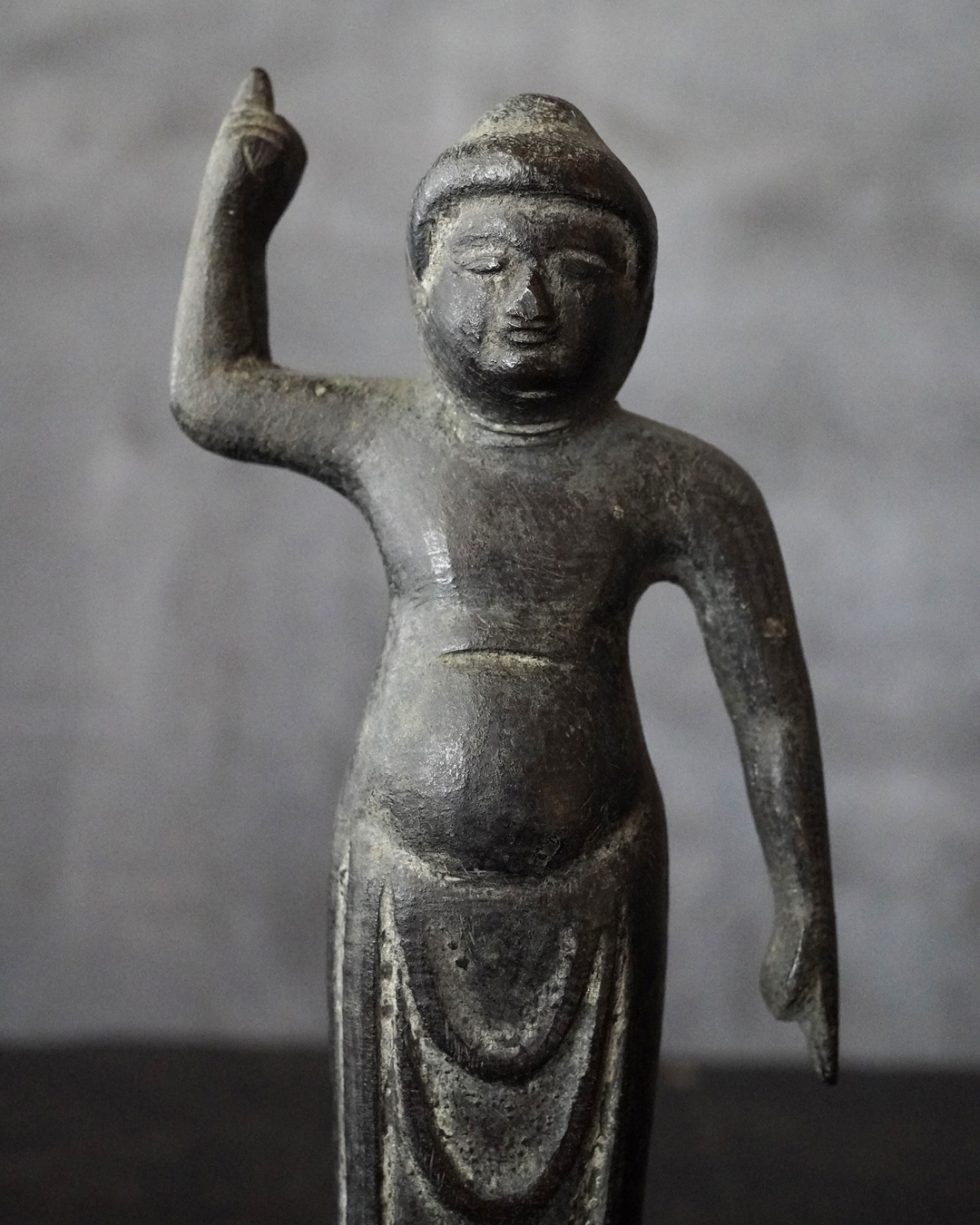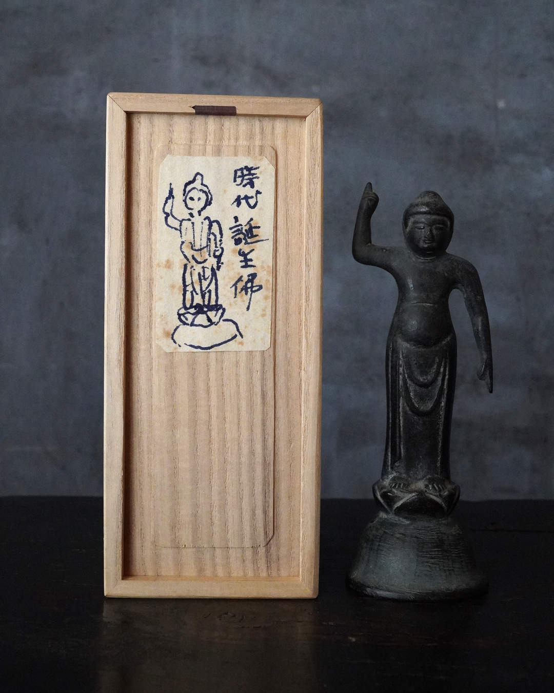 可愛らしい姿が魅力の誕生仏。お釈迦様の生まれた日とされる4月8日に行われる灌仏会の際に甘茶をかける法要でも知られている像。長年法要で使われていたものですので、時代相応の経年変化などはございますが、指の欠損もなく状態は良好。江戸時代と考えますが室町時代まで上がるかもしれません。養生箱。