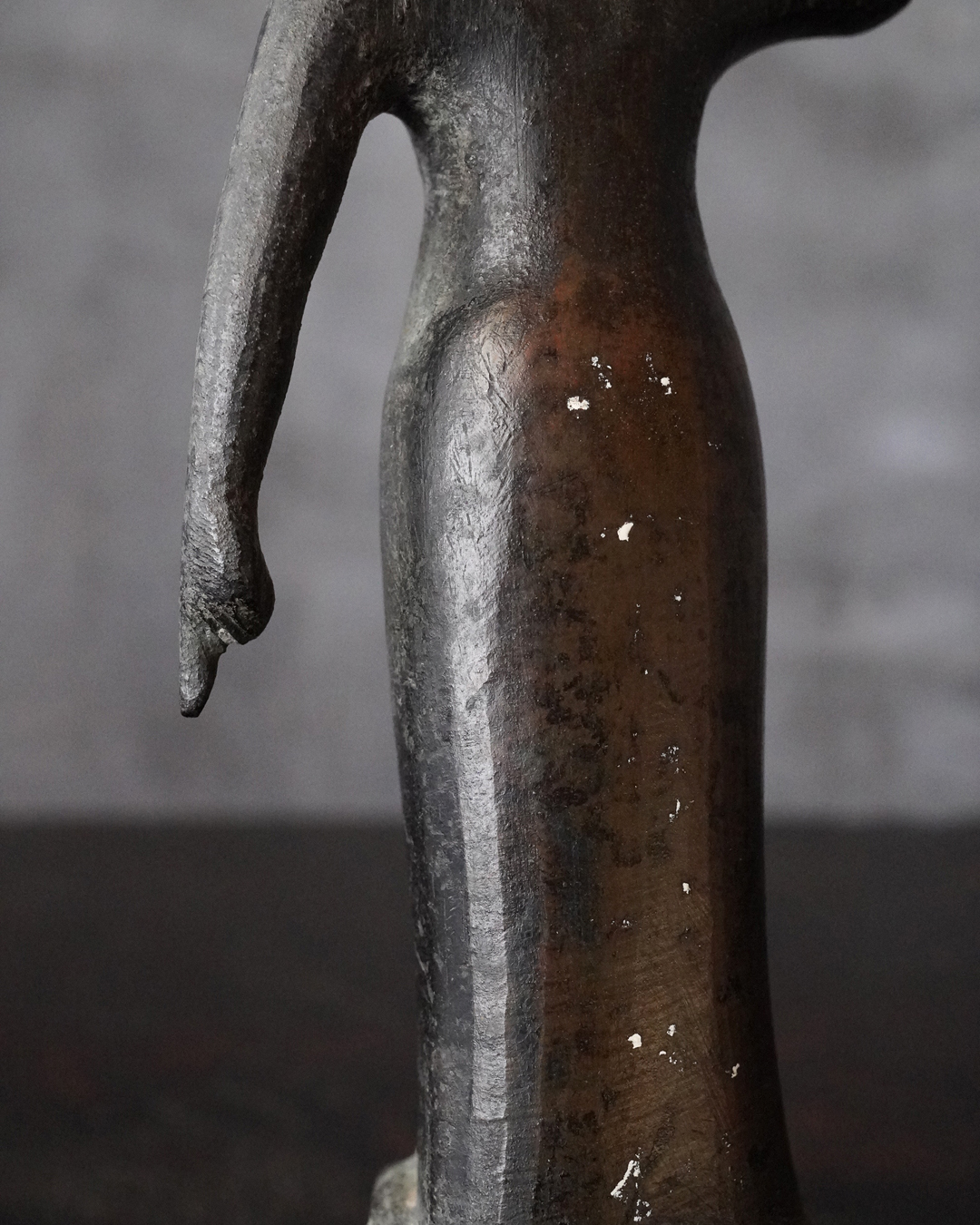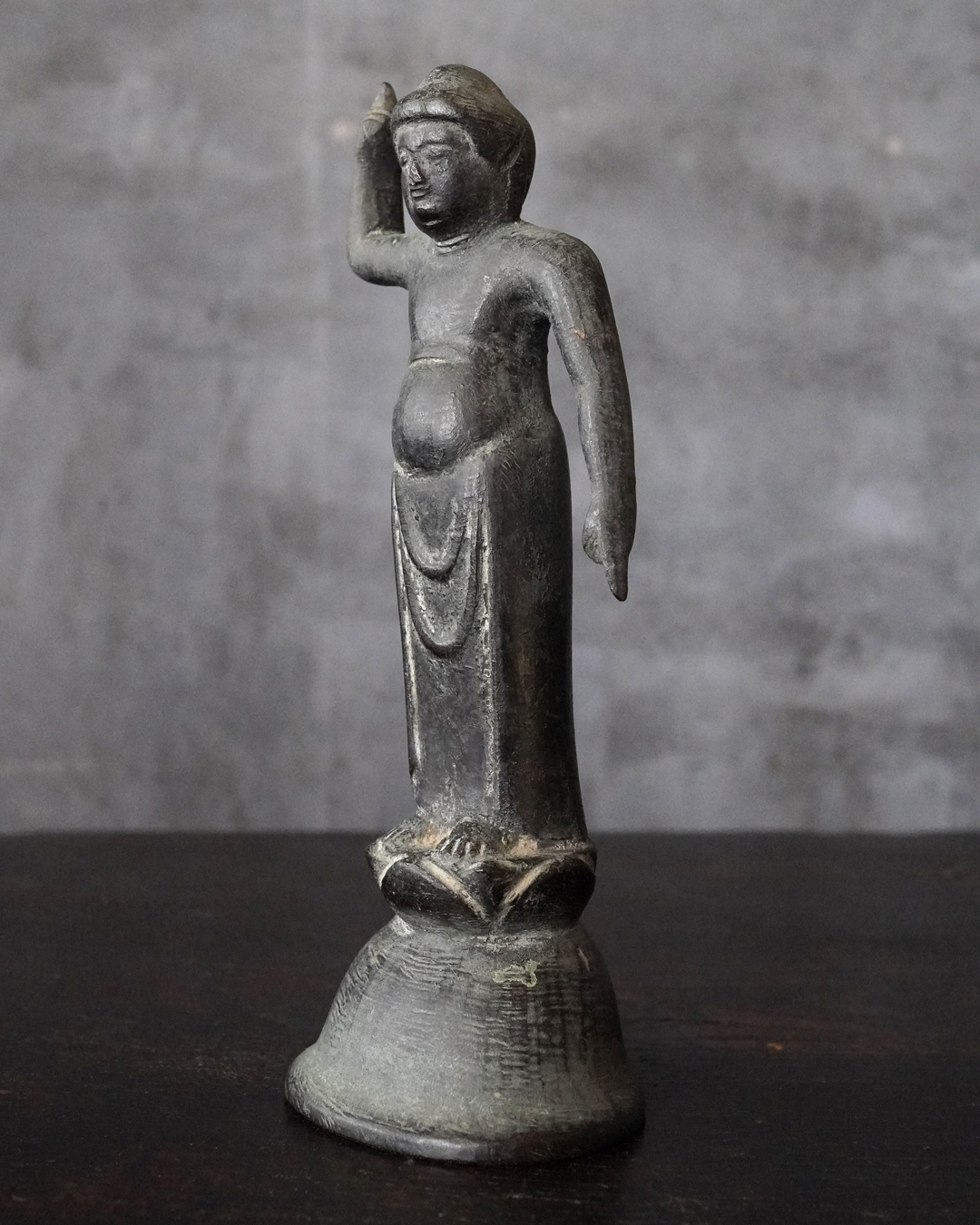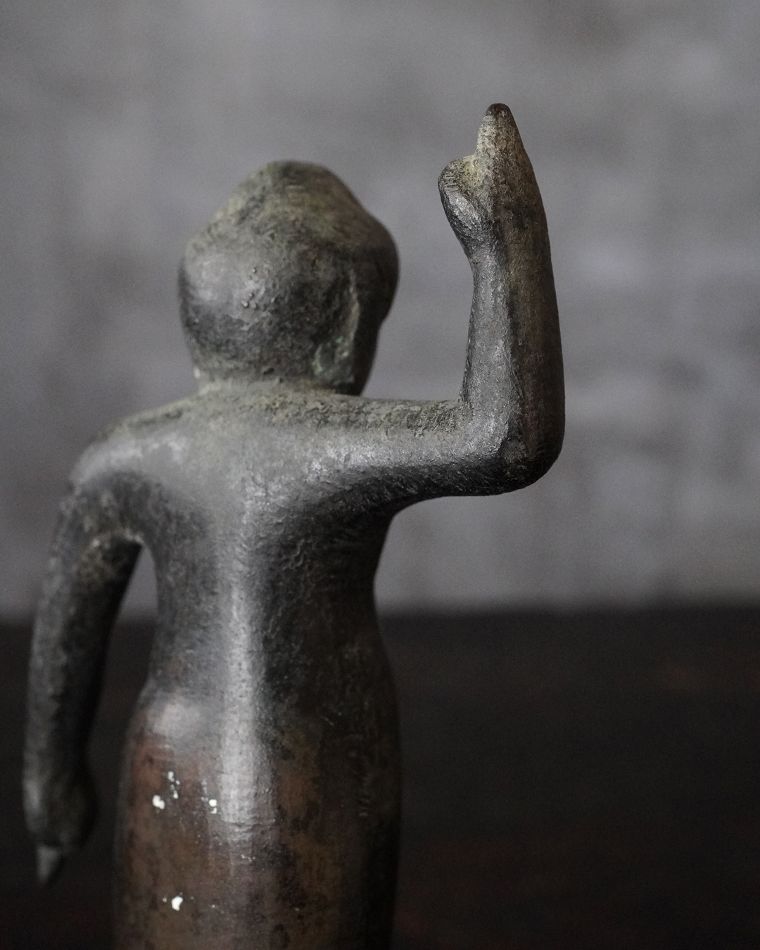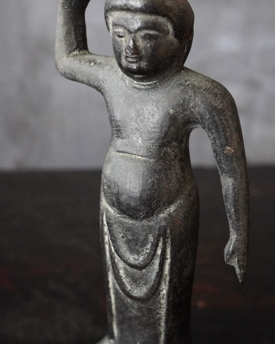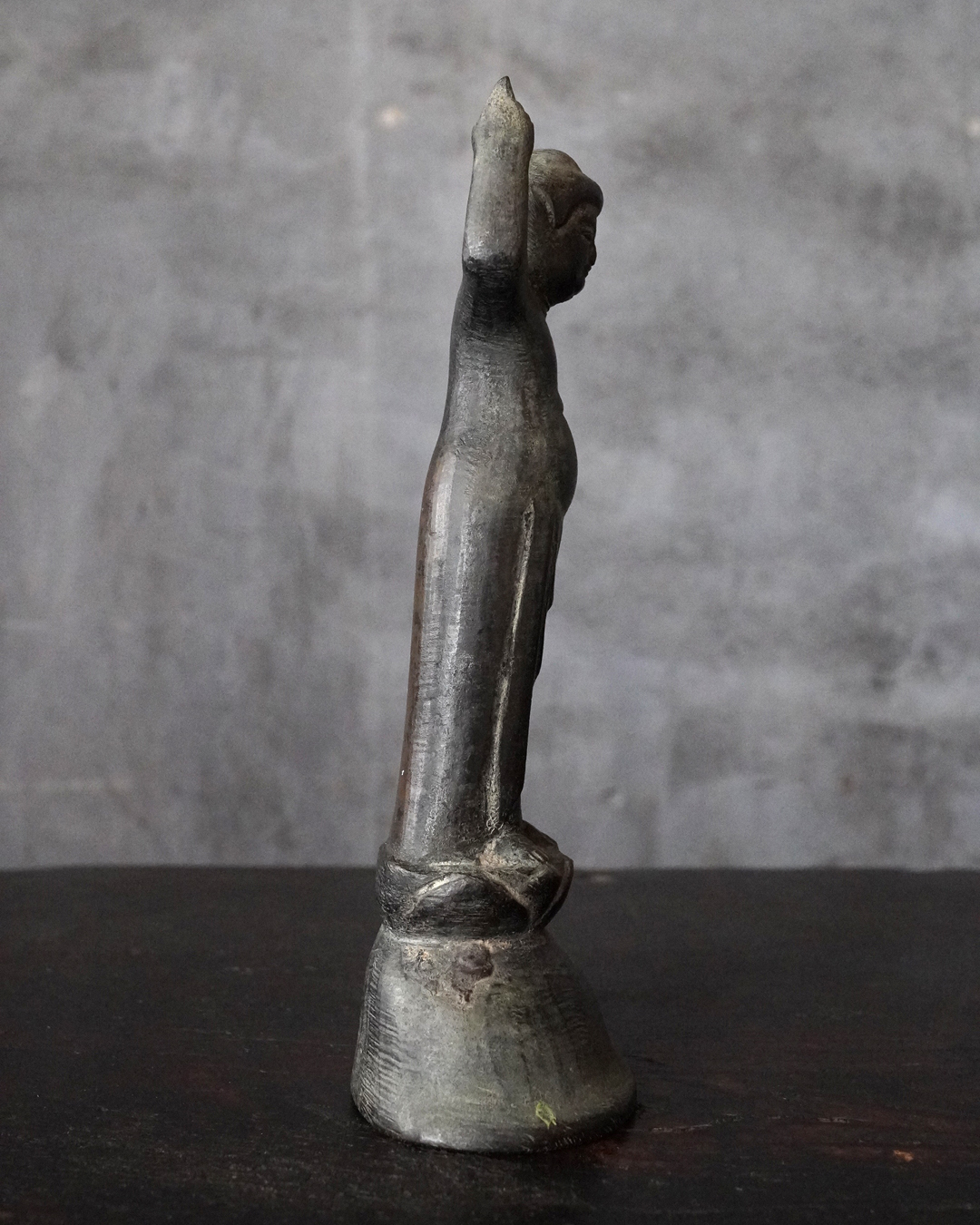 可愛らしい姿が魅力の誕生仏。お釈迦様の生まれた日とされる4月8日に行われる灌仏会の際に甘茶をかける法要でも知られている像。長年法要で使われていたものですので、時代相応の経年変化などはございますが、指の欠損もなく状態は良好。江戸時代と考えますが室町時代まで上がるかもしれません。養生箱。