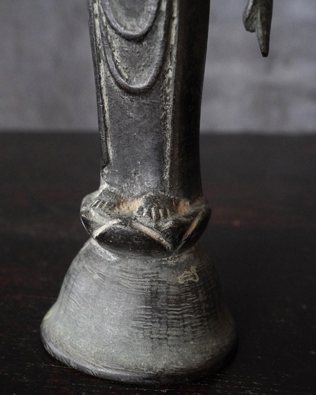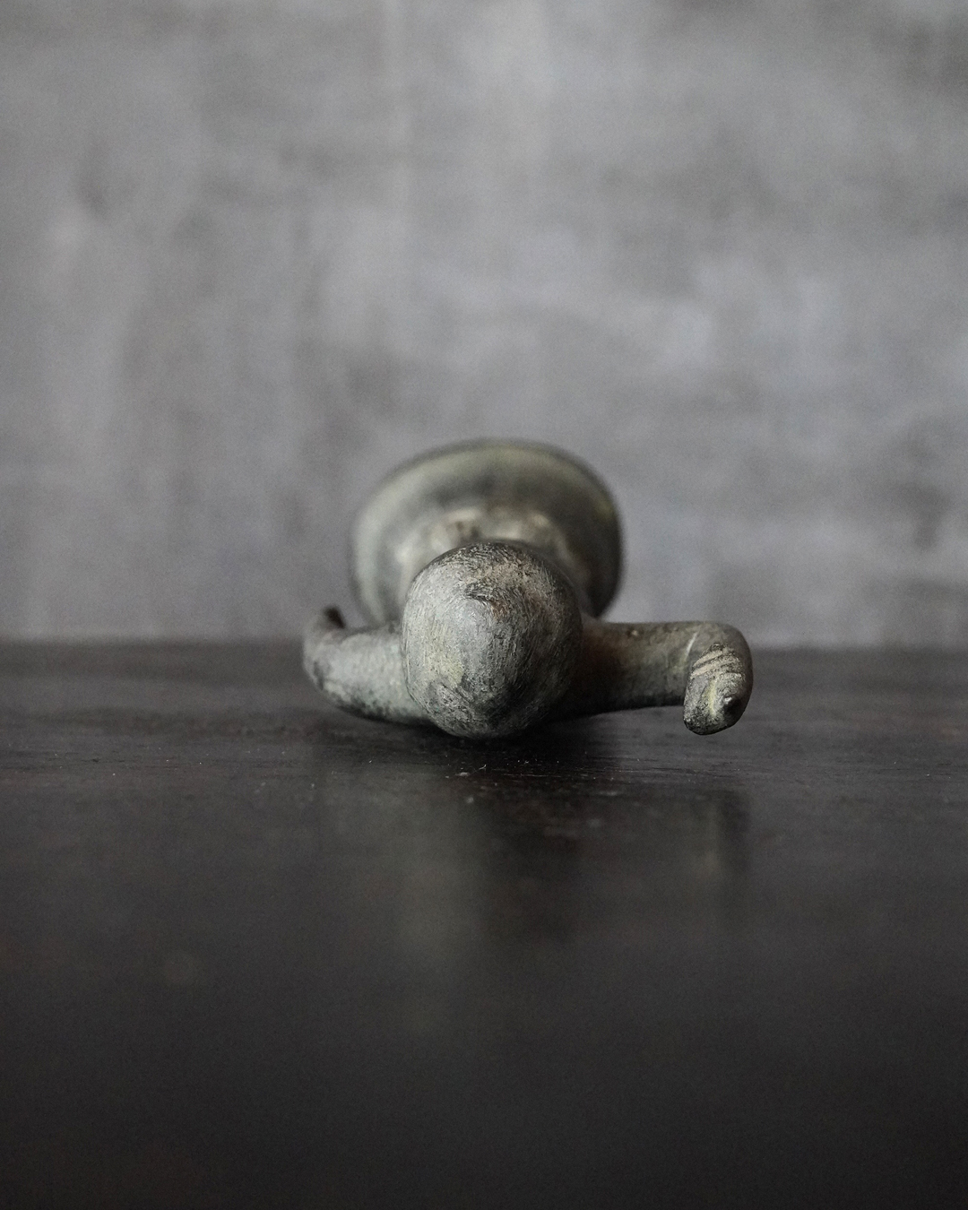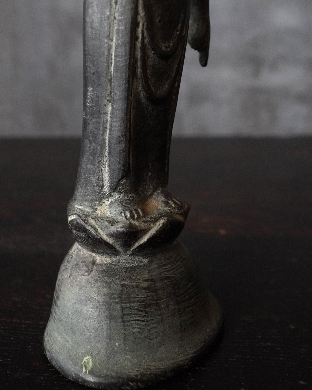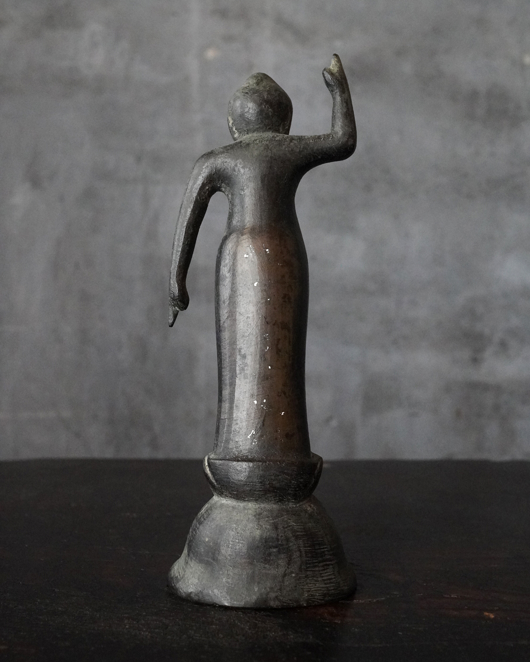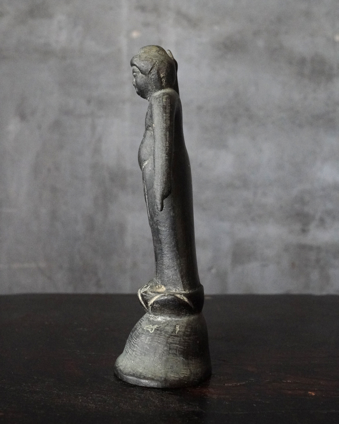 可愛らしい姿が魅力の誕生仏。お釈迦様の生まれた日とされる4月8日に行われる灌仏会の際に甘茶をかける法要でも知られている像。長年法要で使われていたものですので、時代相応の経年変化などはございますが、指の欠損もなく状態は良好。江戸時代と考えますが室町時代まで上がるかもしれません。養生箱。