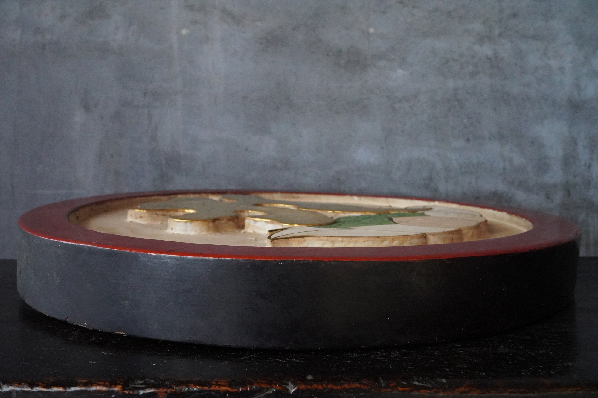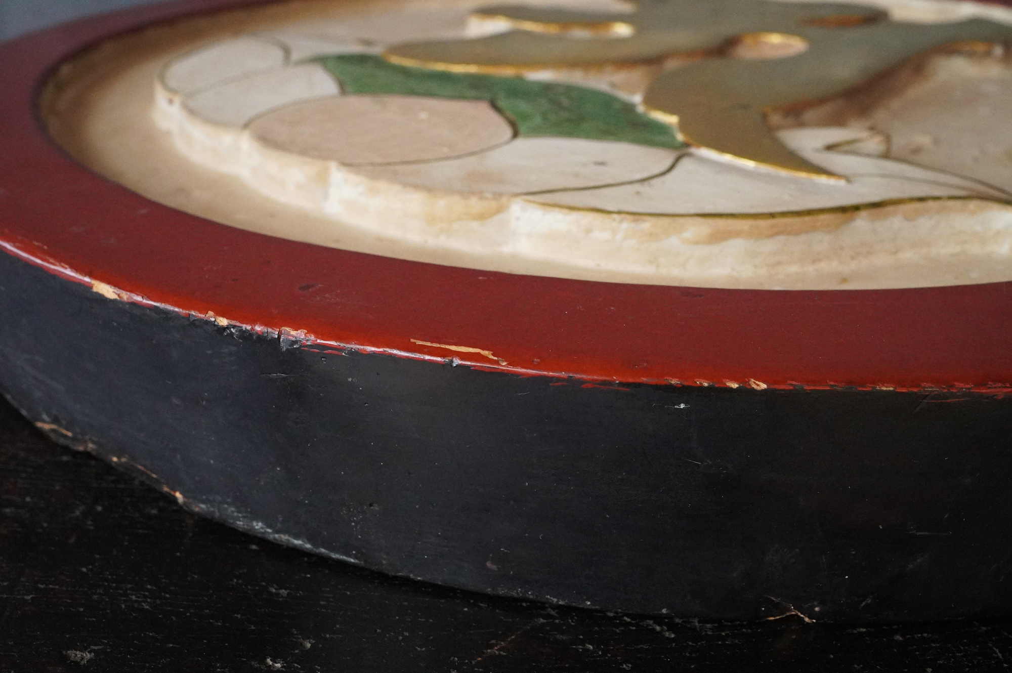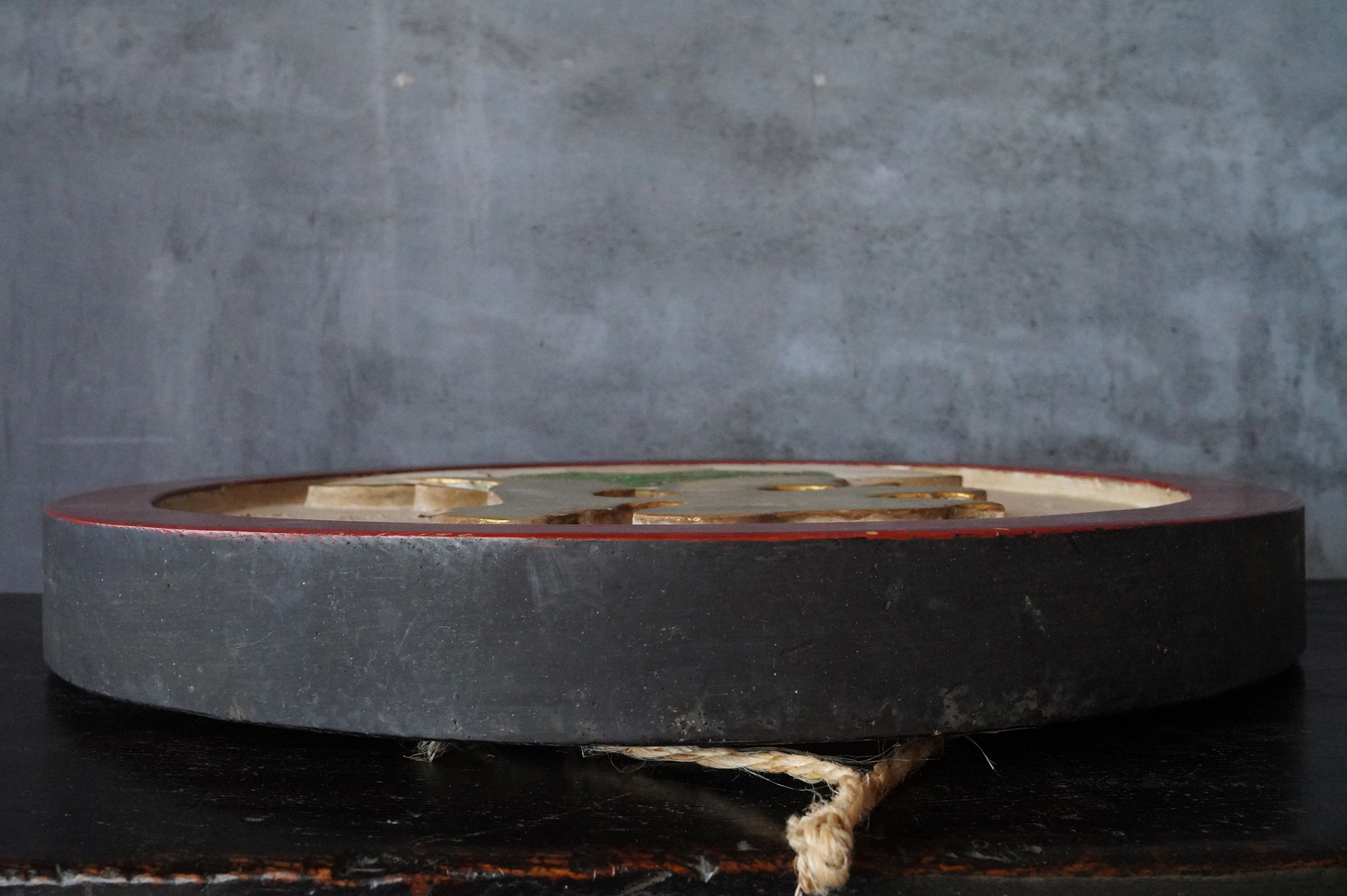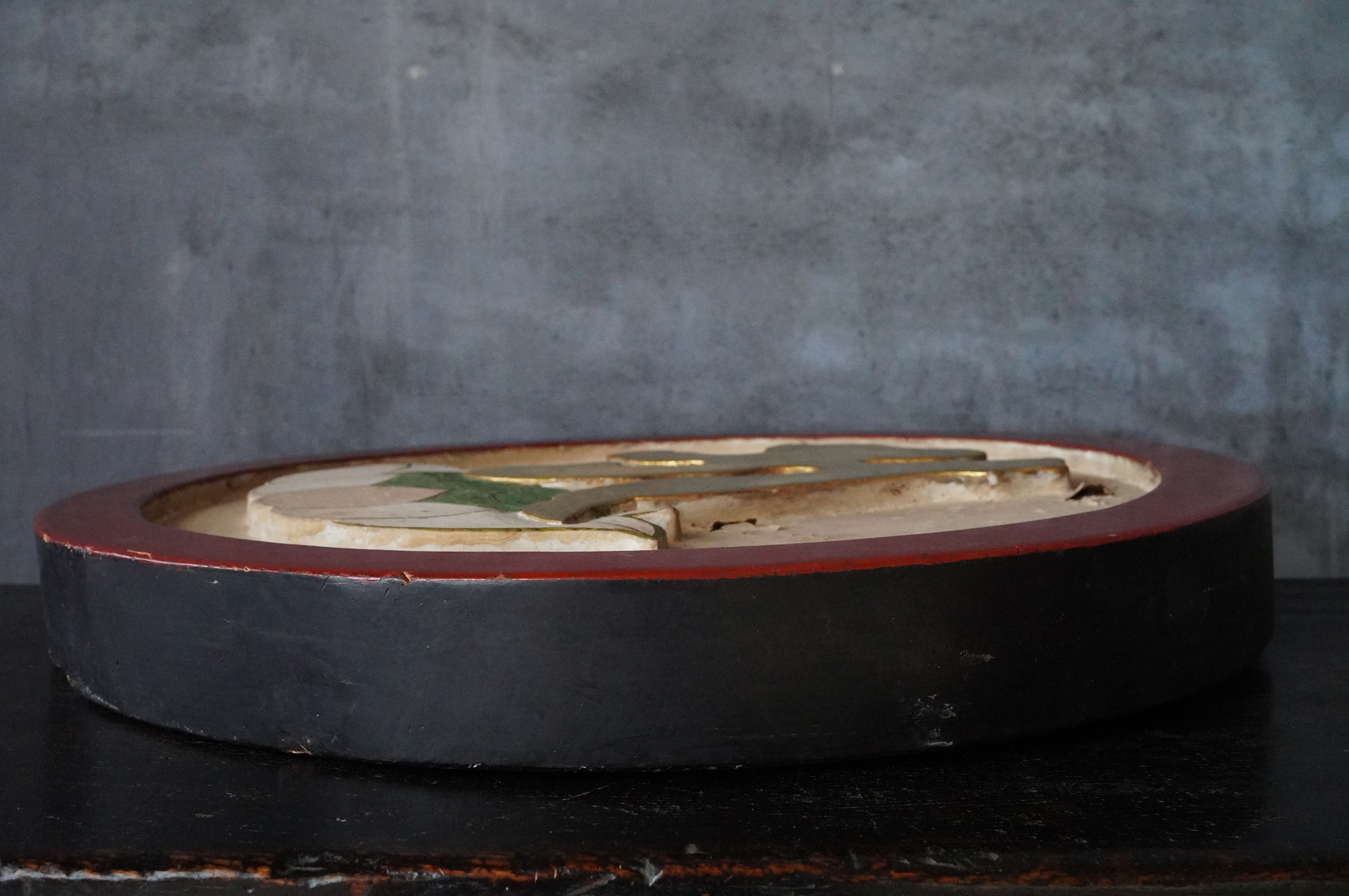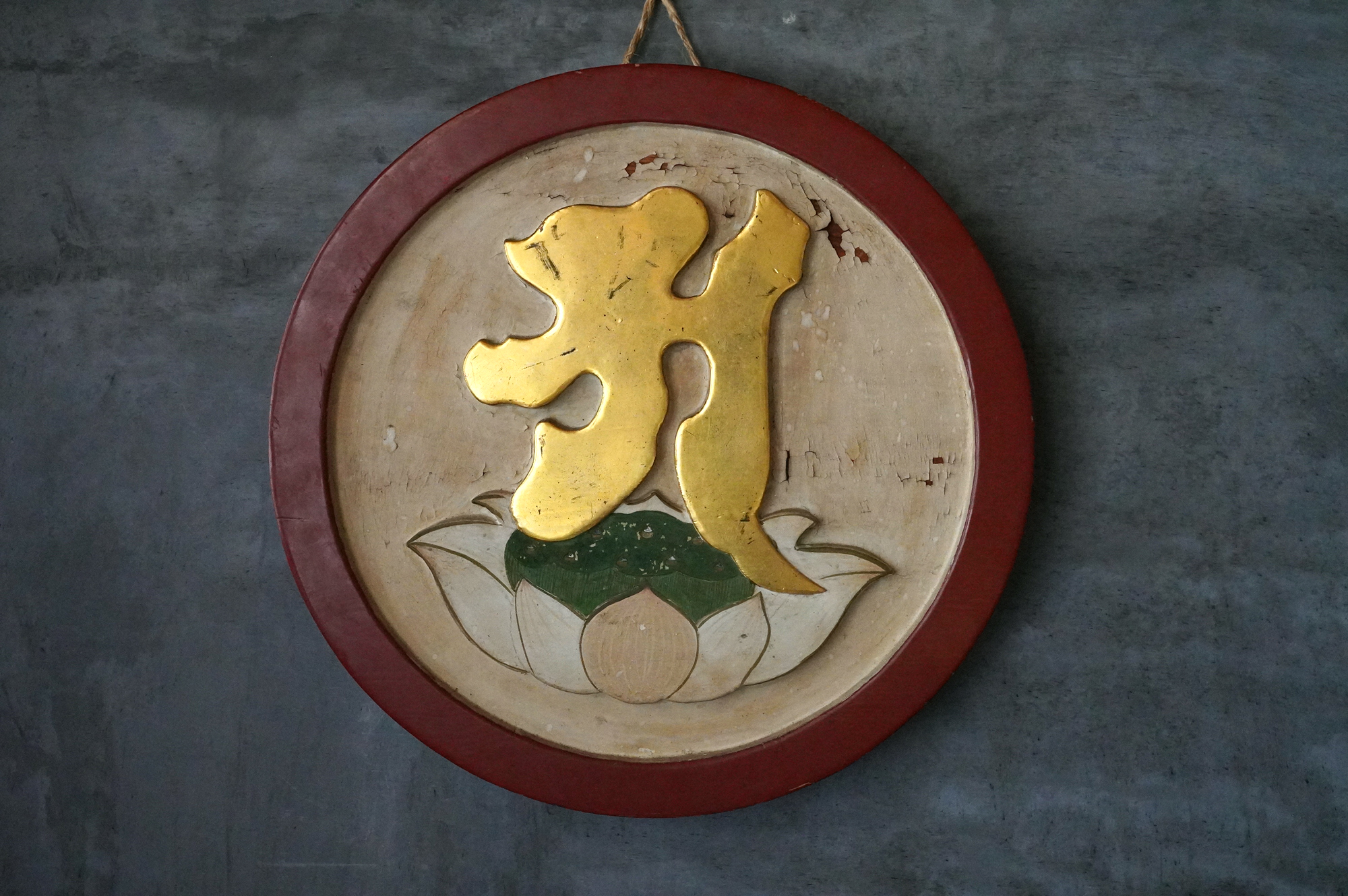 木彫で彩色された阿字観像。阿字観とは真言密教の経典「大日経」の瞑想法でその際に使用するもの。梵字は「阿」で大日如来で本品のように木彫で大型のものは初見です。裏に天保十三年・・・・と墨書あり。汚れ、胡粉の剥がれなどの時代相応の経年変化はございますが状態は時代を考慮しても概ね良好と考えます。金彩の部分が状態がよく光が当たると輝きます。壁に掛けるとインテリアとして素直にかっこいいですし、本来の目的の瞑想に使用しても良いでしょう。