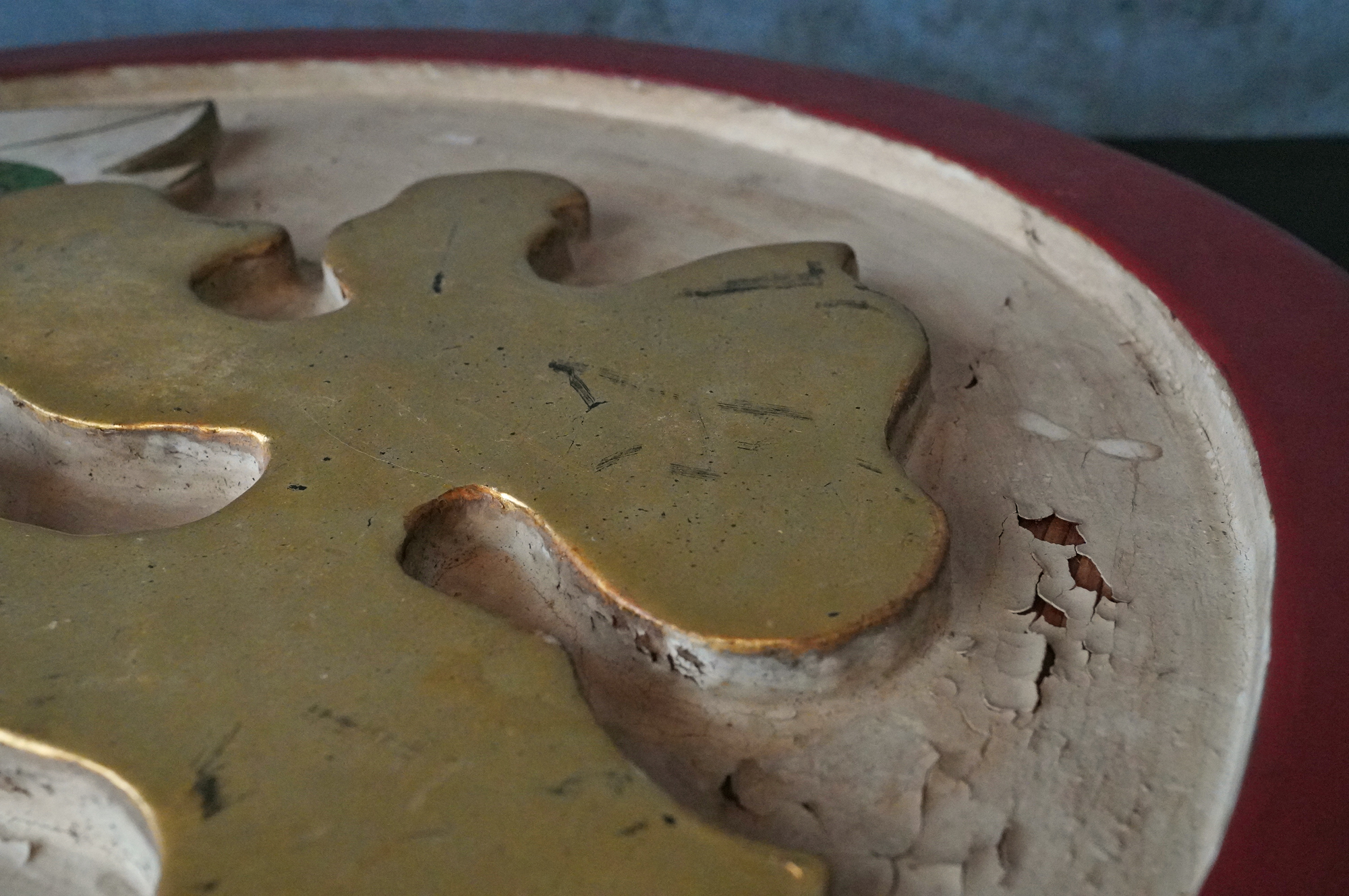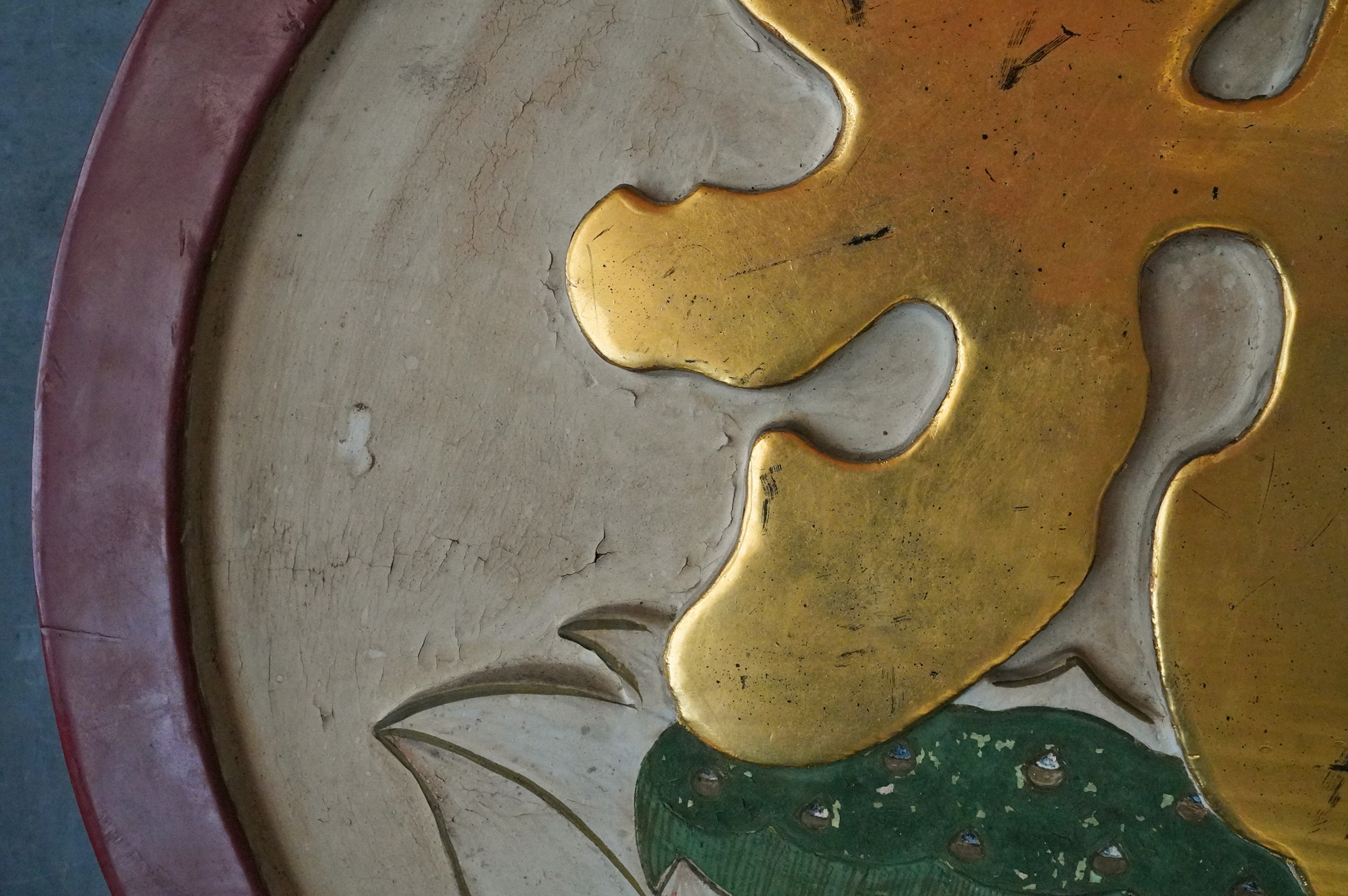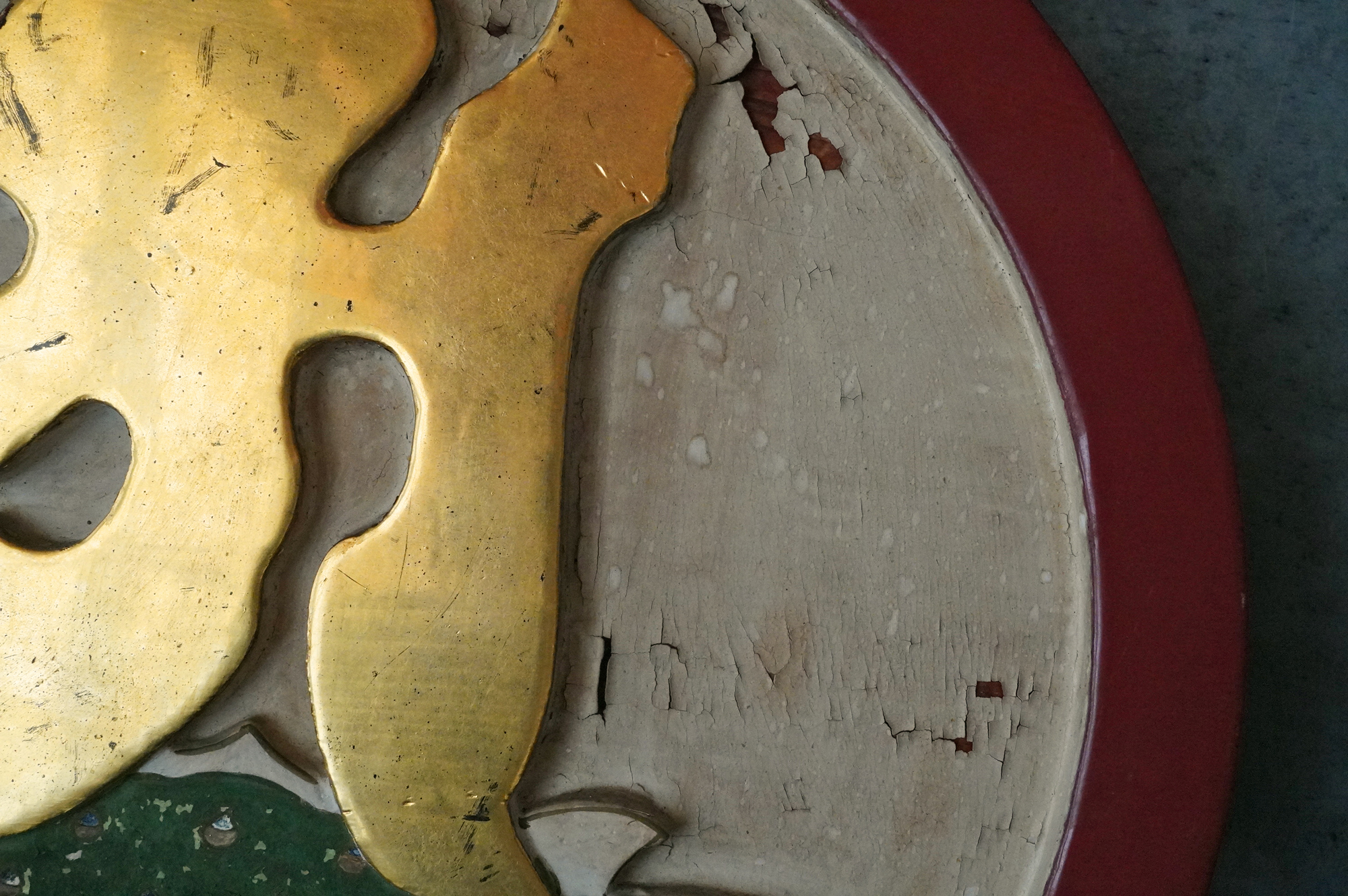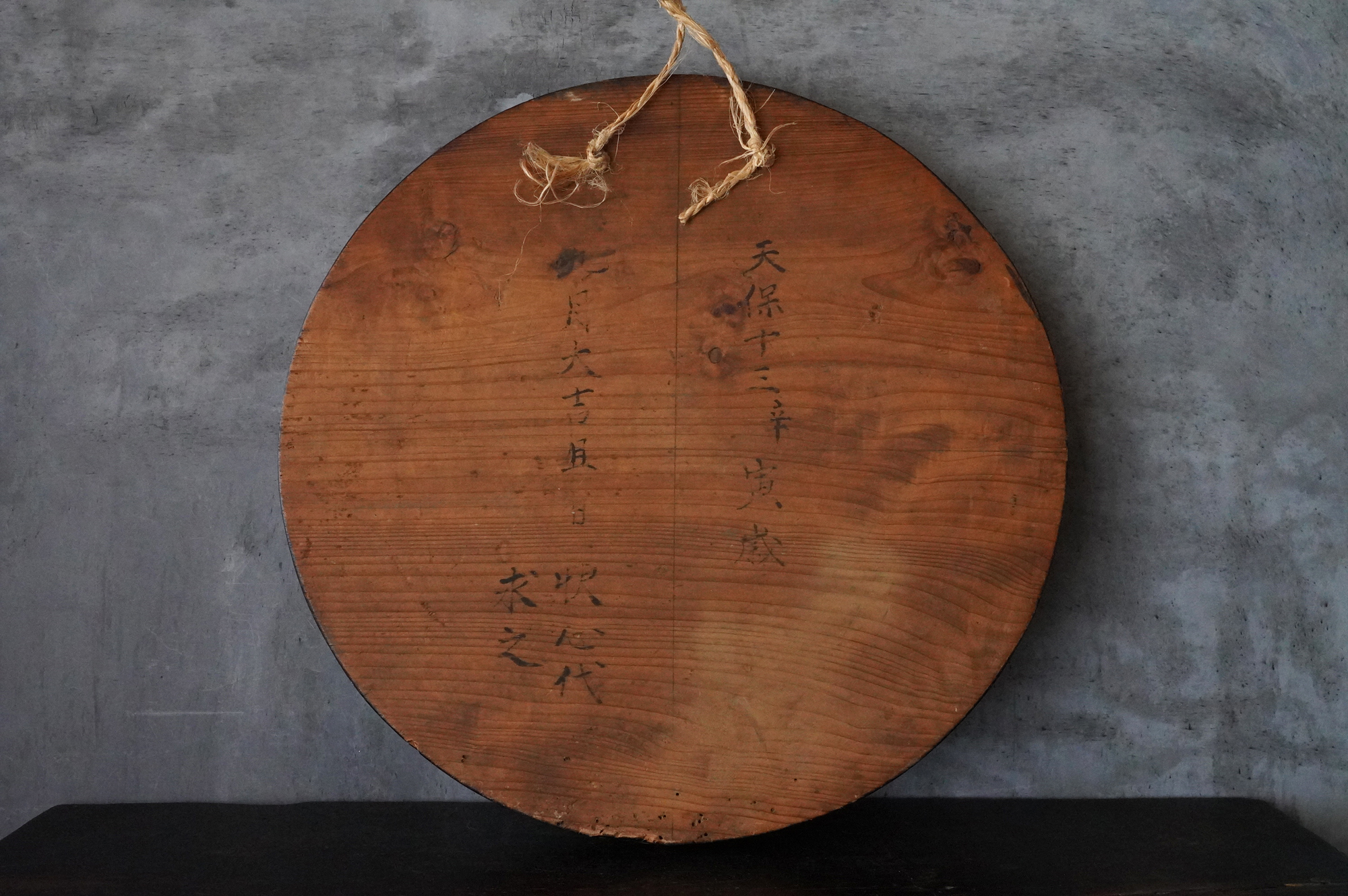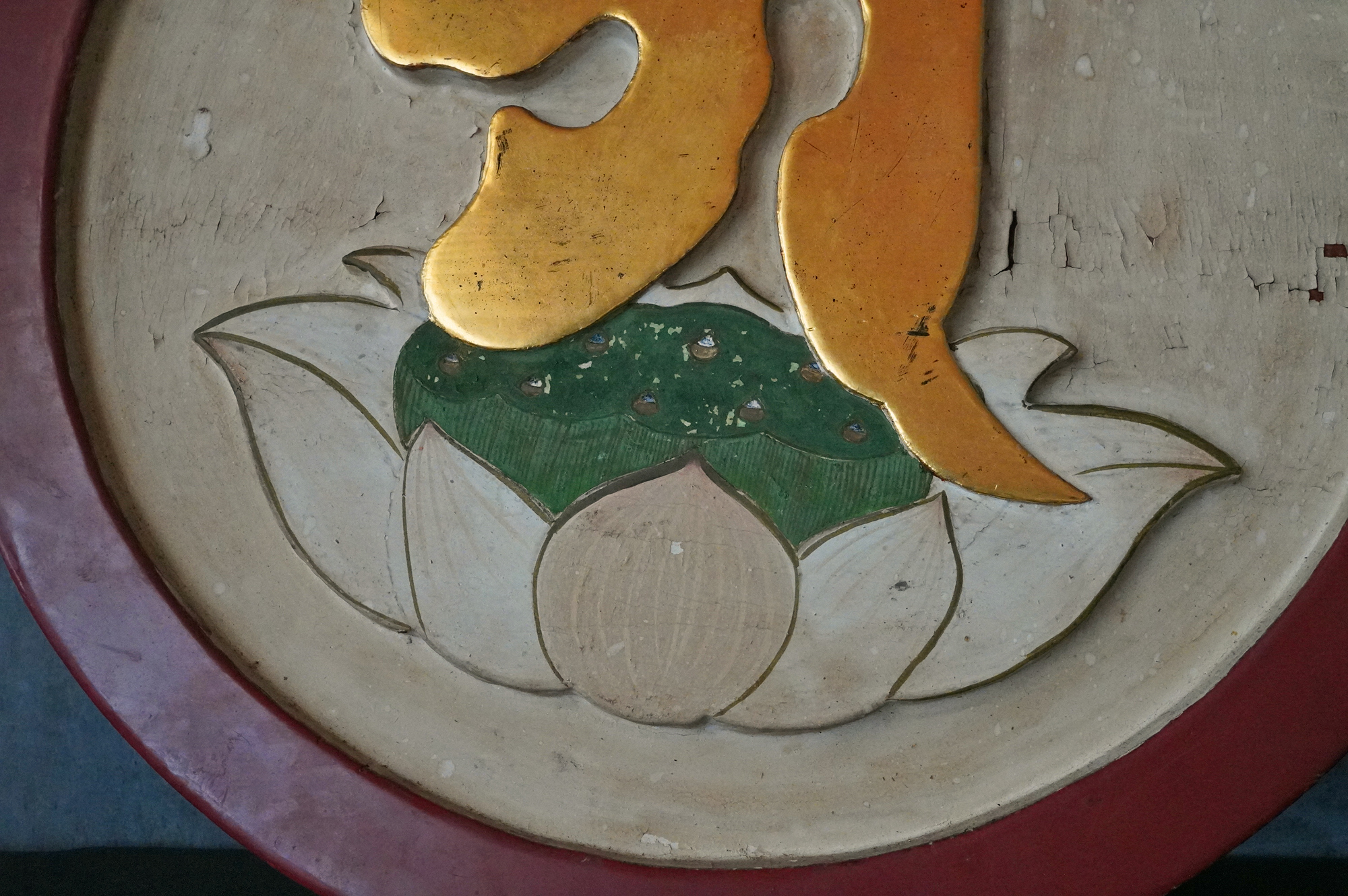 木彫で彩色された阿字観像。阿字観とは真言密教の経典「大日経」の瞑想法でその際に使用するもの。梵字は「阿」で大日如来で本品のように木彫で大型のものは初見です。裏に天保十三年・・・・と墨書あり。汚れ、胡粉の剥がれなどの時代相応の経年変化はございますが状態は時代を考慮しても概ね良好と考えます。金彩の部分が状態がよく光が当たると輝きます。壁に掛けるとインテリアとして素直にかっこいいですし、本来の目的の瞑想に使用しても良いでしょう。