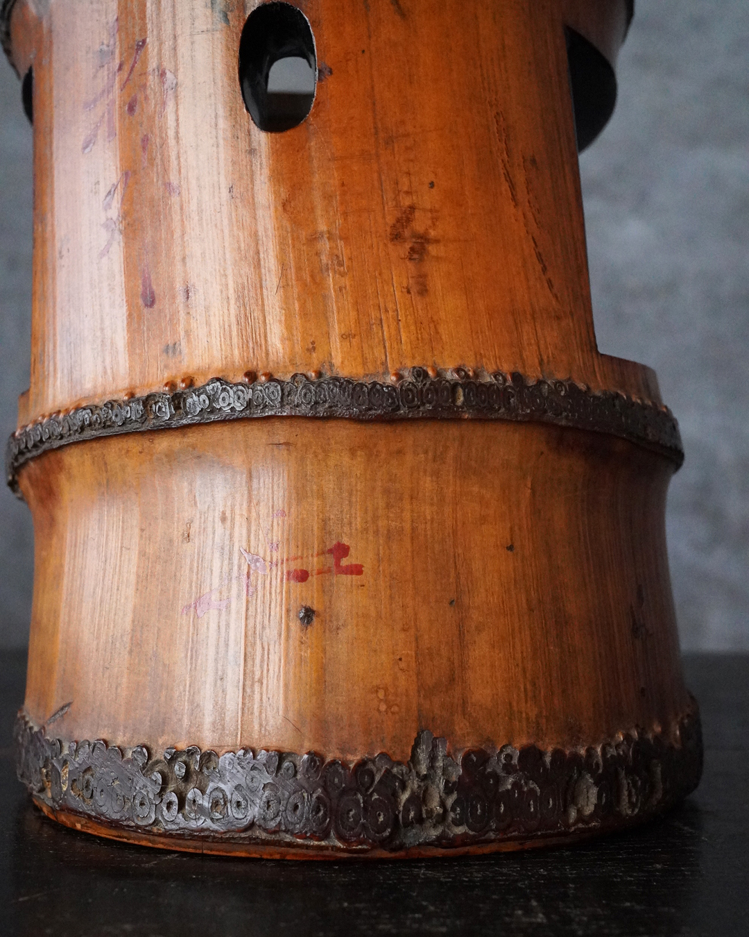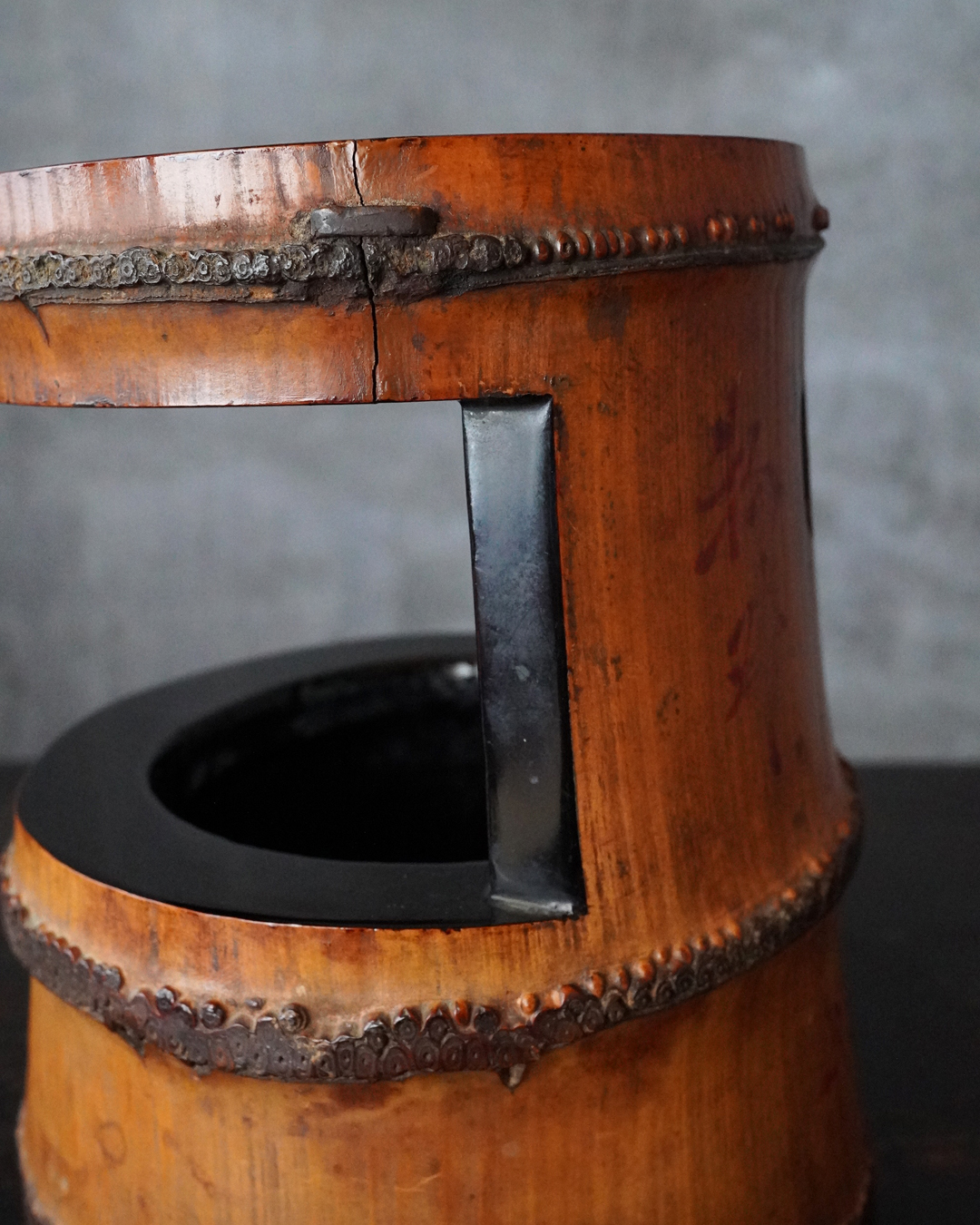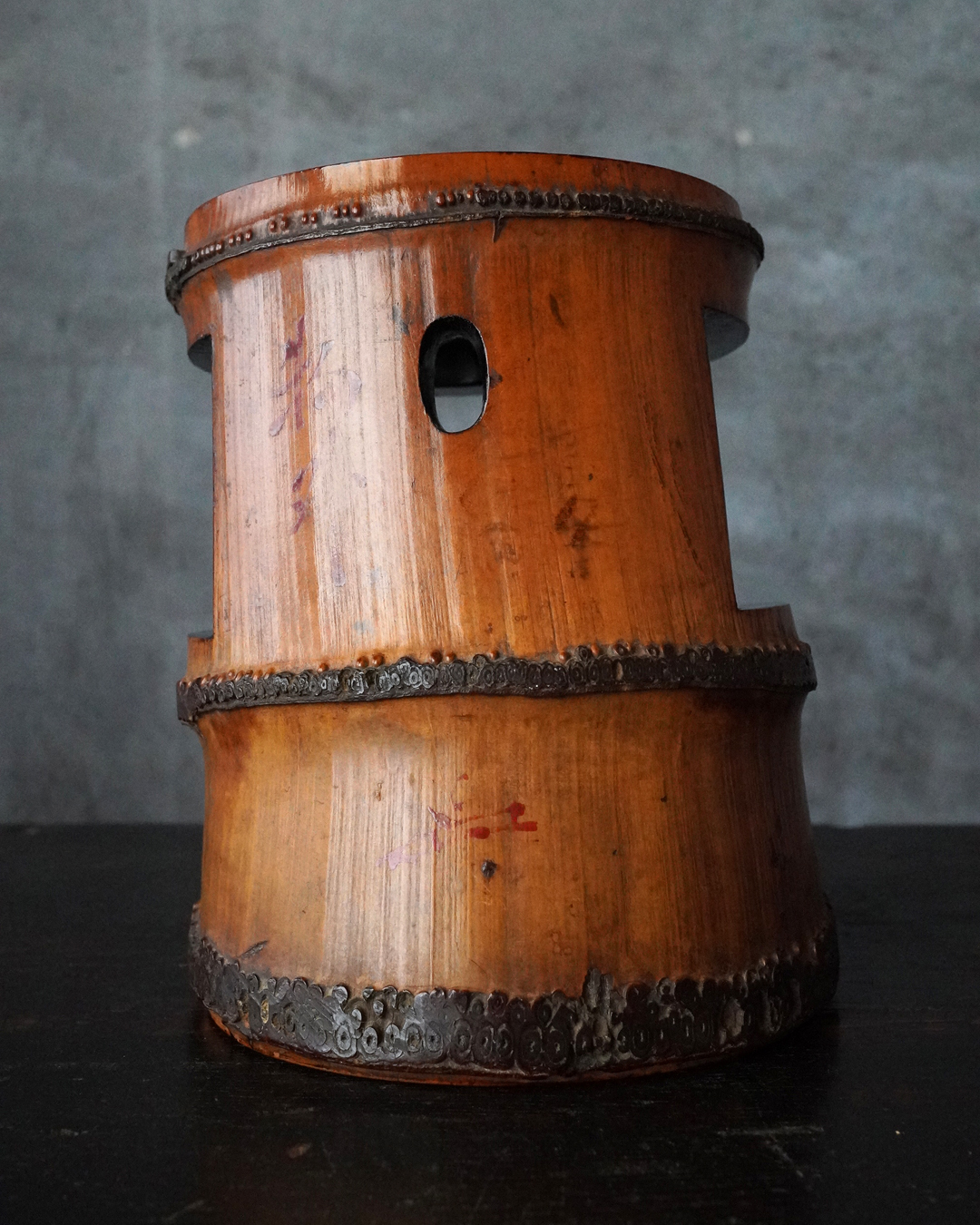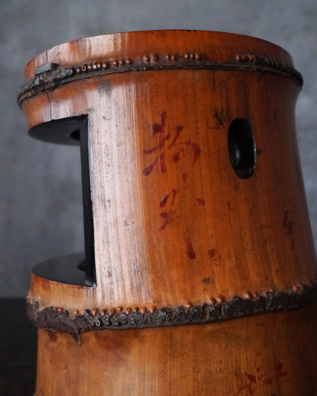 時代を経た味わいが良い竹の掛け花入。亀裂などはなく内部にもしっかりと漆が施されておりオトシ無しで生けられます。背の部分には銘「物外』、如心斎(1705〜1751)表千家七代目の花押が朱漆で記されています。箱は養生箱。浅学の為、如心斎の花押なのかは当方では断定できません。当方、銘などは気にせず、味のある姿に気に入って仕入れたましたのでご理解いただければと思います。ここまでの味の良いものはなかなかないと思いますので、お茶の心得がなくても、表千家ではなくとも、魅力あるものです。江戸時代。