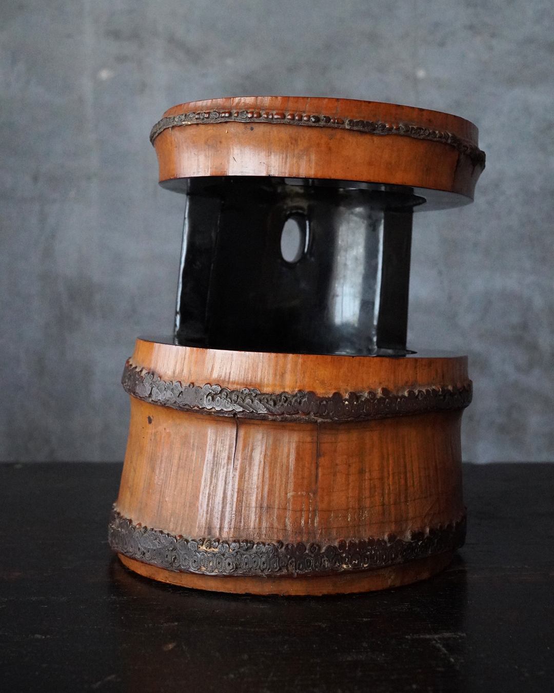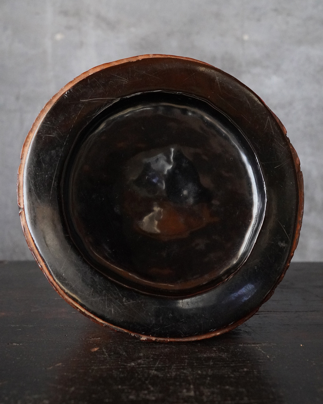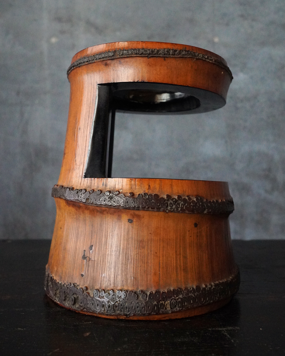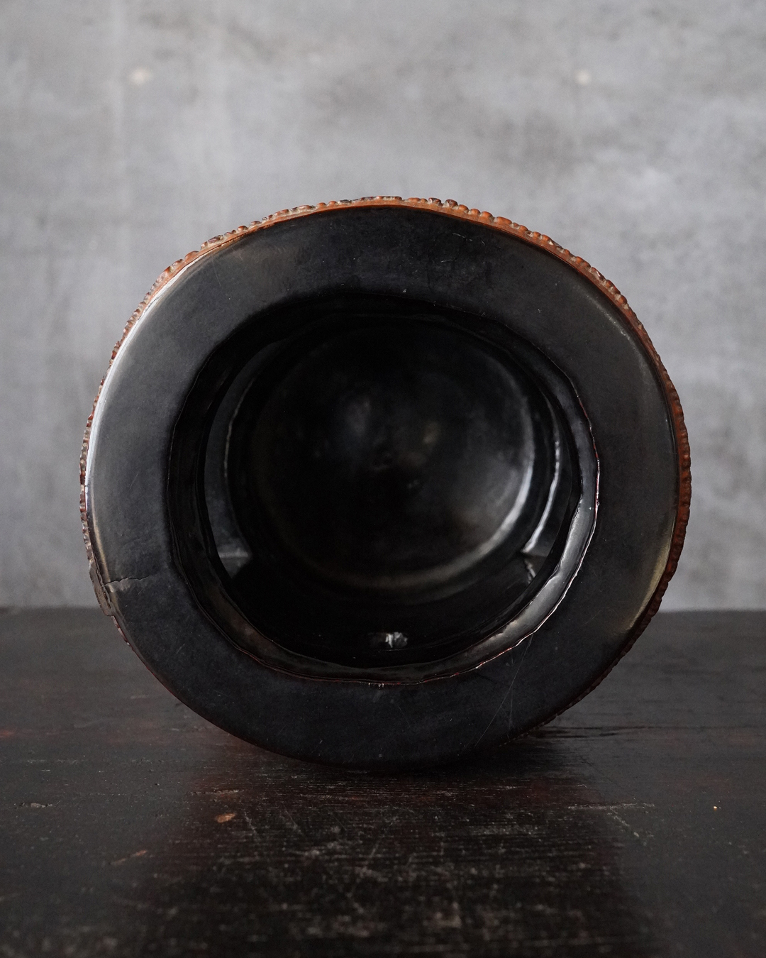 時代を経た味わいが良い竹の掛け花入。亀裂などはなく内部にもしっかりと漆が施されておりオトシ無しで生けられます。背の部分には銘「物外』、如心斎(1705〜1751)表千家七代目の花押が朱漆で記されています。箱は養生箱。浅学の為、如心斎の花押なのかは当方では断定できません。当方、銘などは気にせず、味のある姿に気に入って仕入れたましたのでご理解いただければと思います。ここまでの味の良いものはなかなかないと思いますので、お茶の心得がなくても、表千家ではなくとも、魅力あるものです。江戸時代。