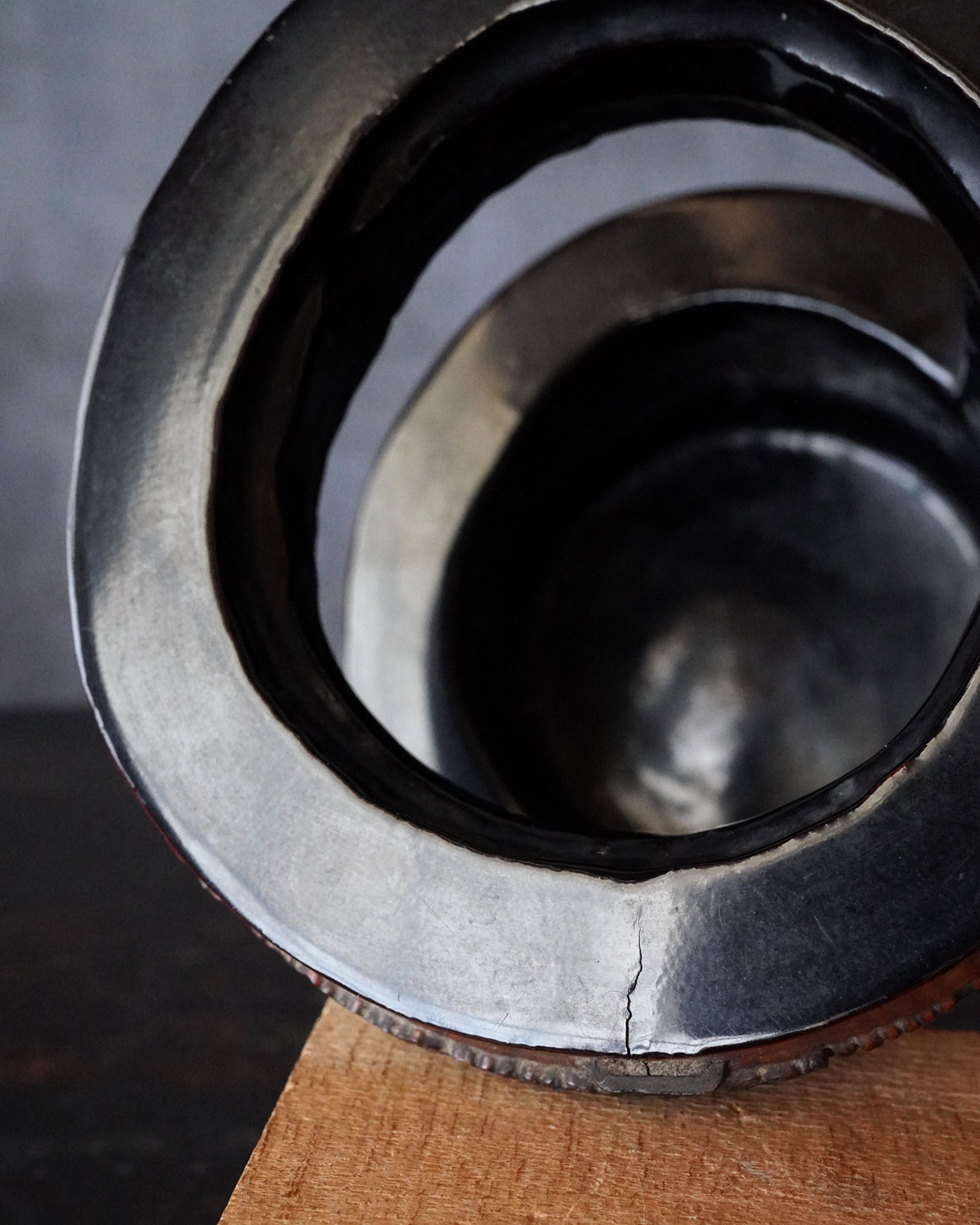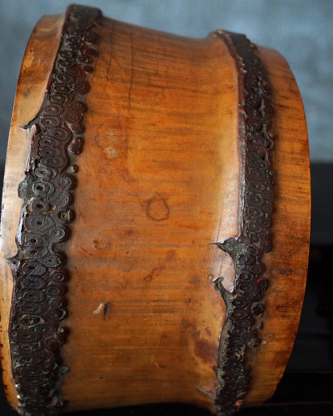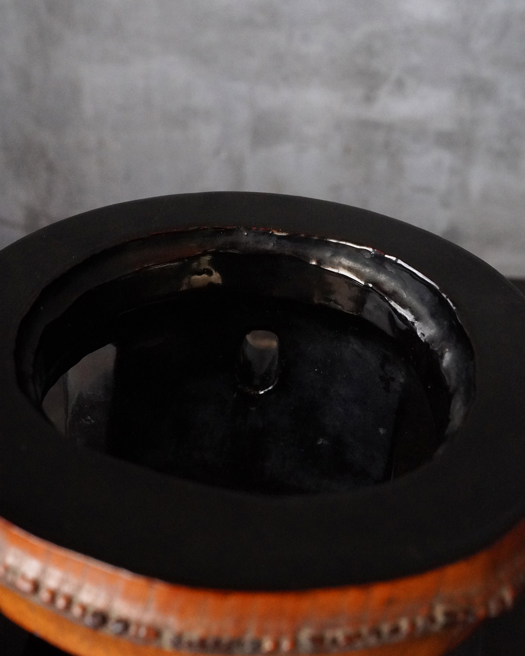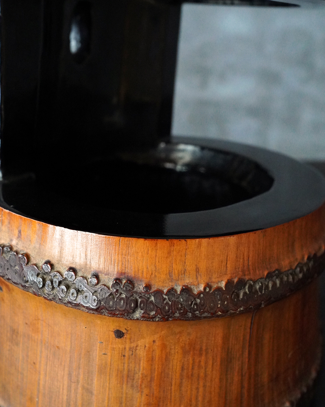 時代を経た味わいが良い竹の掛け花入。亀裂などはなく内部にもしっかりと漆が施されておりオトシ無しで生けられます。背の部分には銘「物外』、如心斎(1705〜1751)表千家七代目の花押が朱漆で記されています。箱は養生箱。浅学の為、如心斎の花押なのかは当方では断定できません。当方、銘などは気にせず、味のある姿に気に入って仕入れたましたのでご理解いただければと思います。ここまでの味の良いものはなかなかないと思いますので、お茶の心得がなくても、表千家ではなくとも、魅力あるものです。江戸時代。