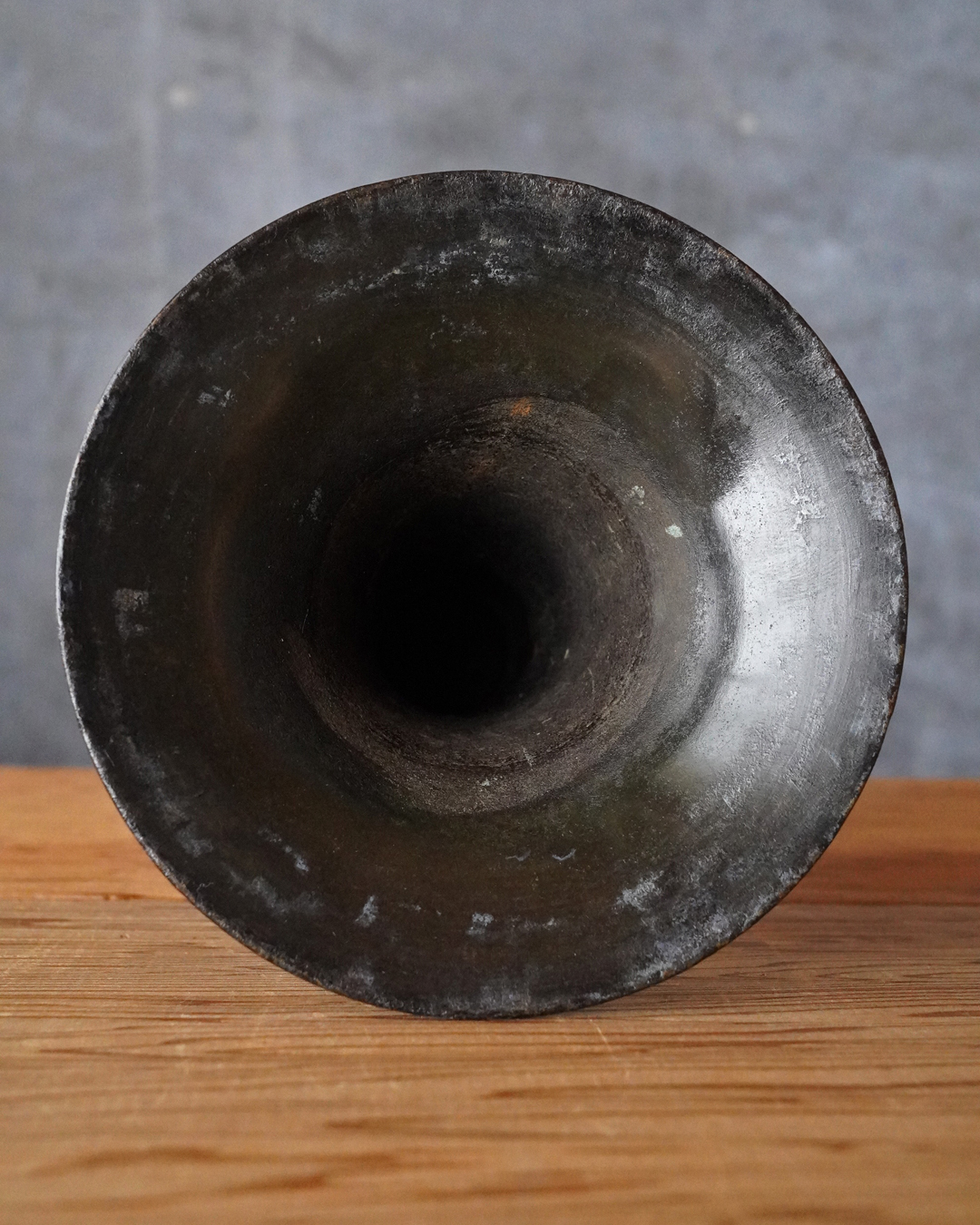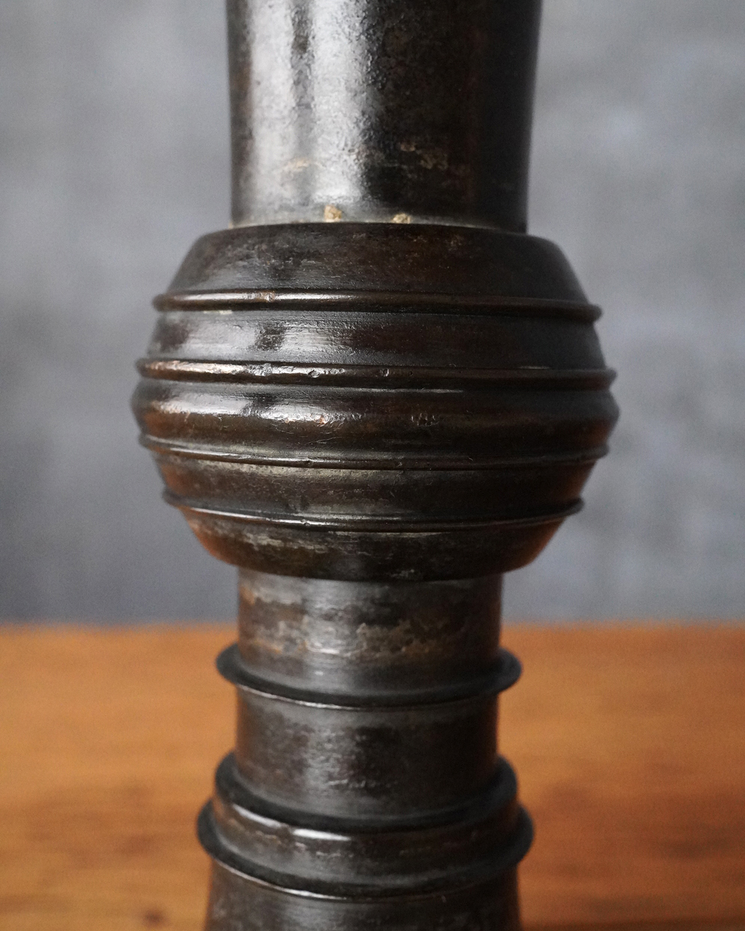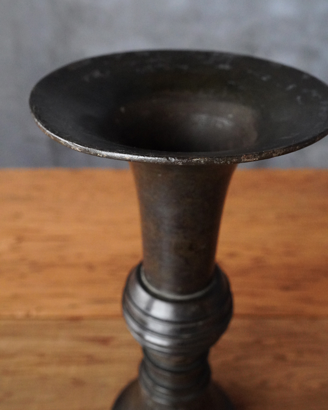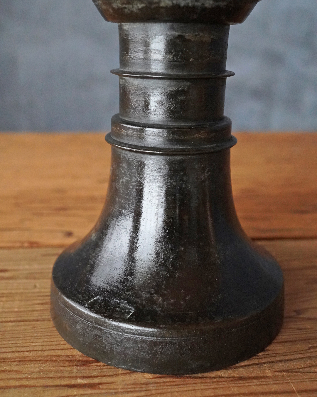 時代を経た艶やかな肌合いが良い尊式瓶。元々の形状は大陸からのものですが、文様が無くなり、よりシンプルに和洋化したものです。仏花器として使われていたものでしょう。時代相応の経年変化はございますが現状水漏れはありません。概ね状態は良好。たてはなに最適。室町時代まで上がるでしょう。