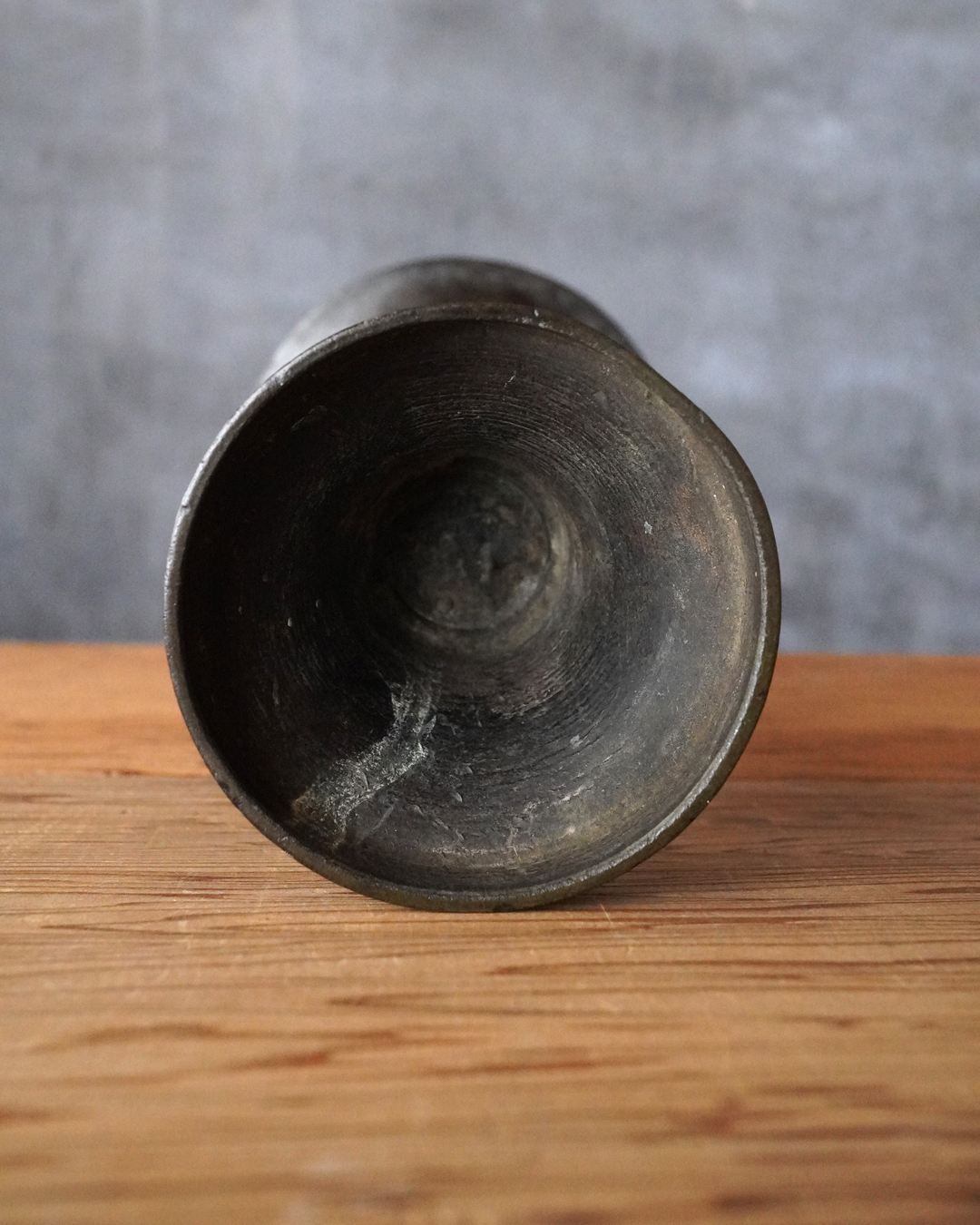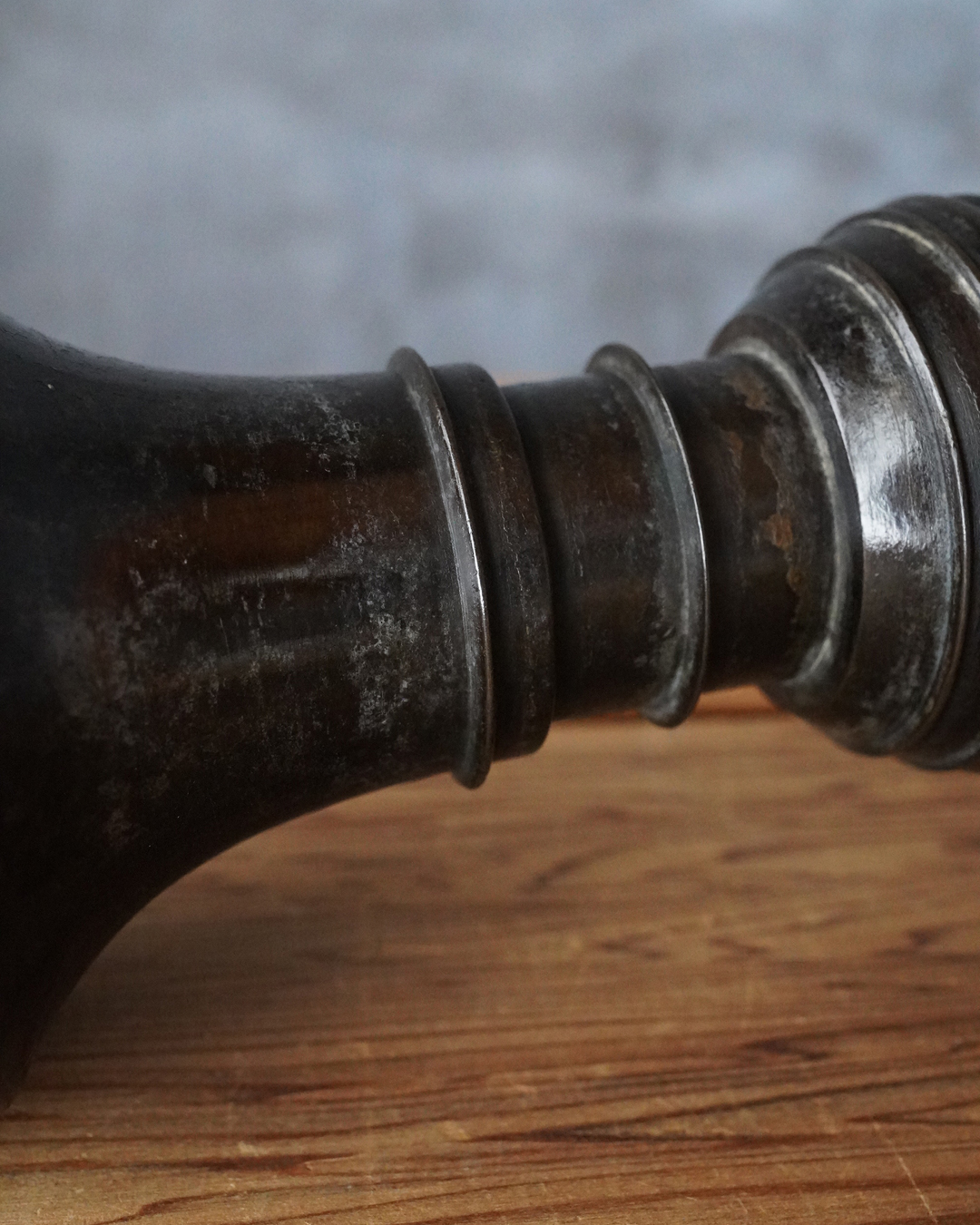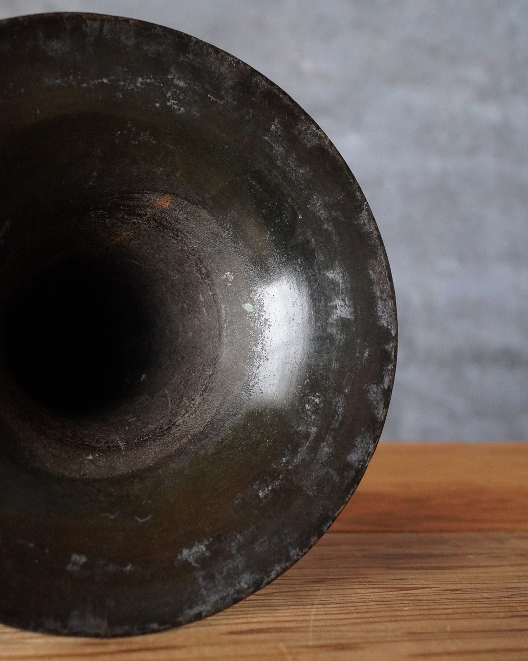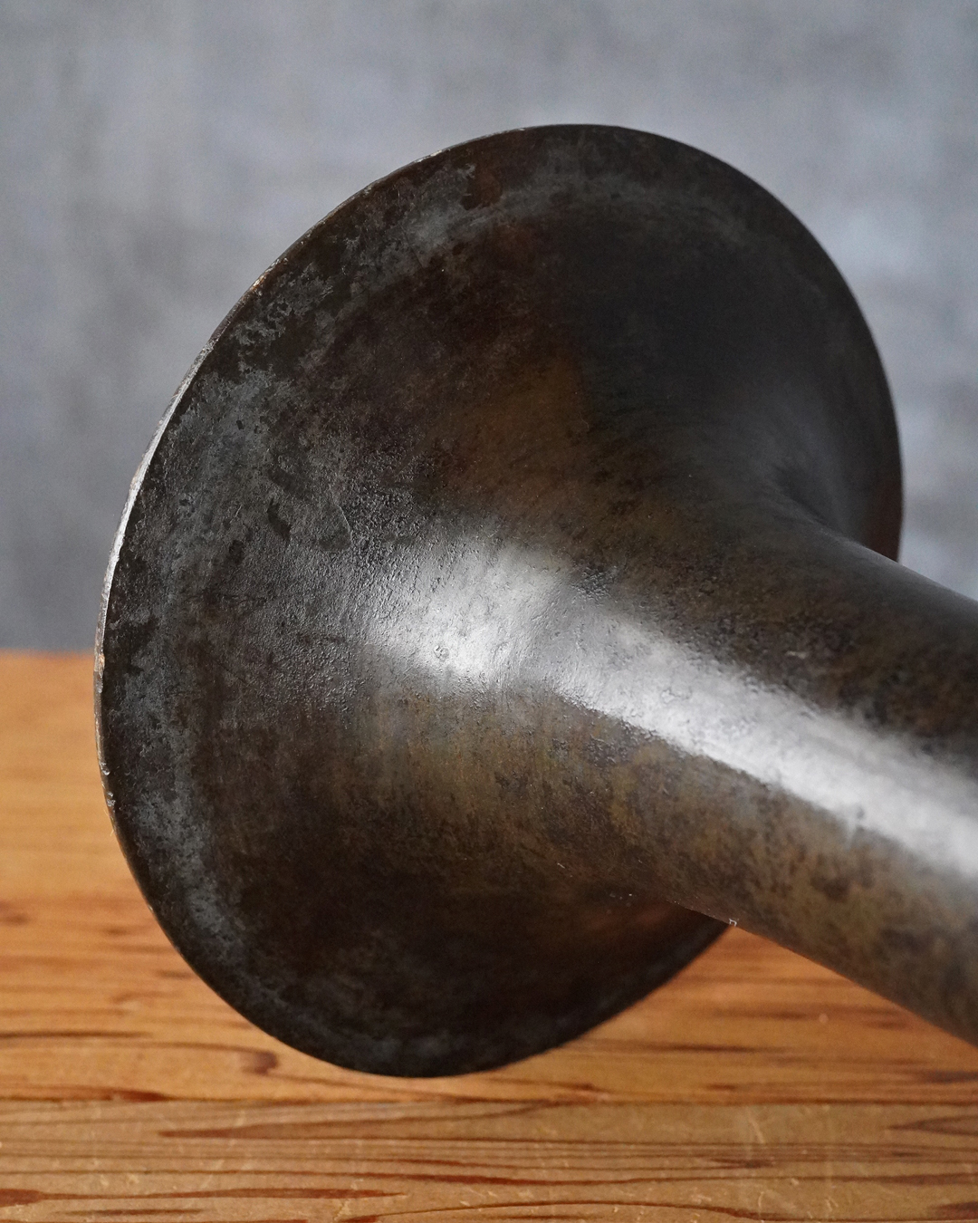 時代を経た艶やかな肌合いが良い尊式瓶。元々の形状は大陸からのものですが、文様が無くなり、よりシンプルに和洋化したものです。仏花器として使われていたものでしょう。時代相応の経年変化はございますが現状水漏れはありません。概ね状態は良好。たてはなに最適。室町時代まで上がるでしょう。