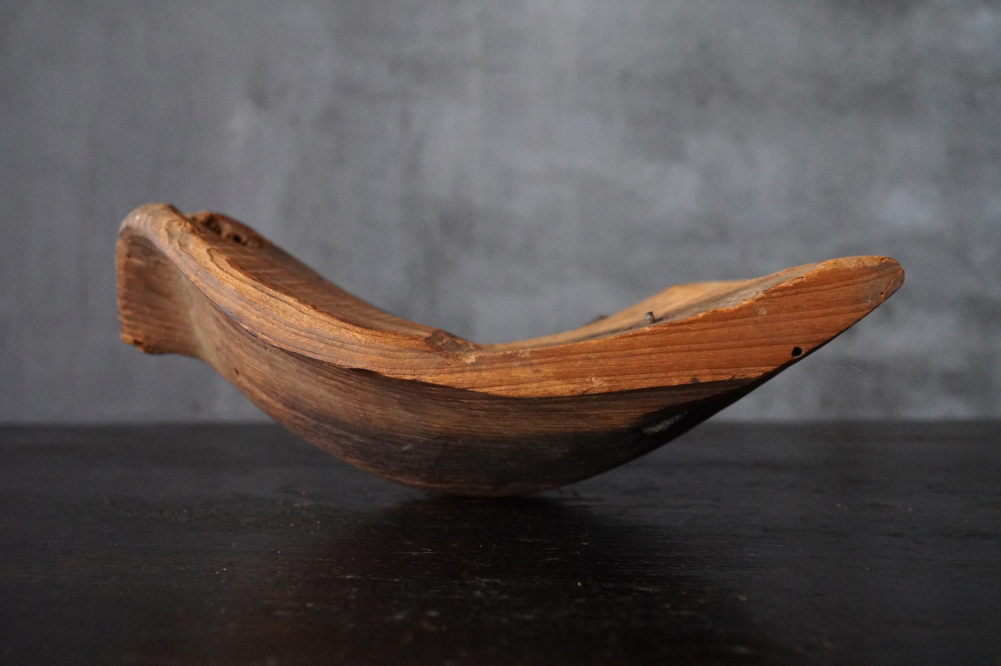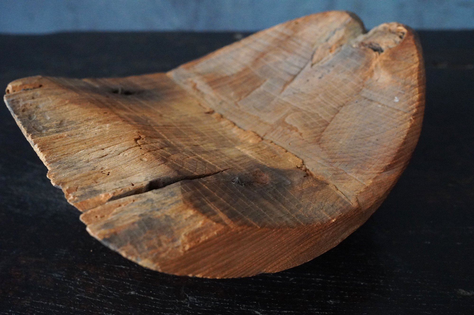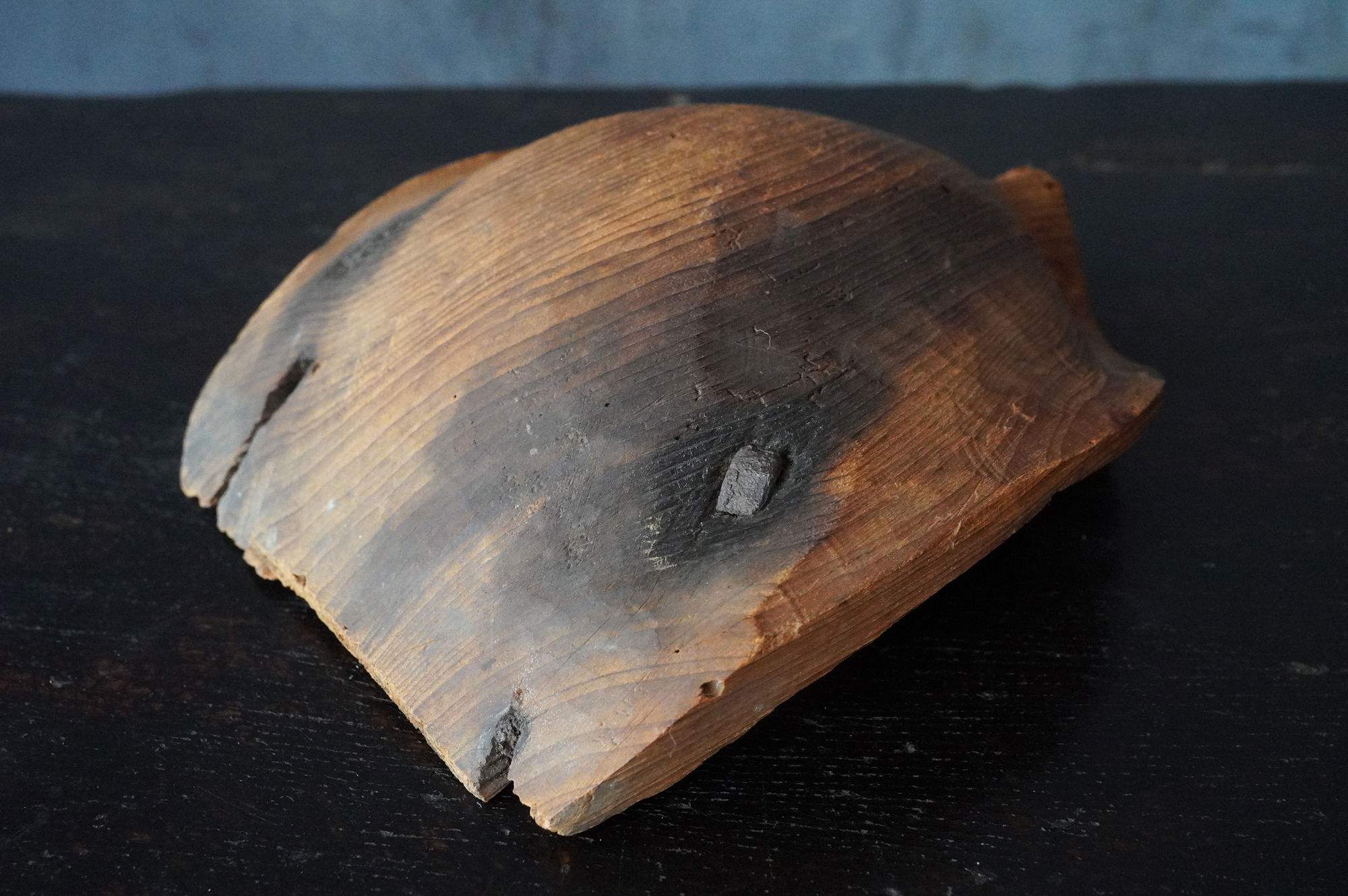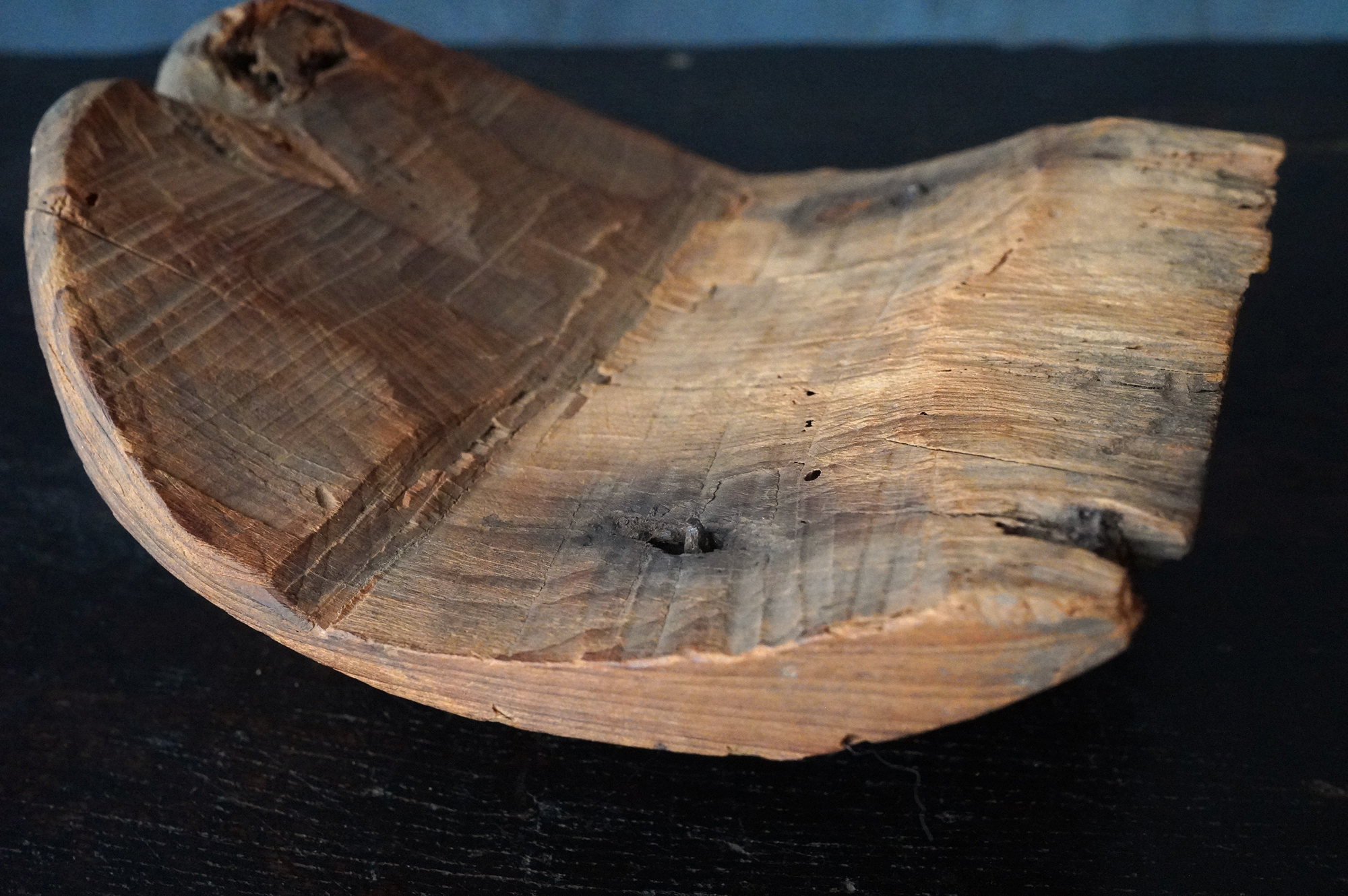 枯れた味わいが良いの蓮弁。彩色はなく、下部に釘が残り、中世を感じる様式です。材質は針葉樹ではなく、欅などの硬木材、元々彩色が施されていなかったのか、経年で剥がれ落ちてしまったのかは分かりませんが、本地仏の蓮弁だったのかもしれません。平鑿で勢いのある彫りは仏よりも神を感じます。室町時代以前。