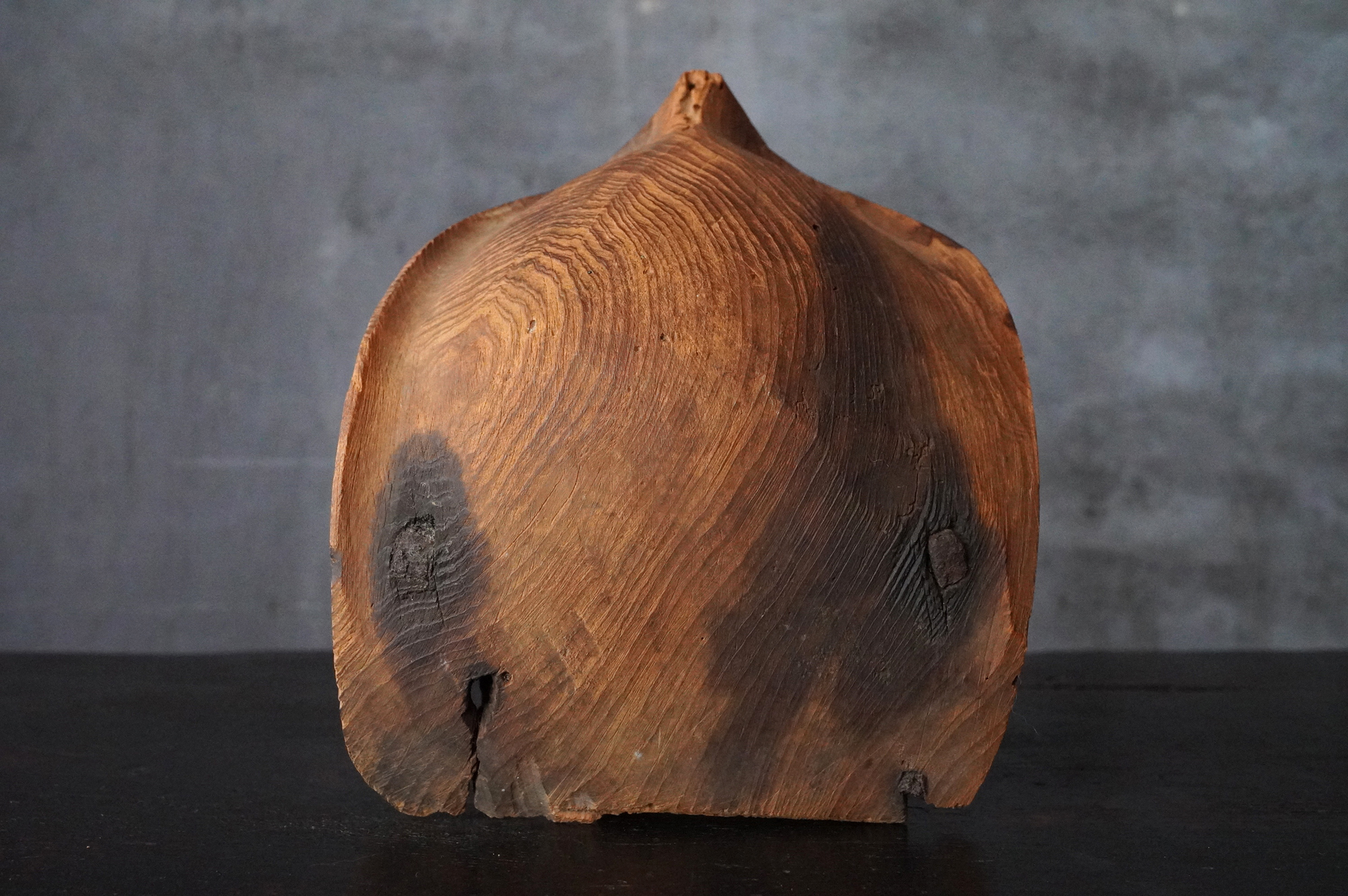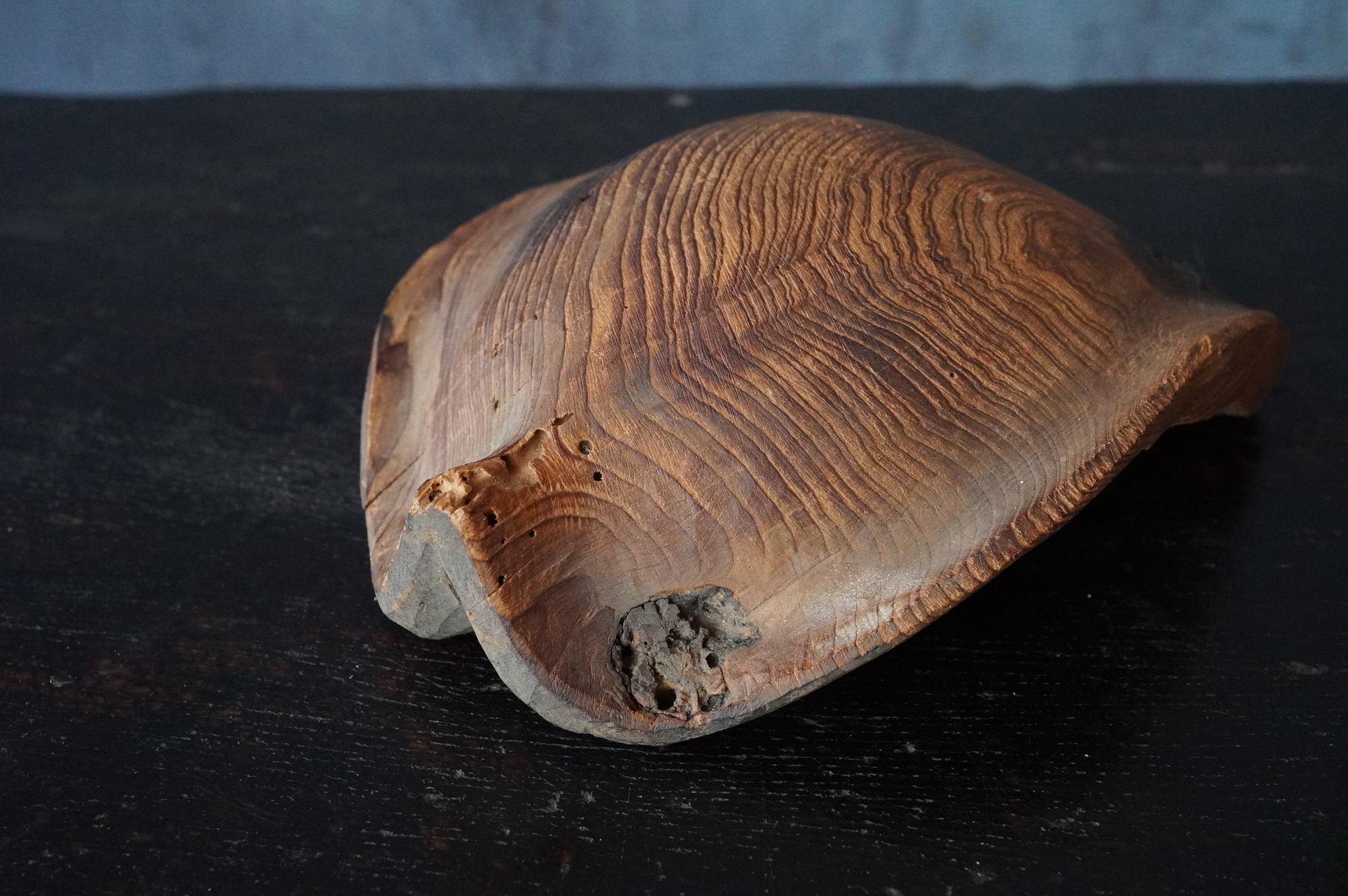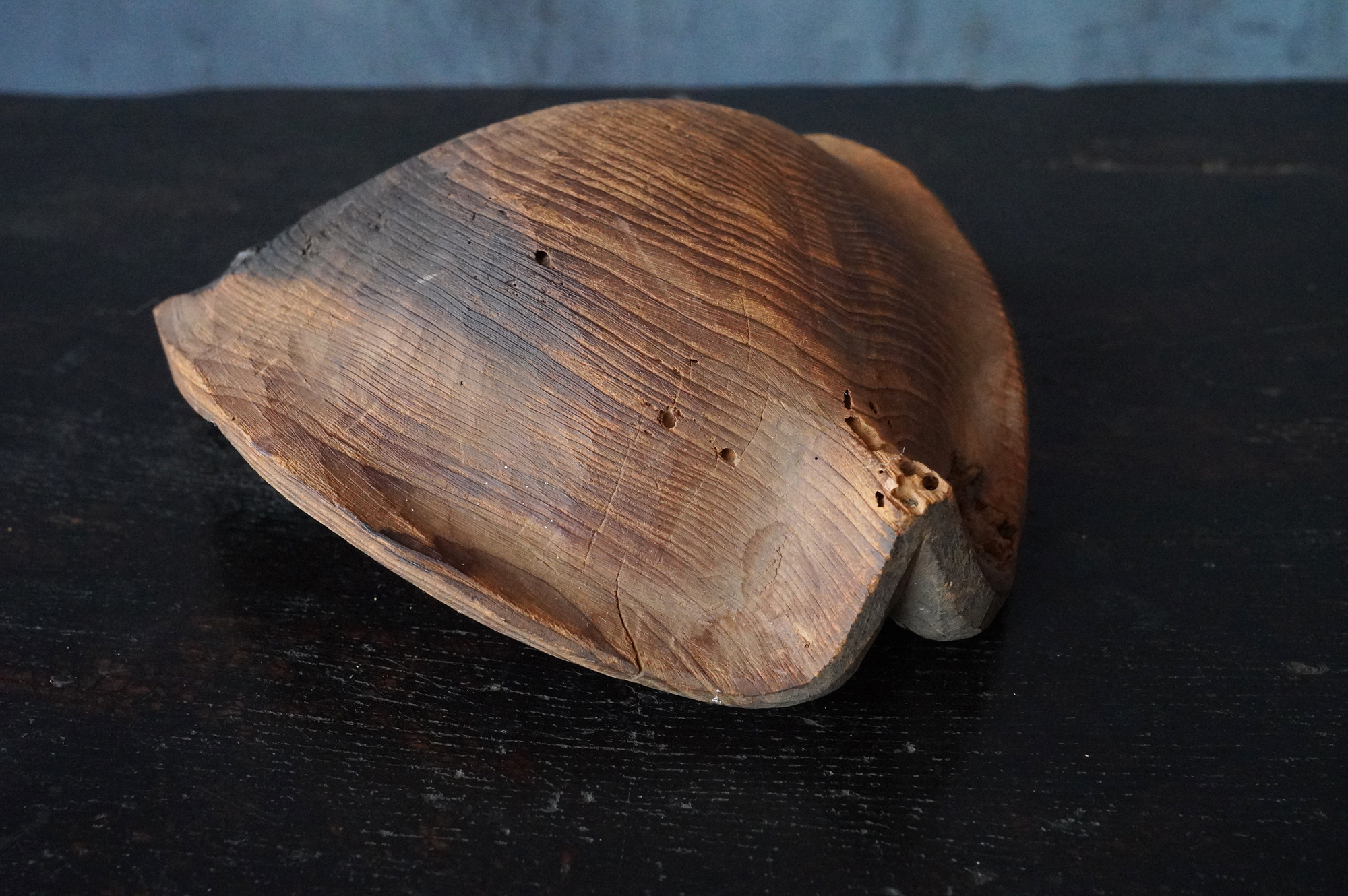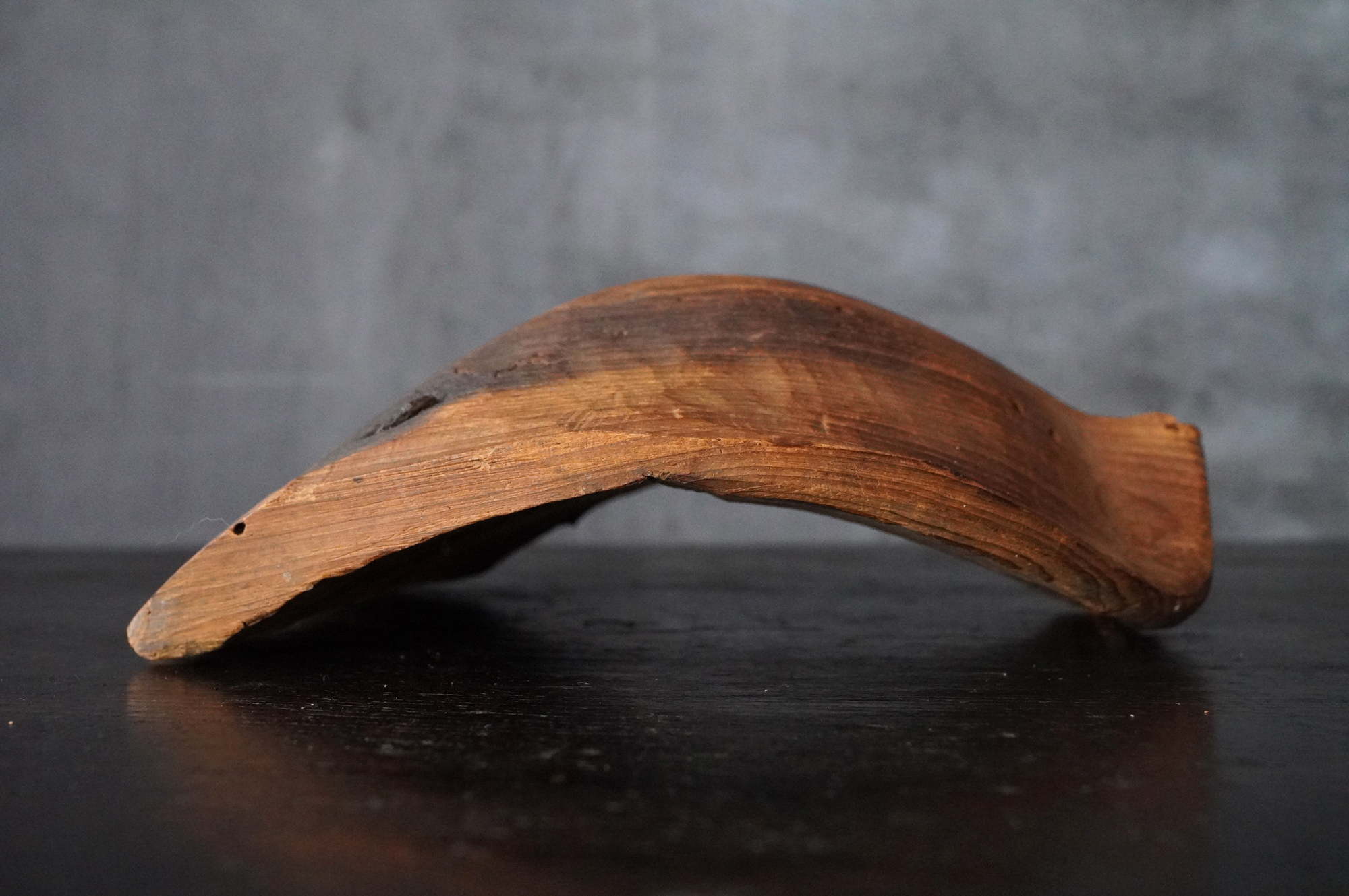 枯れた味わいが良いの蓮弁。彩色はなく、下部に釘が残り、中世を感じる様式です。材質は針葉樹ではなく、欅などの硬木材、元々彩色が施されていなかったのか、経年で剥がれ落ちてしまったのかは分かりませんが、本地仏の蓮弁だったのかもしれません。平鑿で勢いのある彫りは仏よりも神を感じます。室町時代以前。
