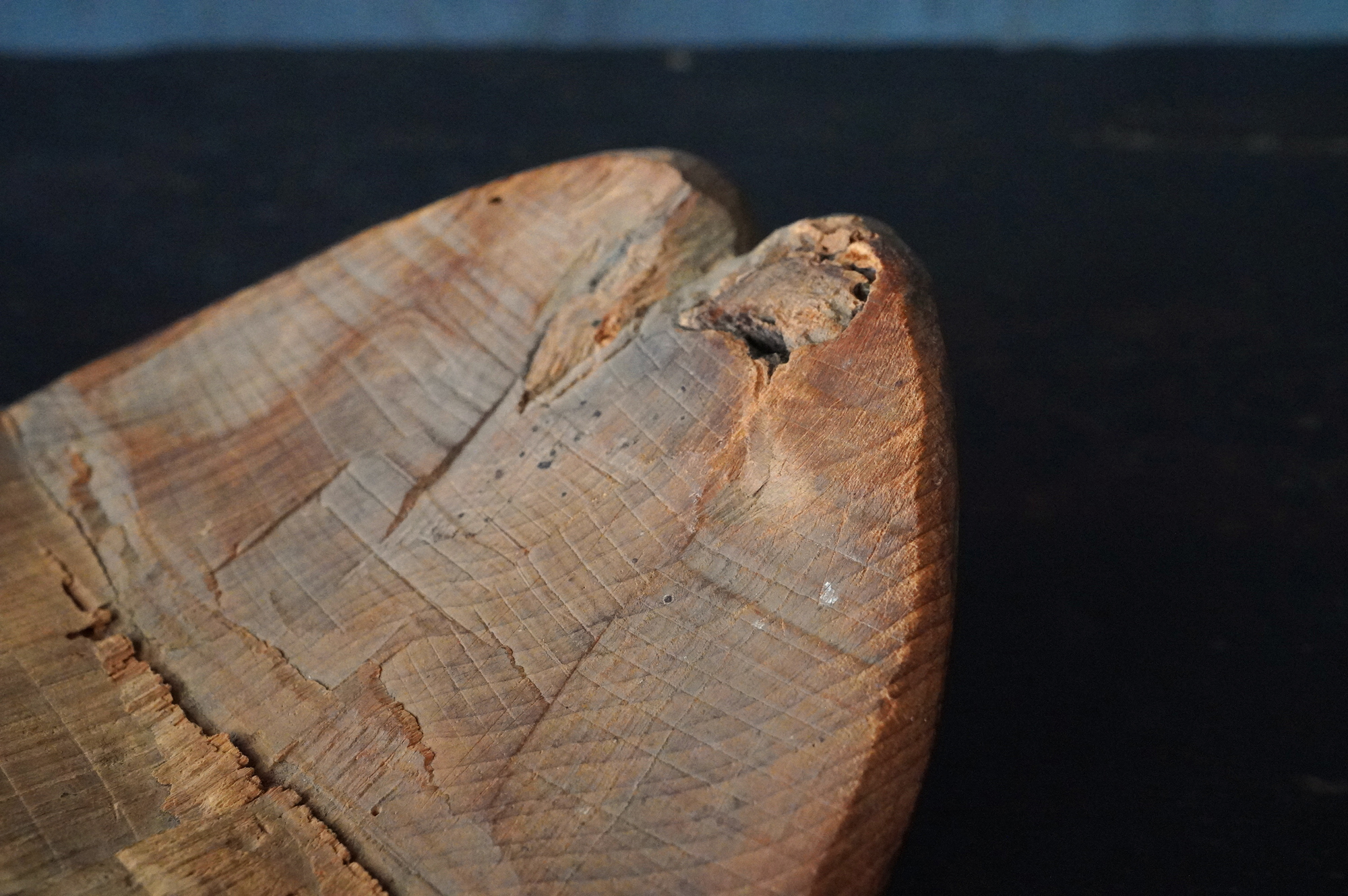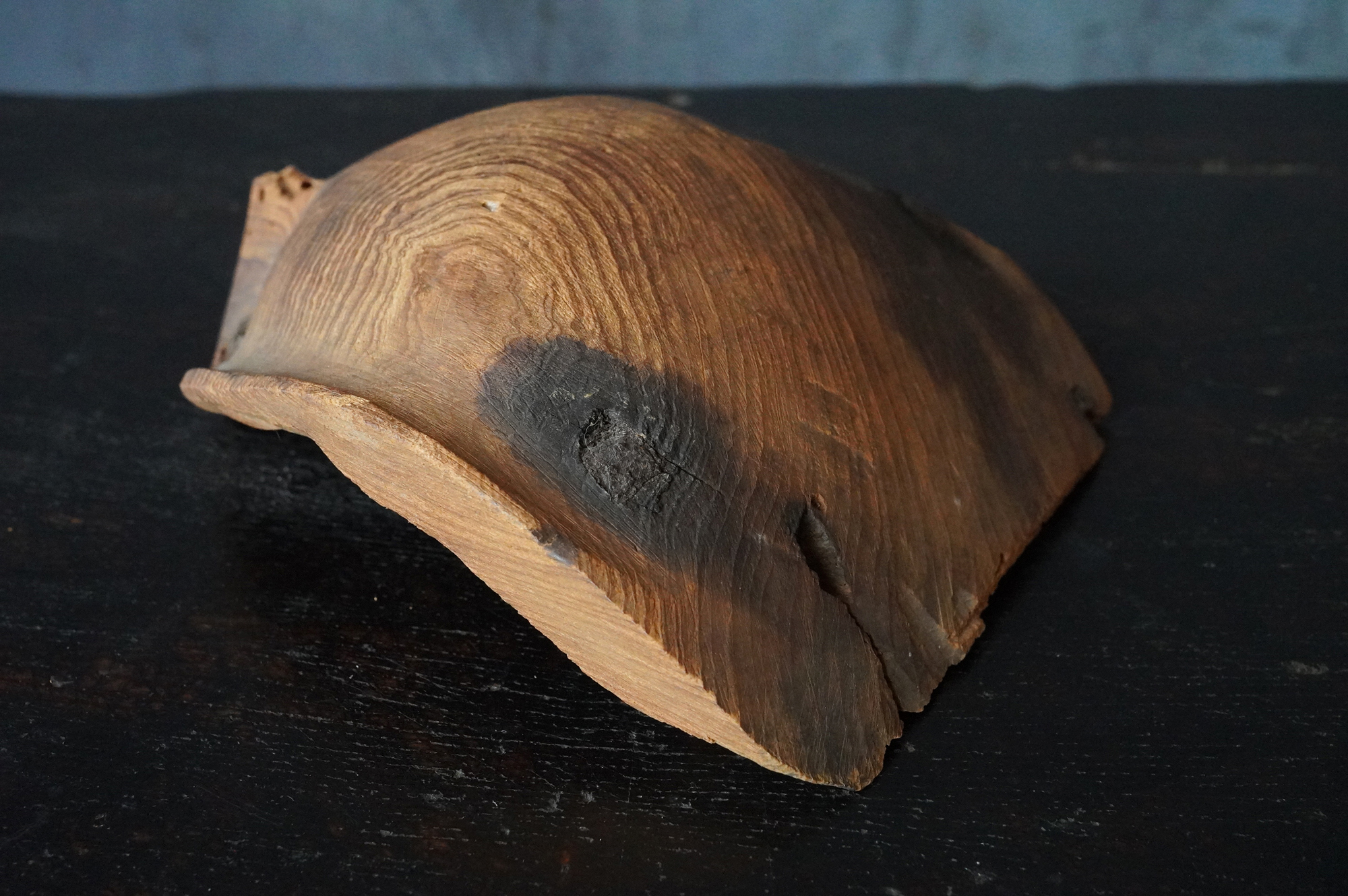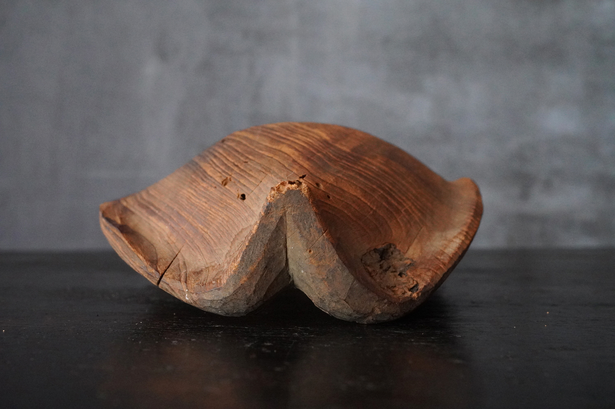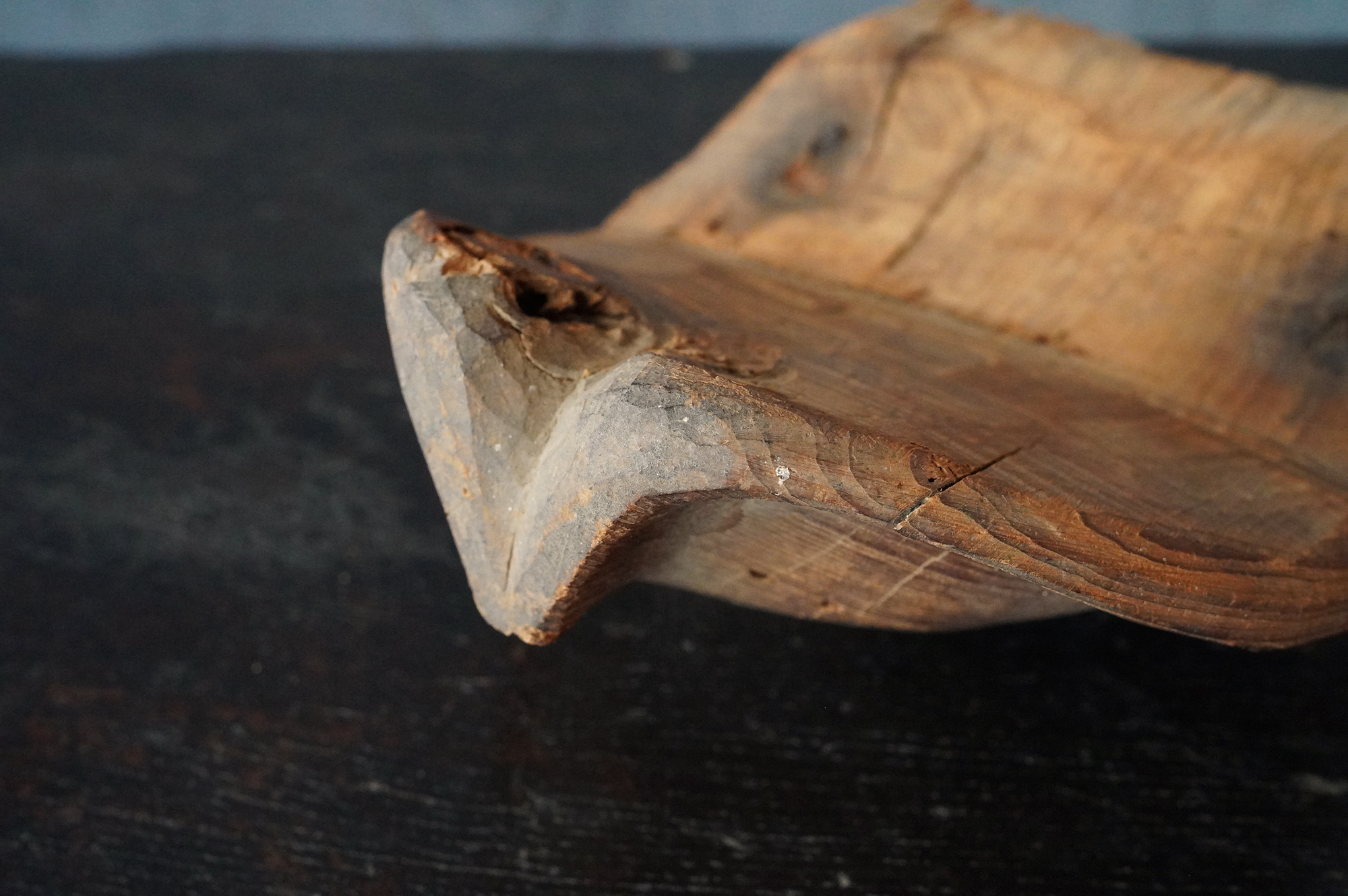 枯れた味わいが良いの蓮弁。彩色はなく、下部に釘が残り、中世を感じる様式です。材質は針葉樹ではなく、欅などの硬木材、元々彩色が施されていなかったのか、経年で剥がれ落ちてしまったのかは分かりませんが、本地仏の蓮弁だったのかもしれません。平鑿で勢いのある彫りは仏よりも神を感じます。室町時代以前。