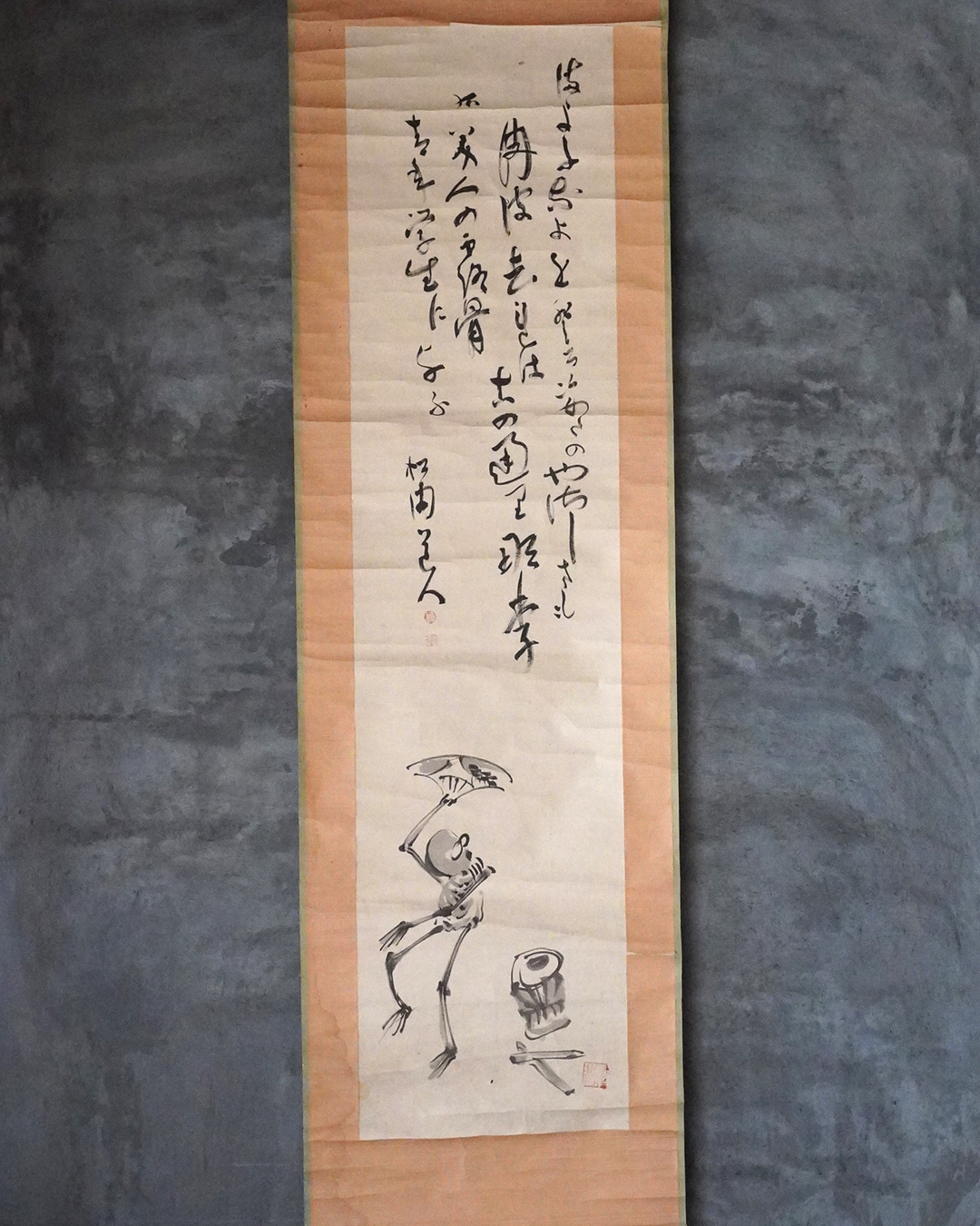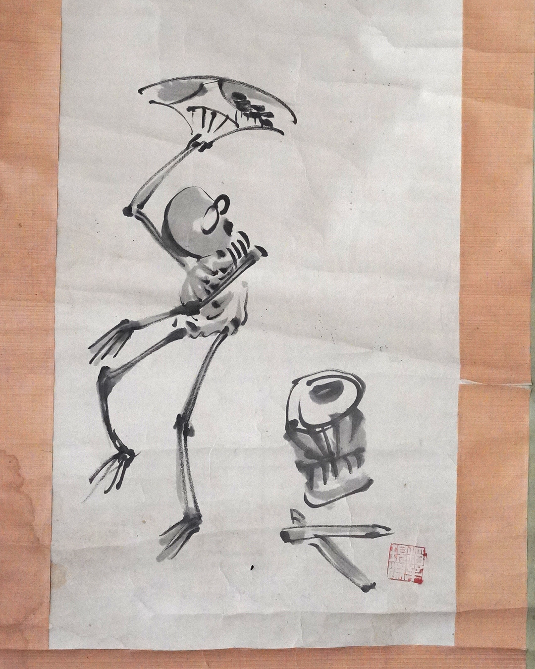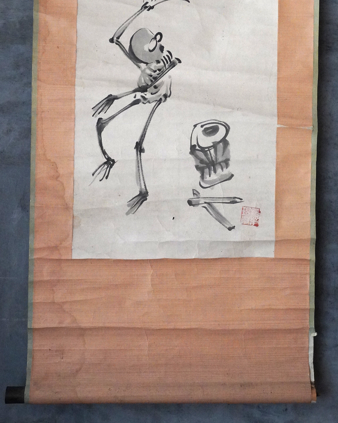 骸骨が扇子を持って踊っている様子は愛嬌があって微笑ましく良い感じです。書、画とも浅学の為、作者は分かりませんのでご了承下さい。個人的には掛けて愉しめる状態ですが、紙表具で、糊の剥がれ、破れ、日焼け、シミ、軸先が片方無しなど状態は良好とはいえませんので十分ご確認の上ご判断の上ご注文下さい。明治〜大正期頃。