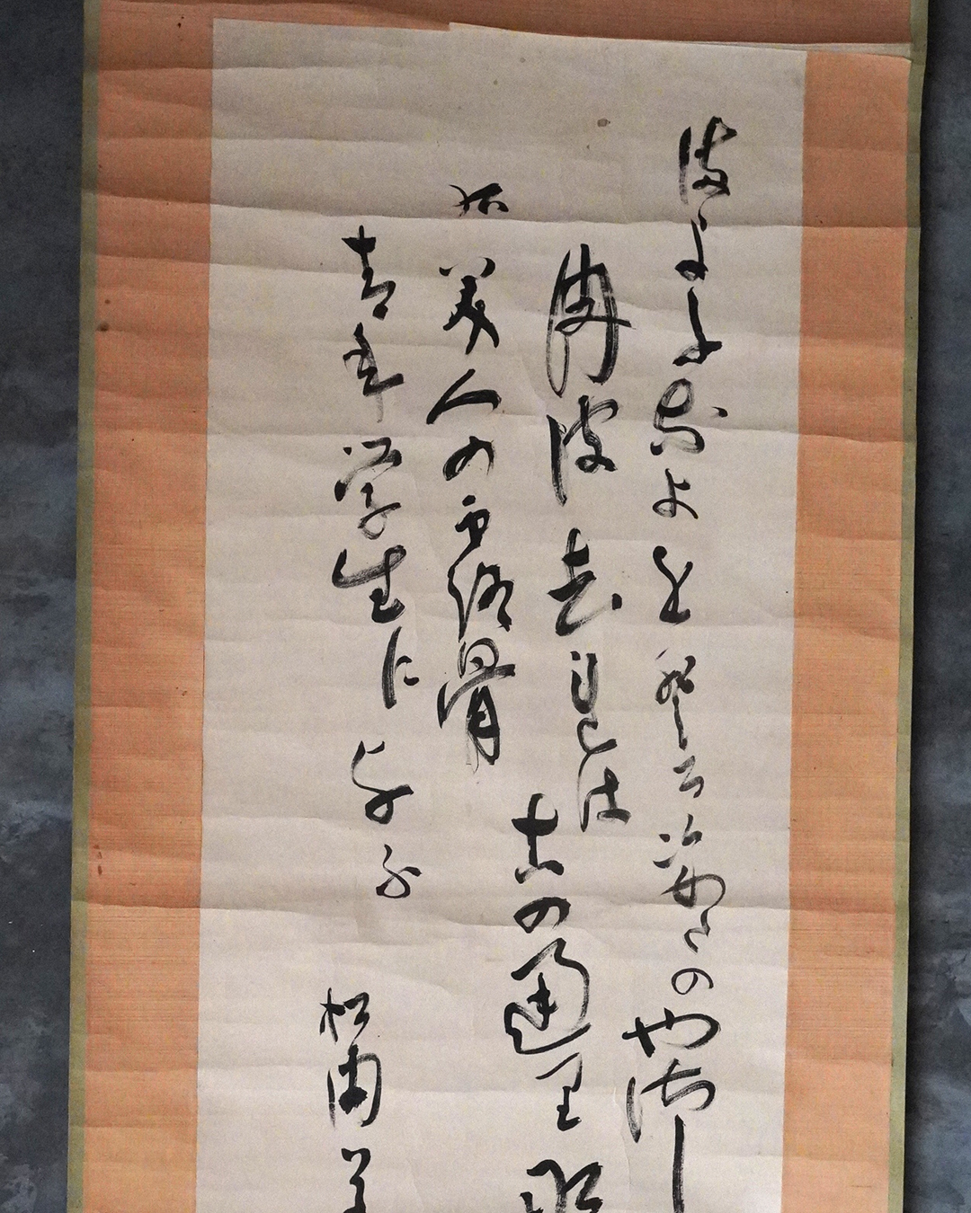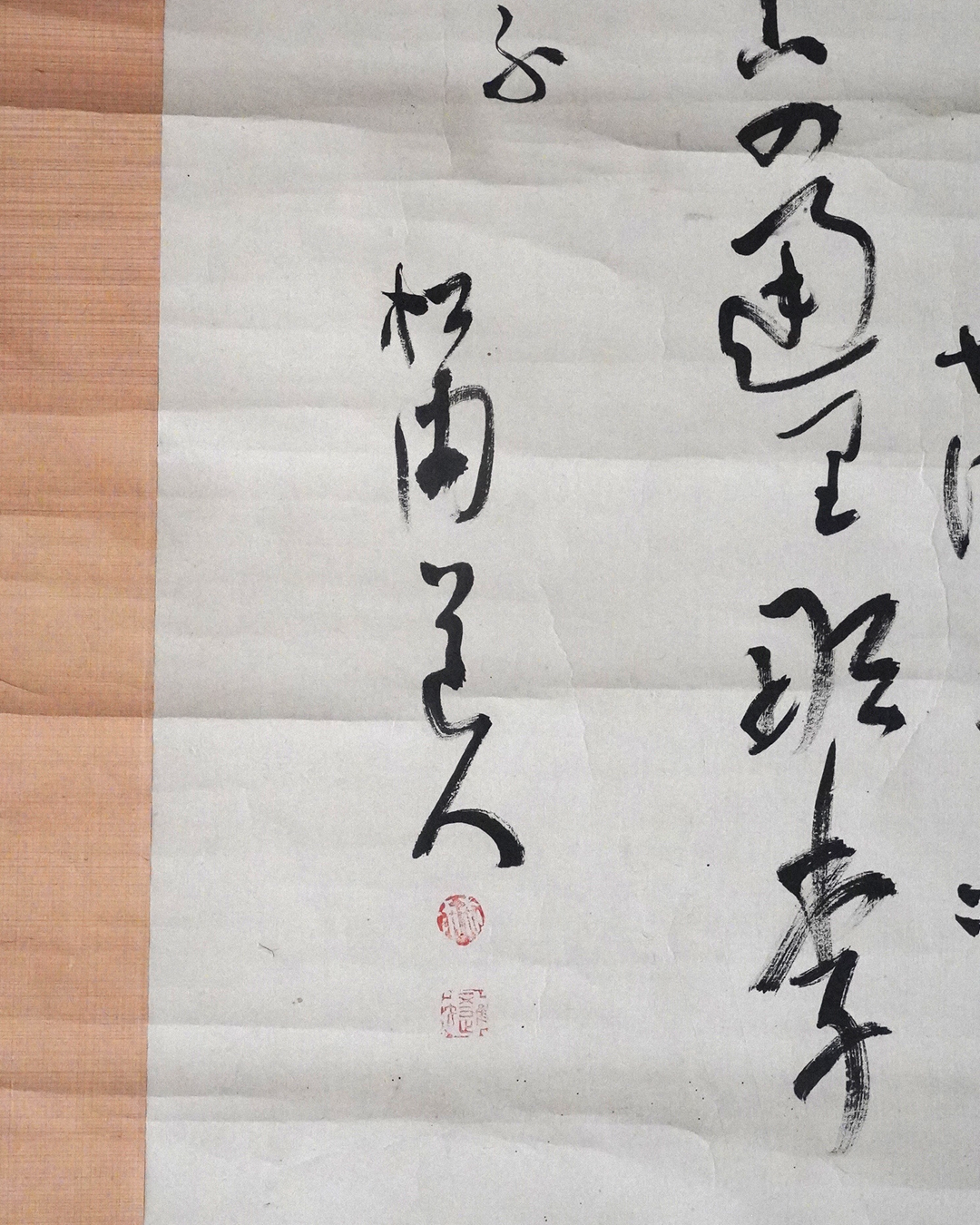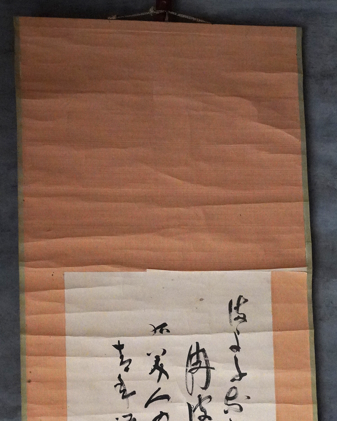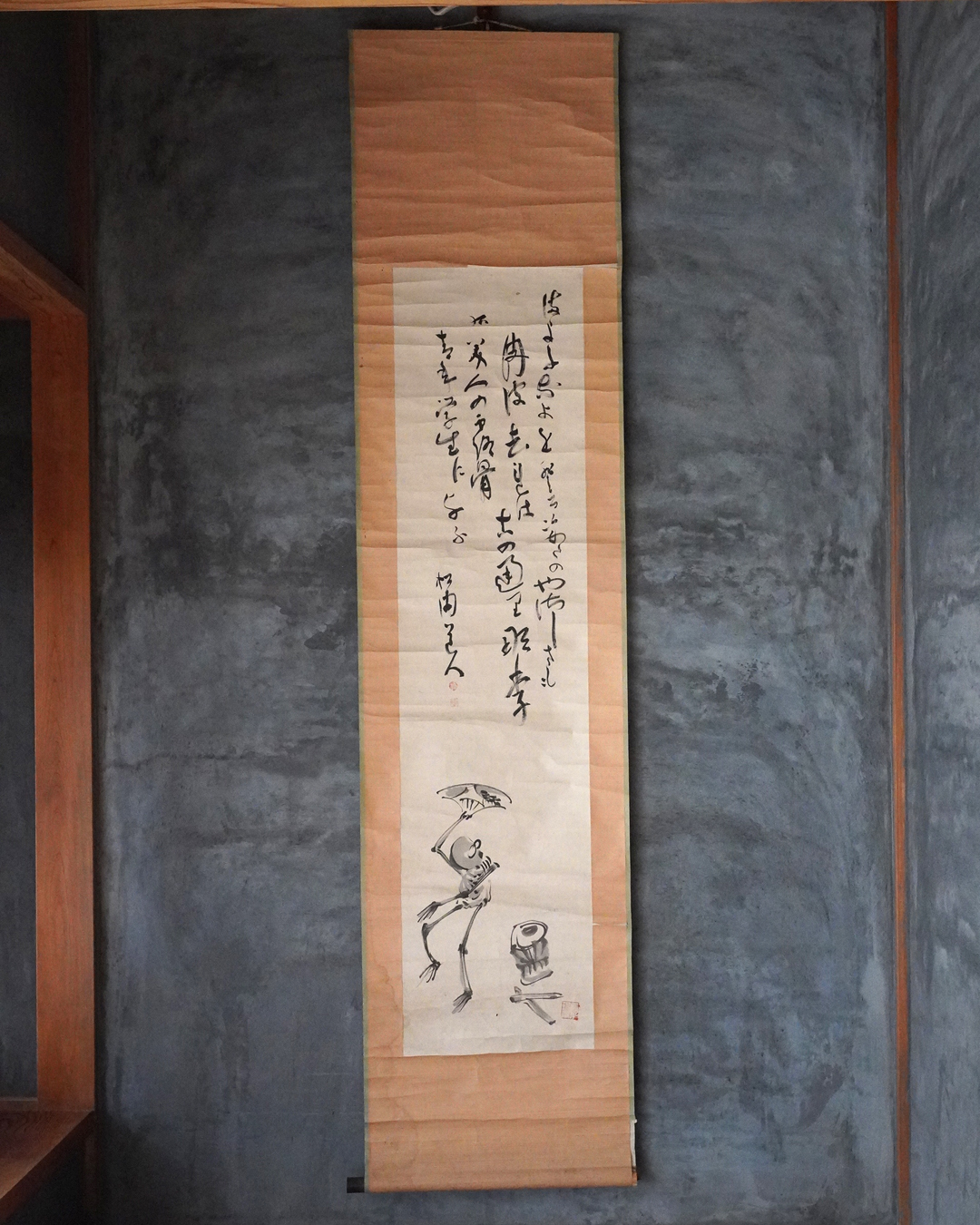 骸骨が扇子を持って踊っている様子は愛嬌があって微笑ましく良い感じです。書、画とも浅学の為、作者は分かりませんのでご了承下さい。個人的には掛けて愉しめる状態ですが、紙表具で、糊の剥がれ、破れ、日焼け、シミ、軸先が片方無しなど状態は良好とはいえませんので十分ご確認の上ご判断の上ご注文下さい。明治〜大正期頃。