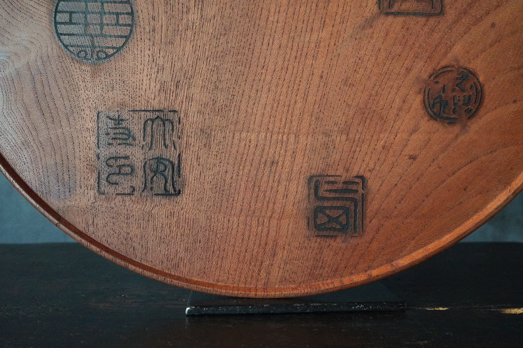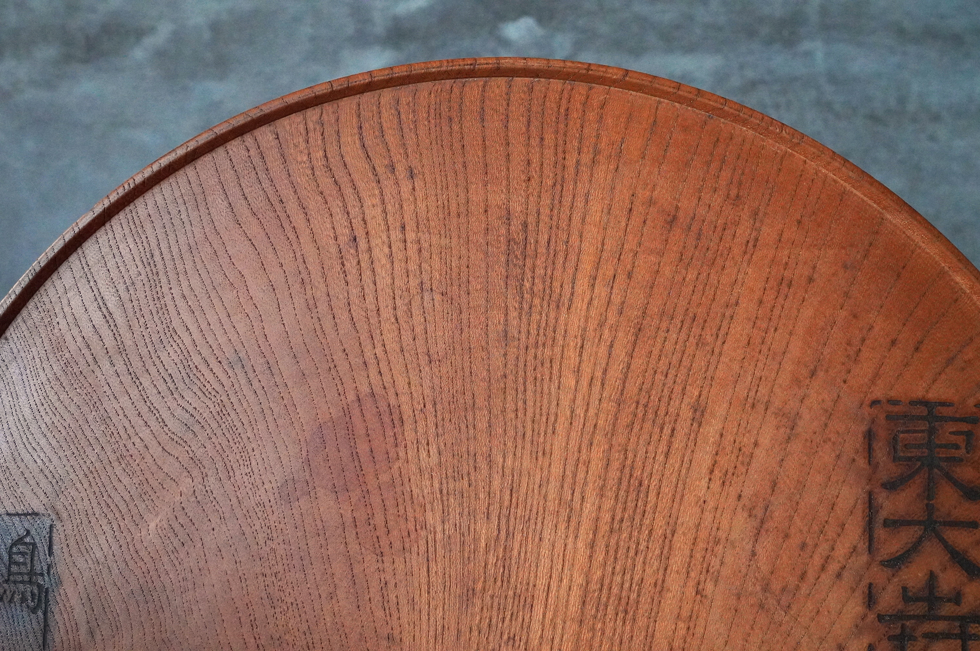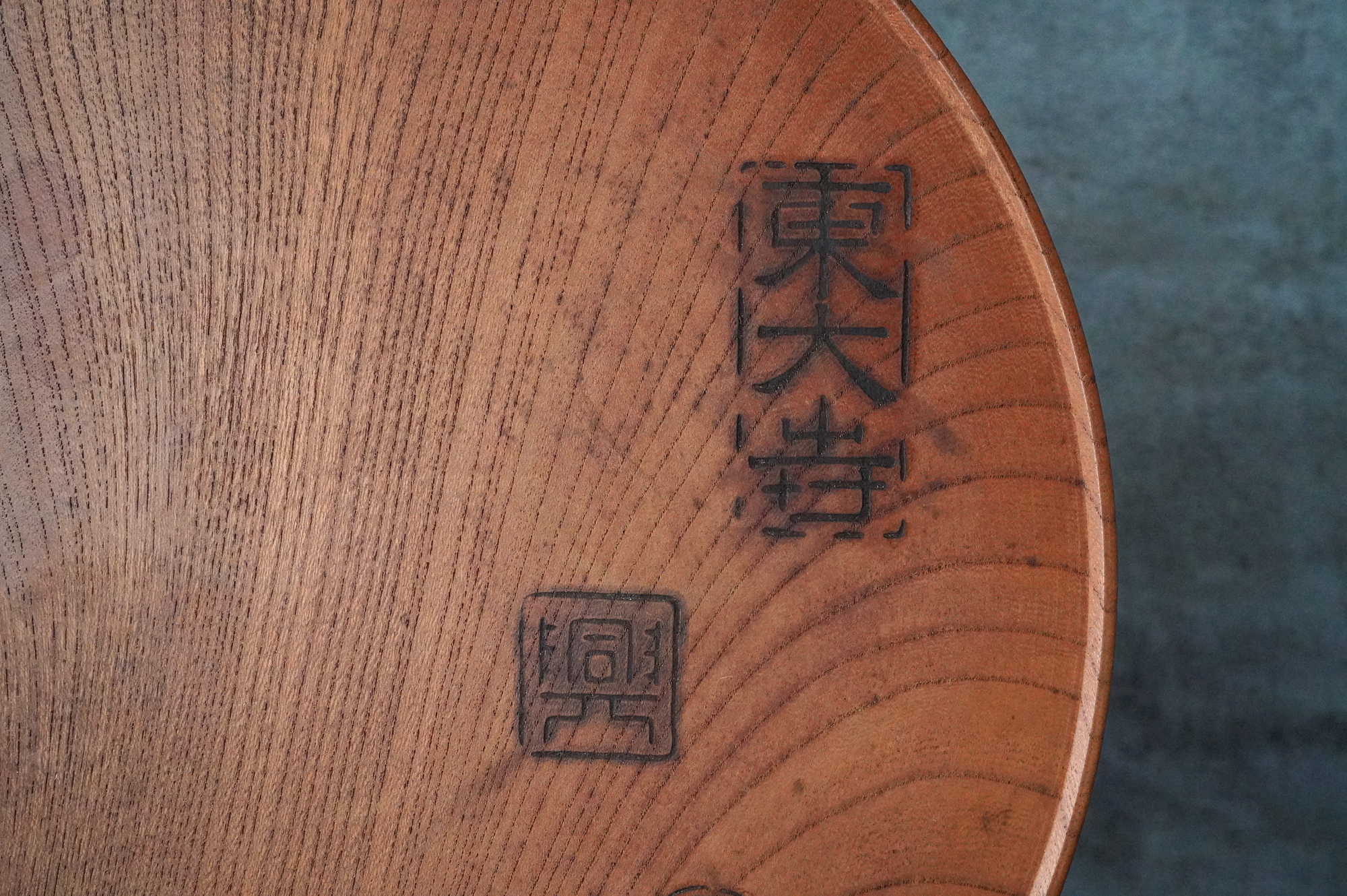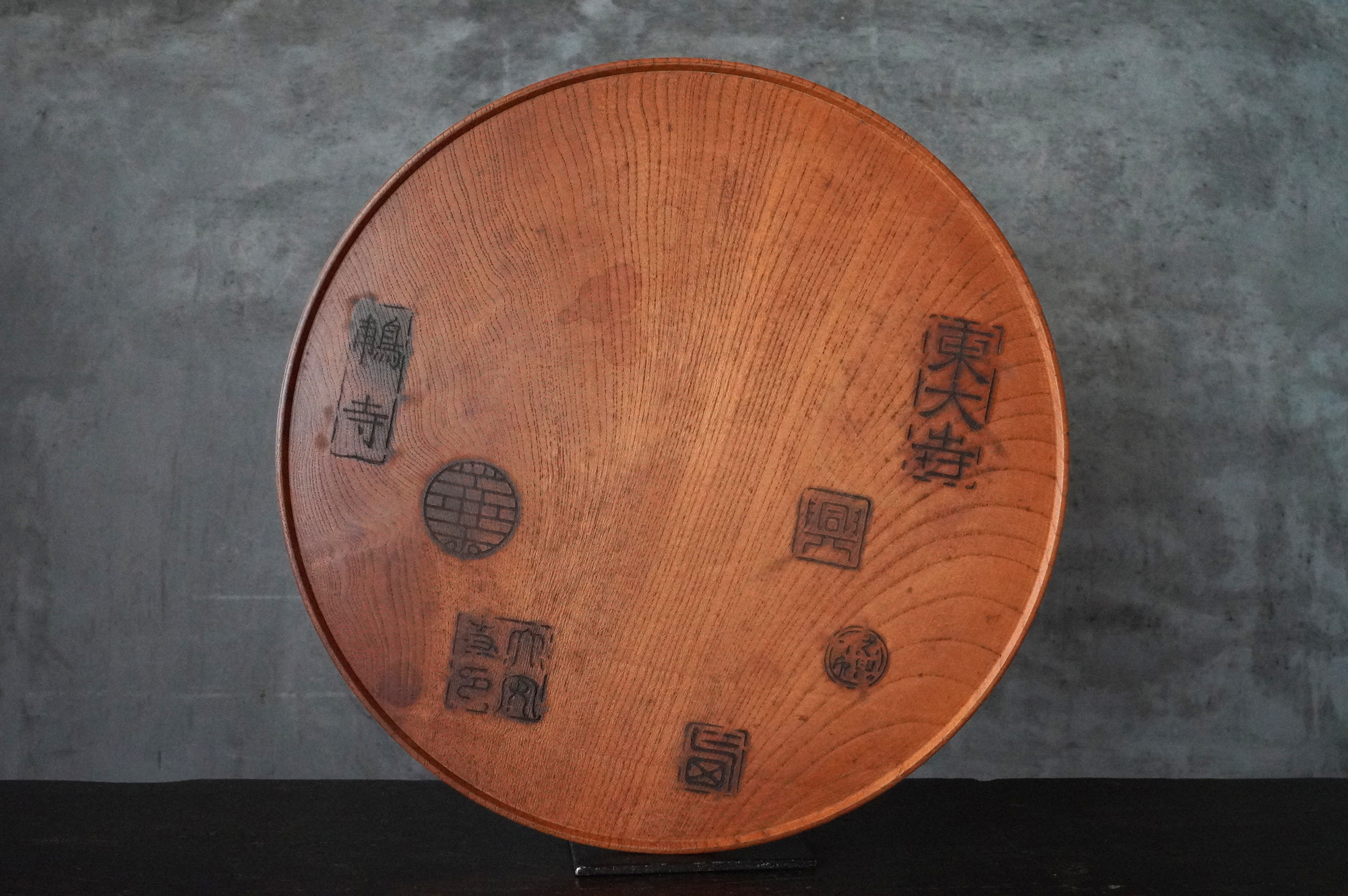東大寺、興福寺、元興寺、大安寺、西大寺、薬師寺、法隆寺の南都七大寺の焼印が捺された奈良らしい丸盆。擦れ、染みなどの使用感はございますが、反りもなく問題なくご使用頂けます。気兼ねなくお使いいただける品。昭和時代。