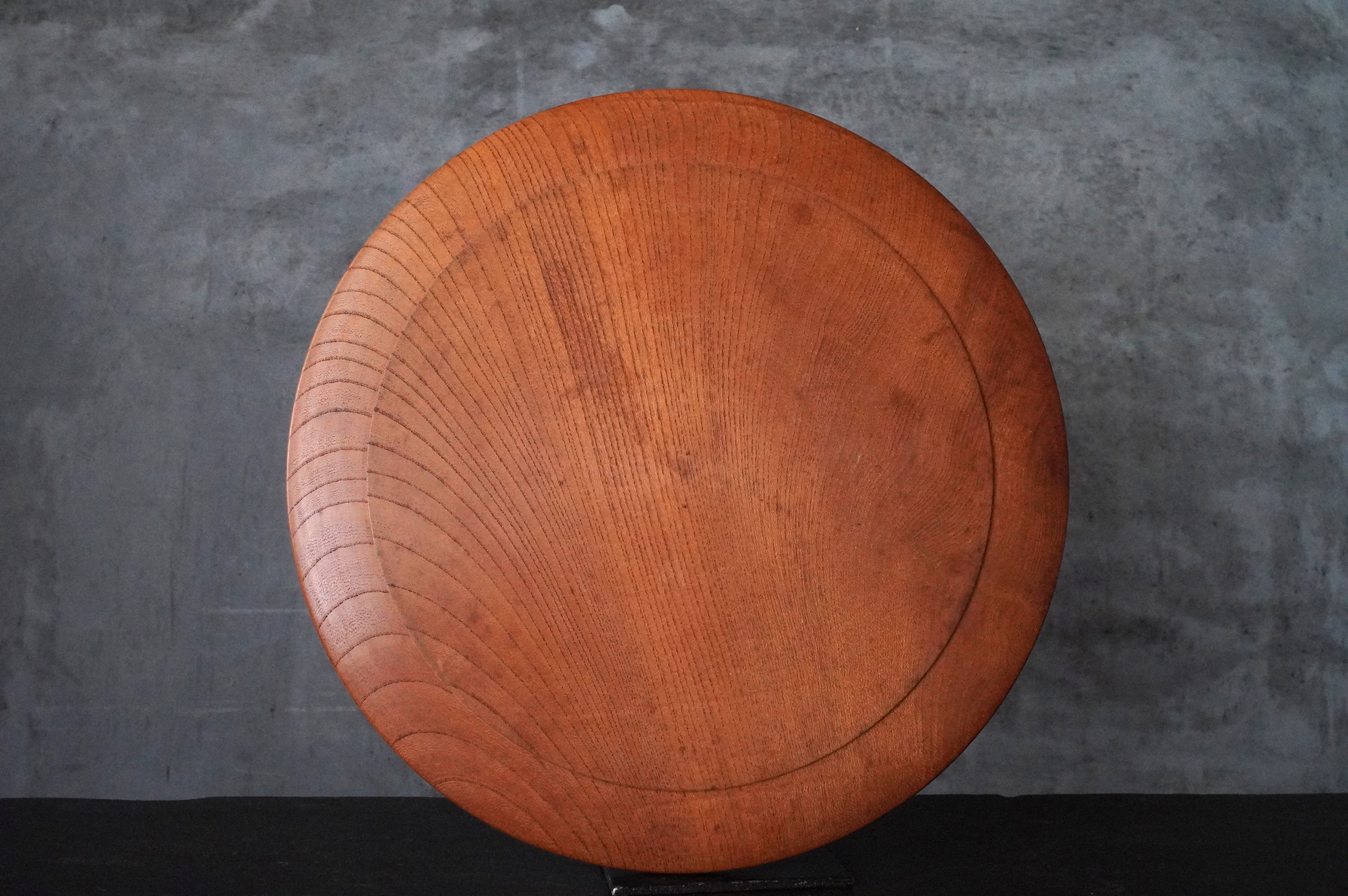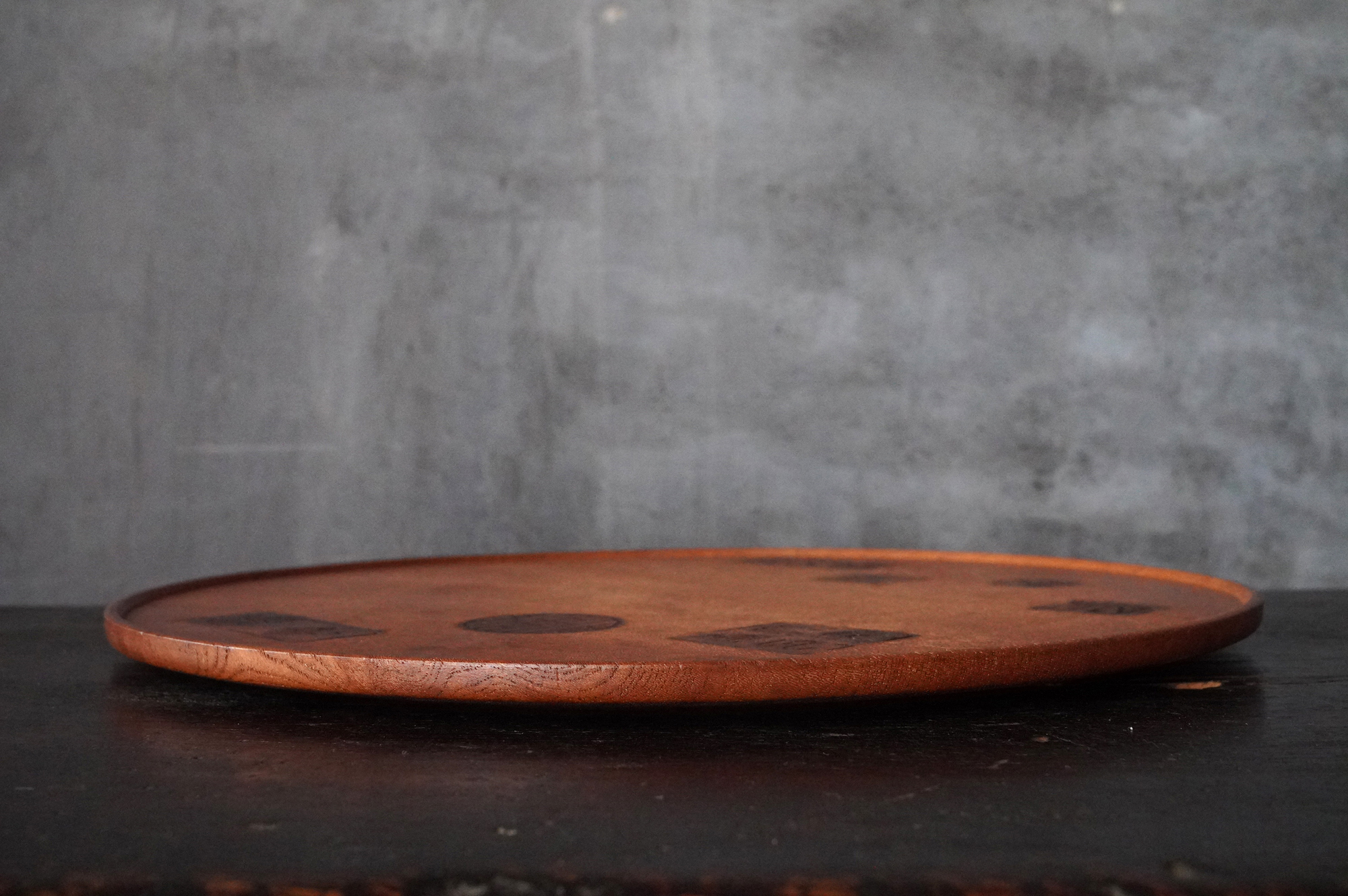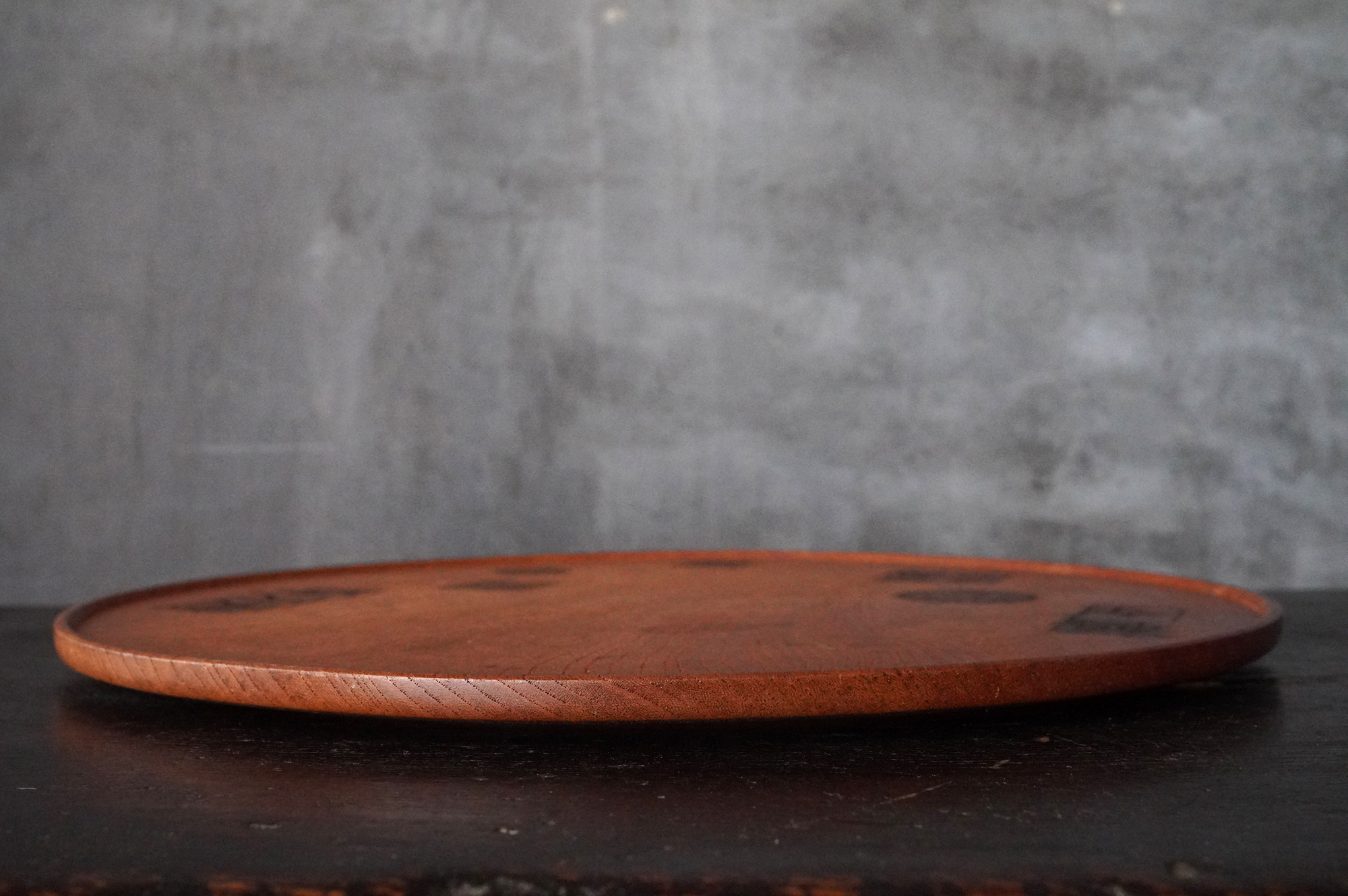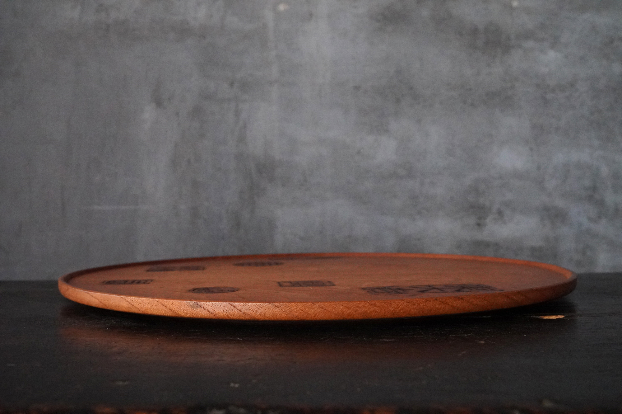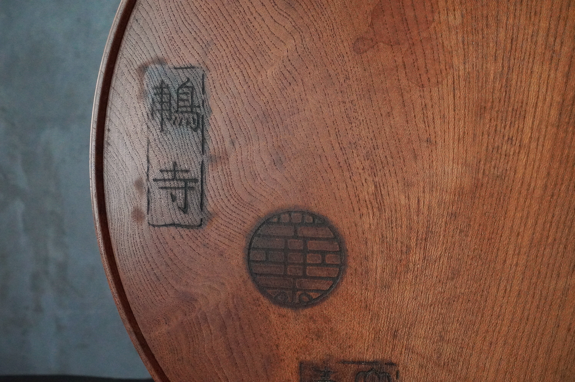 東大寺、興福寺、元興寺、大安寺、西大寺、薬師寺、法隆寺の南都七大寺の焼印が捺された奈良らしい丸盆。擦れ、染みなどの使用感はございますが、反りもなく問題なくご使用頂けます。気兼ねなくお使いいただける品。昭和時代。
