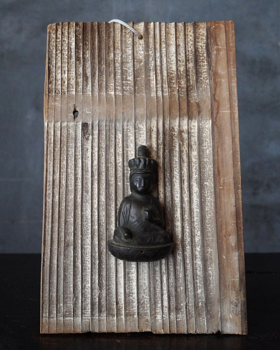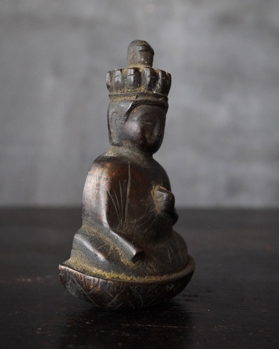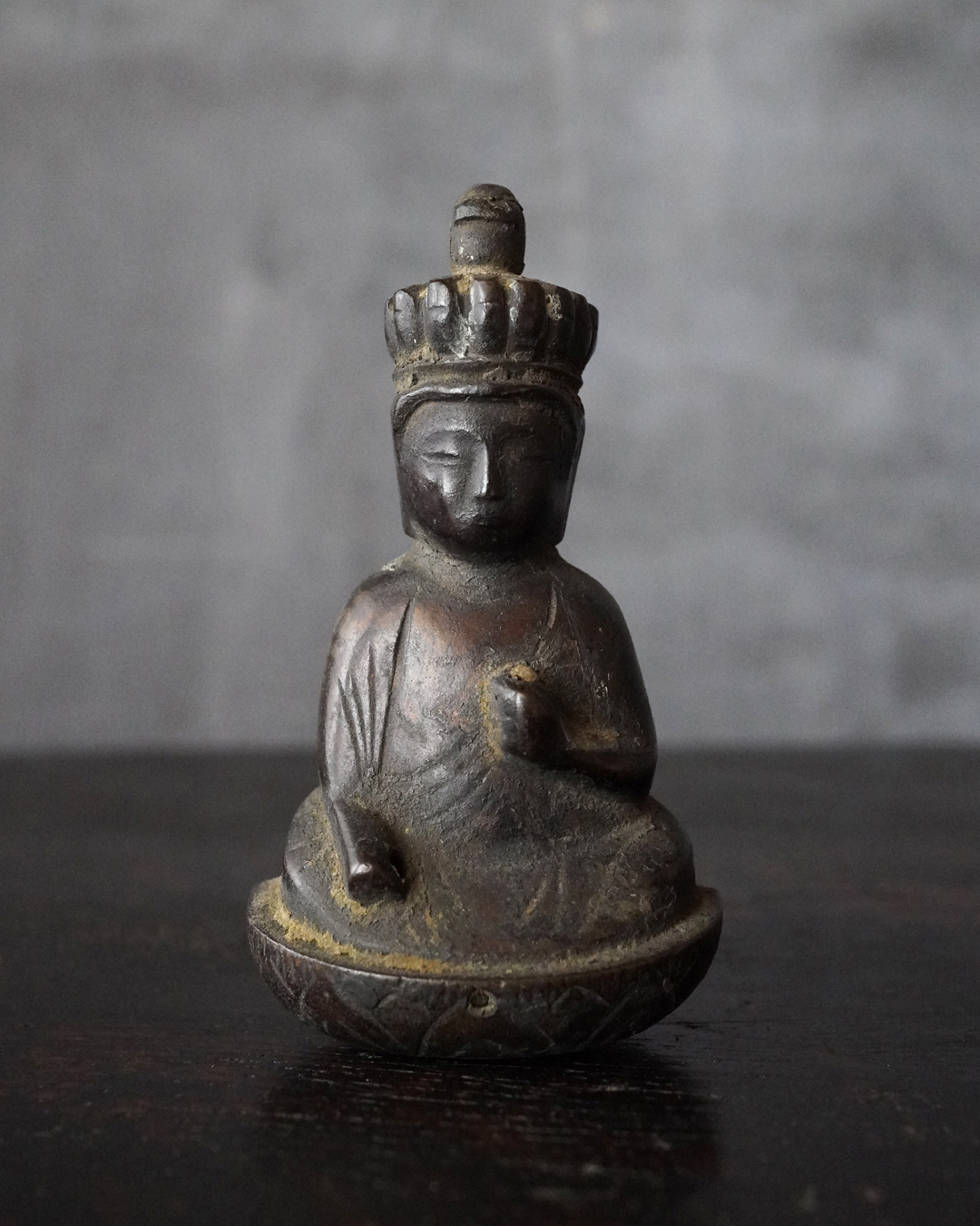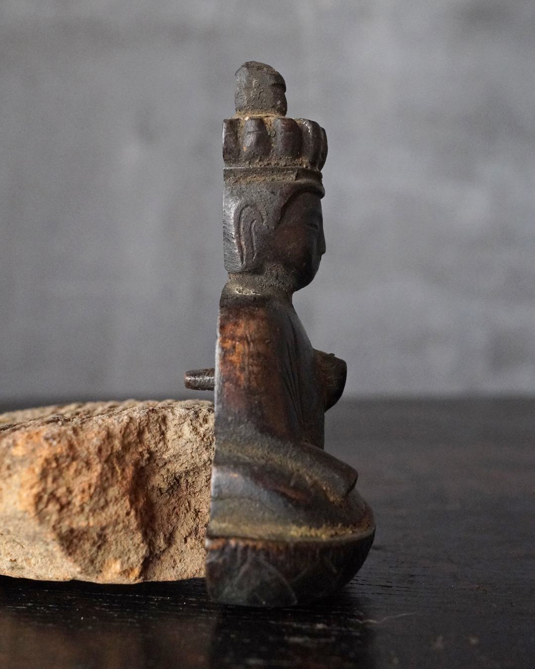 愛くるしい姿の十一面観音掛仏。優しいお顔と姿は側に置いても長年愛玩できる像容ではないでしょうか。時代を経て黒く深い味わいになっておりますが、品格を感じるのは、その煤けた下に鍍金が残っているからでしょう。当時は鍍金の圧着にばらつきがあり経年とともに剥がれ落ちるものが多く、鍍金が多く残っているのもの懸仏に関わらず希少。古材に取り付けておりますが、唐木などで台座などを誂えても良いでしょう。持物、盤などはございませんが、状態は良好。鎌倉時代。