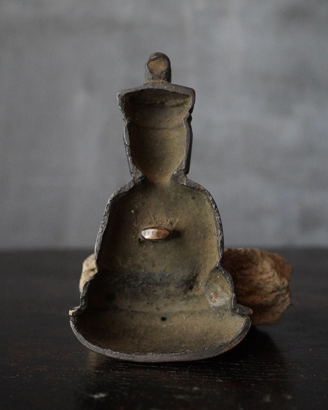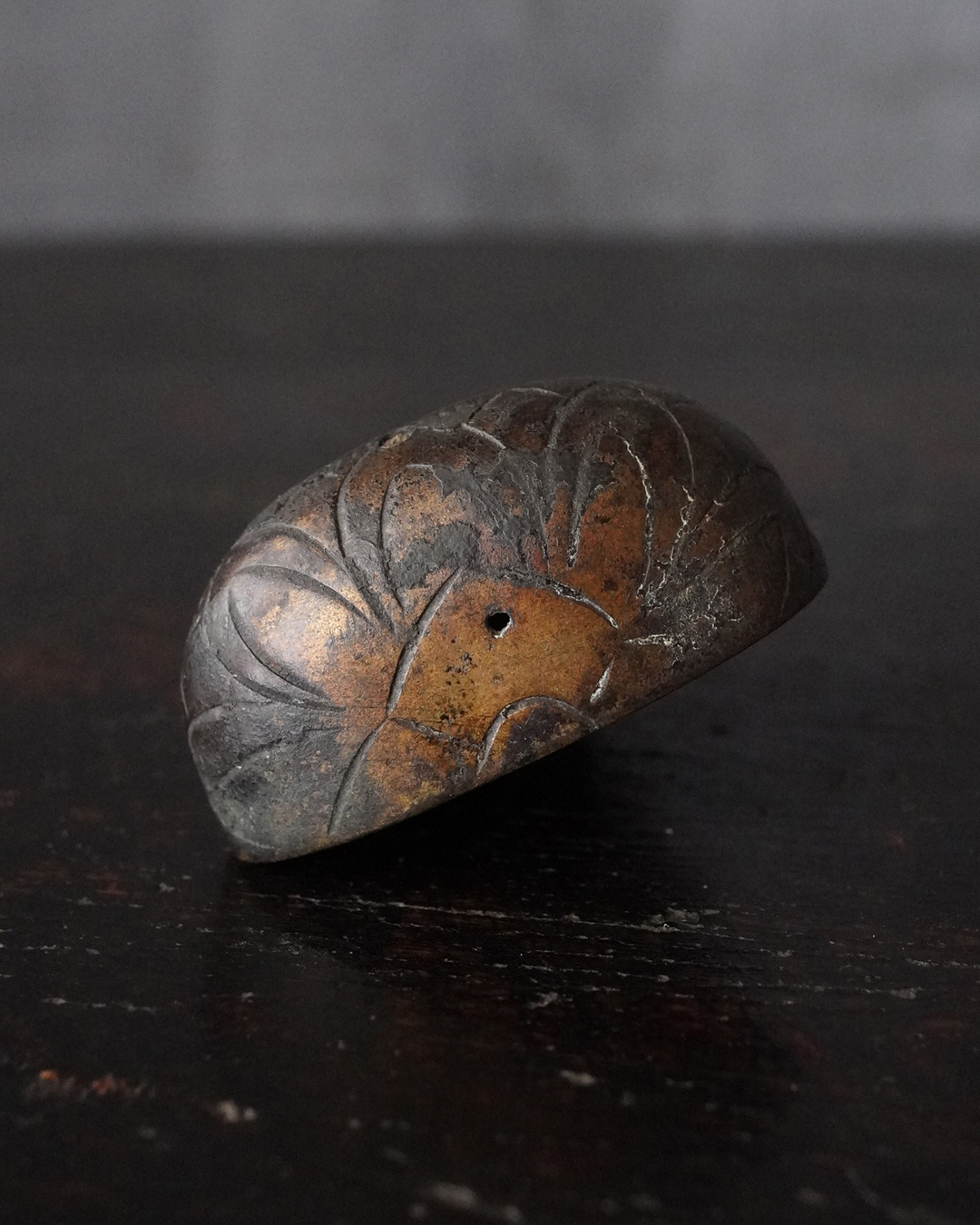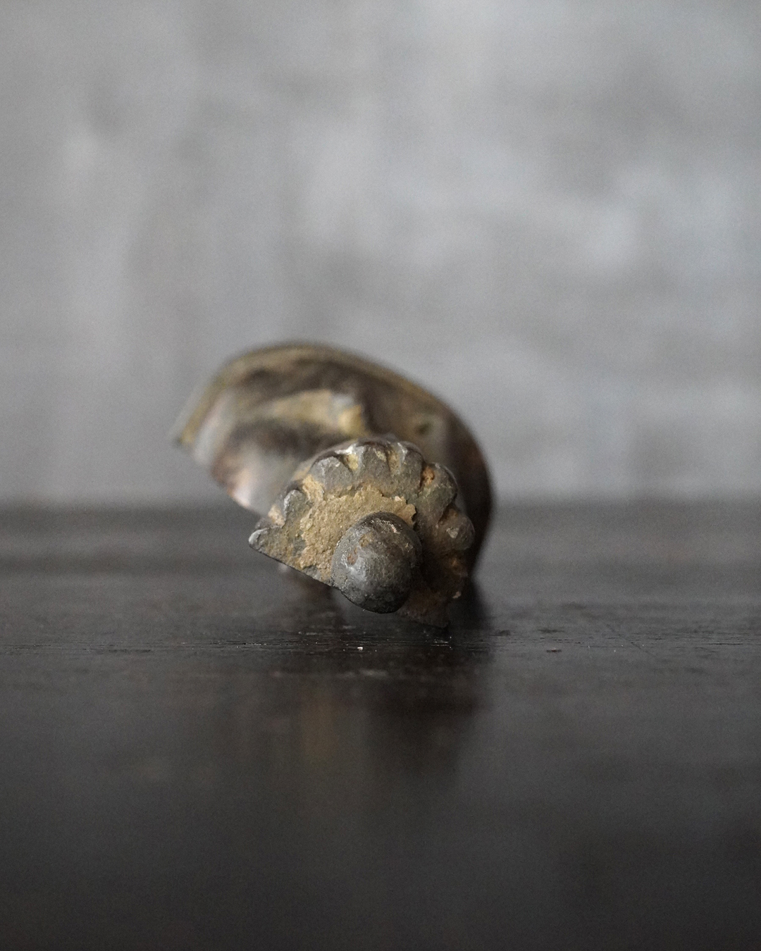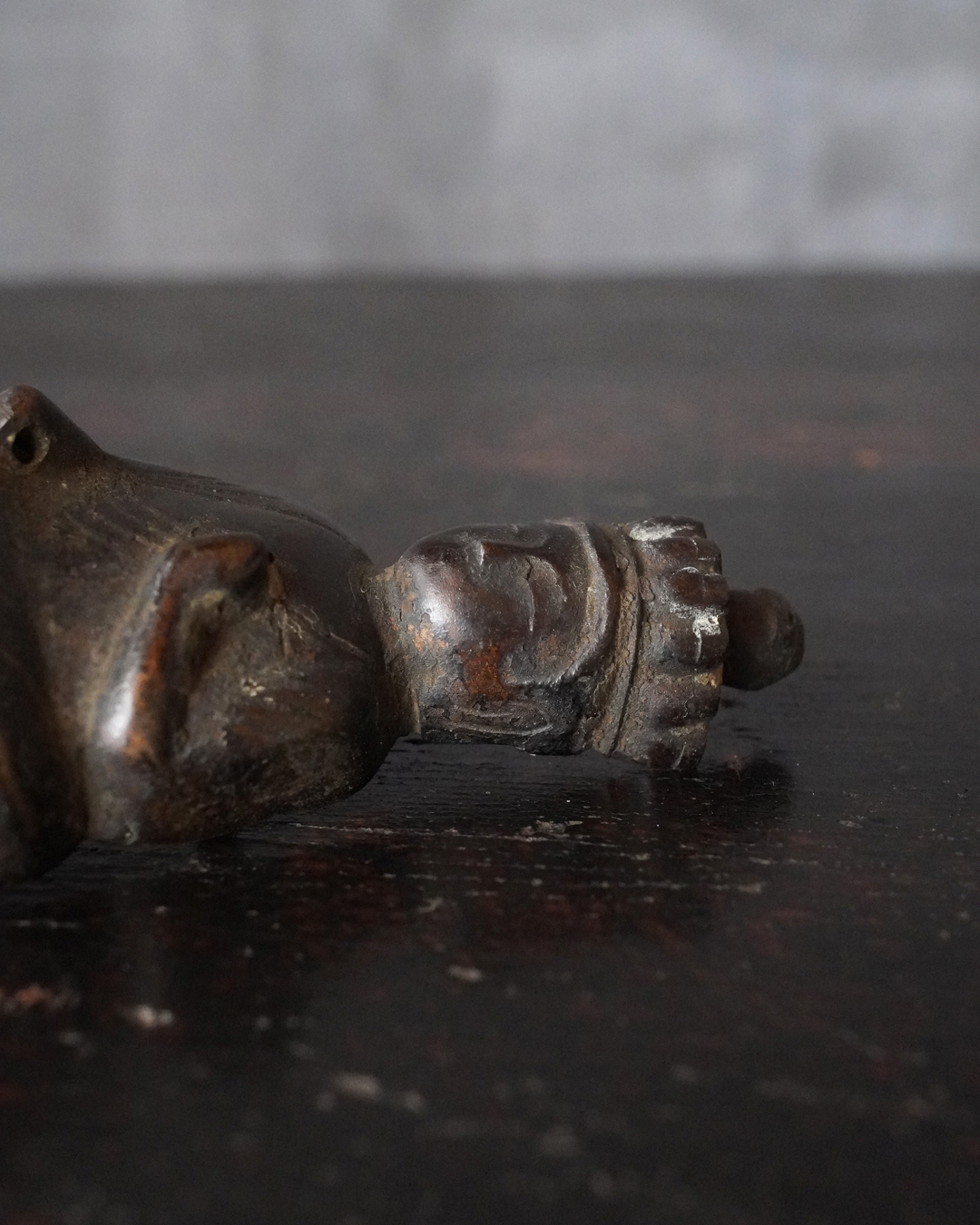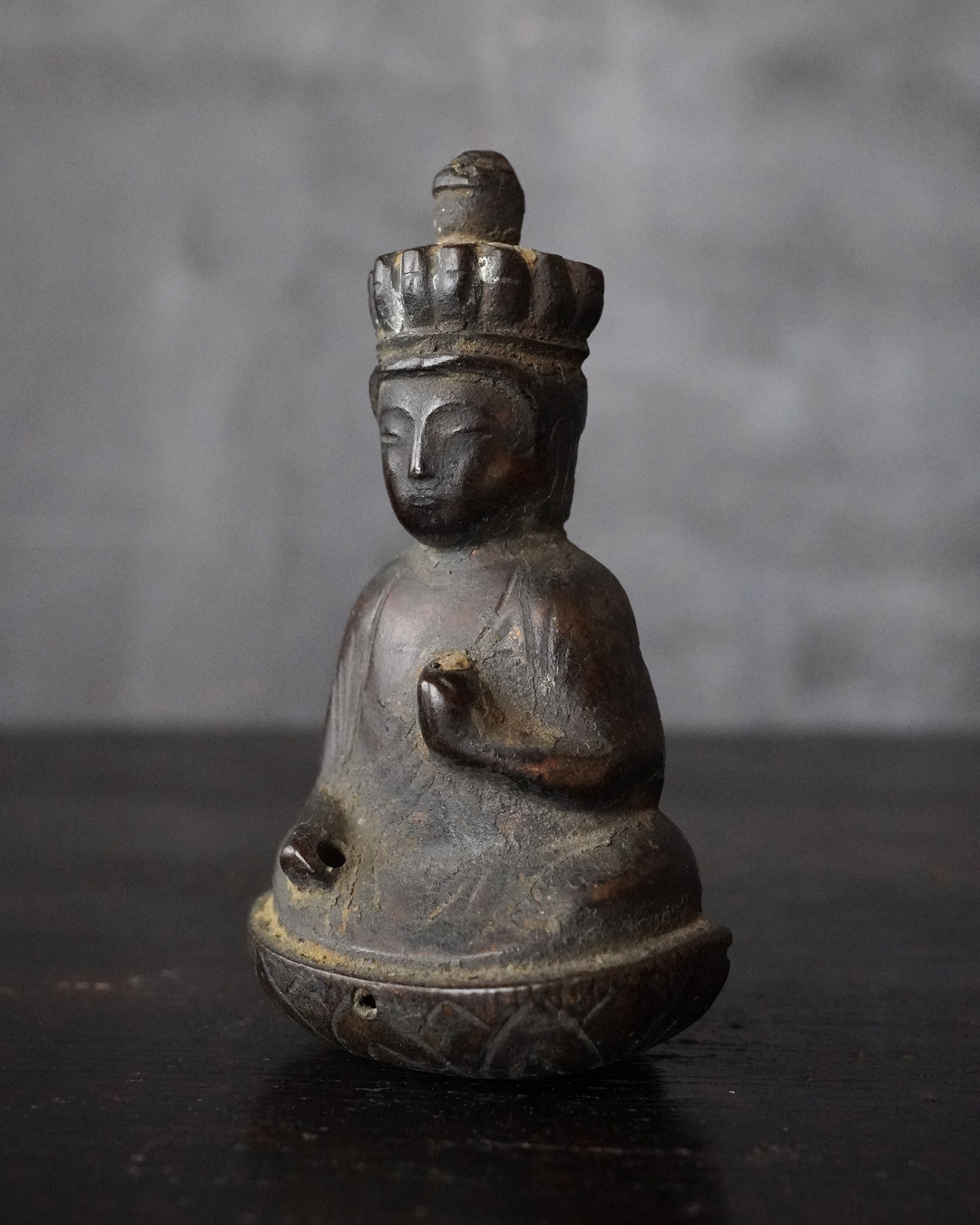 愛くるしい姿の十一面観音掛仏。優しいお顔と姿は側に置いても長年愛玩できる像容ではないでしょうか。時代を経て黒く深い味わいになっておりますが、品格を感じるのは、その煤けた下に鍍金が残っているからでしょう。当時は鍍金の圧着にばらつきがあり経年とともに剥がれ落ちるものが多く、鍍金が多く残っているのもの懸仏に関わらず希少。古材に取り付けておりますが、唐木などで台座などを誂えても良いでしょう。持物、盤などはございませんが、状態は良好。鎌倉時代。