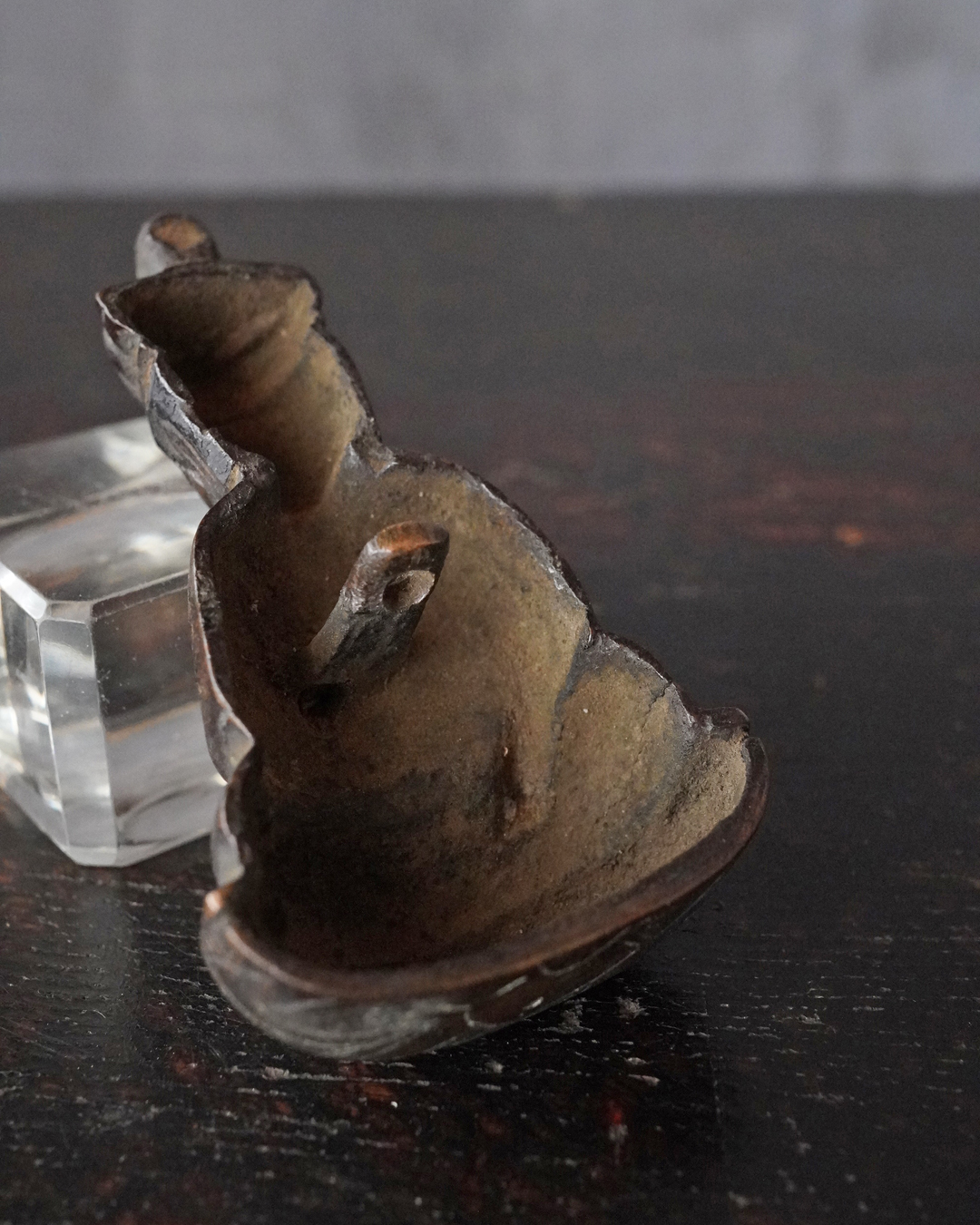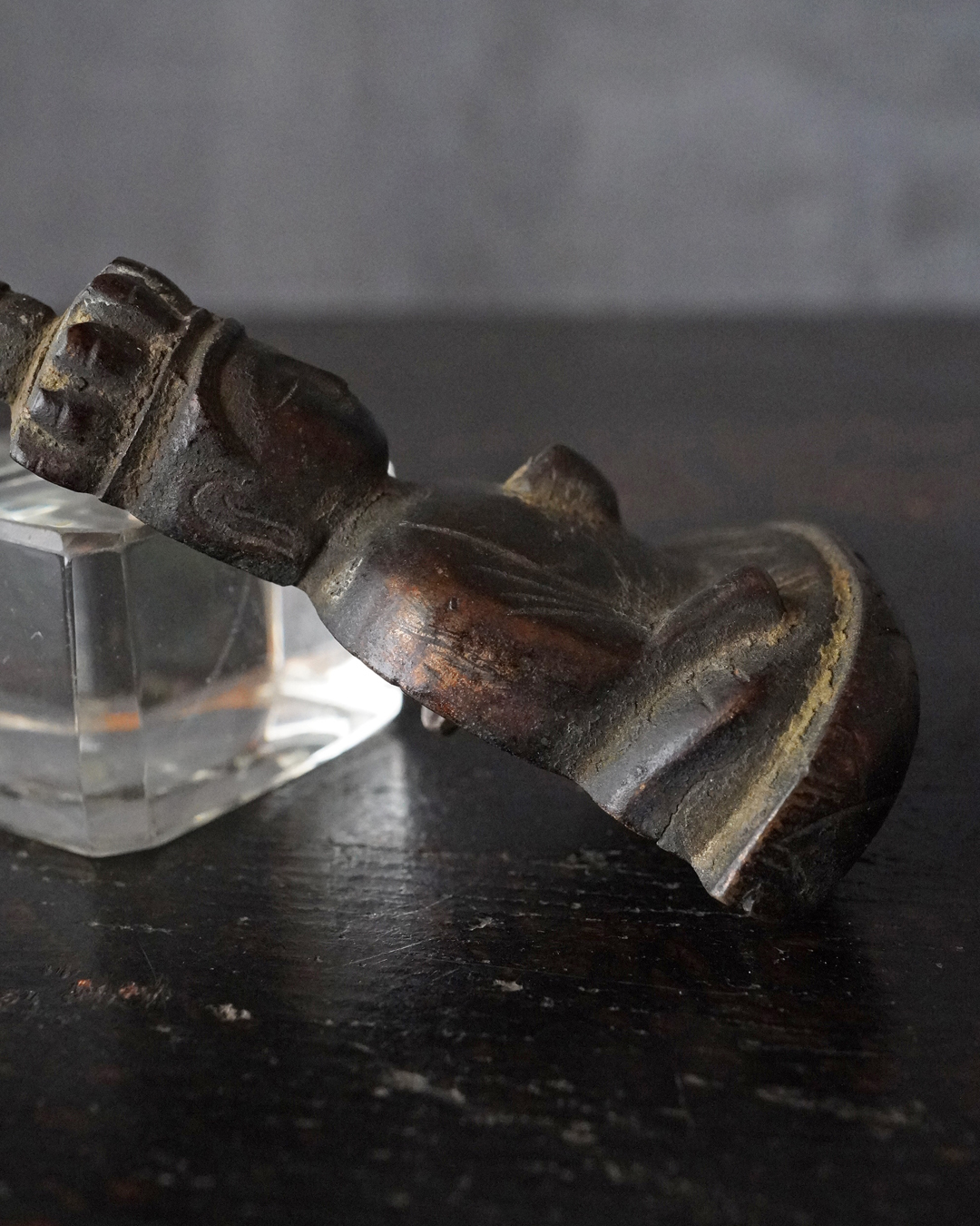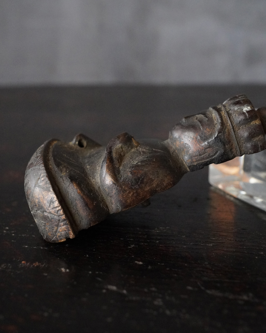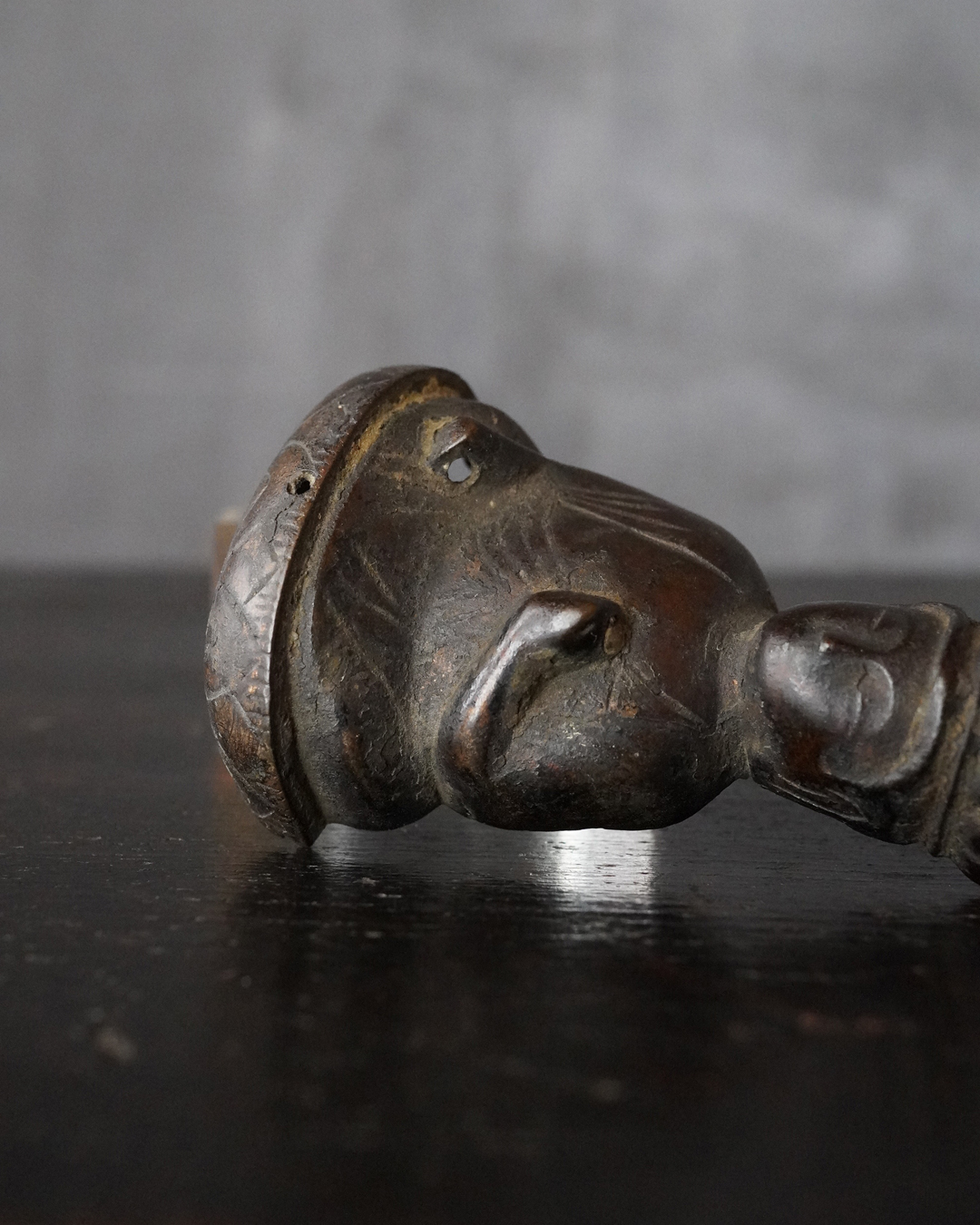 愛くるしい姿の十一面観音掛仏。優しいお顔と姿は側に置いても長年愛玩できる像容ではないでしょうか。時代を経て黒く深い味わいになっておりますが、品格を感じるのは、その煤けた下に鍍金が残っているからでしょう。当時は鍍金の圧着にばらつきがあり経年とともに剥がれ落ちるものが多く、鍍金が多く残っているのもの懸仏に関わらず希少。古材に取り付けておりますが、唐木などで台座などを誂えても良いでしょう。持物、盤などはございませんが、状態は良好。鎌倉時代。