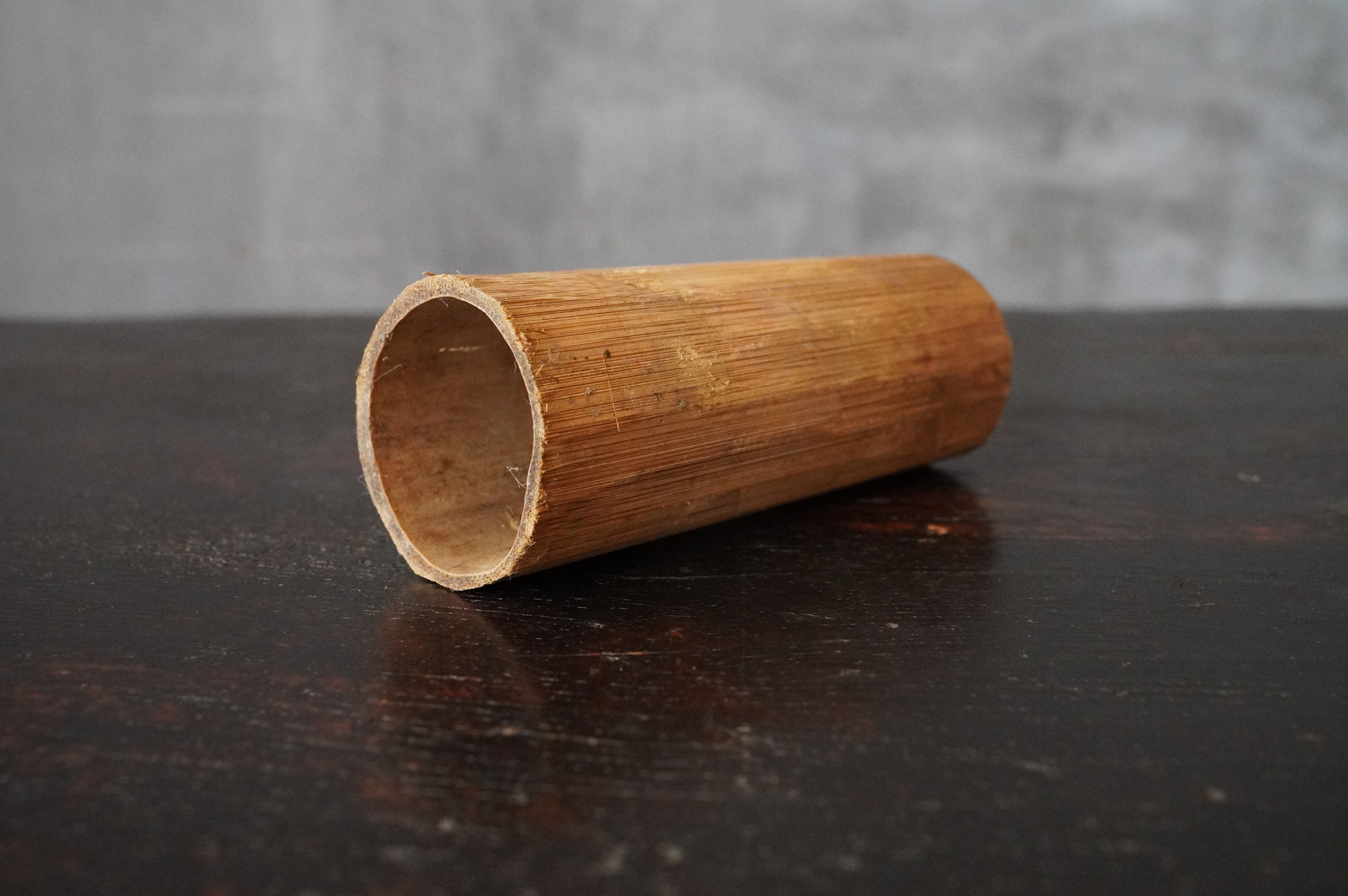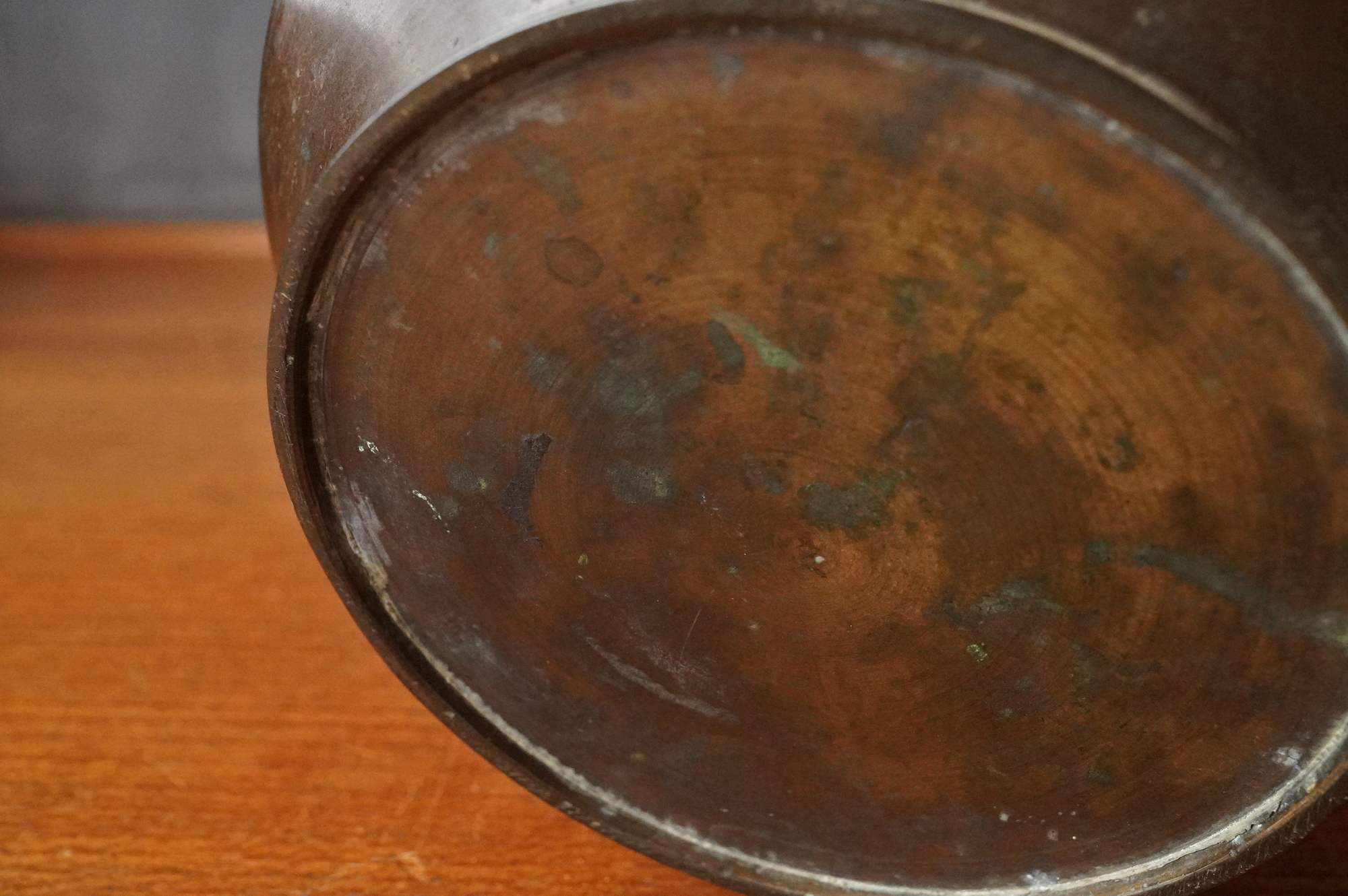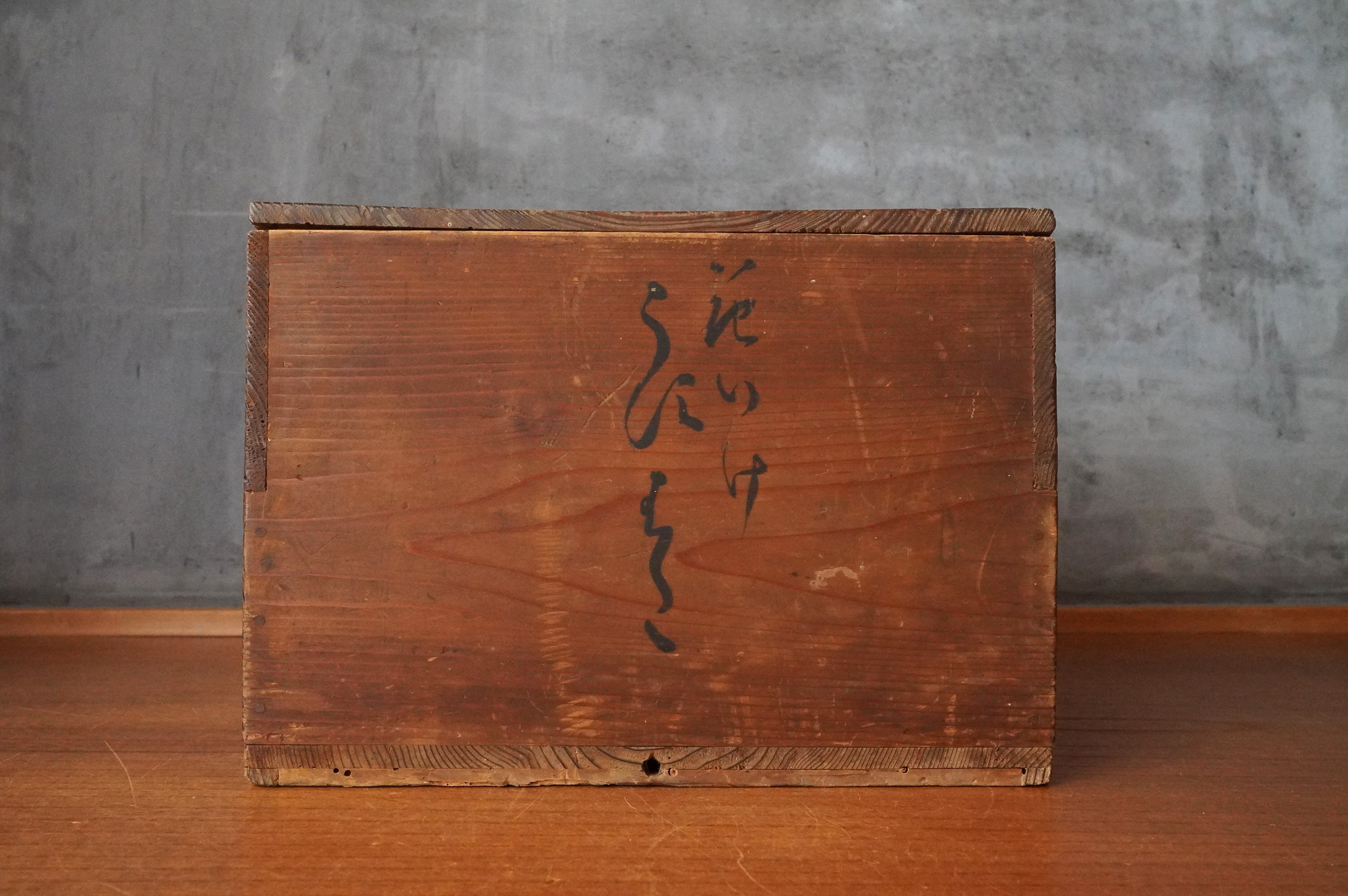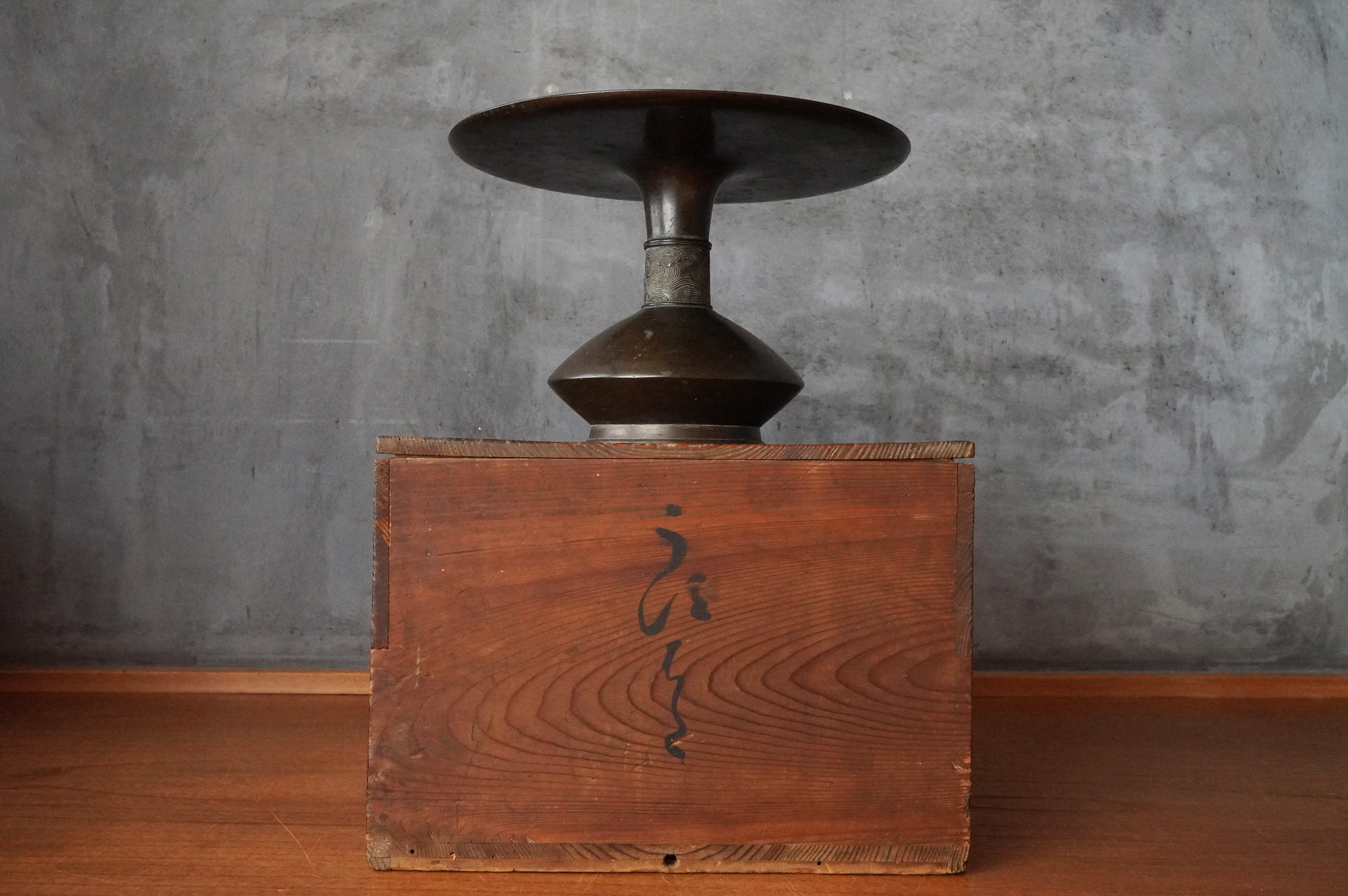 このタイプは常に探しておりますが、市場に出る数は少なく、貴重な一品。縁いっぱいまで水を張って花をいけると、他の花器にはない独特の緊張感が生まれ、私自身も最も好む花器のひとつです。寸法も扱いやすく、時代相応の経年変化こそございますが、大きな傷みはなく、水漏れもない良好な状態です。箱付き(当時の箱ですが、紐を通す仕様ではないため、養生箱とお考えください)。江戸時代。
