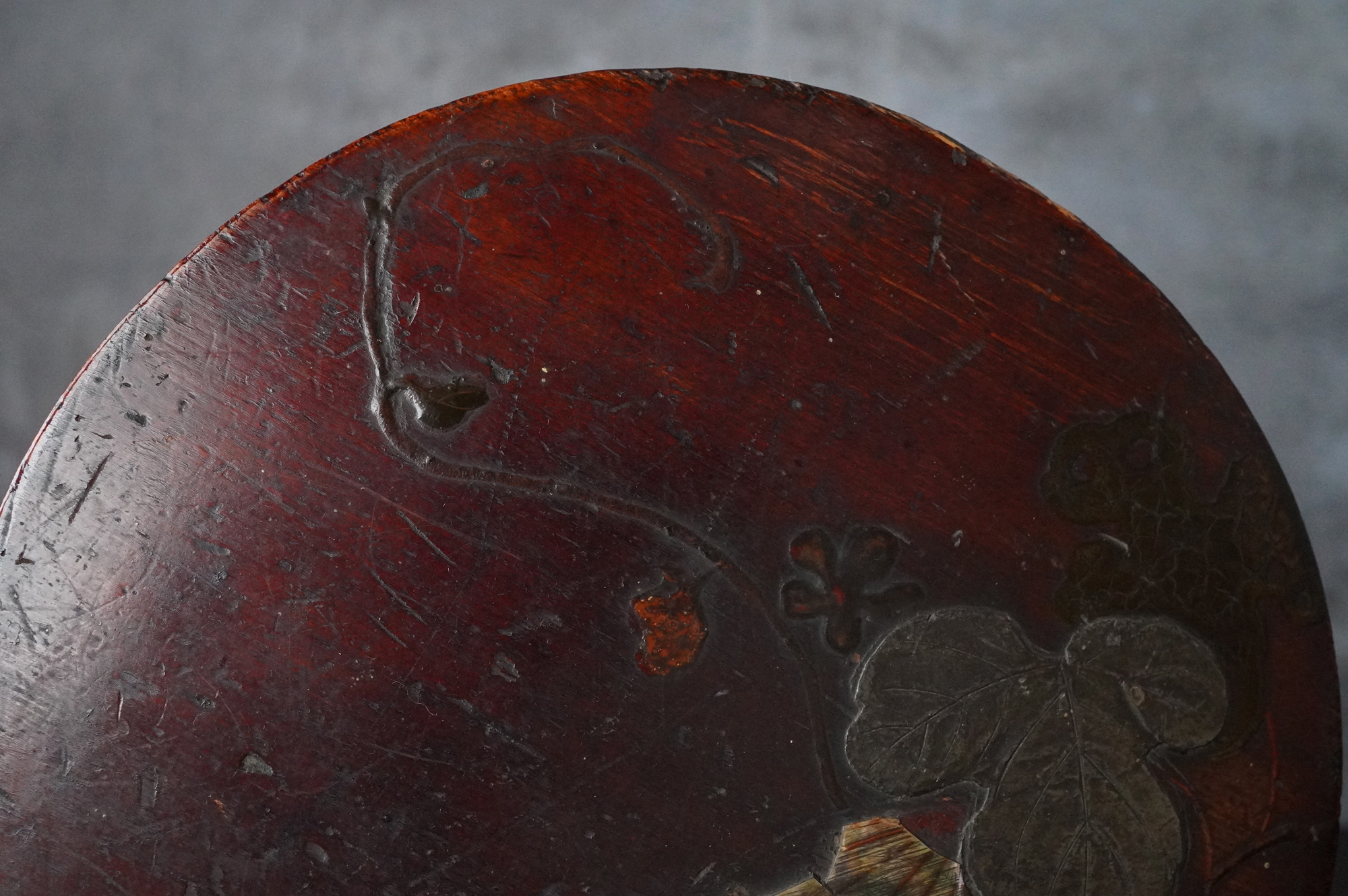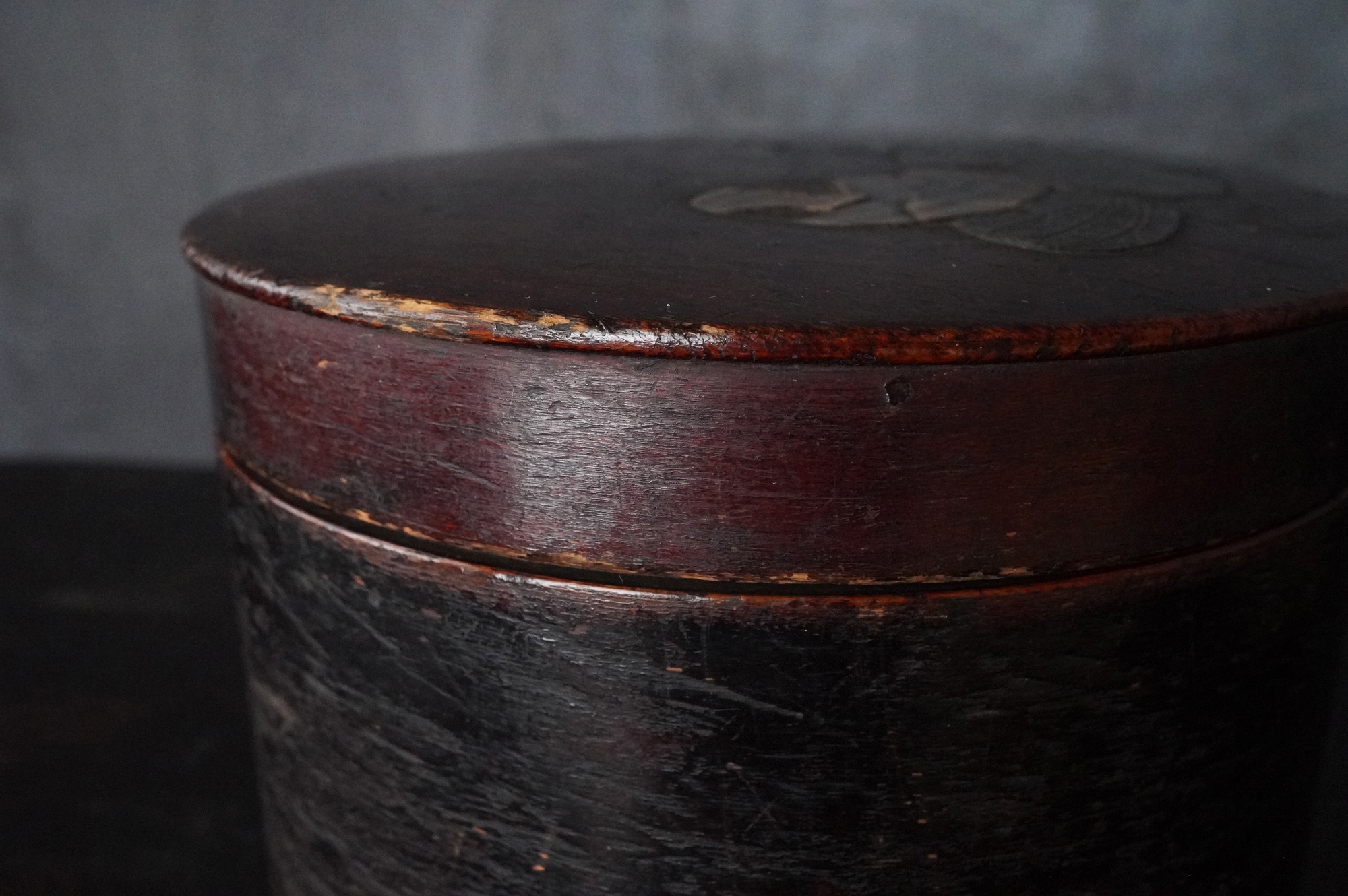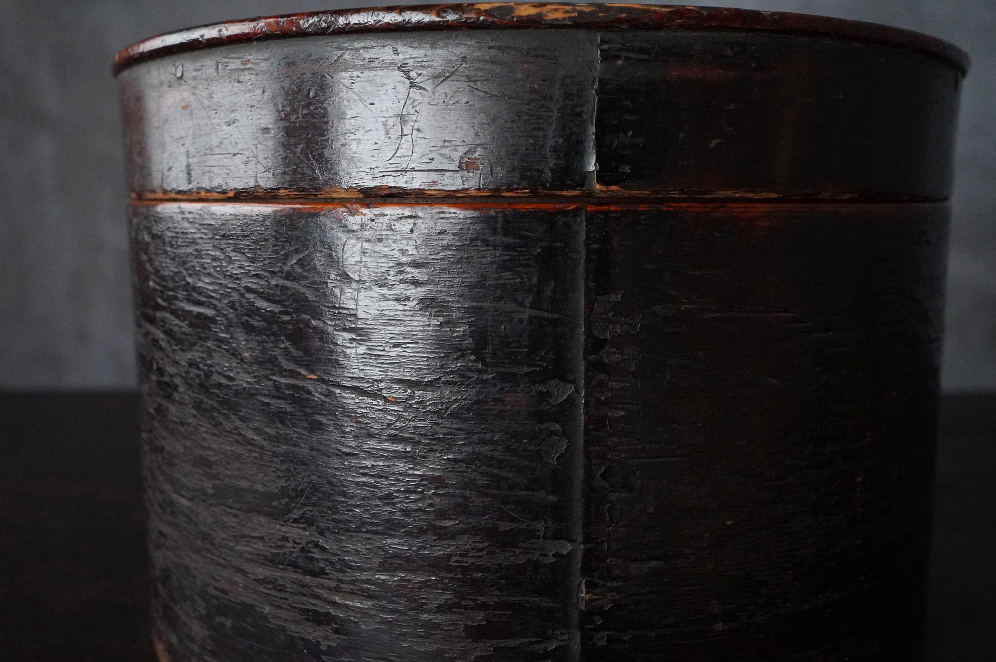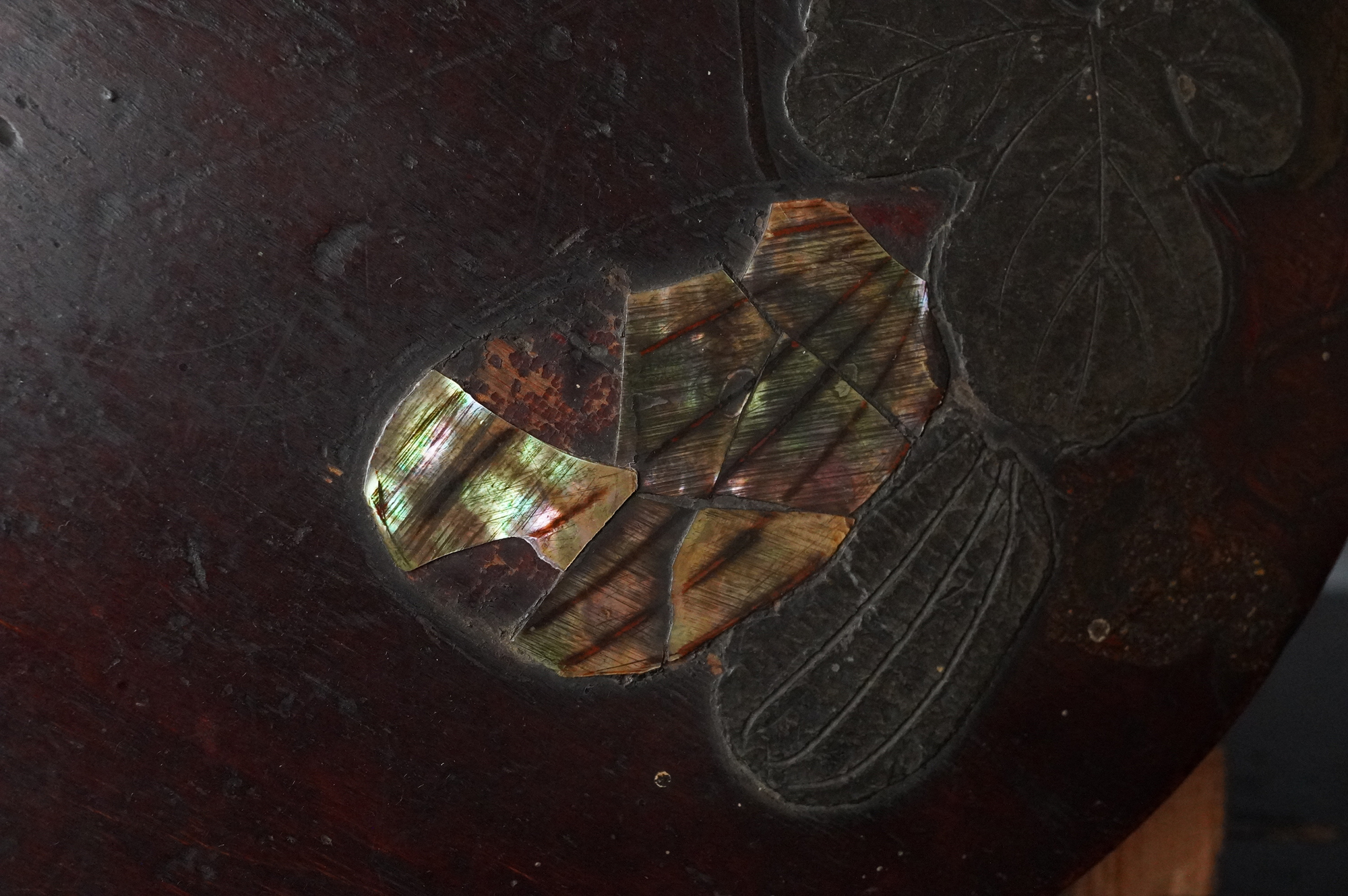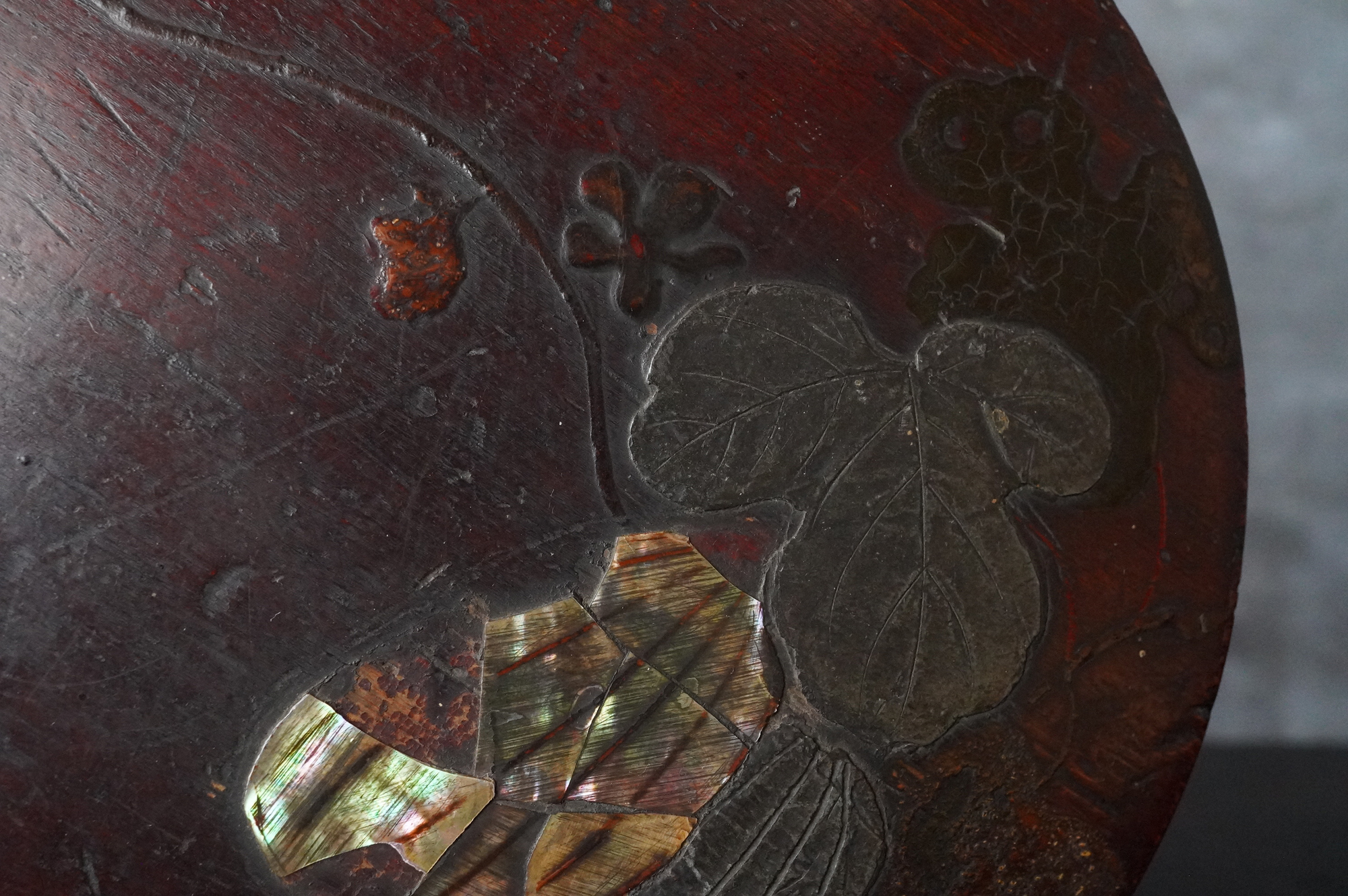蒔絵、青貝が施された味の良い曲げわっぱに、前所有者が網袋まで誂えております。素朴なものでありますが、非常に品の良いものです。茶碗を入れる箱などコレクションを収納しても良いですし、箱、誂えも含め、そのままでも魅力あるものです。青貝の剥がれ、使用感、網袋のほつれが少々など時代相応の経年変化はございますが、状態は概ね良好、問題なくお使いいただけます。江戸時代。*網袋は昭和に新調されたものでしょう。