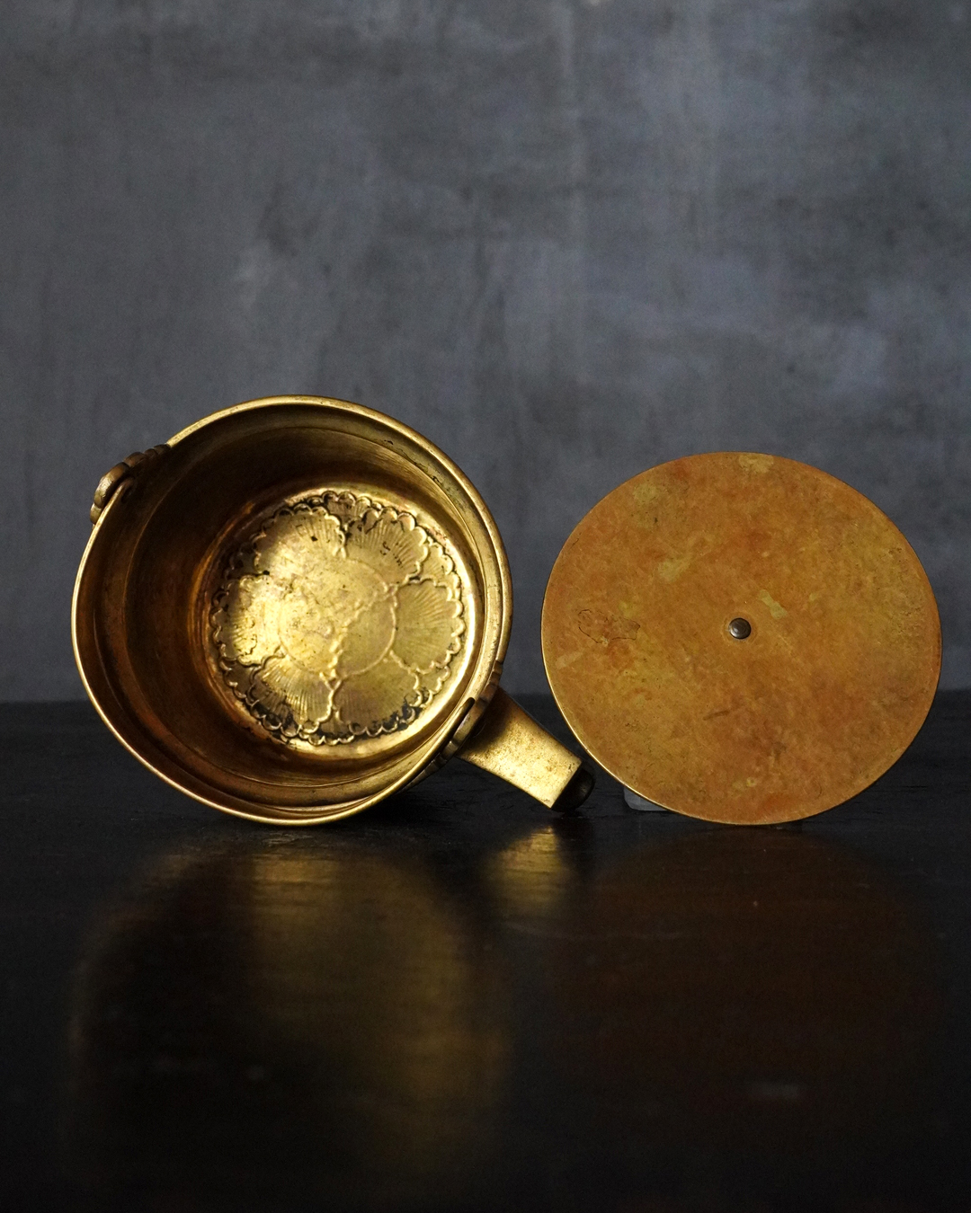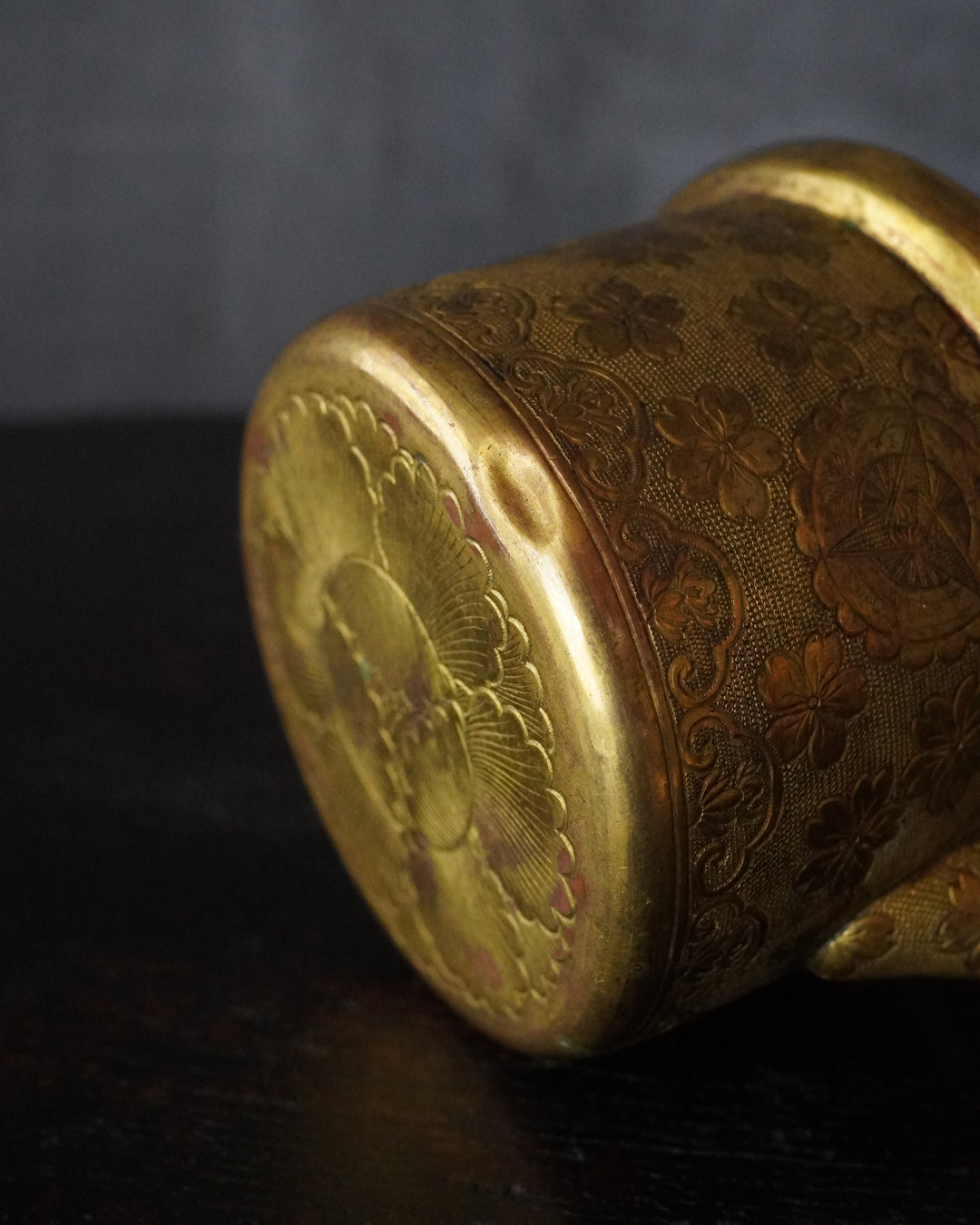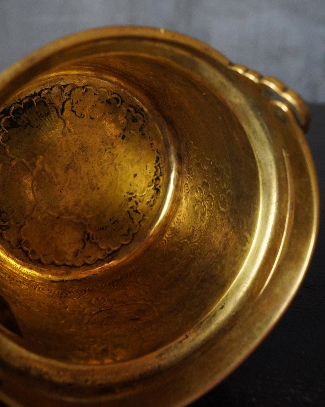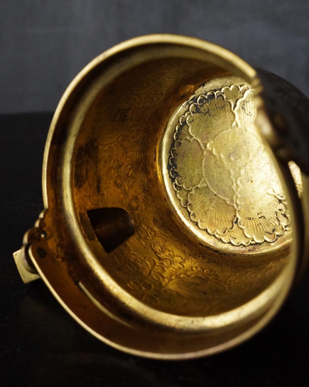 金銅製の鉄漿沸(かねわかし)。お歯黒の際に使う化粧道具の一つ。全体に魚子地、蹴彫りが施されたもので厚みのある銅に鍍金を施されており高い身分の婚礼道具だったものでしょう。少しの汚れ、鍍金の擦れ、使用感はございますが状態はかなり良いです。江戸時代。
