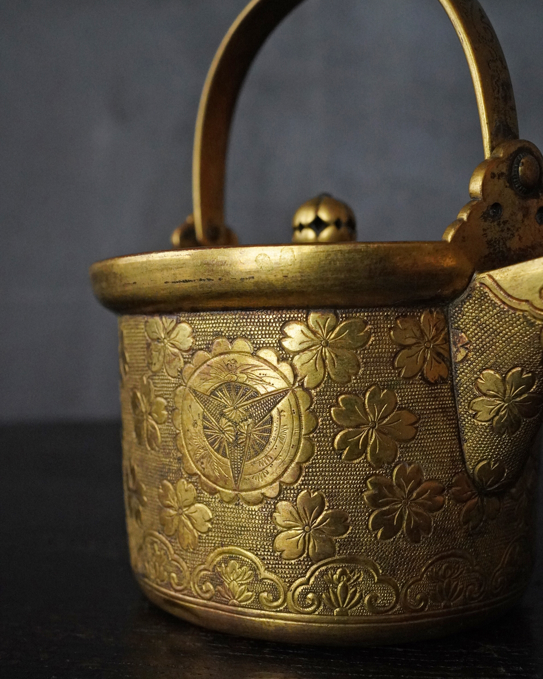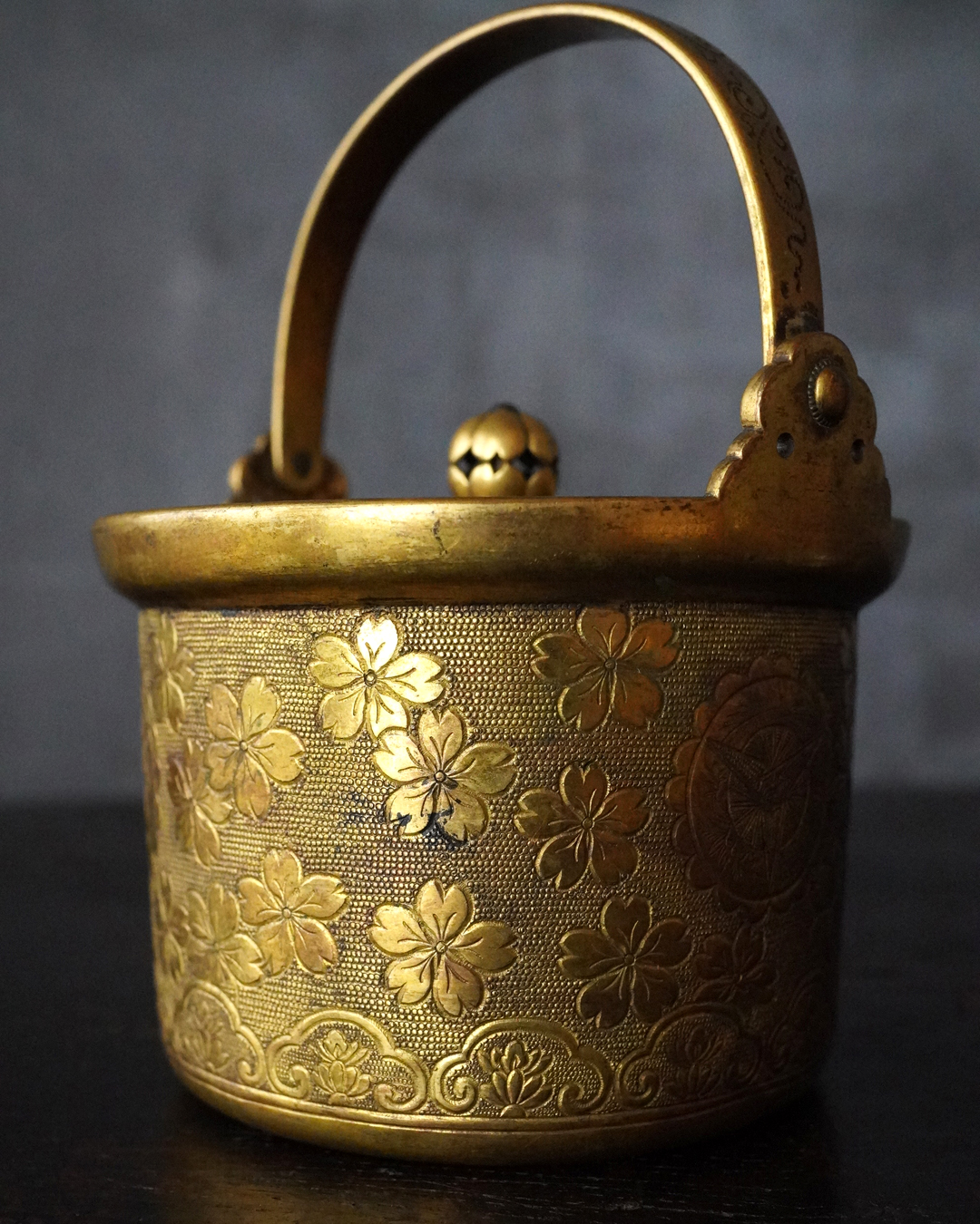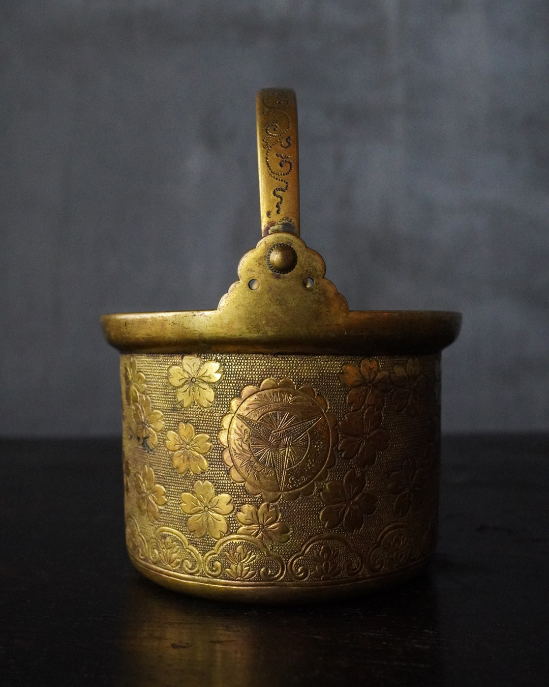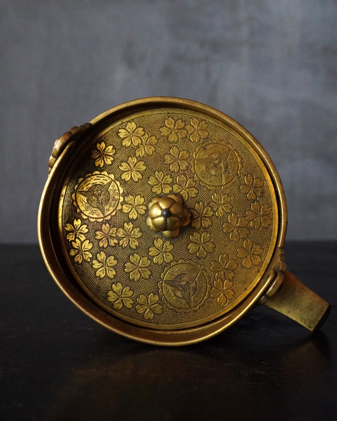 金銅製の鉄漿沸(かねわかし)。お歯黒の際に使う化粧道具の一つ。全体に魚子地、蹴彫りが施されたもので厚みのある銅に鍍金を施されており高い身分の婚礼道具だったものでしょう。少しの汚れ、鍍金の擦れ、使用感はございますが状態はかなり良いです。江戸時代。