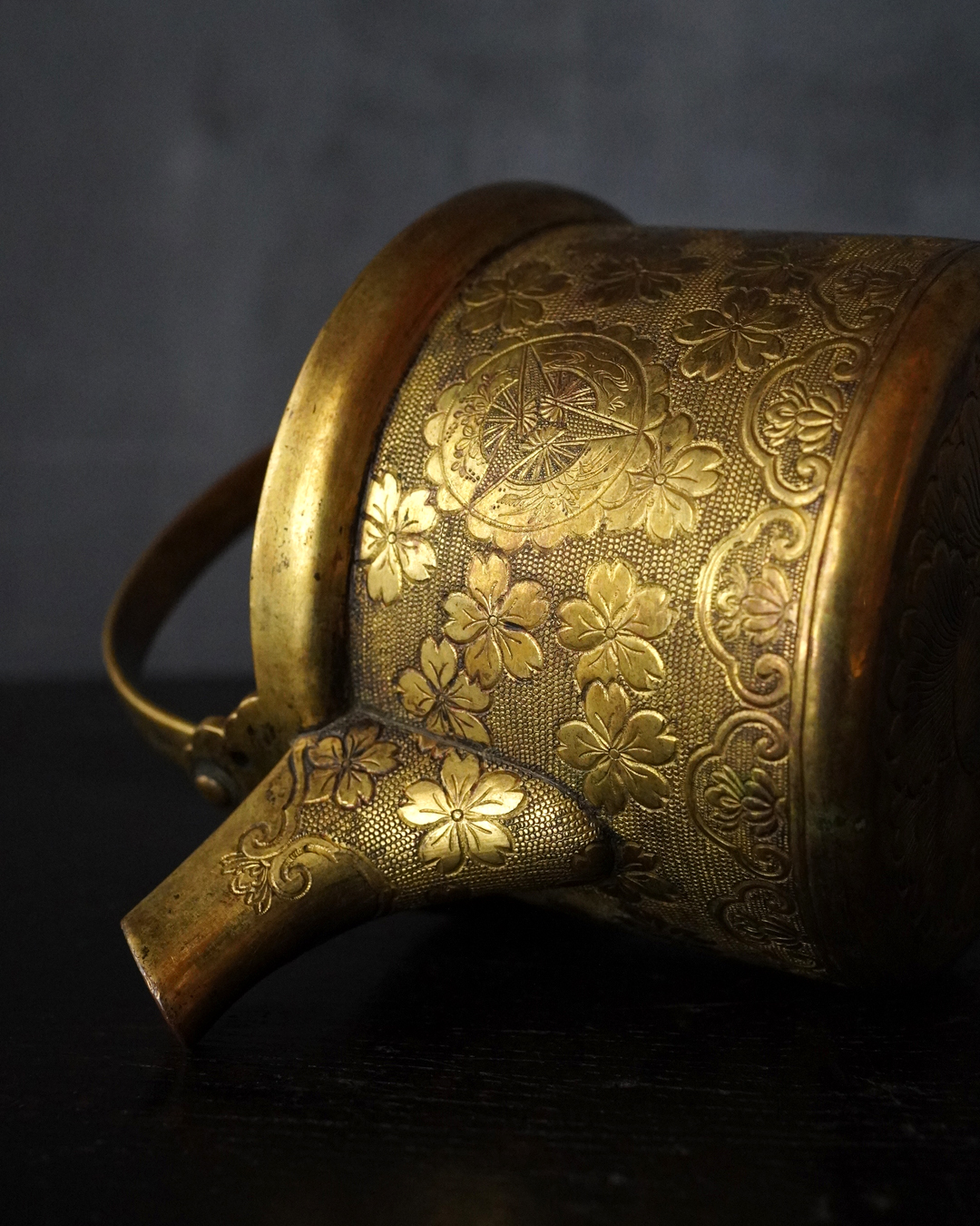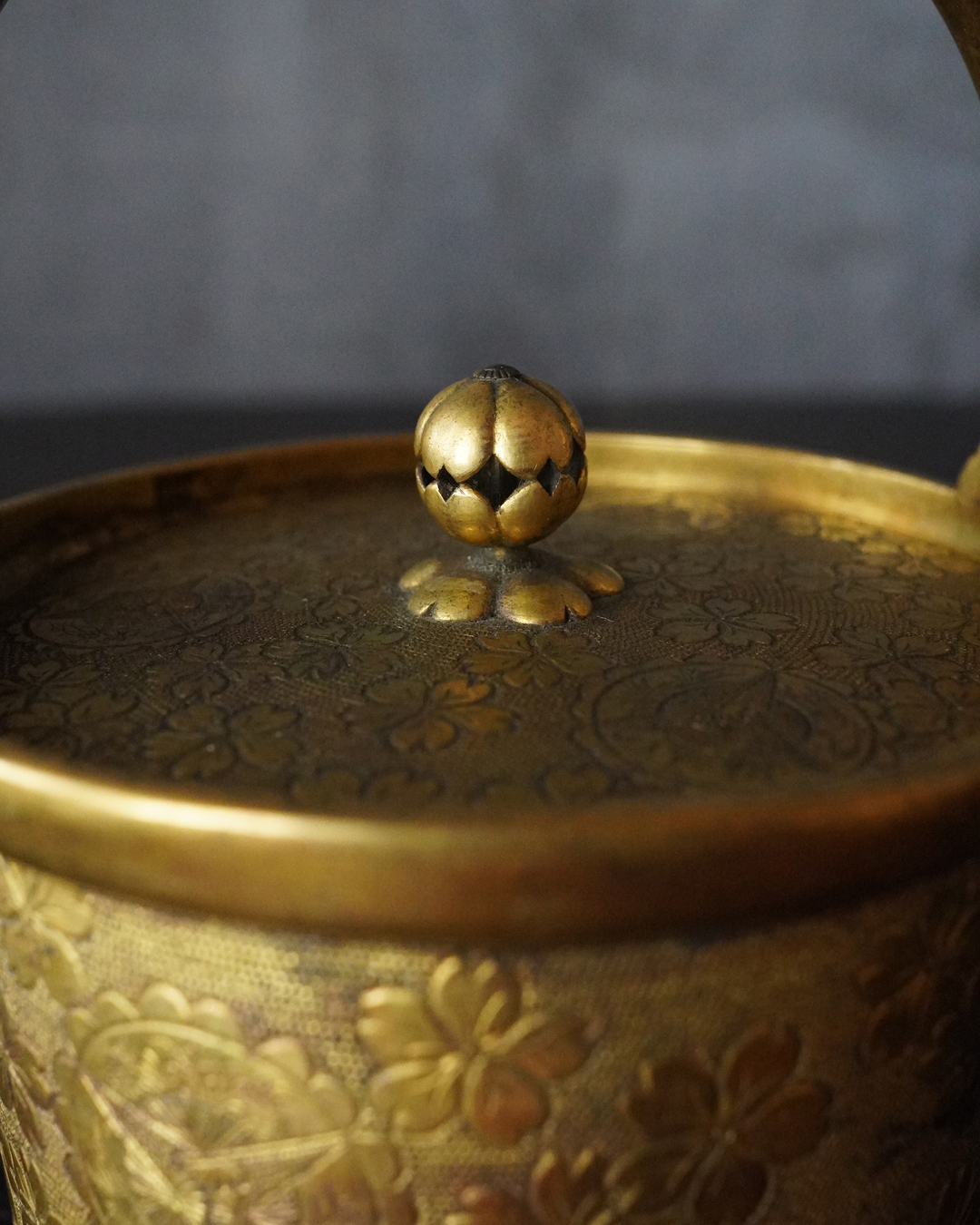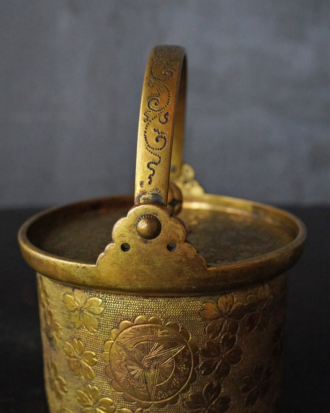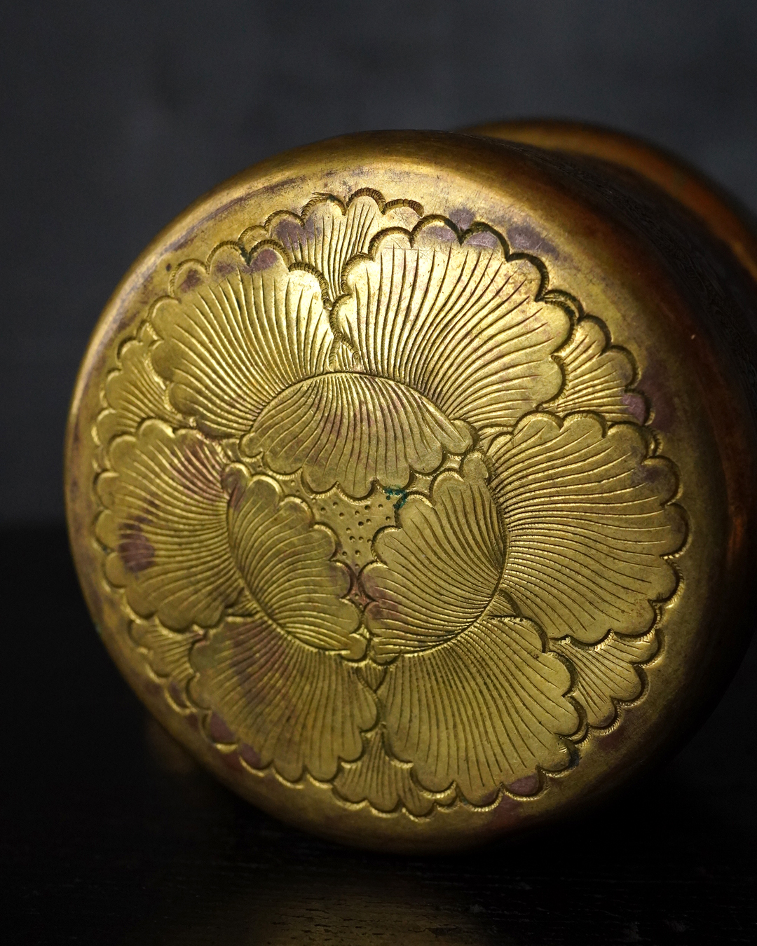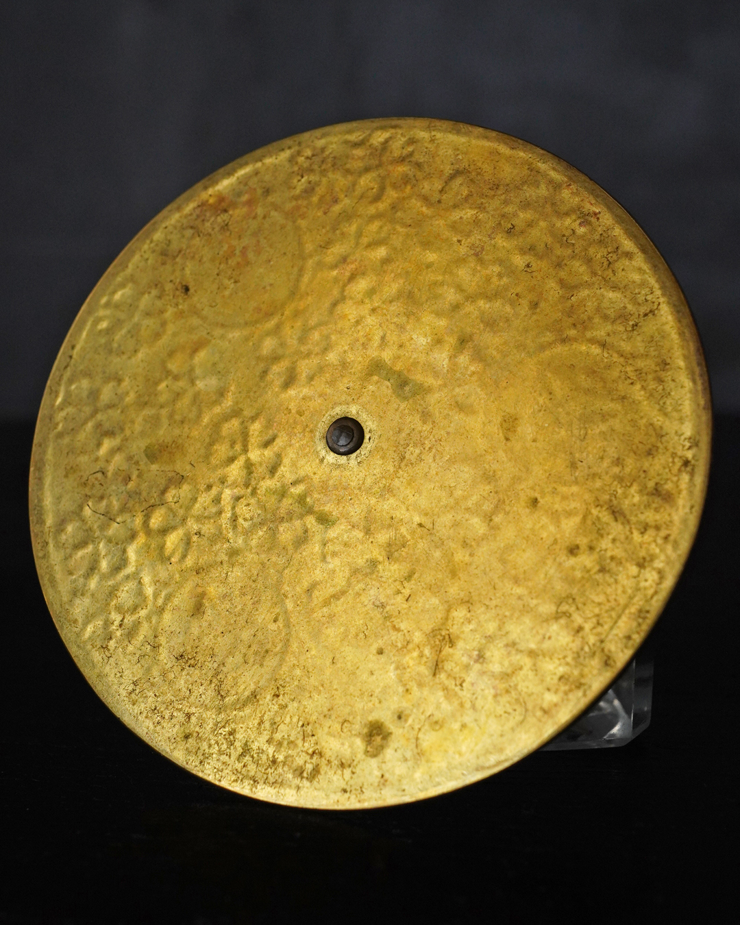 金銅製の鉄漿沸(かねわかし)。お歯黒の際に使う化粧道具の一つ。全体に魚子地、蹴彫りが施されたもので厚みのある銅に鍍金を施されており高い身分の婚礼道具だったものでしょう。少しの汚れ、鍍金の擦れ、使用感はございますが状態はかなり良いです。江戸時代。