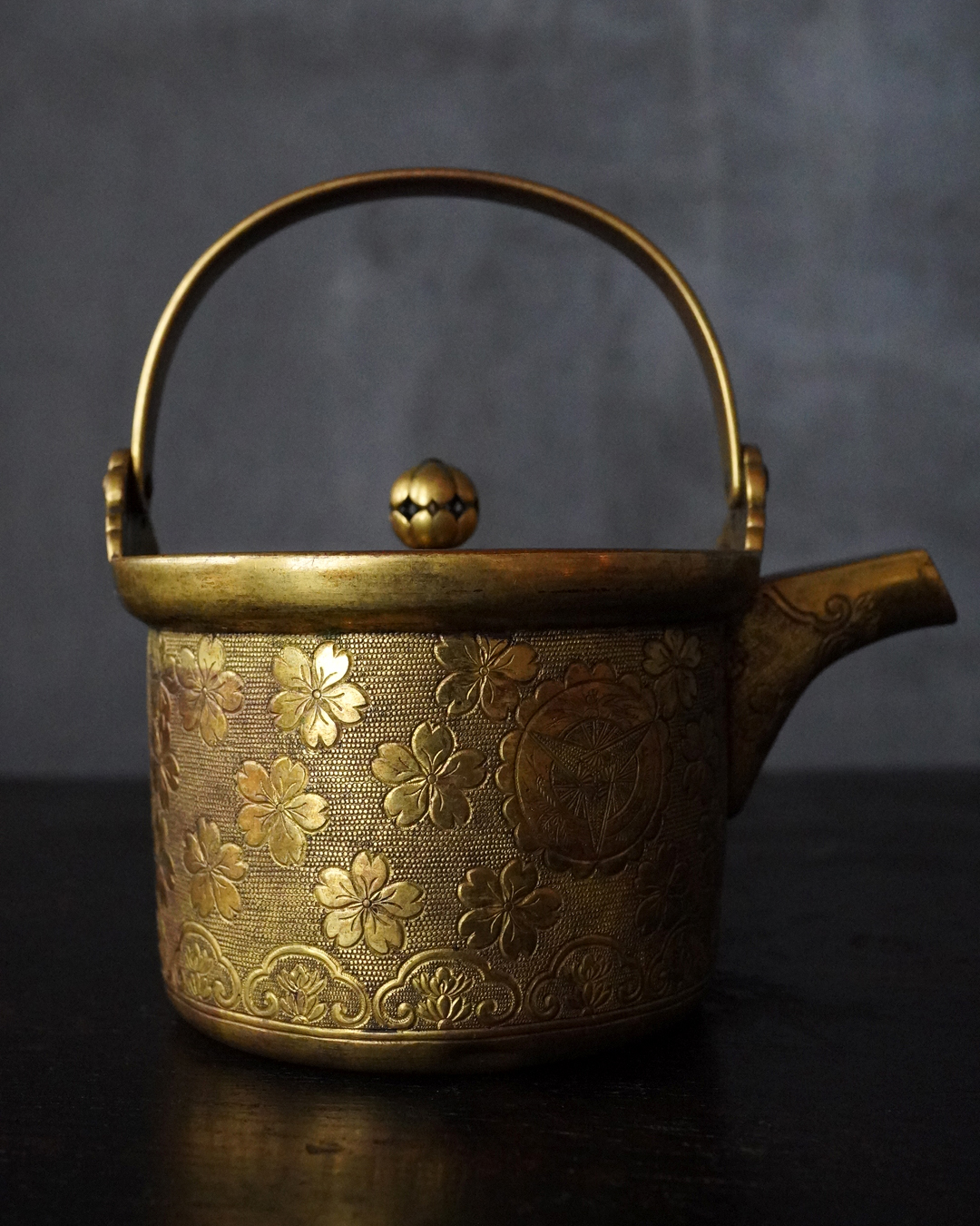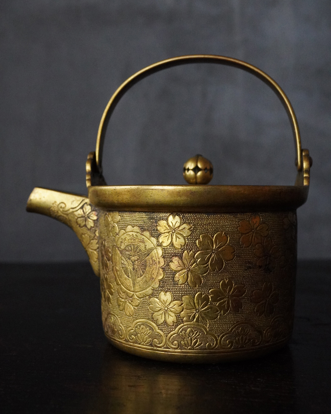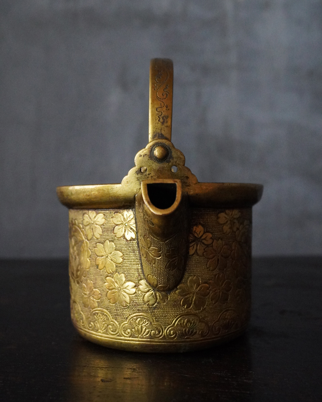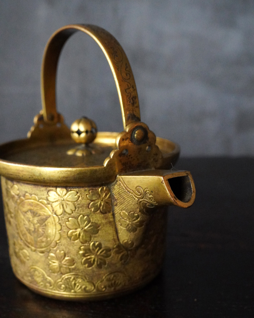 金銅製の鉄漿沸(かねわかし)。お歯黒の際に使う化粧道具の一つ。全体に魚子地、蹴彫りが施されたもので厚みのある銅に鍍金を施されており高い身分の婚礼道具だったものでしょう。少しの汚れ、鍍金の擦れ、使用感はございますが状態はかなり良いです。江戸時代。