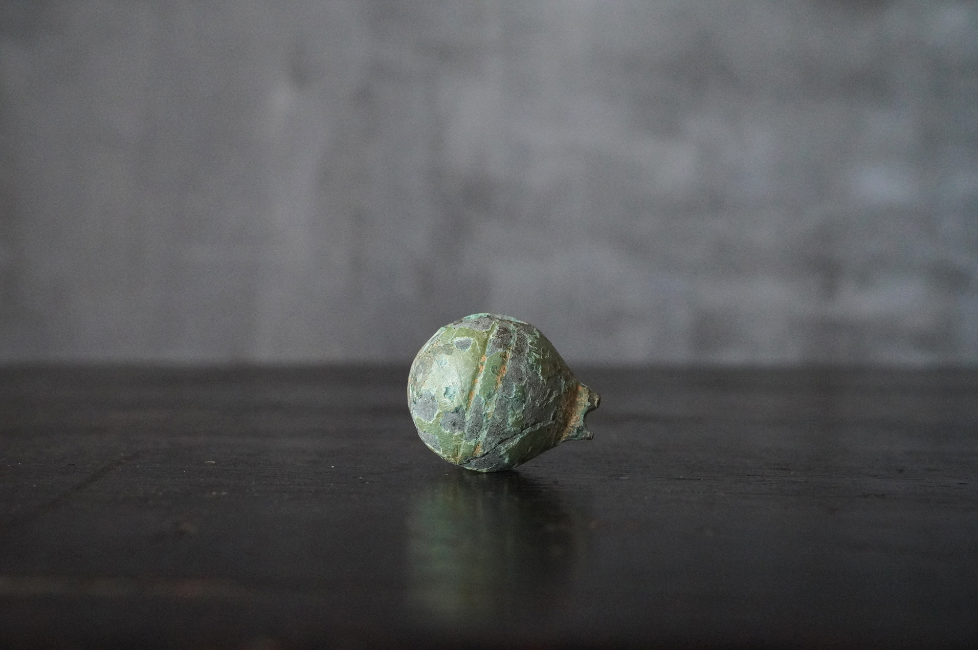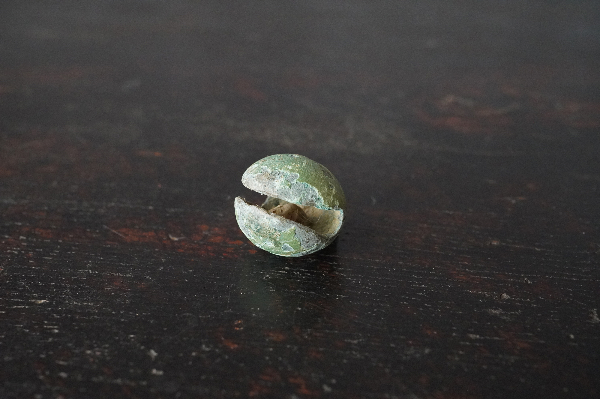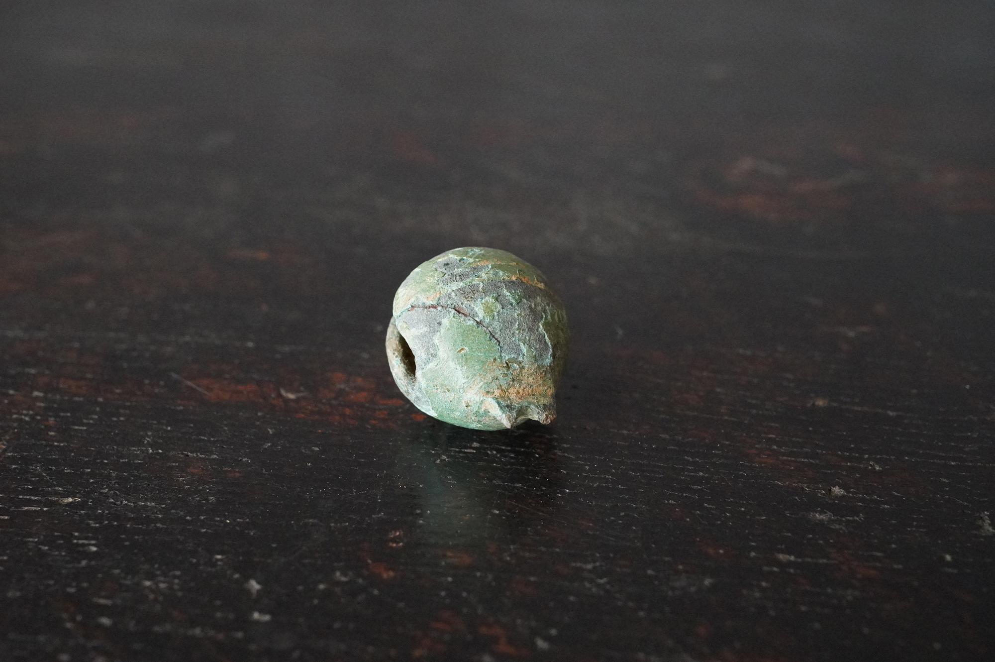 緑青に覆われた鈴は、発掘品らしい風格を備えており、5〜6世紀頃の朝鮮半島に由来するものと考えられます。内部には小石が仕込まれており、上部には一部破損が見られるものの、今なお澄んだ音色を響かせます。古代の人々が身近に用いた装身具・祭祀具の一端を直接手に取って味わえる品です。状態については画像にて十分ご確認の上、ご注文ください