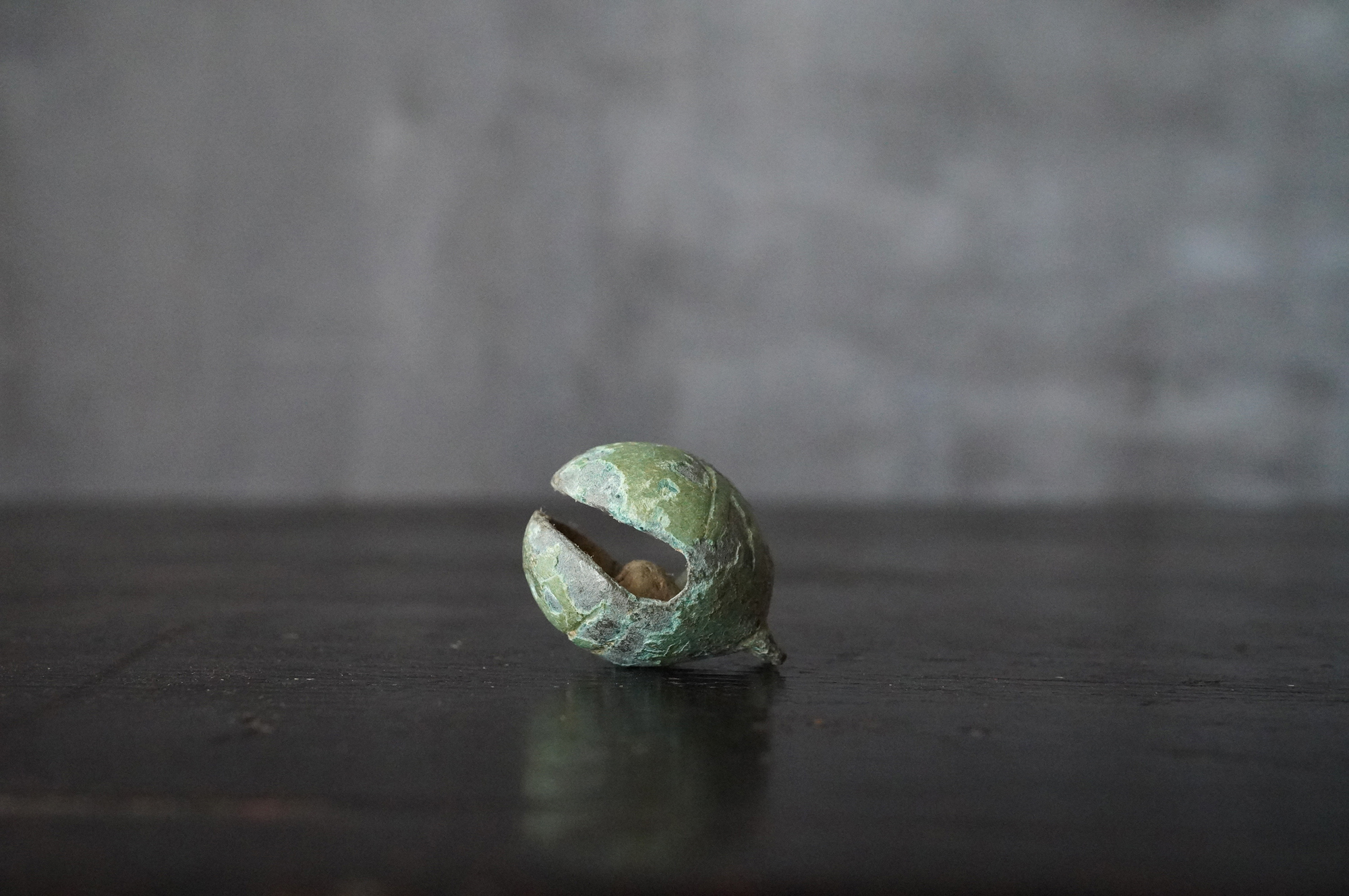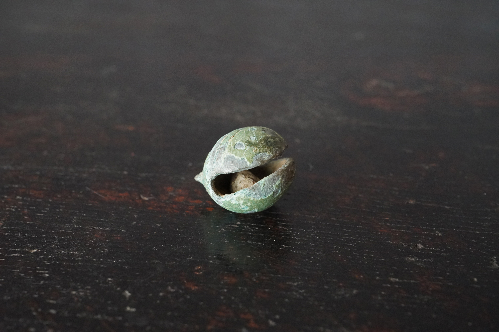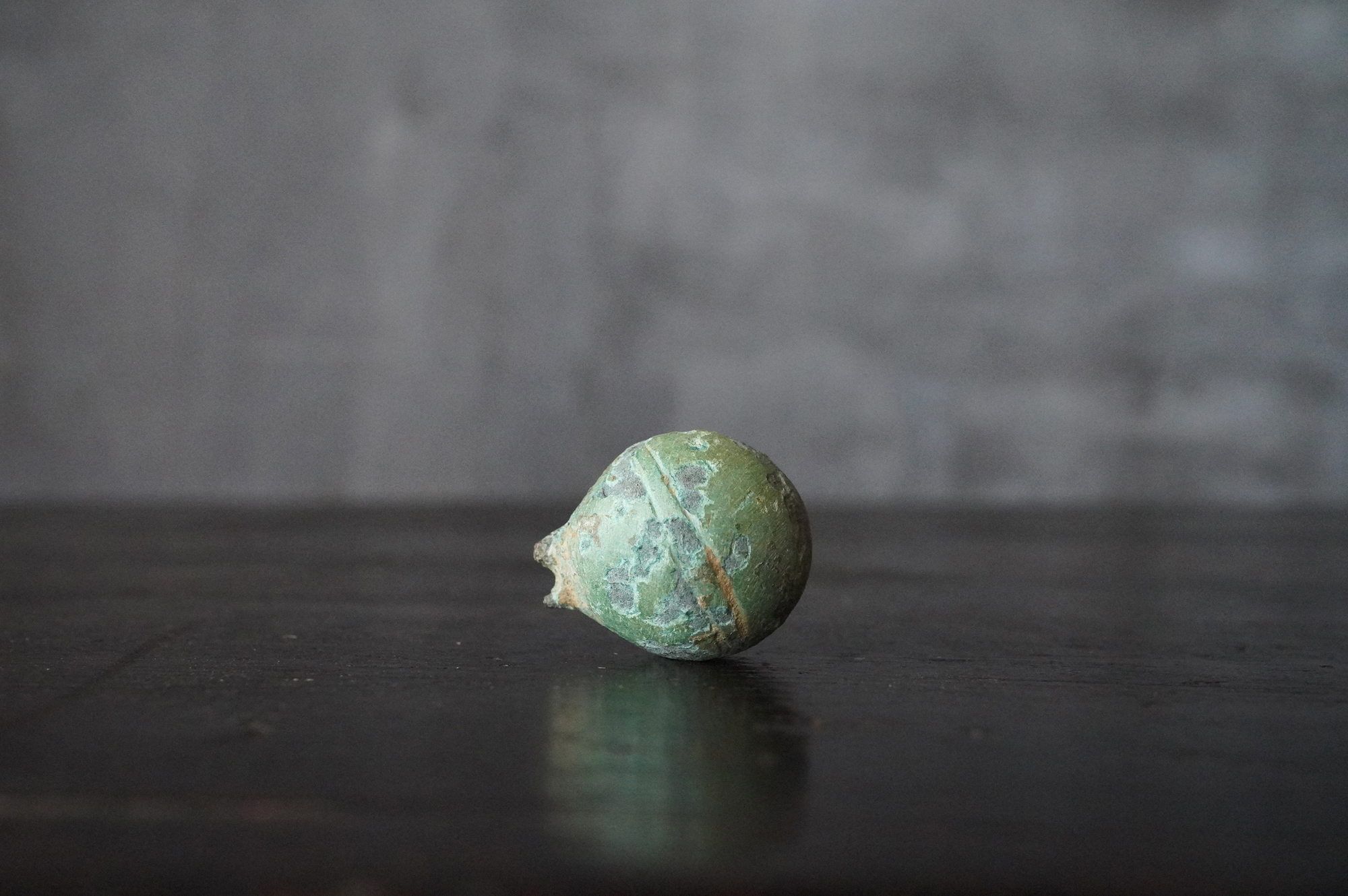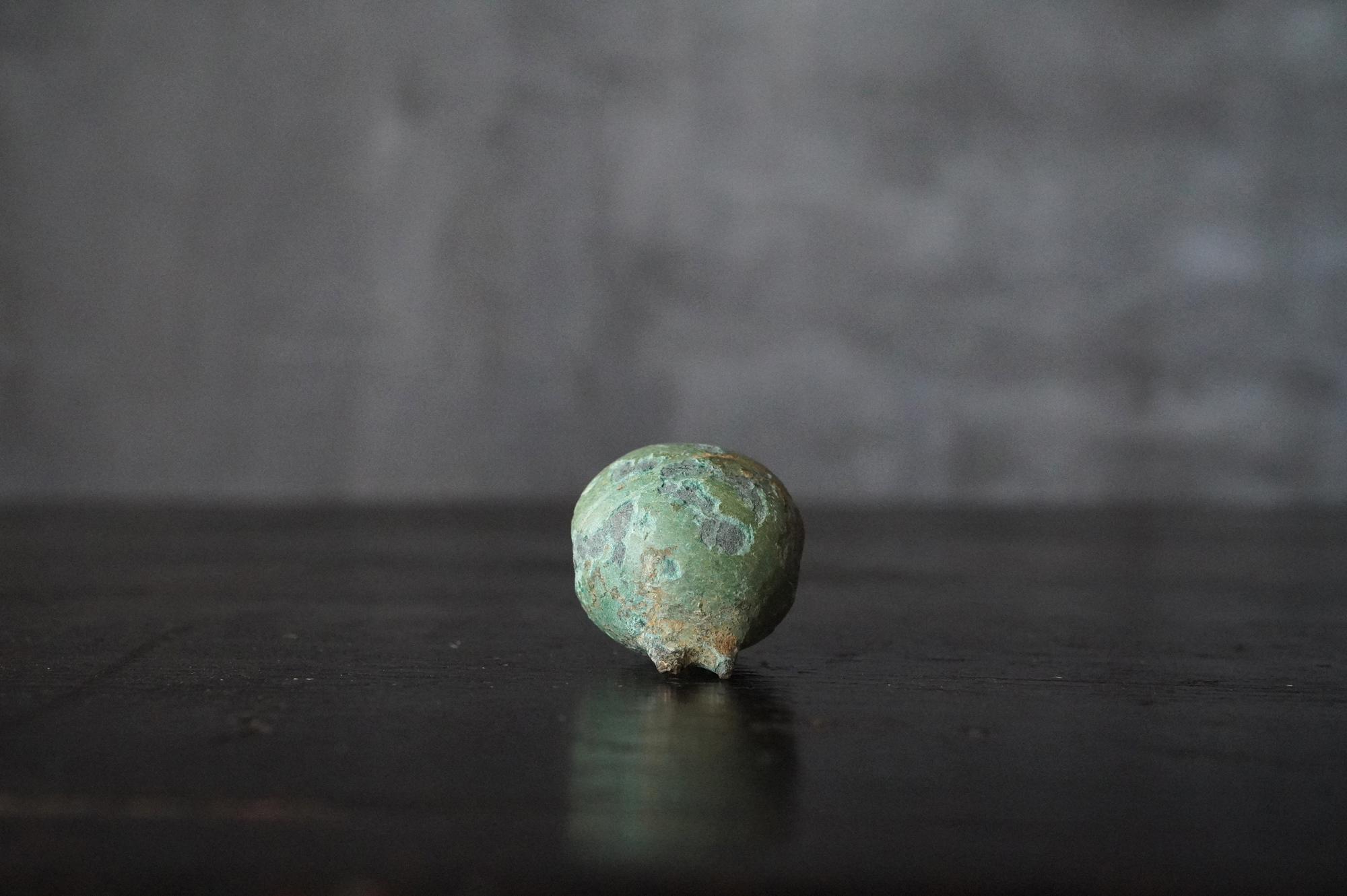 緑青に覆われた鈴は、発掘品らしい風格を備えており、5〜6世紀頃の朝鮮半島に由来するものと考えられます。内部には小石が仕込まれており、上部には一部破損が見られるものの、今なお澄んだ音色を響かせます。古代の人々が身近に用いた装身具・祭祀具の一端を直接手に取って味わえる品です。状態については画像にて十分ご確認の上、ご注文ください