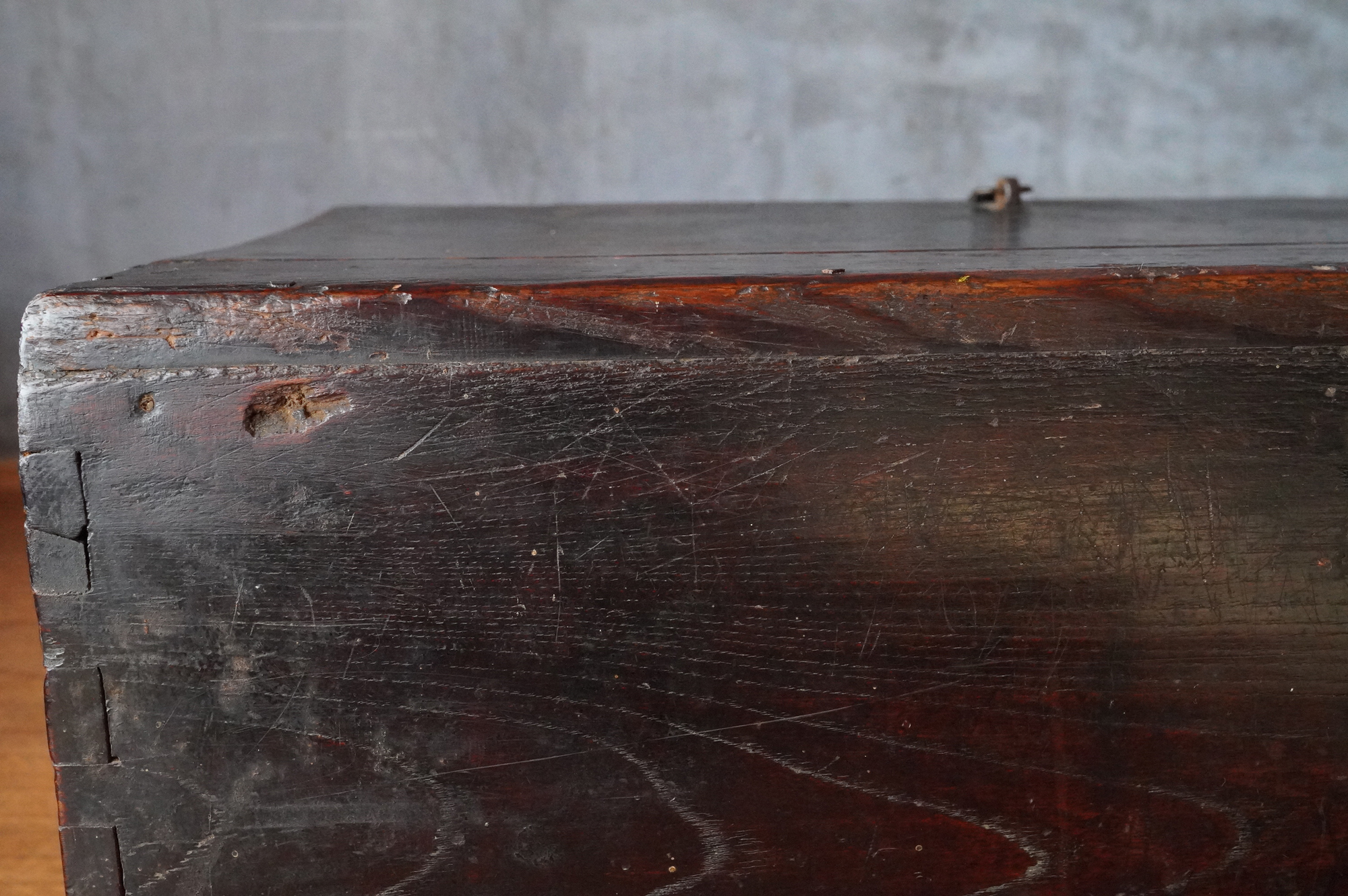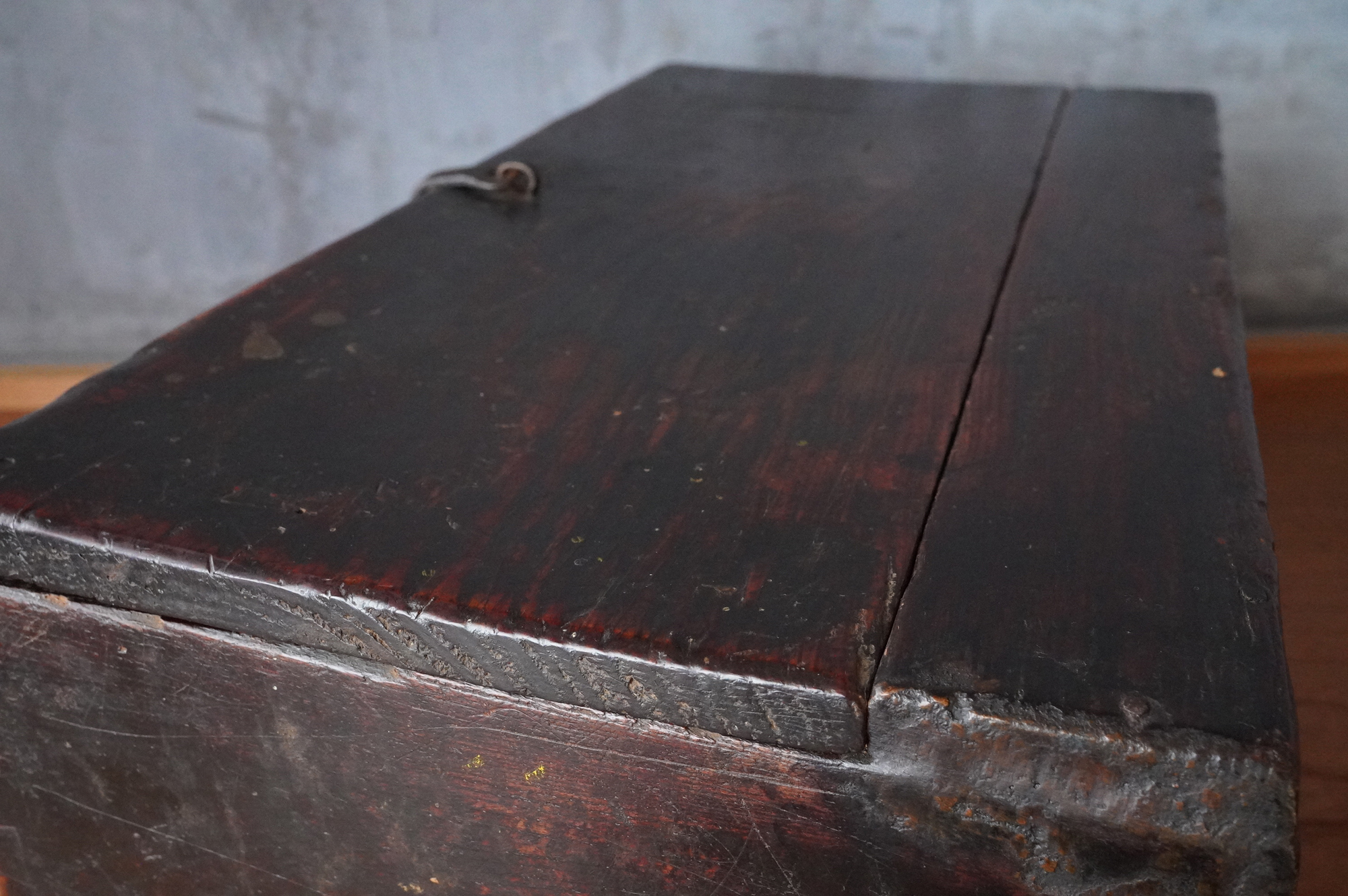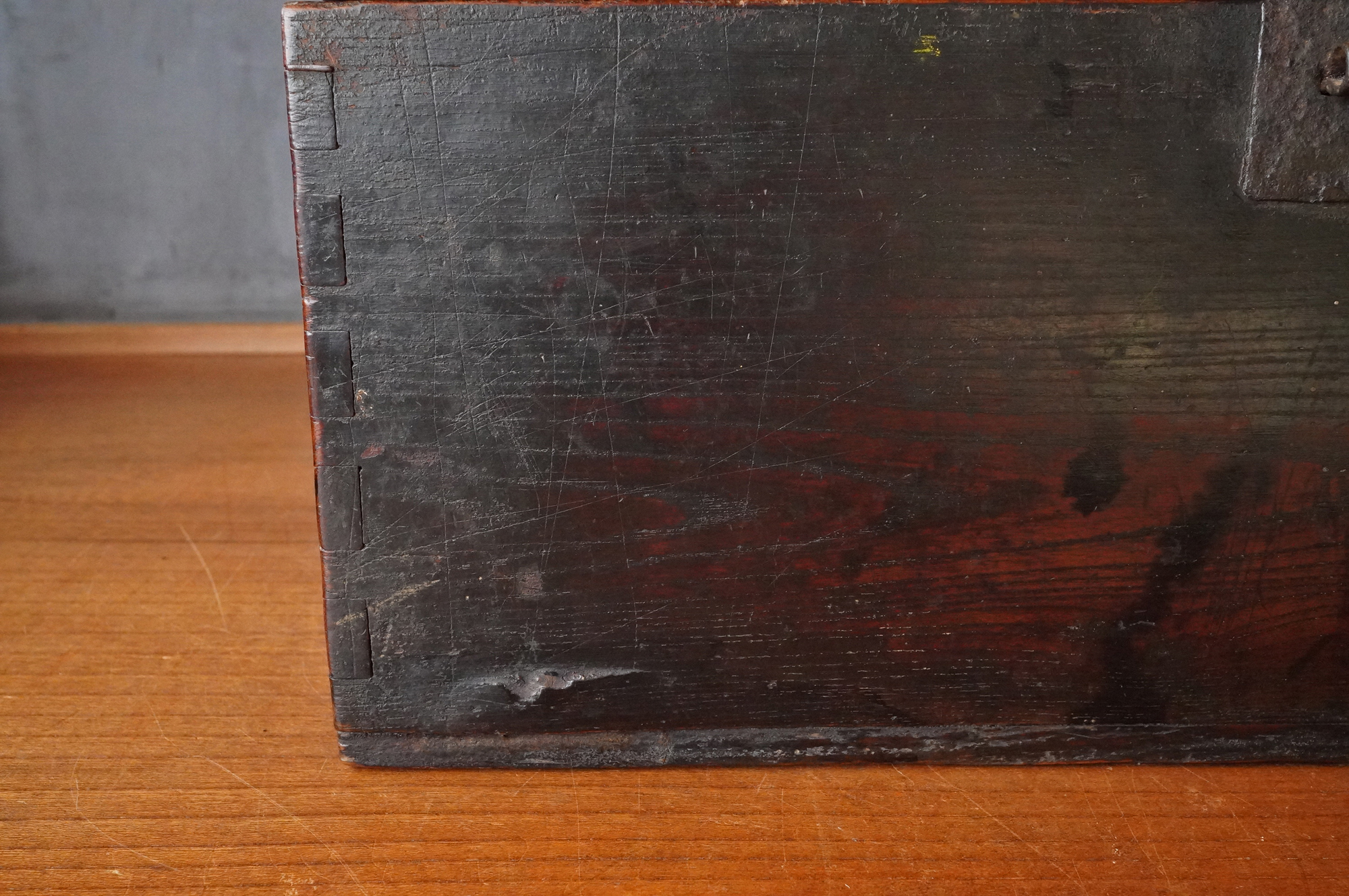 材質は、天板と底板が松材、側面四枚の板が欅材と見られます。李朝時代。